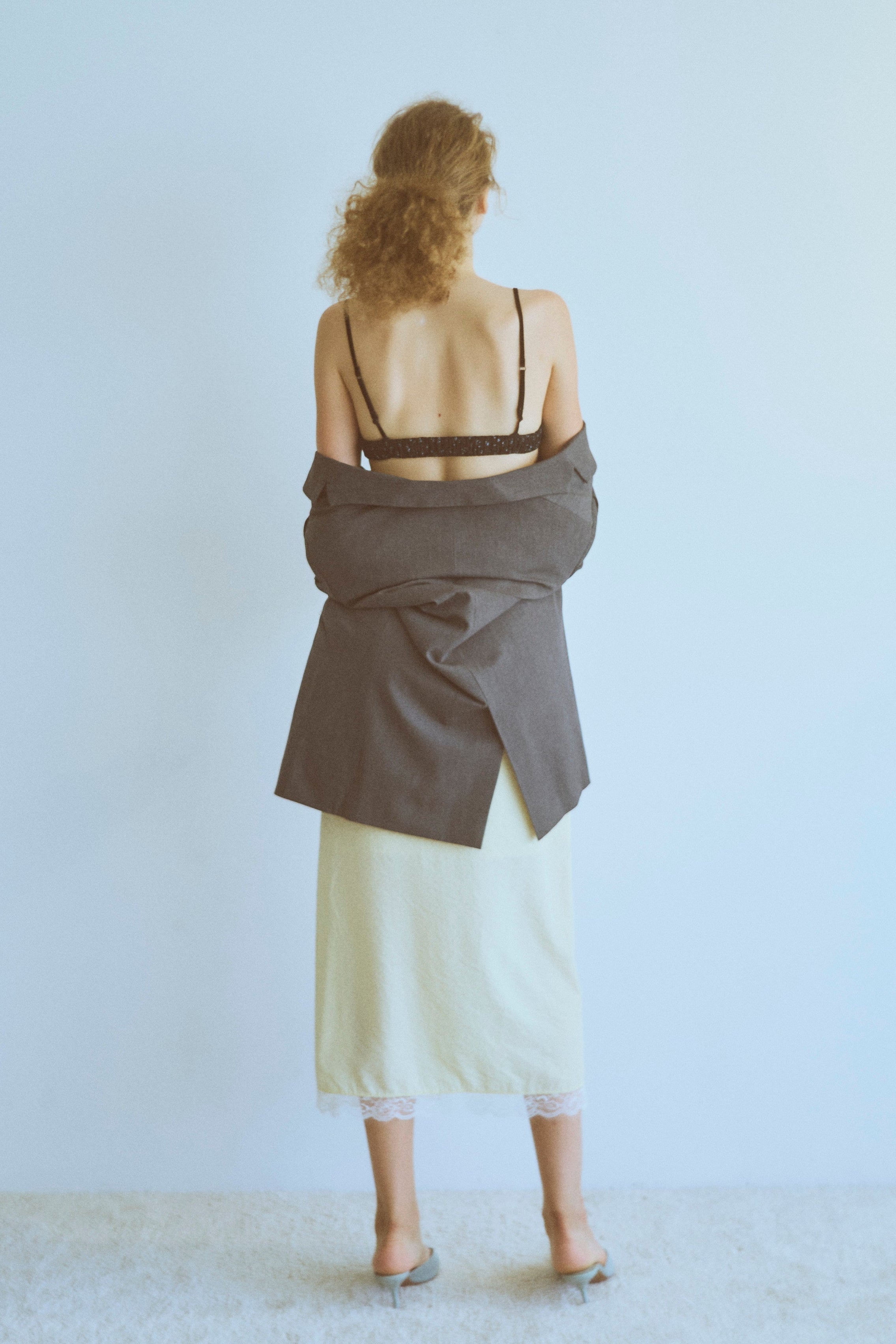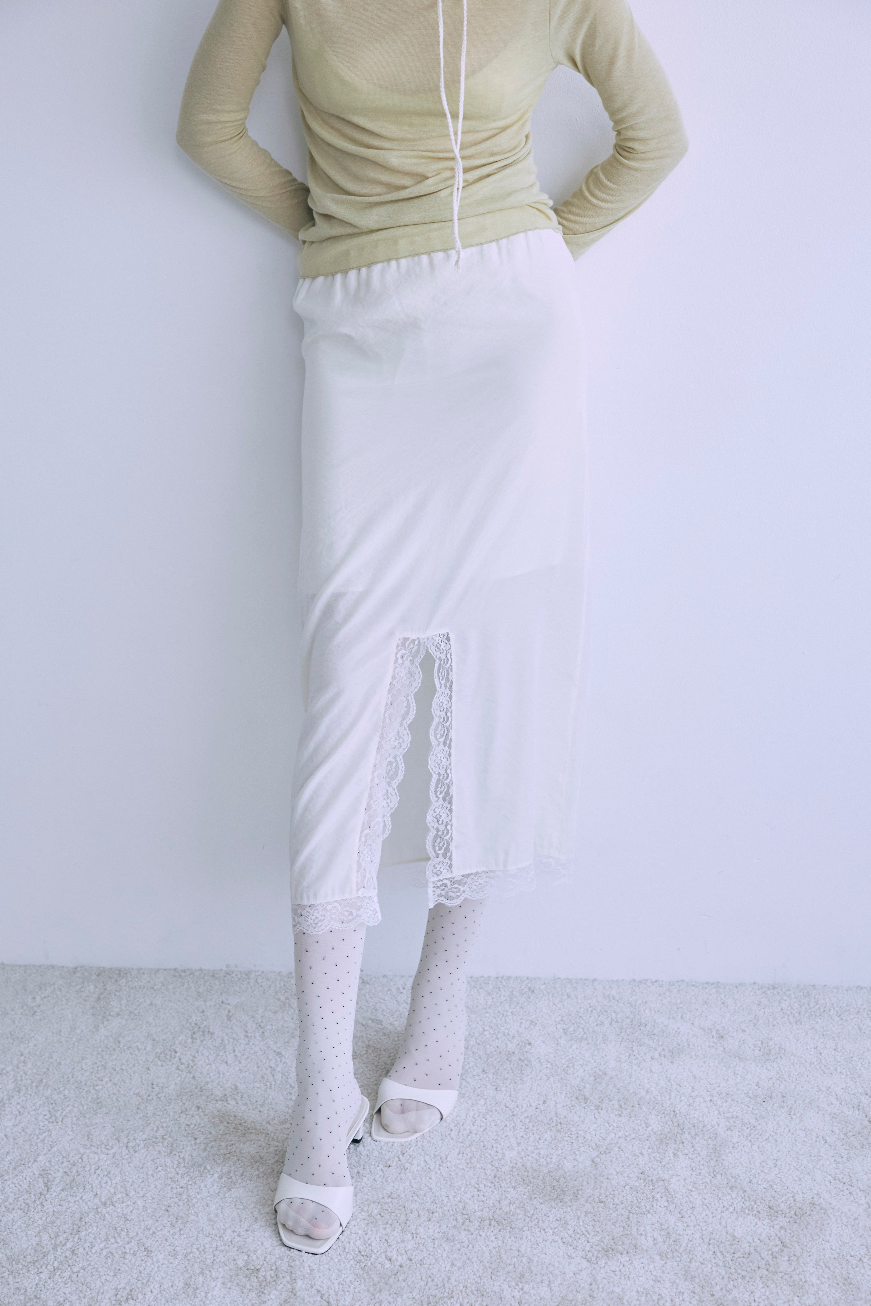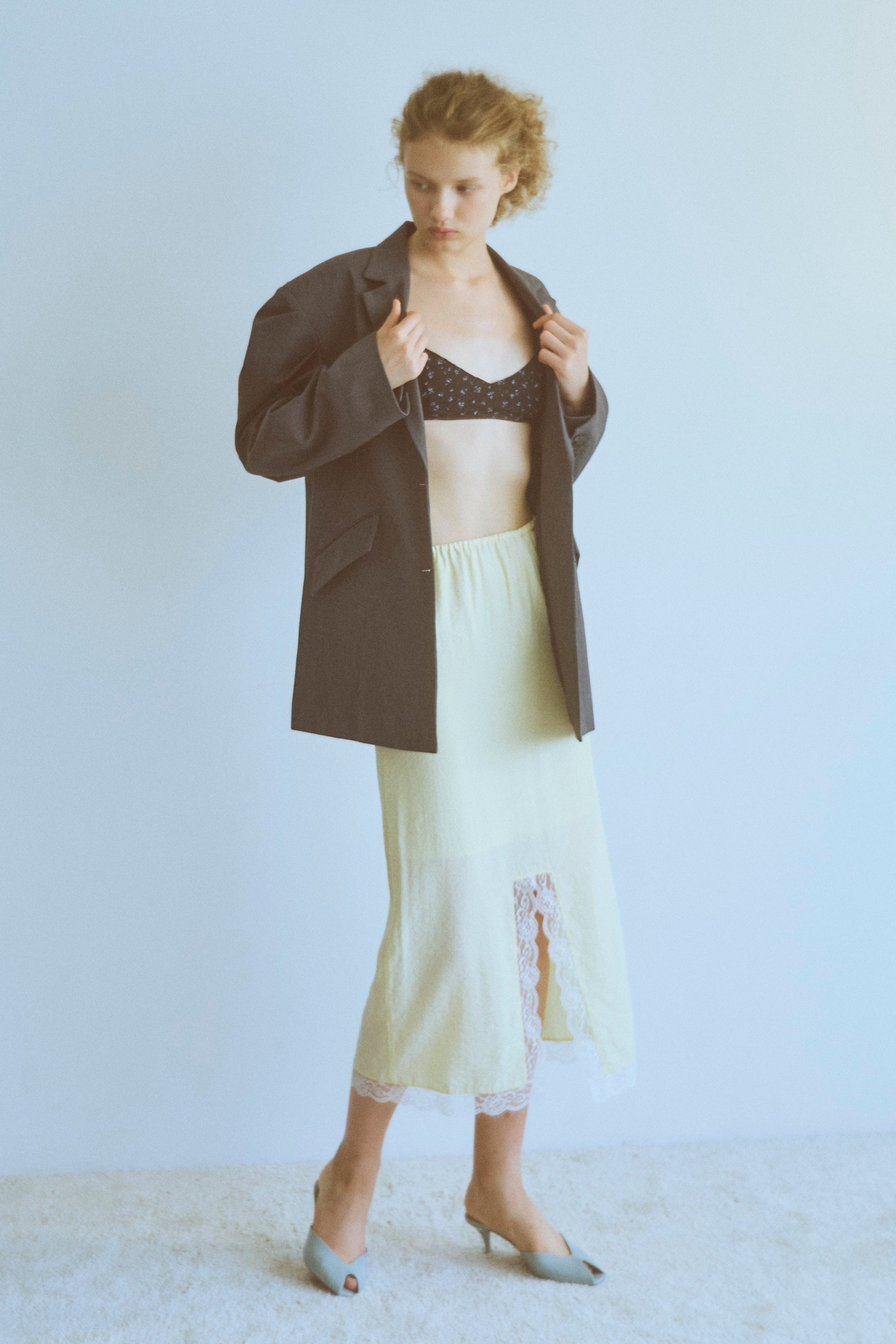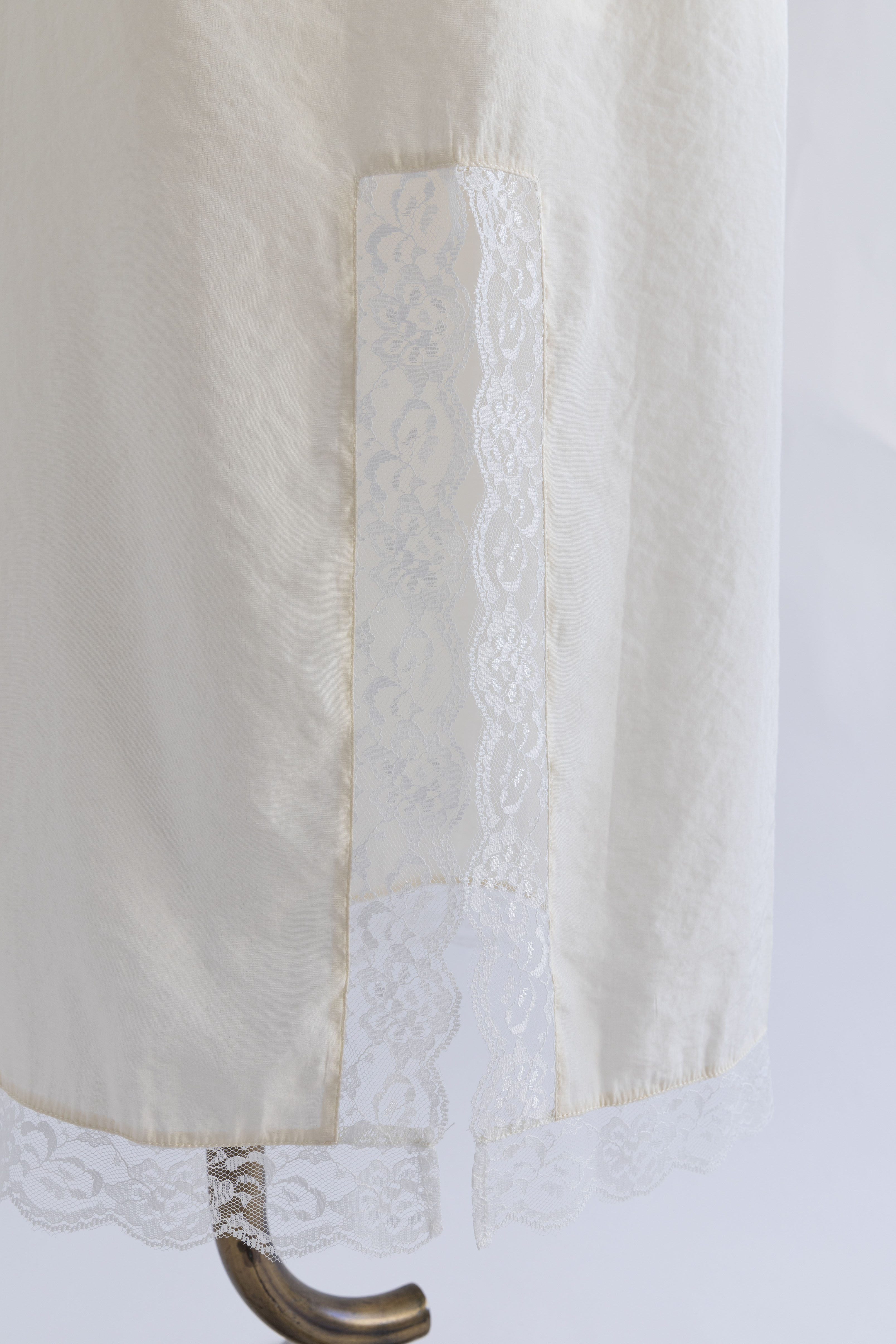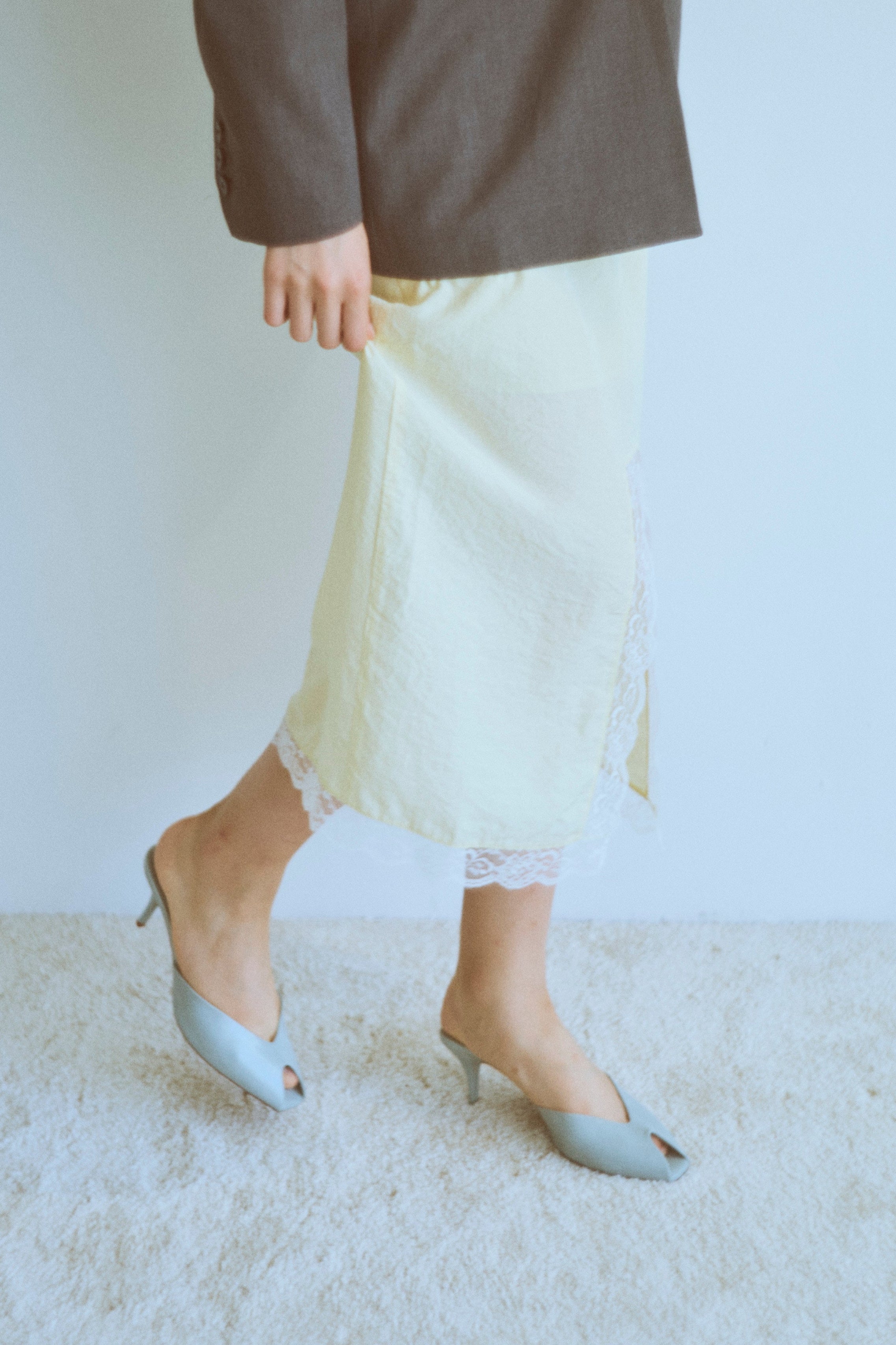 繊細なレースをあしらったヴィンテージライクなサテンスカート 【Material】 ヴィンテージ感のある柔らかい素材感で、軽やかで繊細な印象のスカート。 奥行きのある表情を引き立て、シーズンを問わず着用でき、上品な光沢が自然な華やかさを演出します。 【Design】 裾からスリットに施したレースやニュアンスカラーが甘くなりすぎず、日常に取り入れやすい上品なスカートに仕上げました。すっきりとしたシルエットに、レースを効かせたデザインが魅力です。 スリットは前がデフォルトのデザインではありますが、合わせるお洋服や気分によって後ろにして着用頂くことが可能です。 ウエストはゴム仕様にしているのでラフな着心地も魅力です。 【Styling point】 Tシャツやスウェットを合わせ、抜け感をプラスすればこなれたバランスに。ブラウスやヒールを合わせれば、女性らしさが引き立つきれいめスタイルにもシフトできます。 パンツにレイヤードしていただくこともできるので、これ一枚でスタイリングの幅がぐんと広がります。