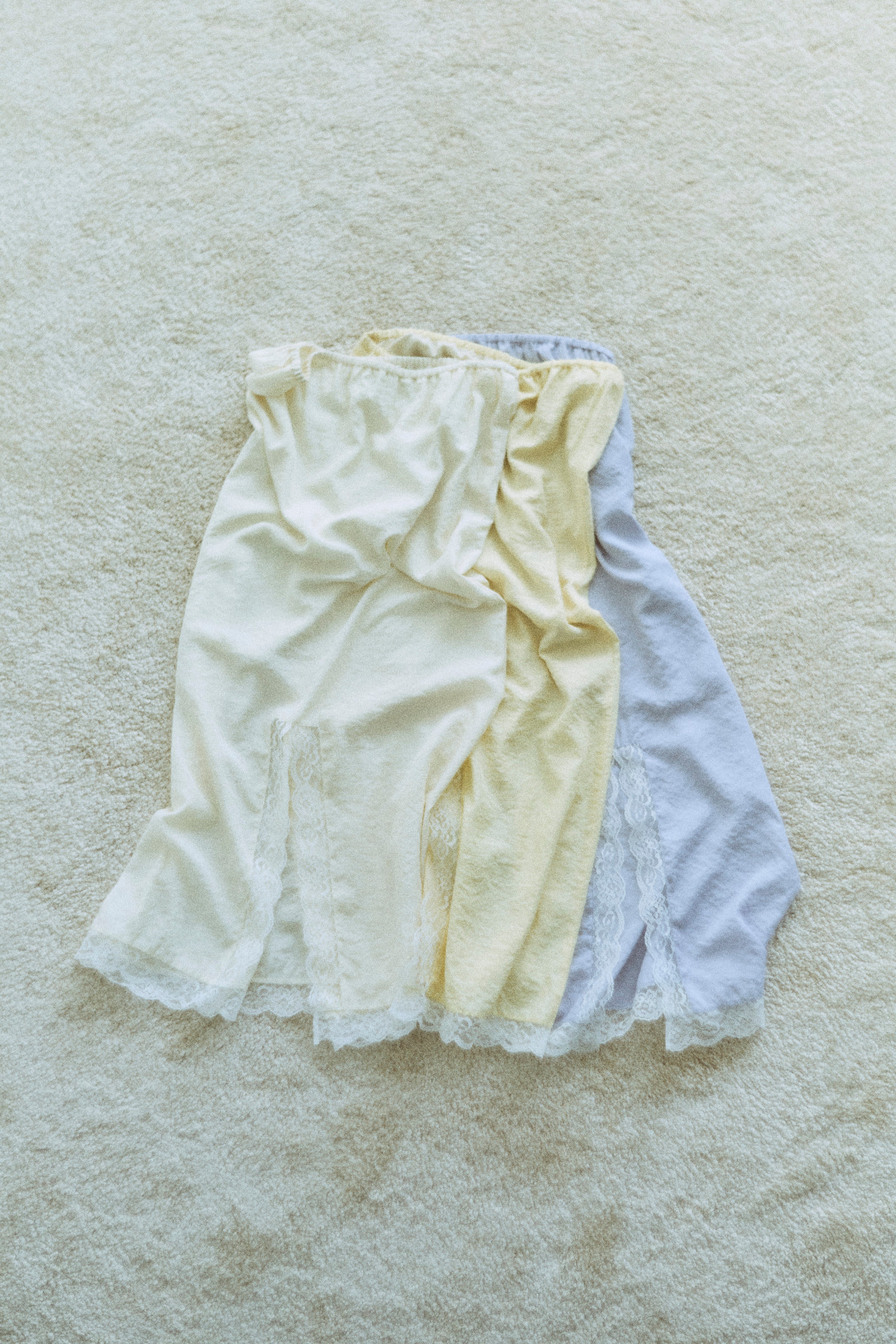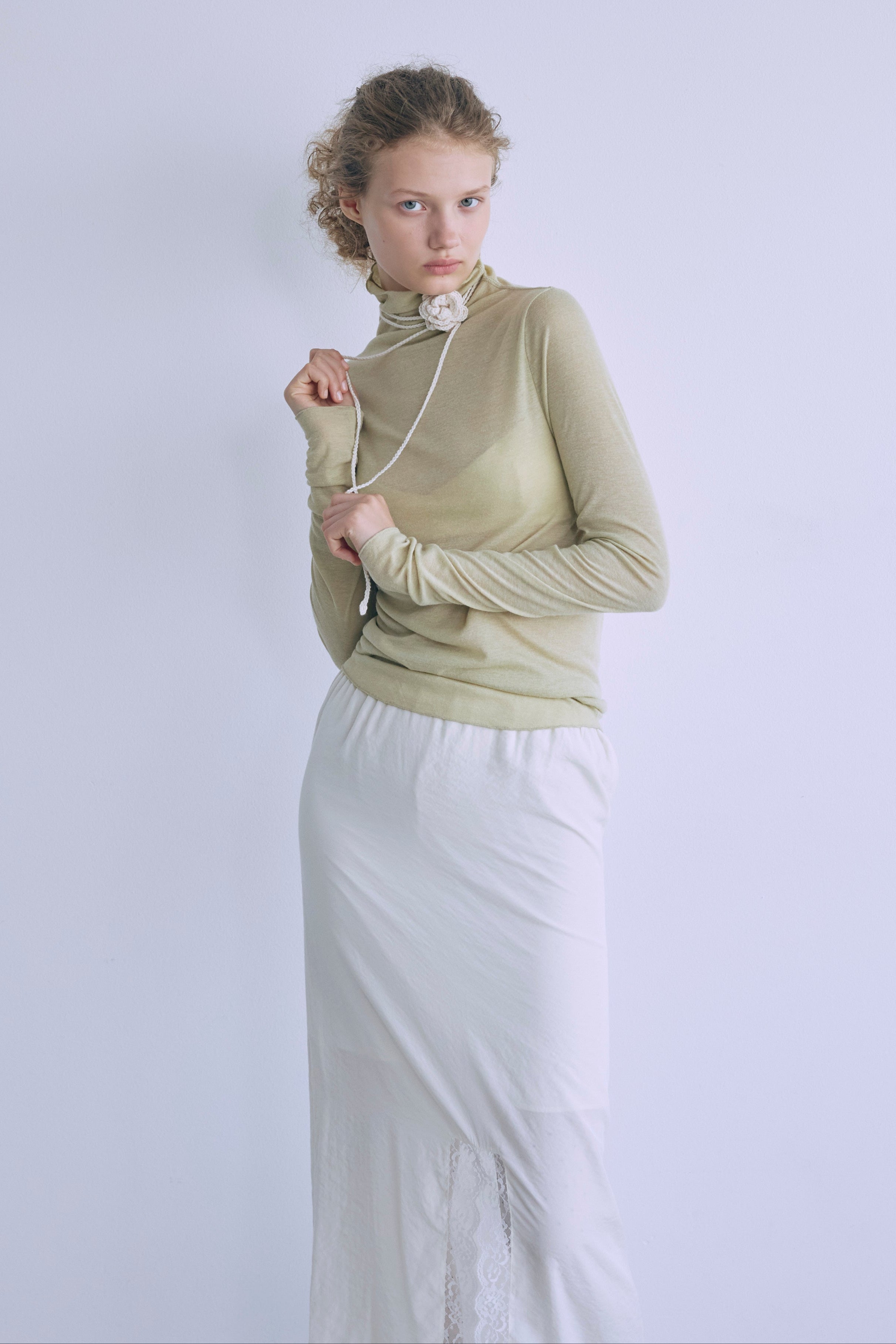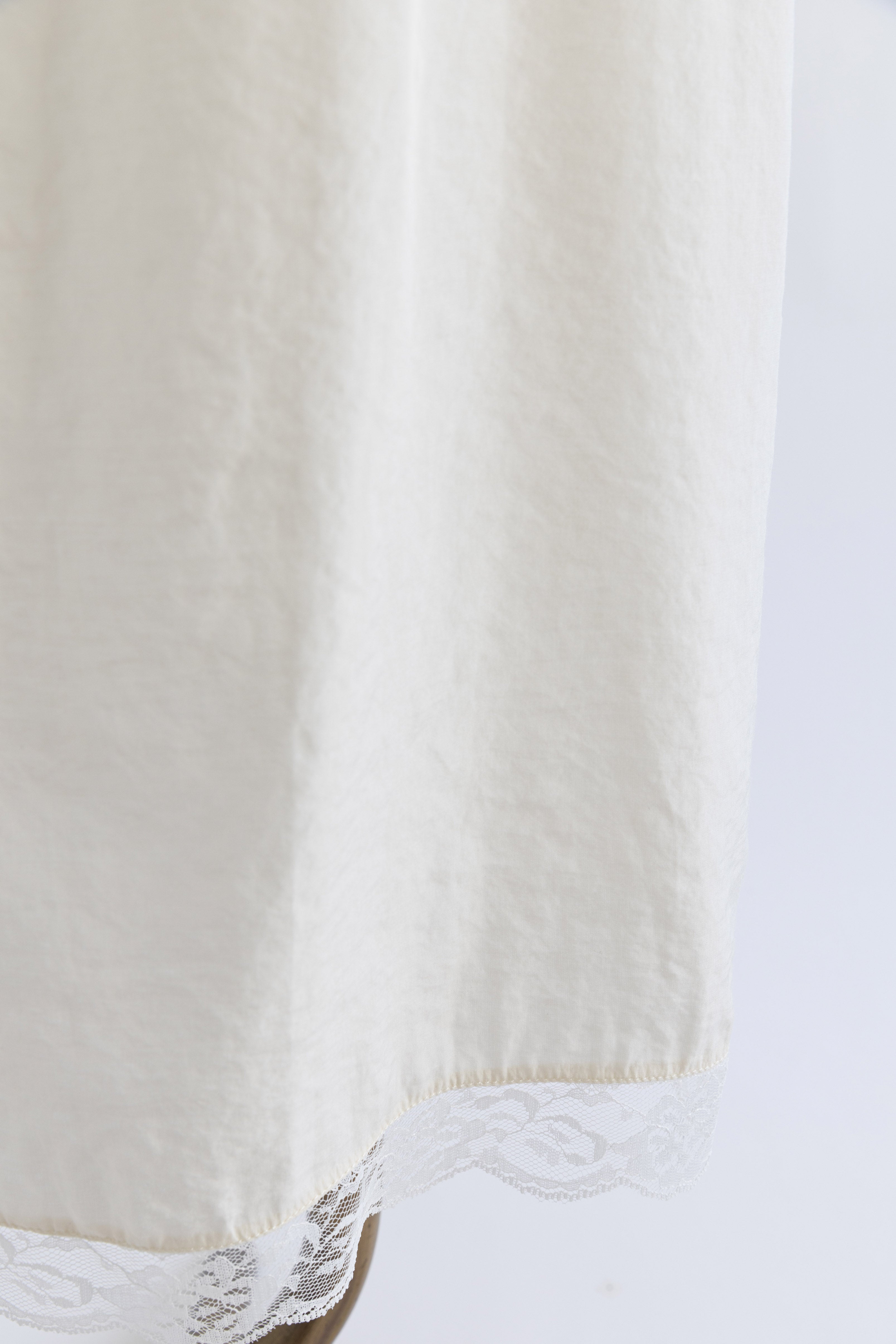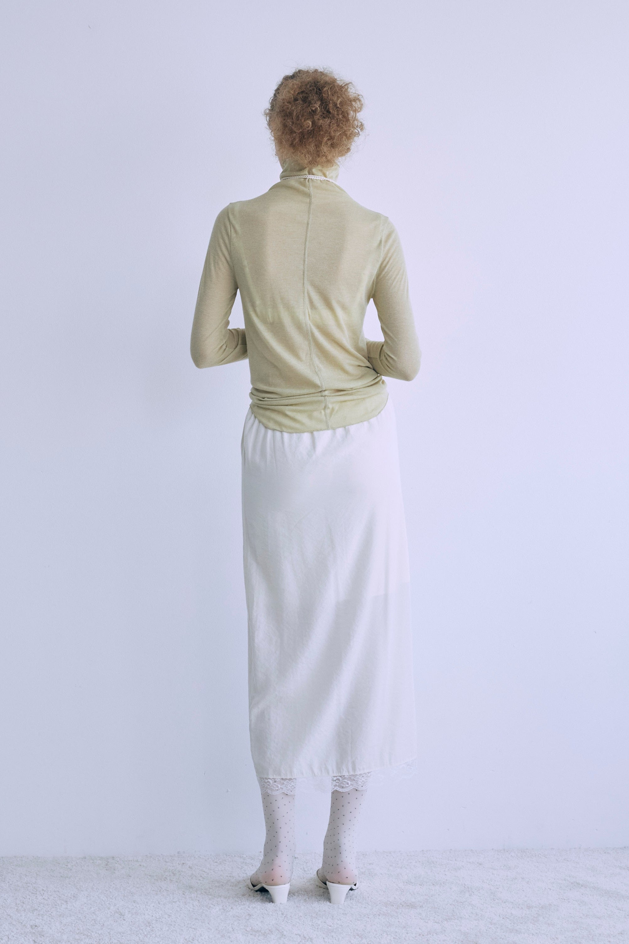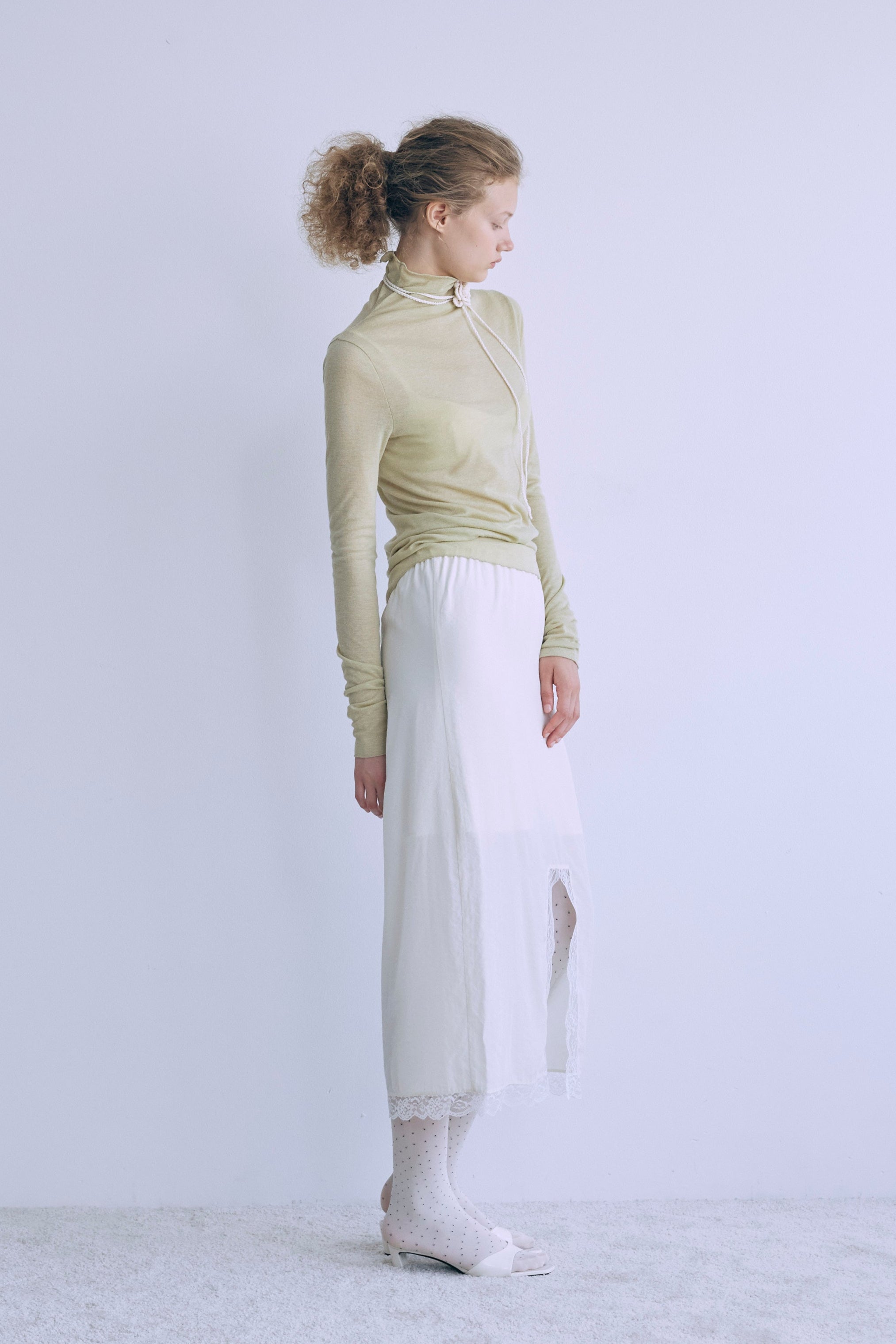 繊細なレースをあしらったヴィンテージライクなサテンスカート 【Material】 ヴィンテージ感のある柔らかい素材感で、軽やかで繊細な印象のスカート。 奥行きのある表情を引き立て、シーズンを問わず着用でき、上品な光沢が自然な華やかさを演出します。 【Design】 裾からスリットに施したレースやニュアンスカラーが甘くなりすぎず、日常に取り入れやすい上品なスカートに仕上げました。すっきりとしたシルエットに、レースを効かせたデザインが魅力です。 スリットは前がデフォルトのデザインではありますが、合わせるお洋服や気分によって後ろにして着用頂くことが可能です。 ウエストはゴム仕様にしているのでラフな着心地も魅力です。 【Styling point】 Tシャツやスウェットを合わせ、抜け感をプラスすればこなれたバランスに。ブラウスやヒールを合わせれば、女性らしさが引き立つきれいめスタイルにもシフトできます。 パンツにレイヤードしていただくこともできるので、これ一枚でスタイリングの幅がぐんと広がります。