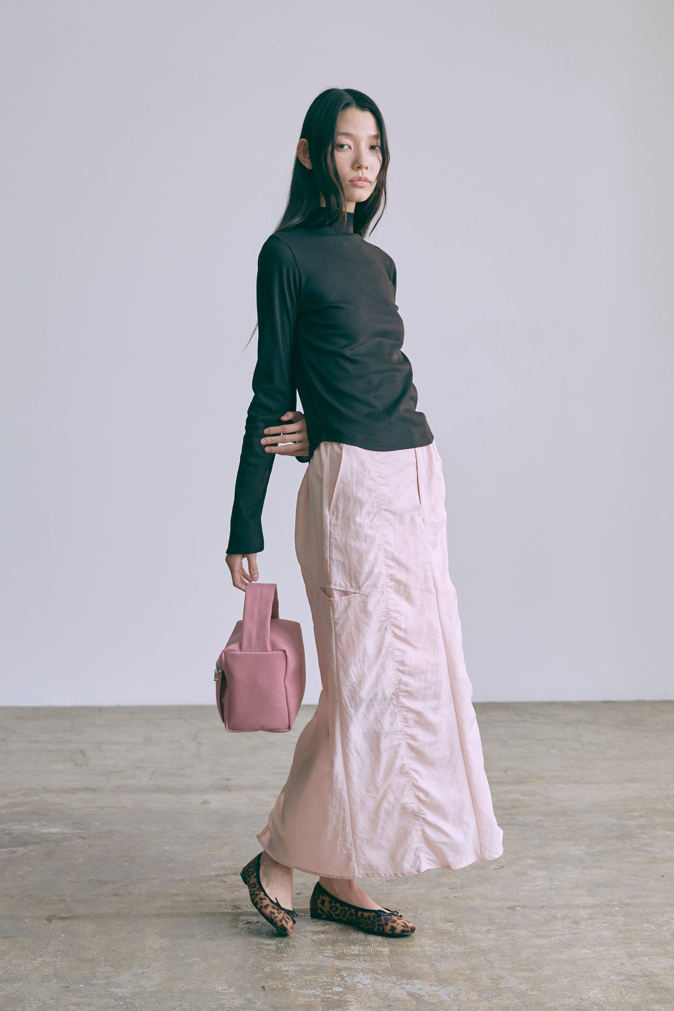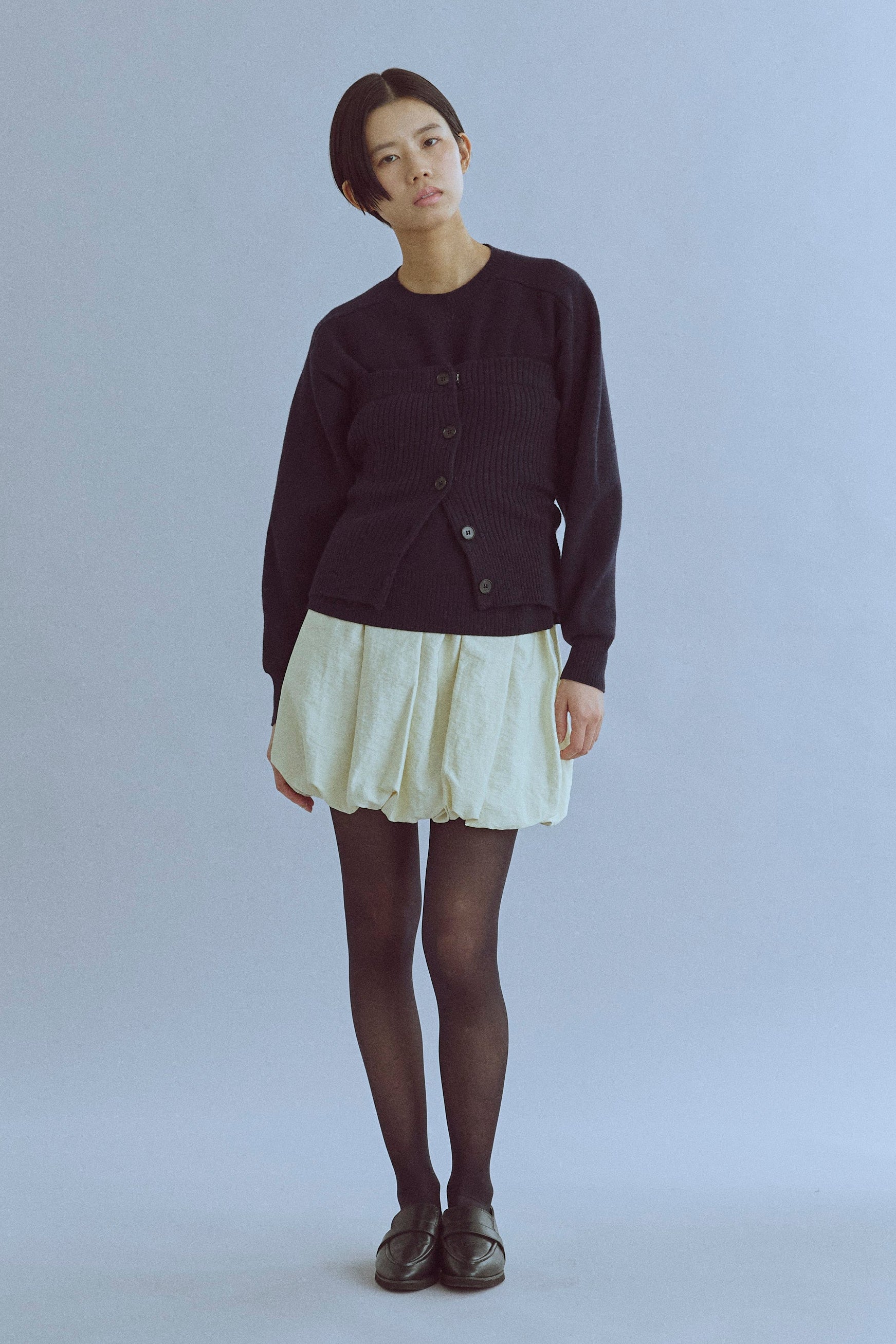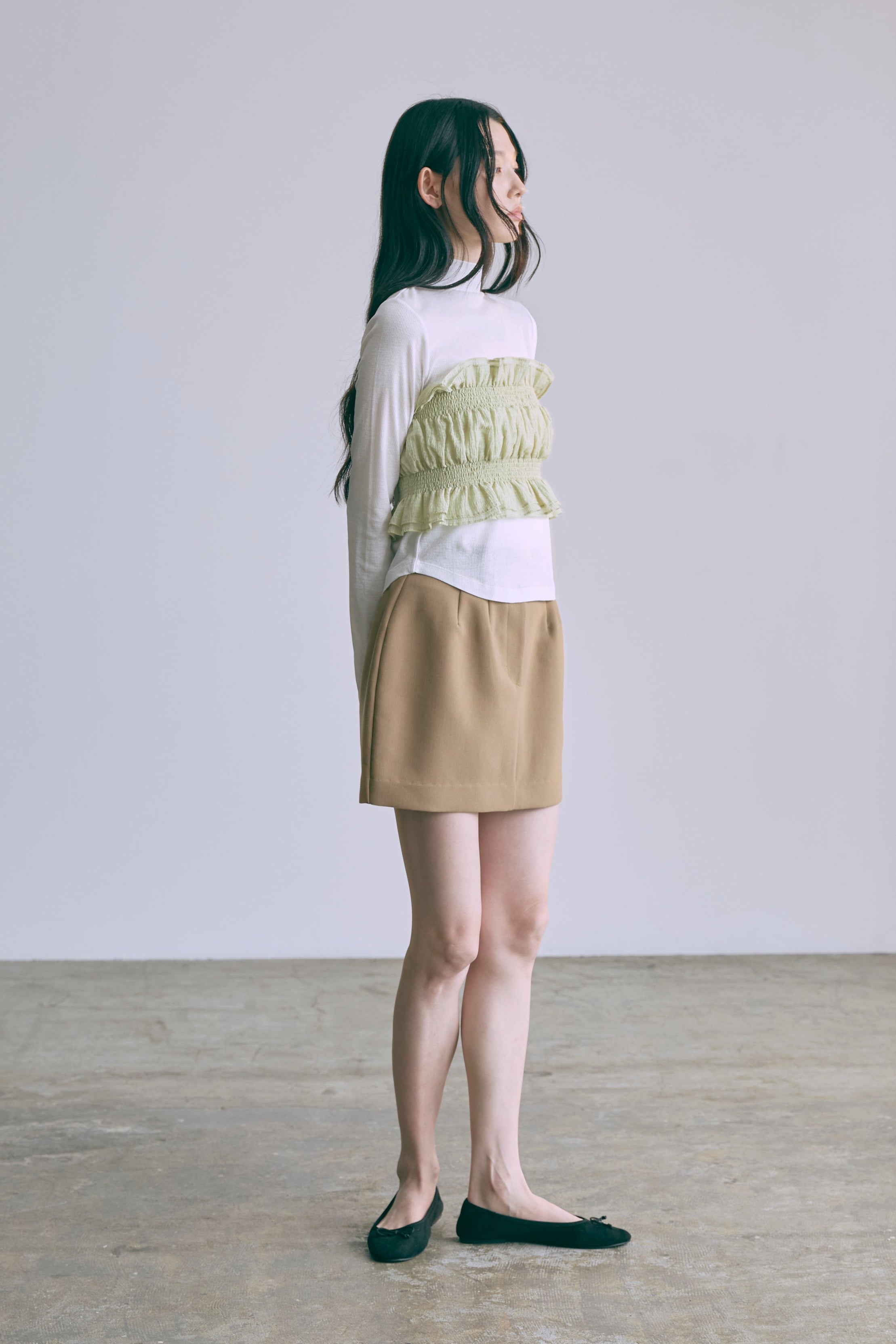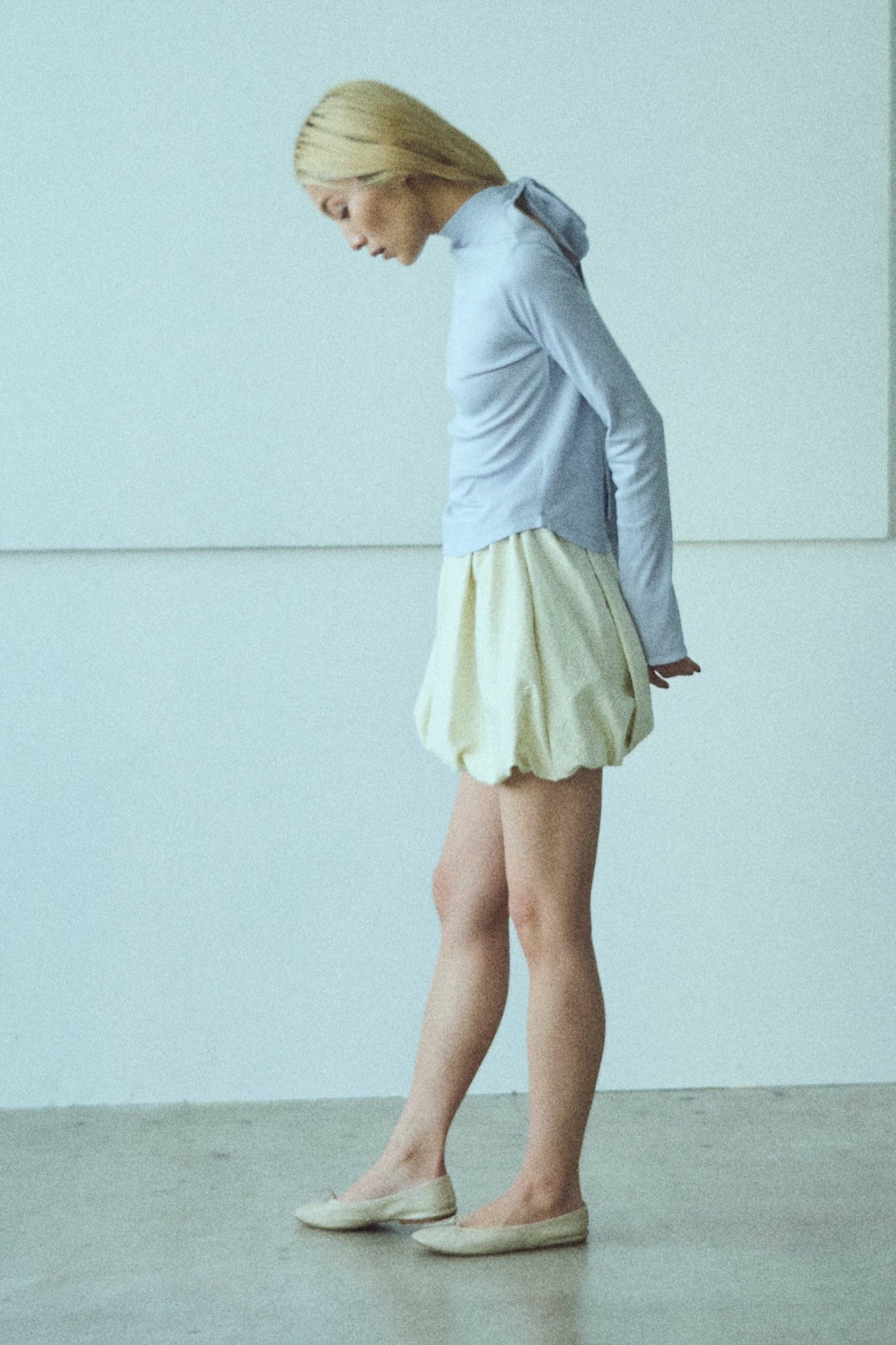 ふんわりとした丸みとモードな素材感がMIXされたバルーンミニスカート 【Material】 少しぬめり感のあるナイロン素材を使用し、フェミニンすぎない絶妙なカラーで仕上げました。軽やかな素材がモードな雰囲気を引き立てます。 【Design】 ウエストはドローストリングでサイズ調整が可能。シンプルなバルーンデザインに加え、ウエストからタックを入れることで立体的なシルエットを実現。ふんわりとした丸みとモードな印象を同時に楽しめます。 【Styling point】 クラシカルなジャケットやカジュアルなカットソーとの相性も良く、ミックススタイルを楽しめる一着です。デイリーからお出かけまで、幅広いシーンで活躍するコーディネートにおすすめです。