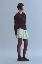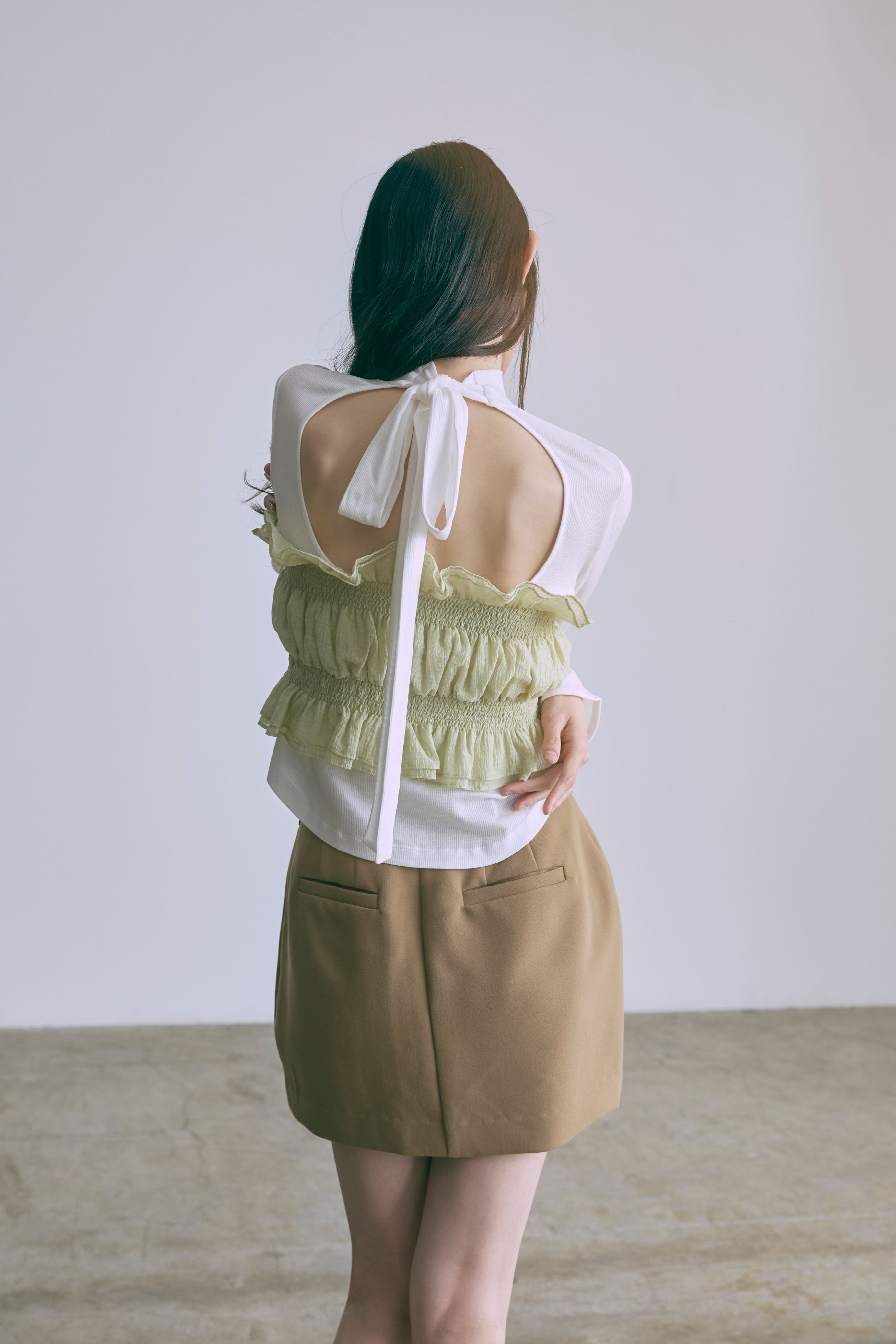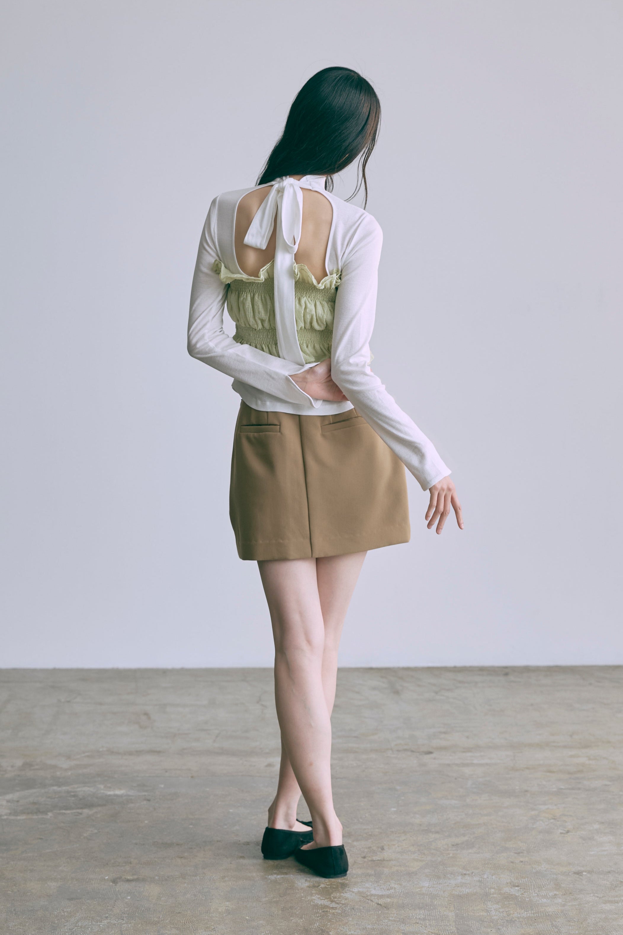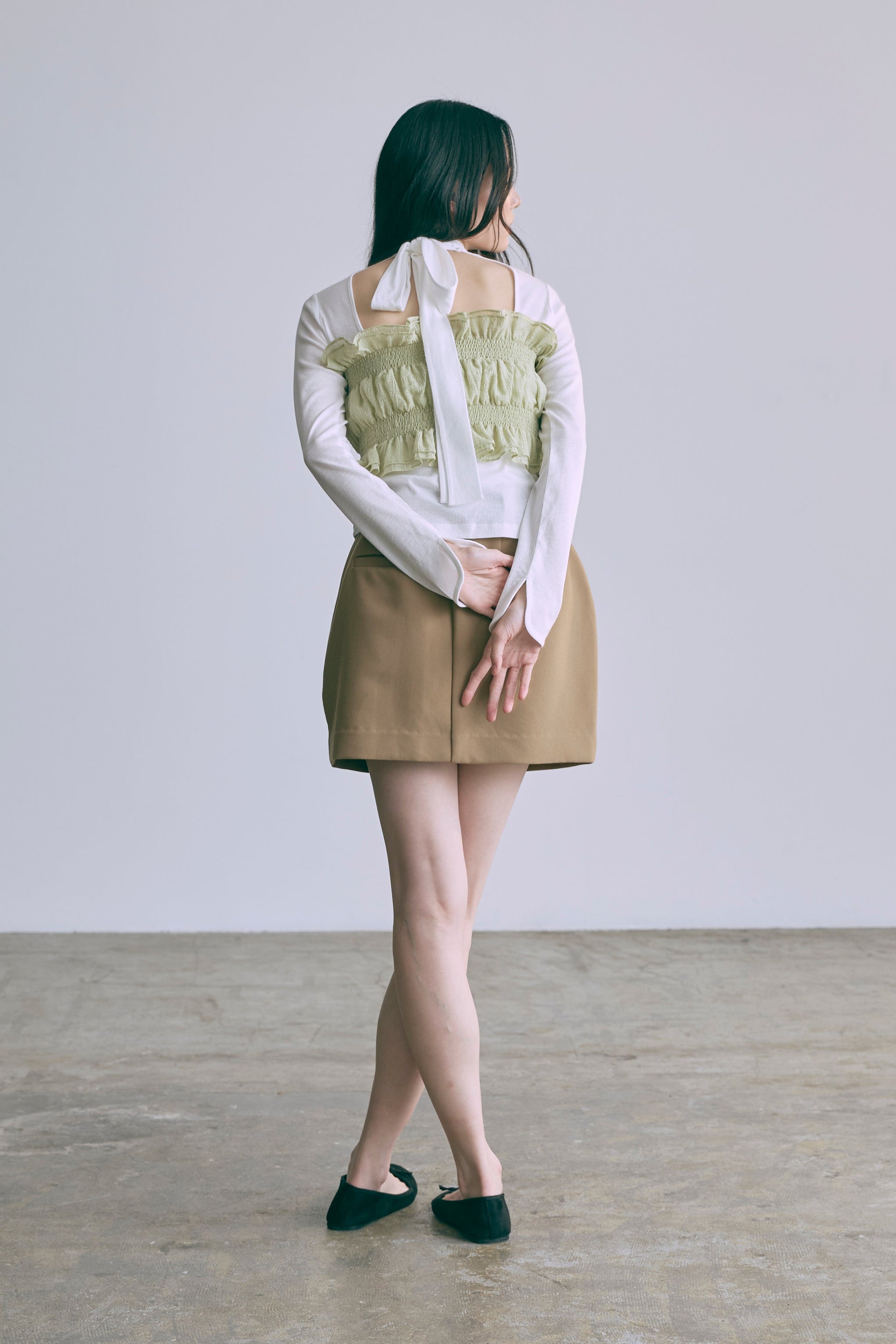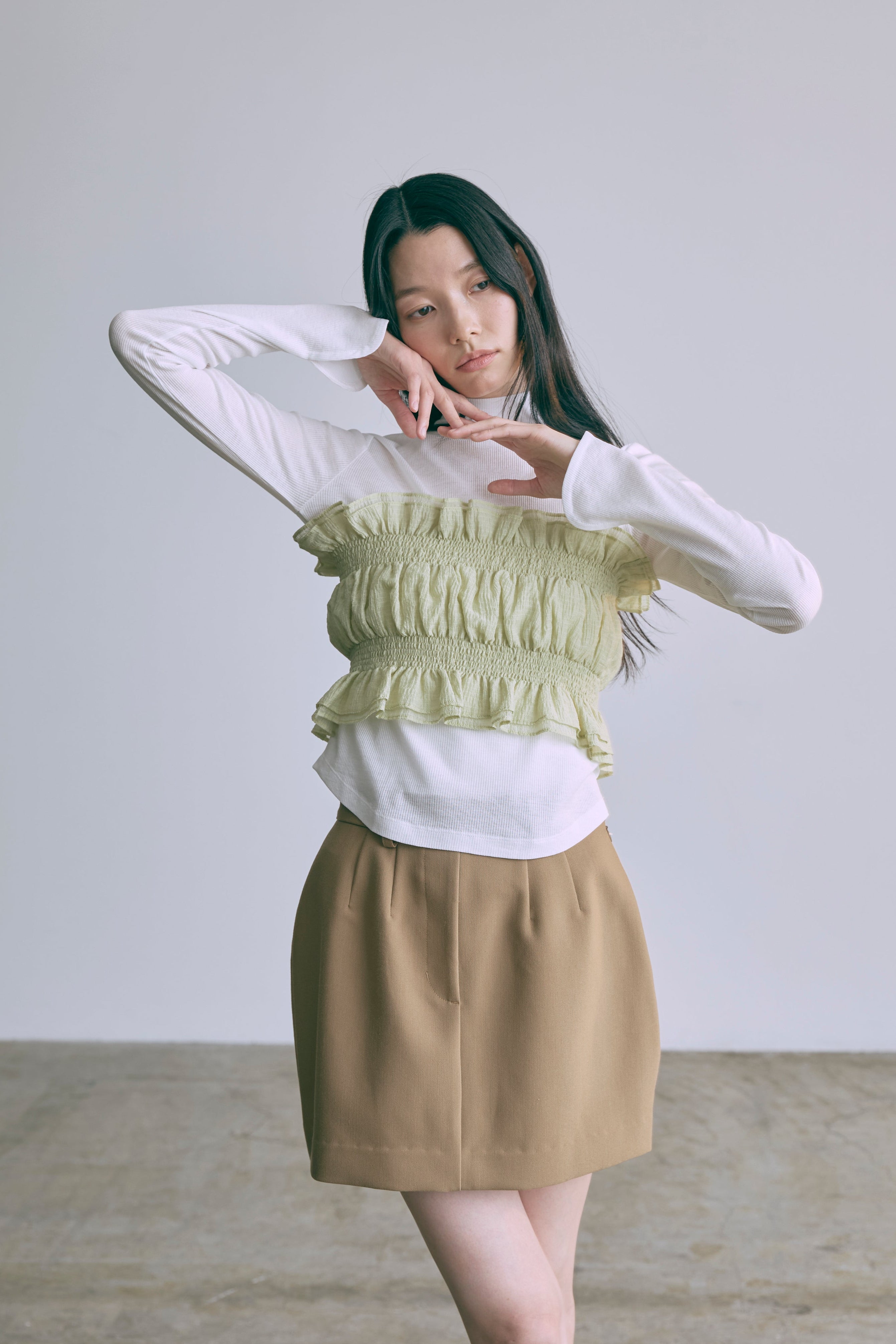 ふんわりとした丸みとモードな素材感がMIXされたバルーンミニスカート 【Material】 少しぬめり感のあるナイロン素材を使用し、フェミニンすぎない絶妙なカラーで仕上げました。軽やかな素材がモードな雰囲気を引き立てます。 【Design】 ウエストはドローストリングでサイズ調整が可能。シンプルなバルーンデザインに加え、ウエストからタックを入れることで立体的なシルエットを実現。ふんわりとした丸みとモードな印象を同時に楽しめます。 【Styling point】 クラシカルなジャケットやカジュアルなカットソーとの相性も良く、ミックススタイルを楽しめる一着です。デイリーからお出かけまで、幅広いシーンで活躍するコーディネートにおすすめです。