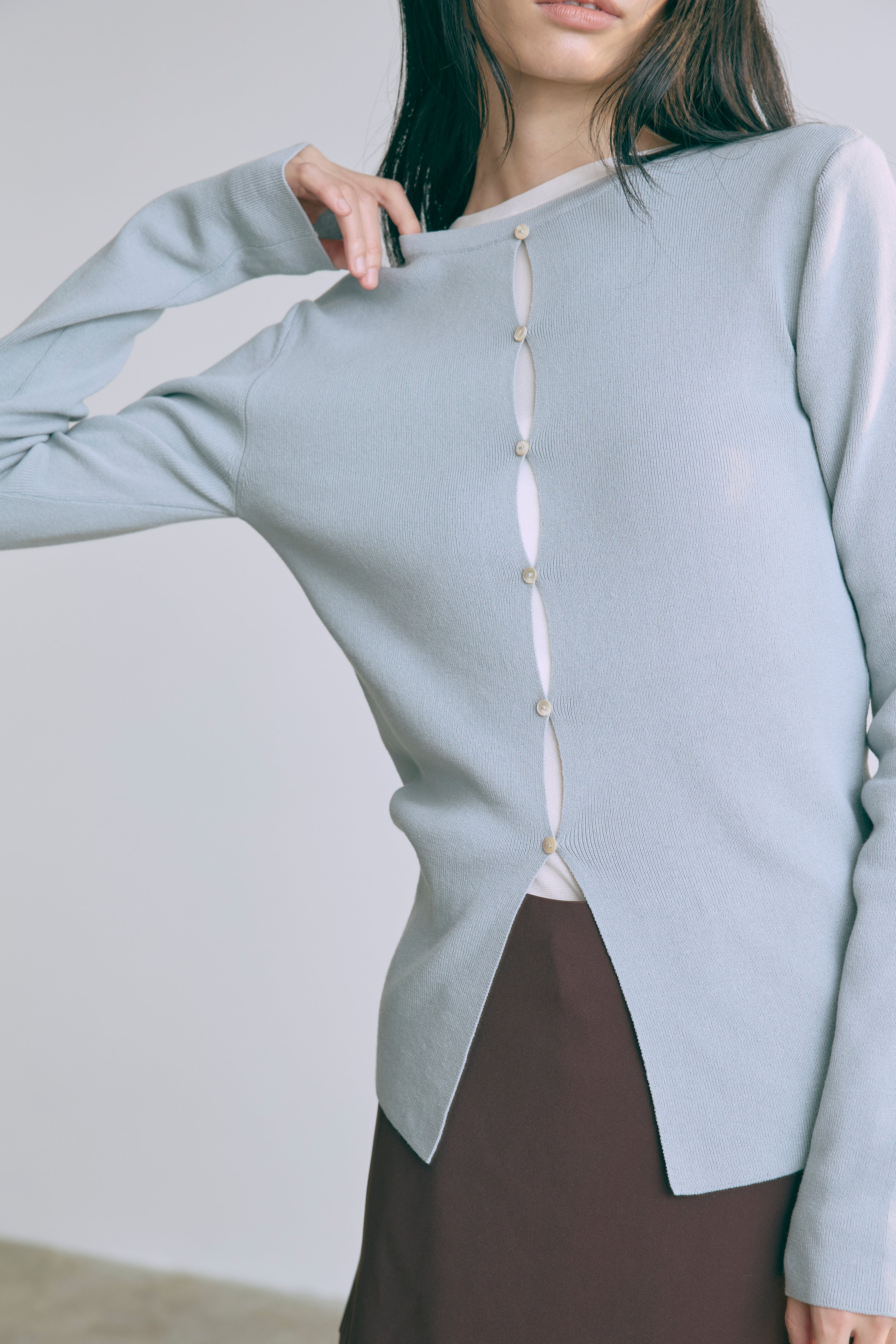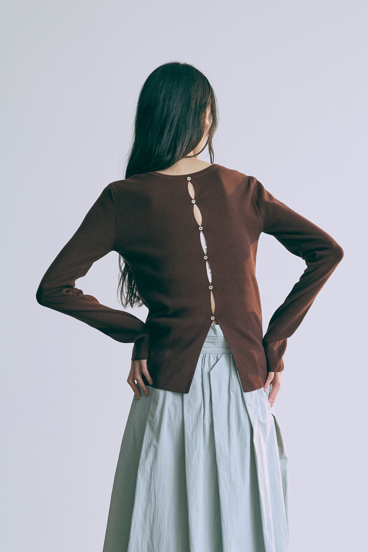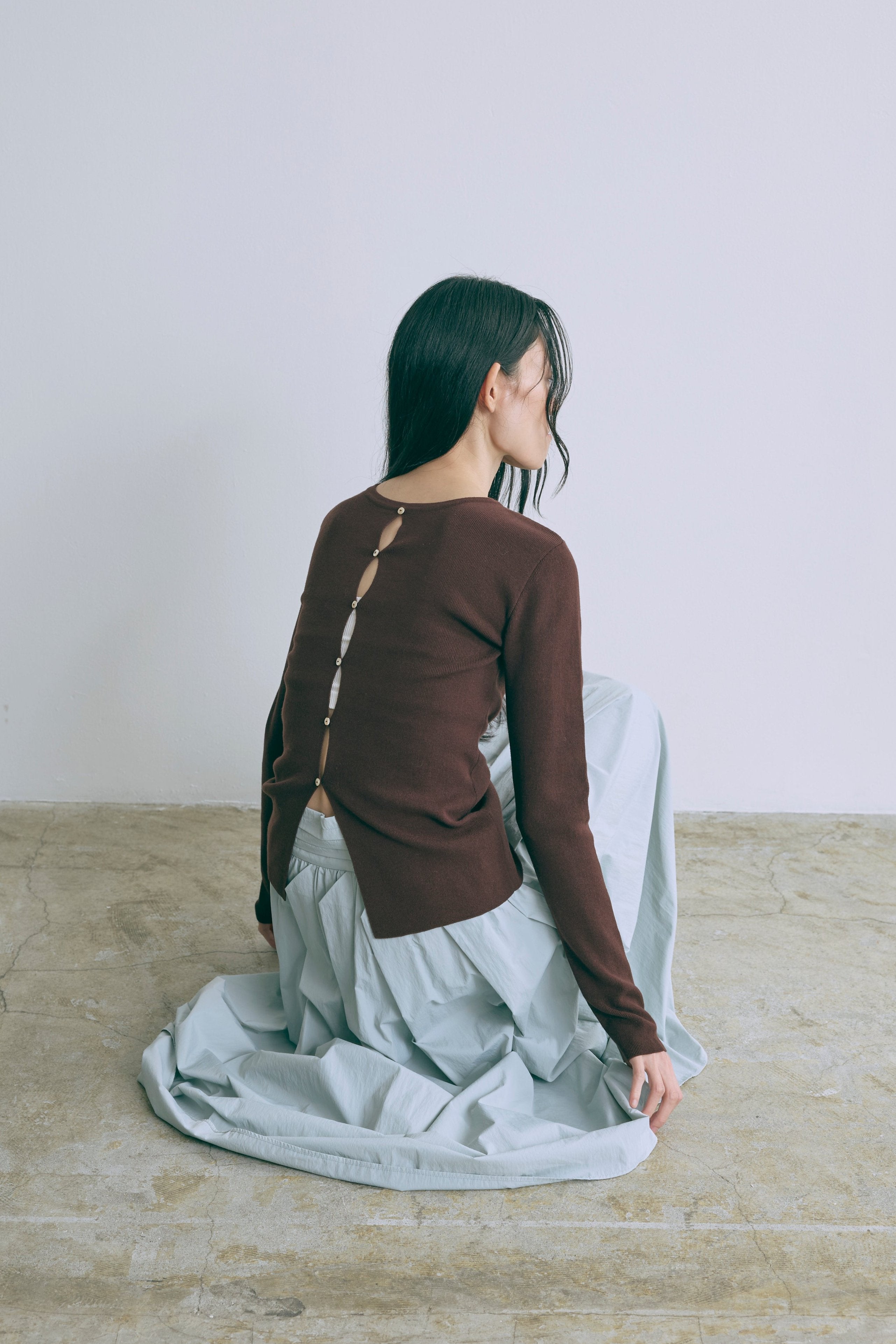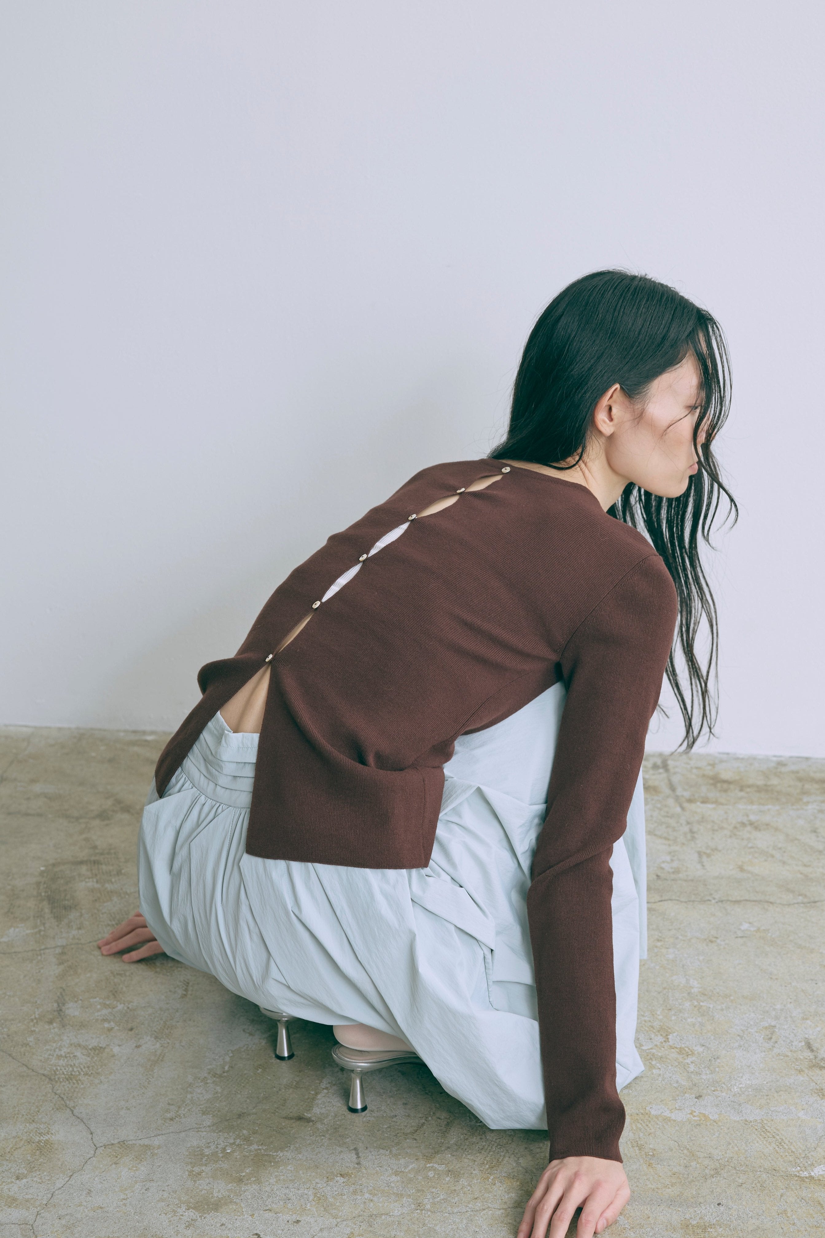 2WAYで楽しめる縦長ホールデザインのニットプルオーバー 【Material】 コットン混素材を使用したさらっとした着心地が魅力のニット。季節を問わずロングシーズンで活躍します。 【Design】 フロント中央に縦長のホールが入ったデザインがポイント。ホール部分を背中側にしてシンプルに着こなすこともできる2WAY仕様です。飾りボタンがアクセントになっており、今年らしい抜け感を演出。一枚で華やかさが際立つアイテムです。 【Styling point】 すっきりとしたシルエットで、ワイドパンツやボリュームのあるボトムスとも相性抜群。ジャケットのインナーとしても合わせやすく、さまざまなコーディネートに取り入れやすいデザインです。
