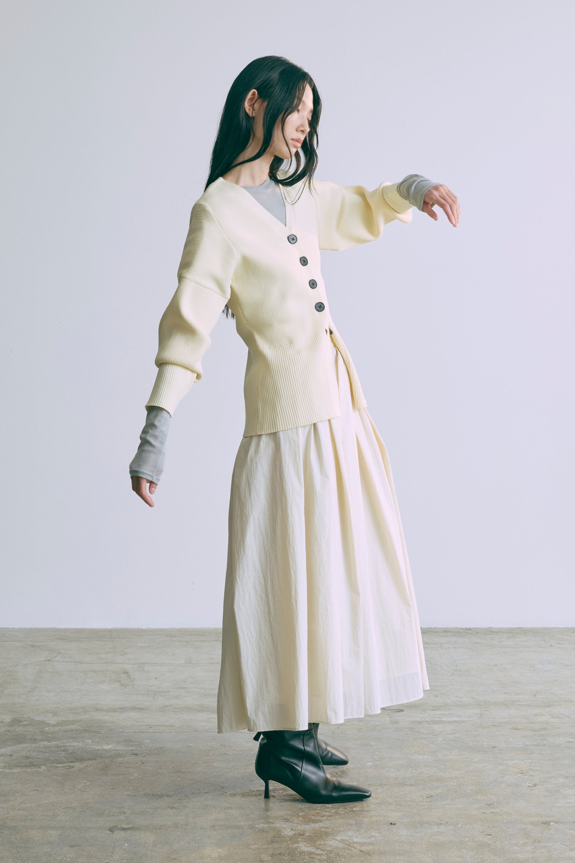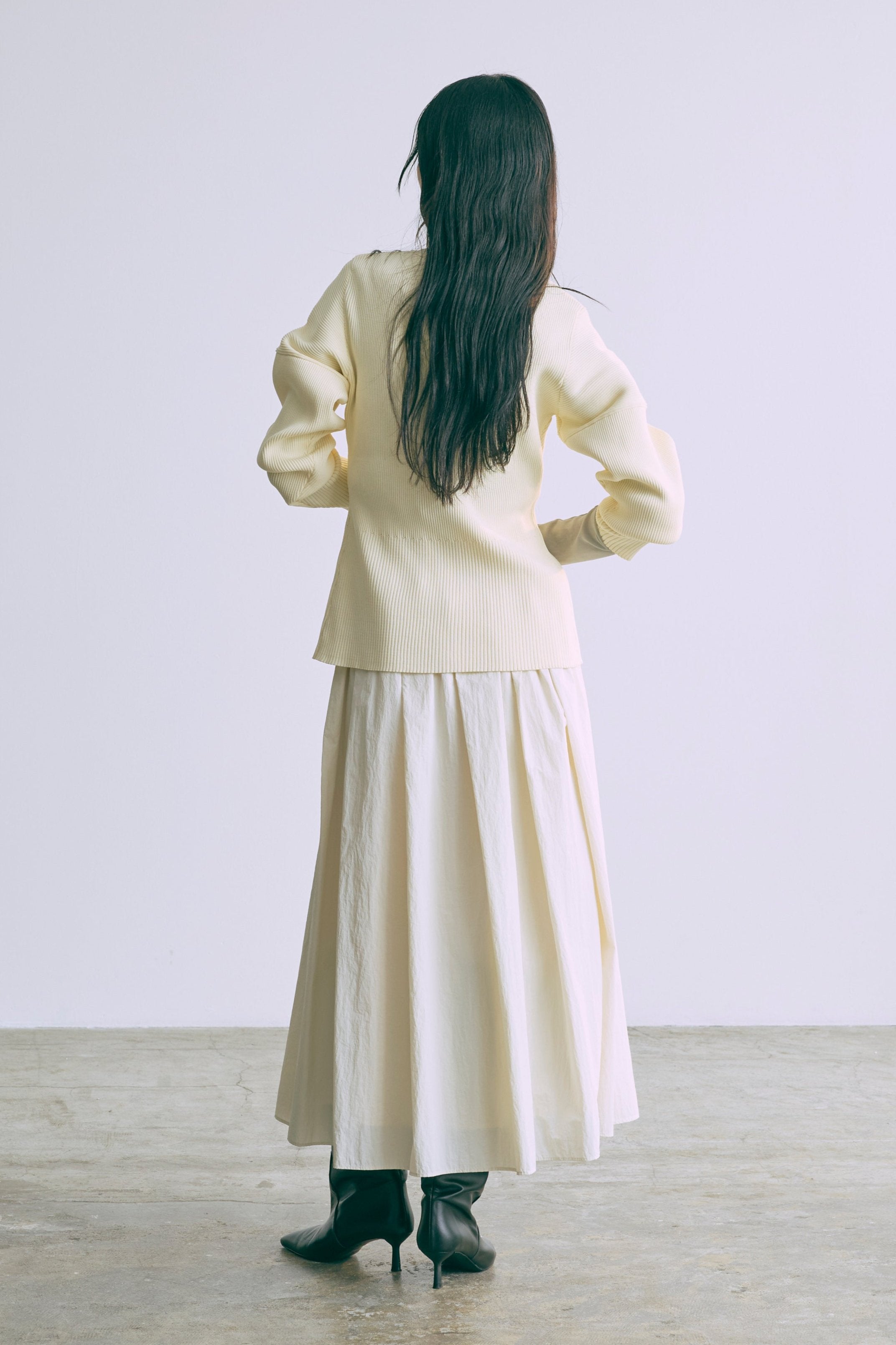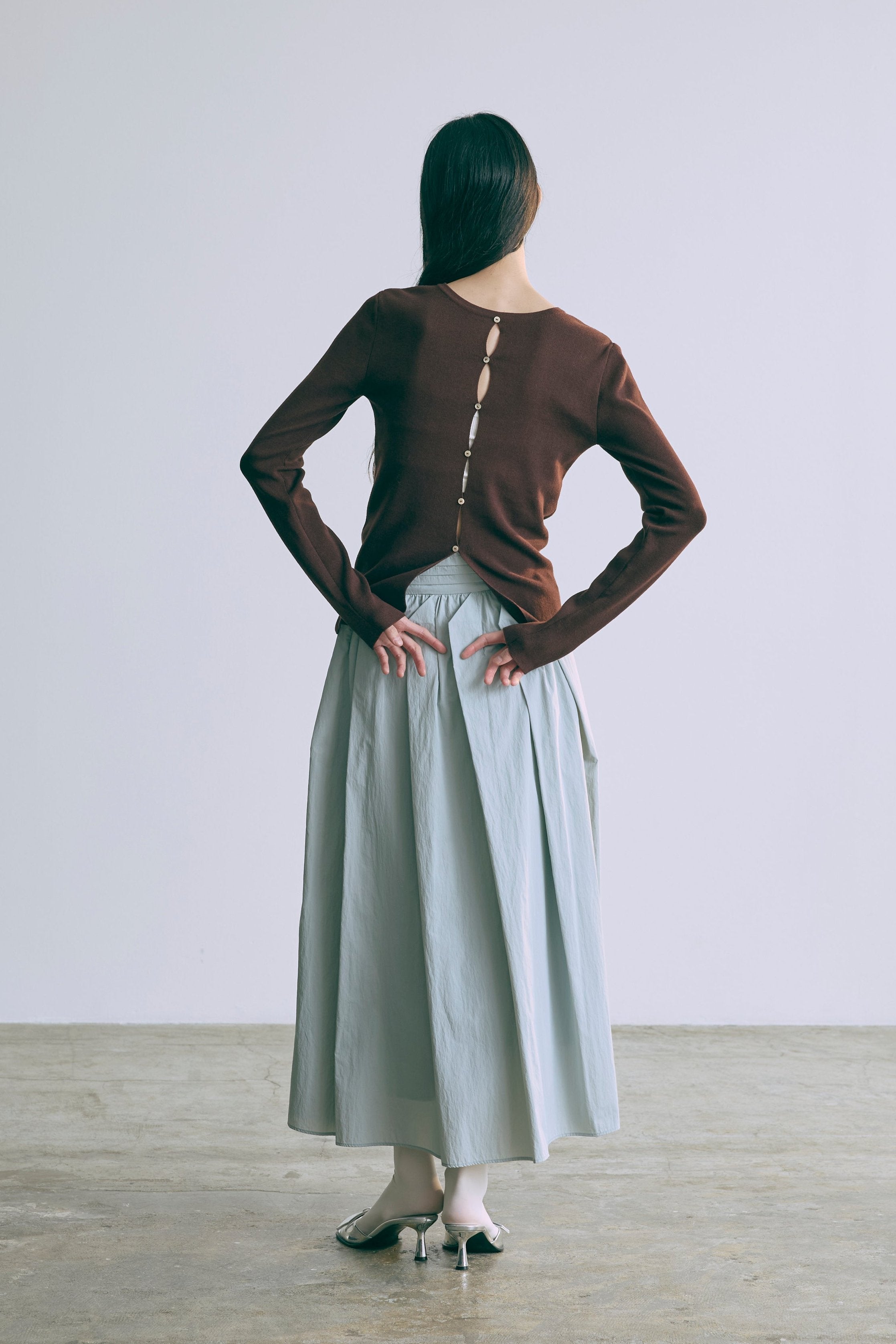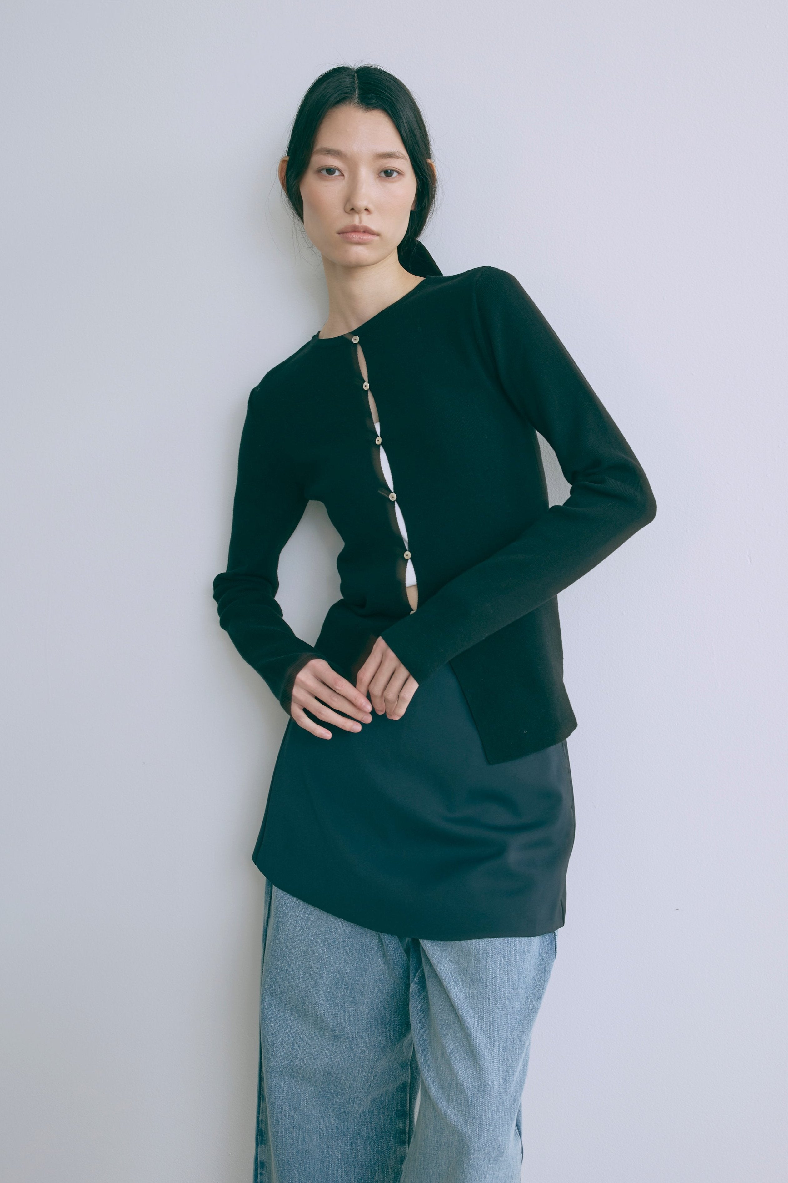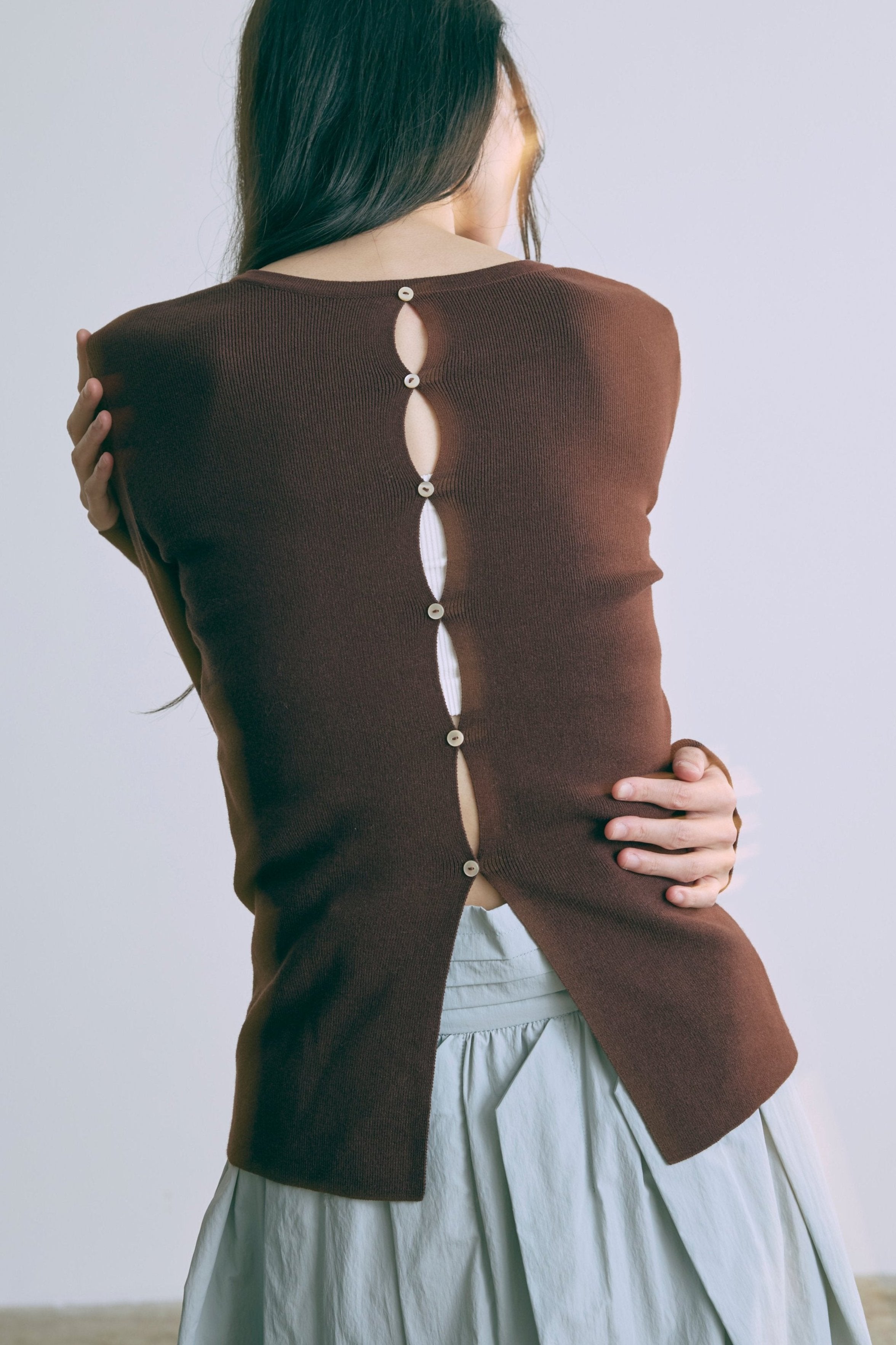 2WAYで楽しめる縦長ホールデザインのニットプルオーバー 【Material】 コットン混素材を使用したさらっとした着心地が魅力のニット。季節を問わずロングシーズンで活躍します。 【Design】 フロント中央に縦長のホールが入ったデザインがポイント。ホール部分を背中側にしてシンプルに着こなすこともできる2WAY仕様です。飾りボタンがアクセントになっており、今年らしい抜け感を演出。一枚で華やかさが際立つアイテムです。 【Styling point】 すっきりとしたシルエットで、ワイドパンツやボリュームのあるボトムスとも相性抜群。ジャケットのインナーとしても合わせやすく、さまざまなコーディネートに取り入れやすいデザインです。