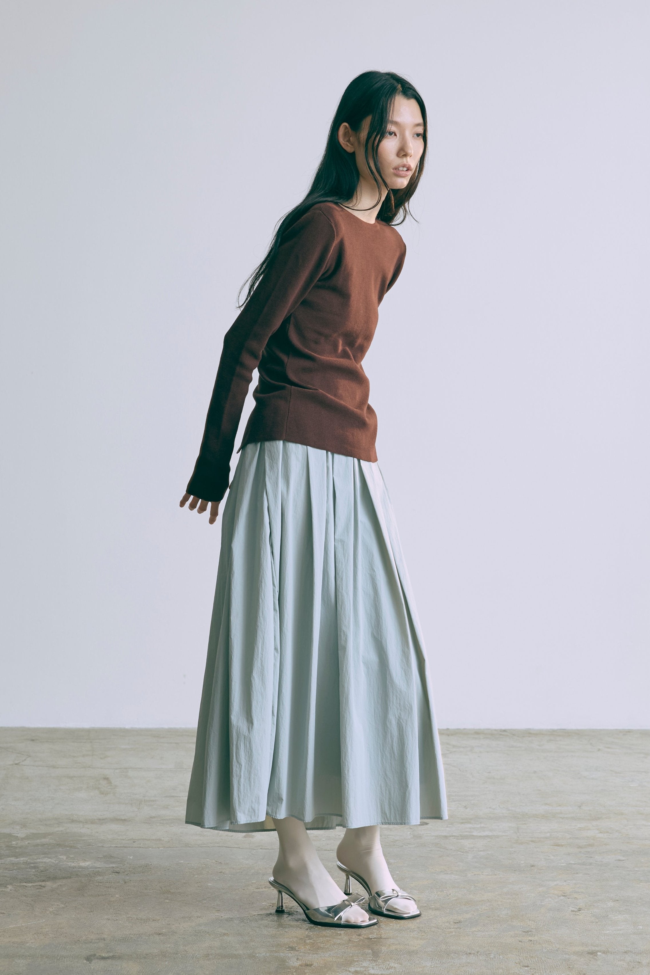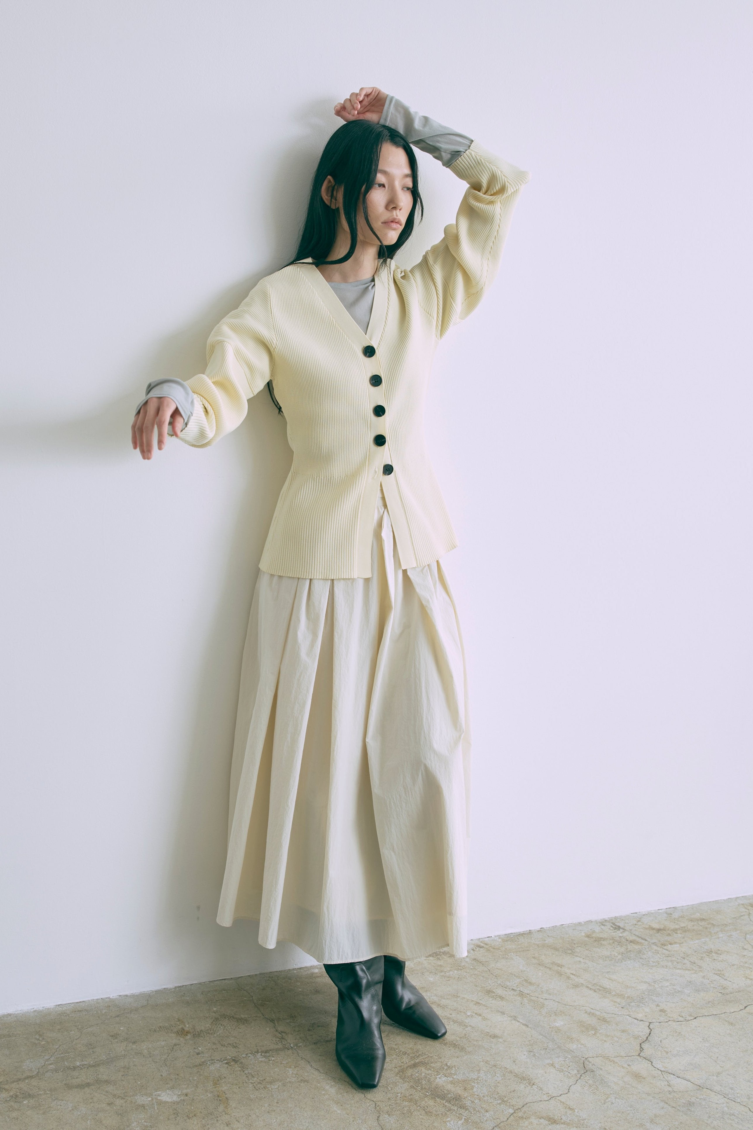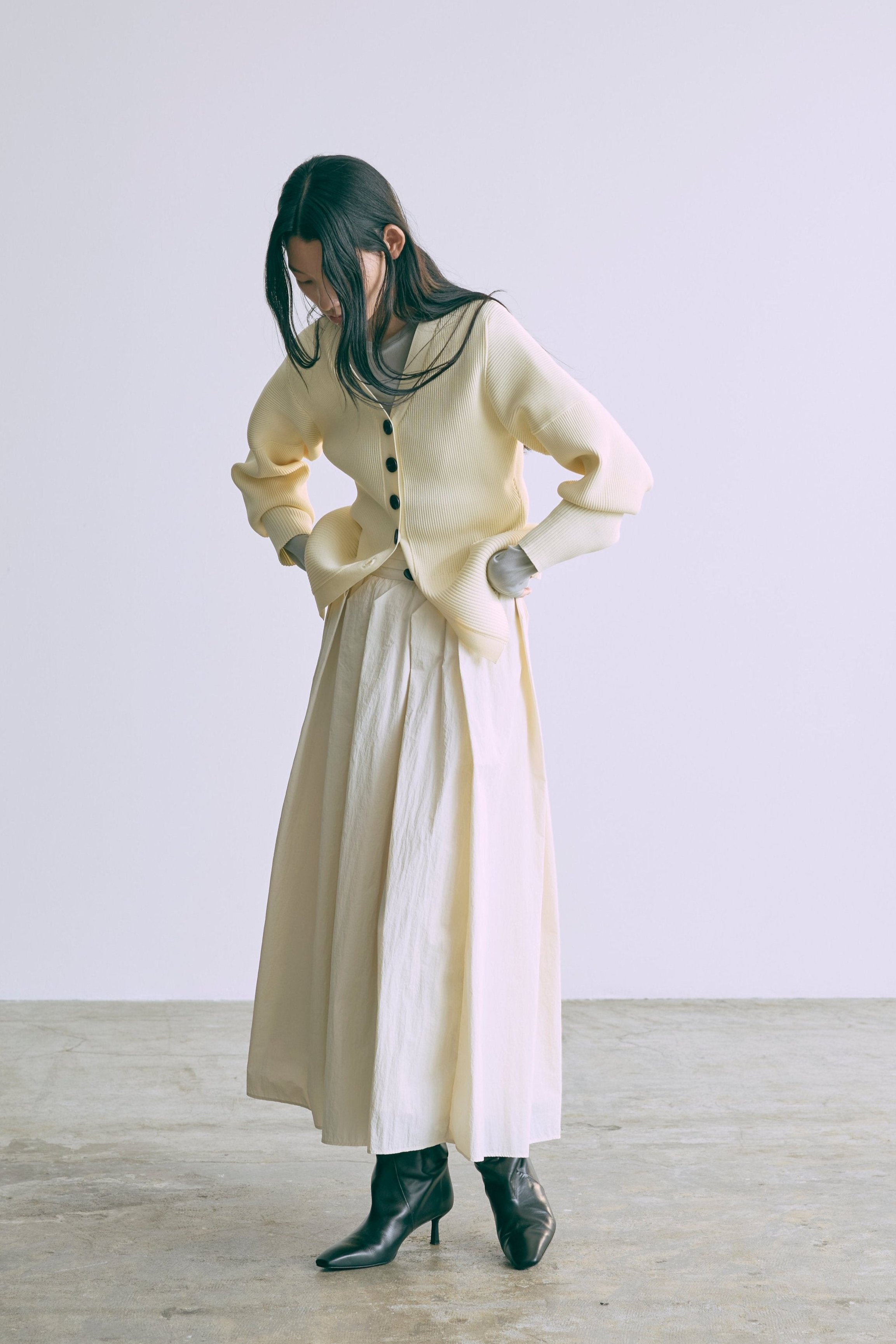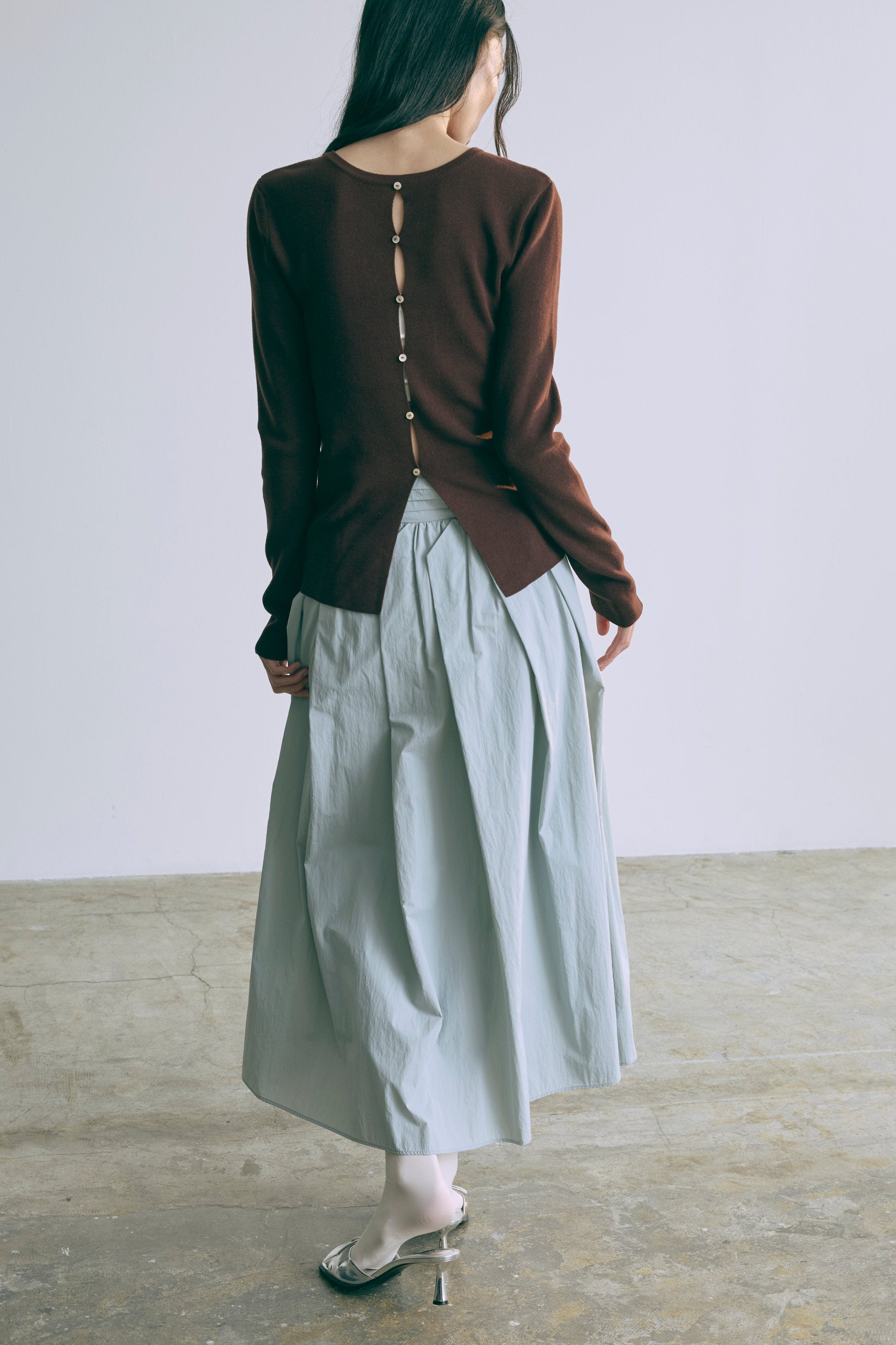 2WAYで楽しめる縦長ホールデザインのニットプルオーバー 【Material】 コットン混素材を使用したさらっとした着心地が魅力のニット。季節を問わずロングシーズンで活躍します。 【Design】 フロント中央に縦長のホールが入ったデザインがポイント。ホール部分を背中側にしてシンプルに着こなすこともできる2WAY仕様です。飾りボタンがアクセントになっており、今年らしい抜け感を演出。一枚で華やかさが際立つアイテムです。 【Styling point】 すっきりとしたシルエットで、ワイドパンツやボリュームのあるボトムスとも相性抜群。ジャケットのインナーとしても合わせやすく、さまざまなコーディネートに取り入れやすいデザインです。