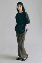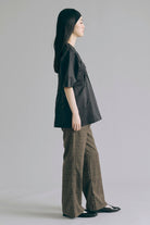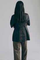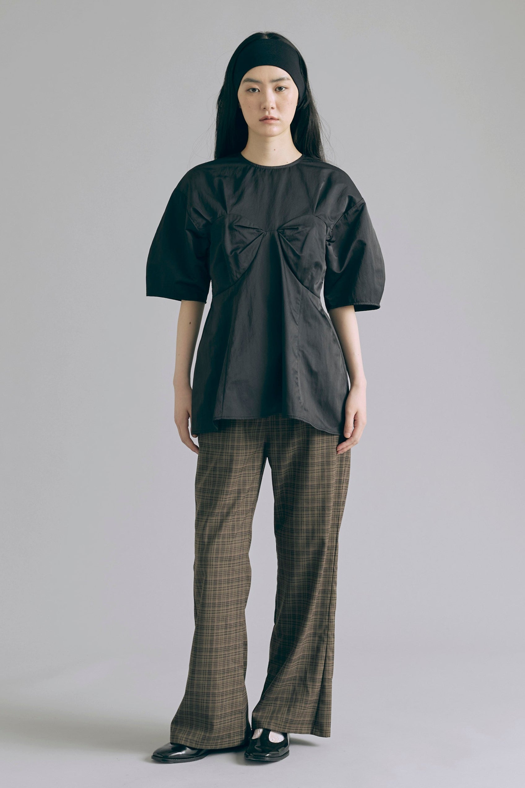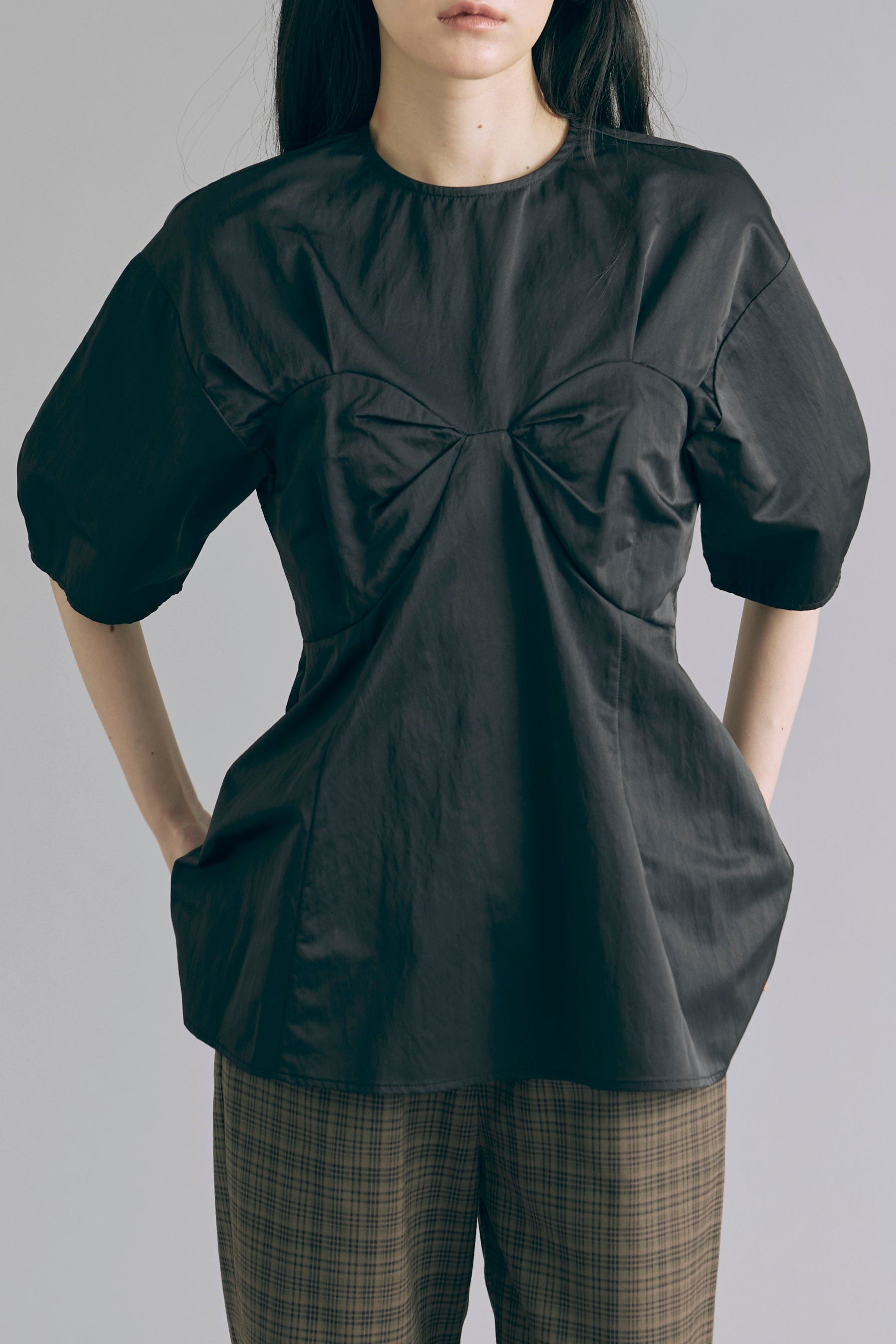 構築的なデザインが魅力のビスチェ風ブラウス 【Material】 上品な光沢とほどよいハリ感のあるナイロンポリエステル素材を使用し、モードな雰囲気をプラスしました。 【Design】 ビスチェをレイヤードしたような立体的なデザインが特徴。ゆるやかなカーブを描く五分袖や、着用時にほんのりコクーンシルエットになるボディラインなど、バランスにこだわって仕上げました。 背面はコンシールファスナー仕様で、すっきりとした印象に。 【Styling point】 やや長めの着丈なので、ハーフレギンスと合わせるだけで旬なスタイリングが完成。 大人っぽく着こなしたい方は、ワイドスラックスと合わせることで、程よくルーズで女性らしさも感じるMIXスタイルを楽しめます。