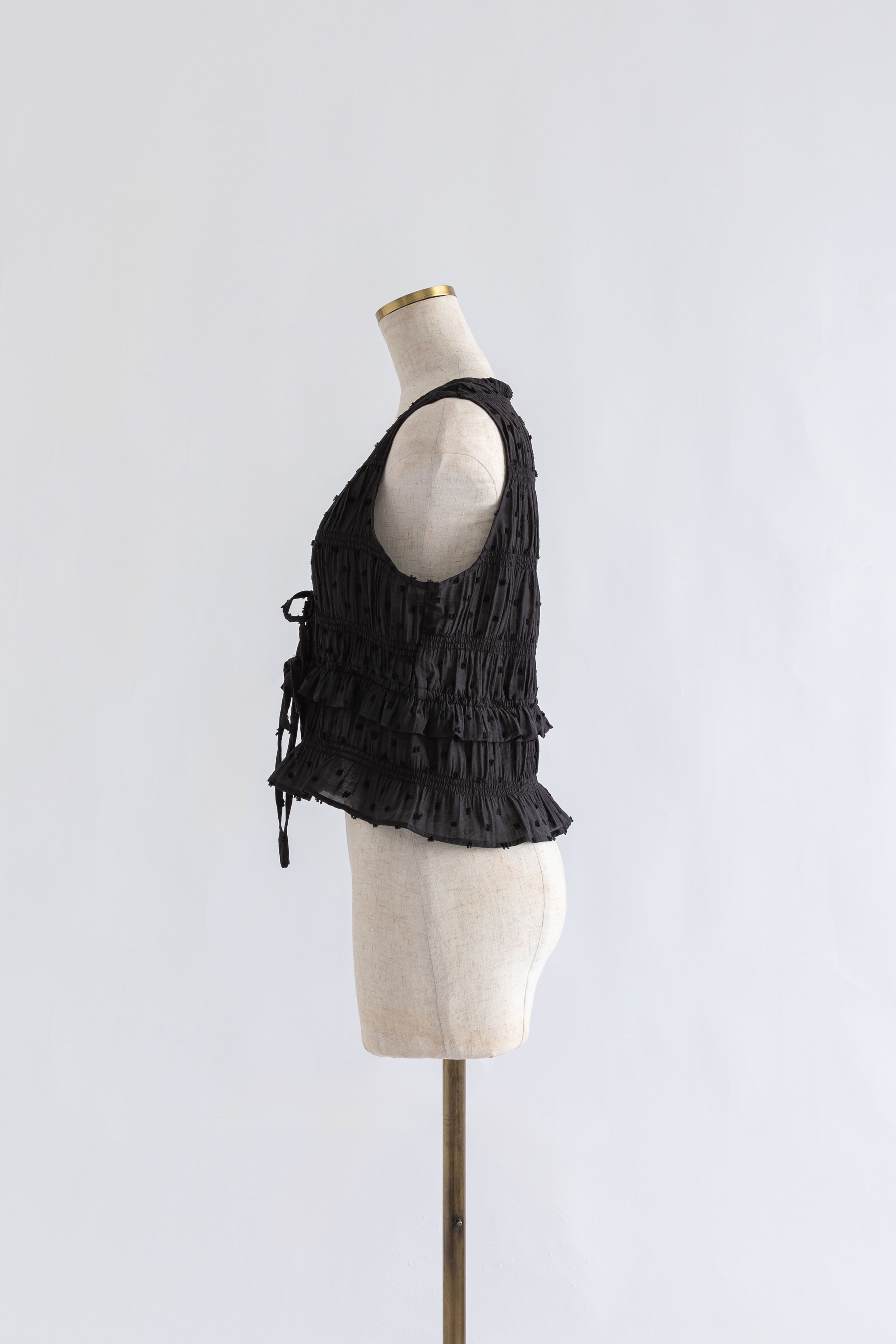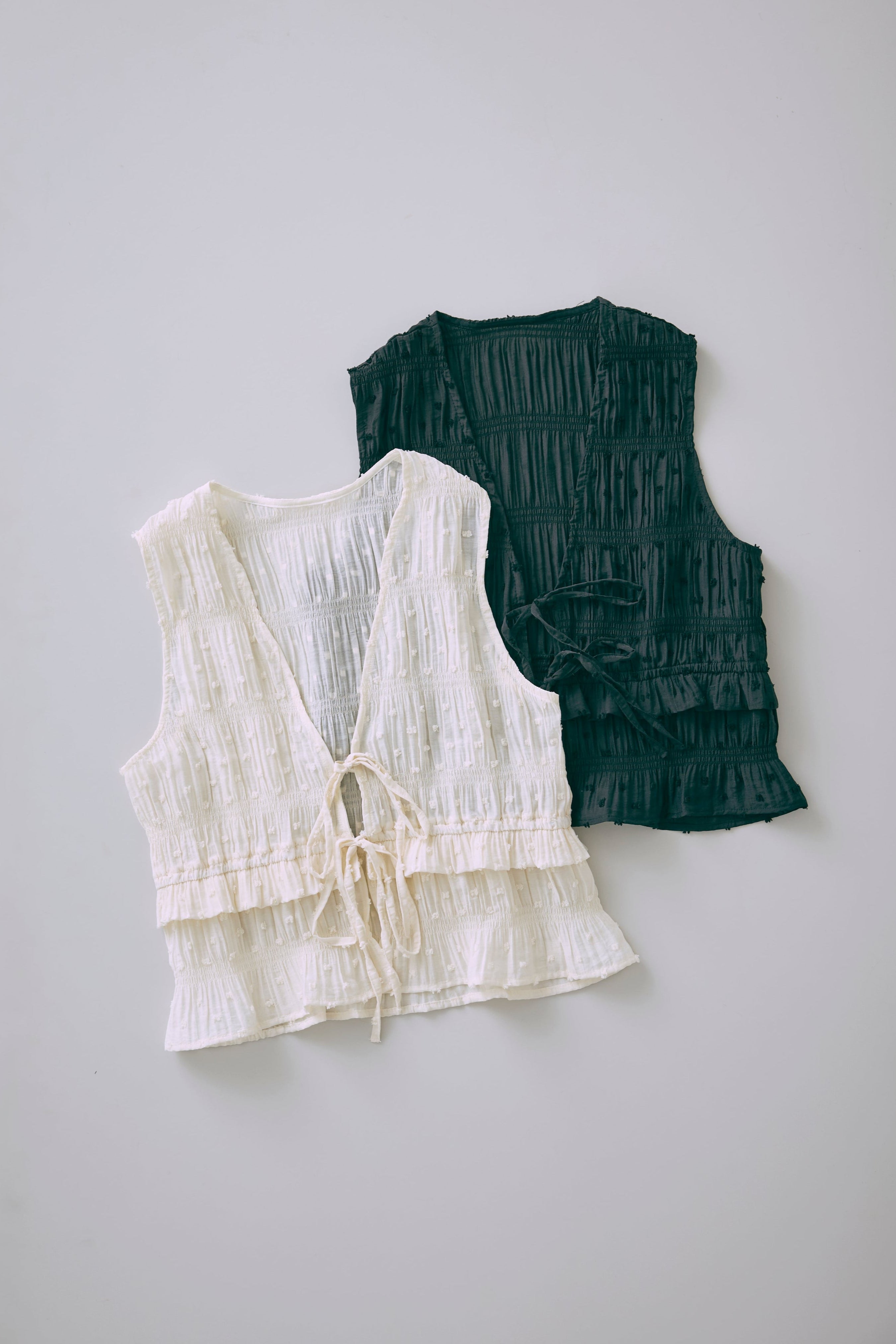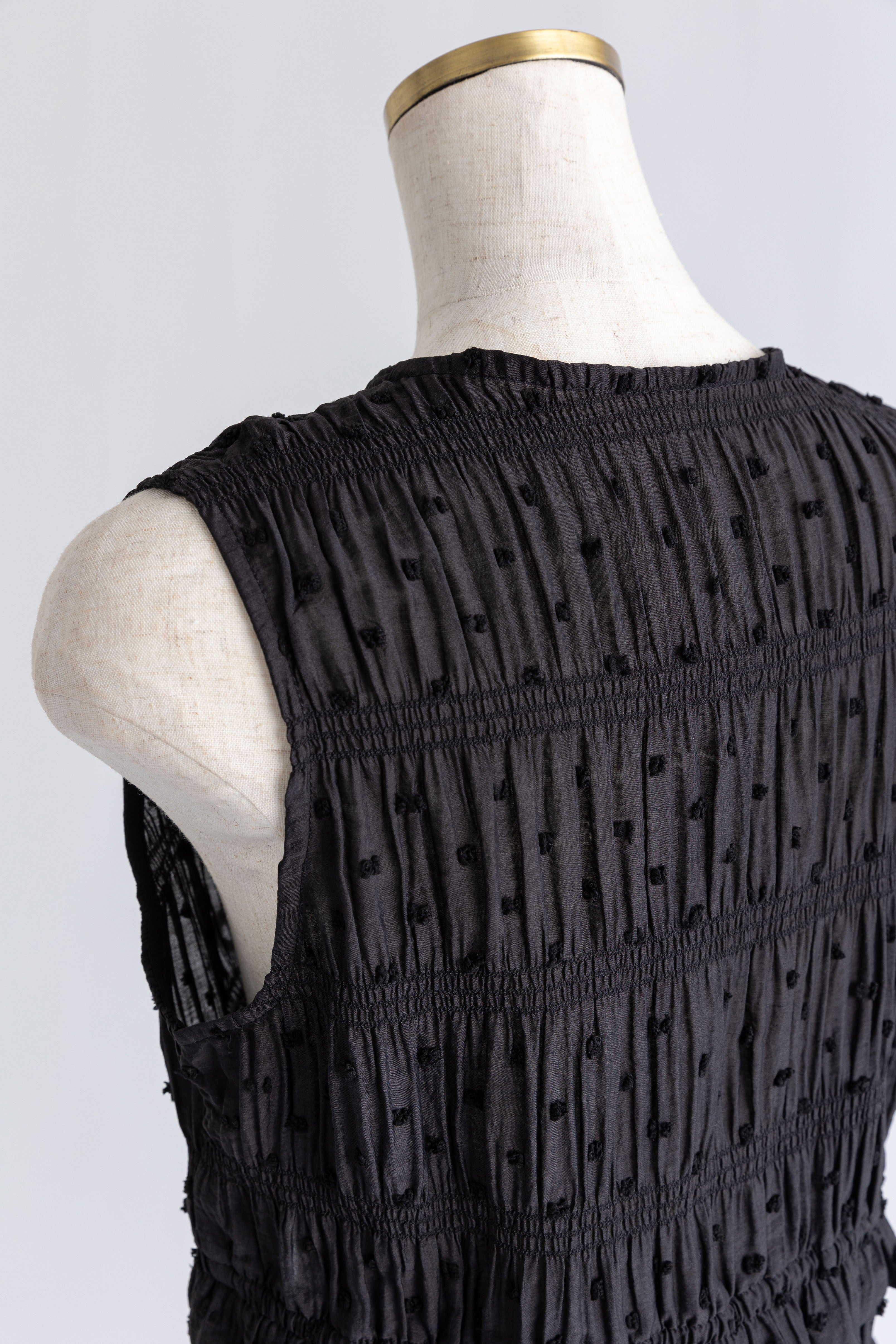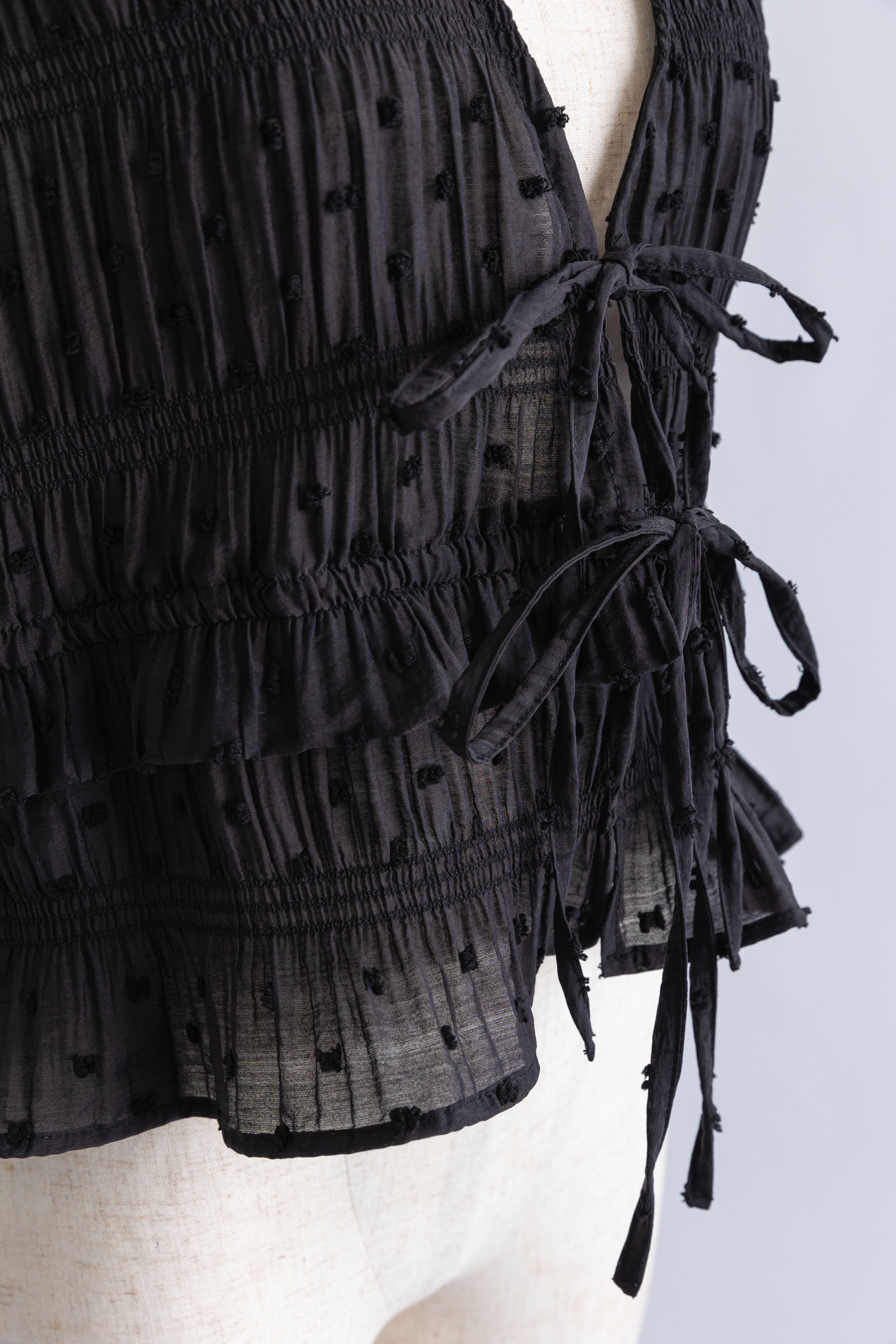 甘さを引き算した大人のためのドットスモックブラウス 【Material】 立体感のあるドットがポイントのドビー織り素材。シャーリングをたっぷり施した、ふくらみのあるシルエットが特徴。軽やかなのに存在感があり、1枚で着映える素材感です。 【Design】 深めのVネックに、フロントのダブルリボンが視線を引くアクセント。 甘くなりがちなスモックデザインをコンパクトなシルエットで引き締め、程よいフェミニンさに仕上げた一枚です。 【Styling point】 クールなデニムやスラックスで甘さを引き算。さらに、ニットパンツなどルーズなアイテムと合わせれば、こなれ感のある大人のリラックススタイルに。 シューズや小物でエッジを効かせるのもおすすめ。