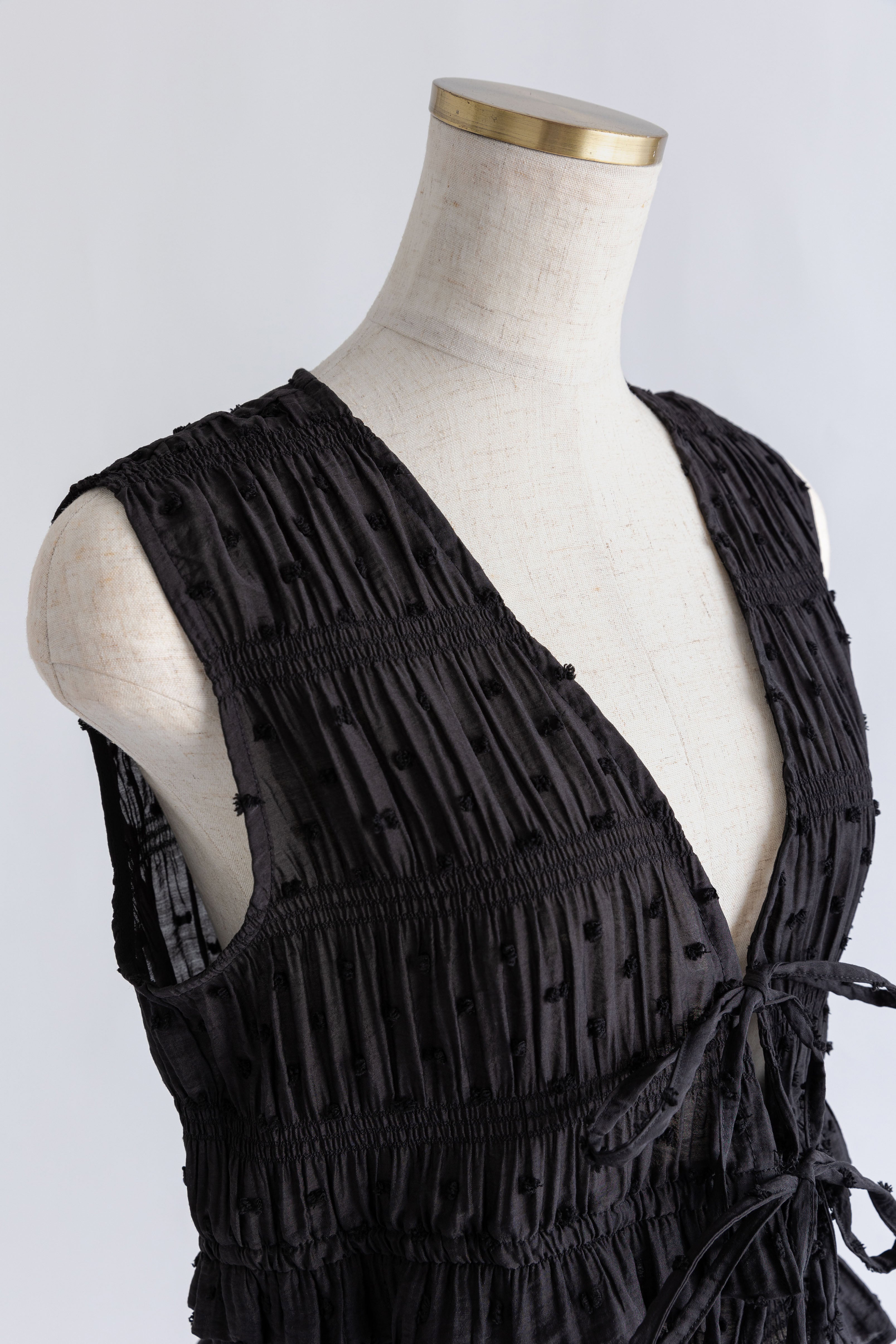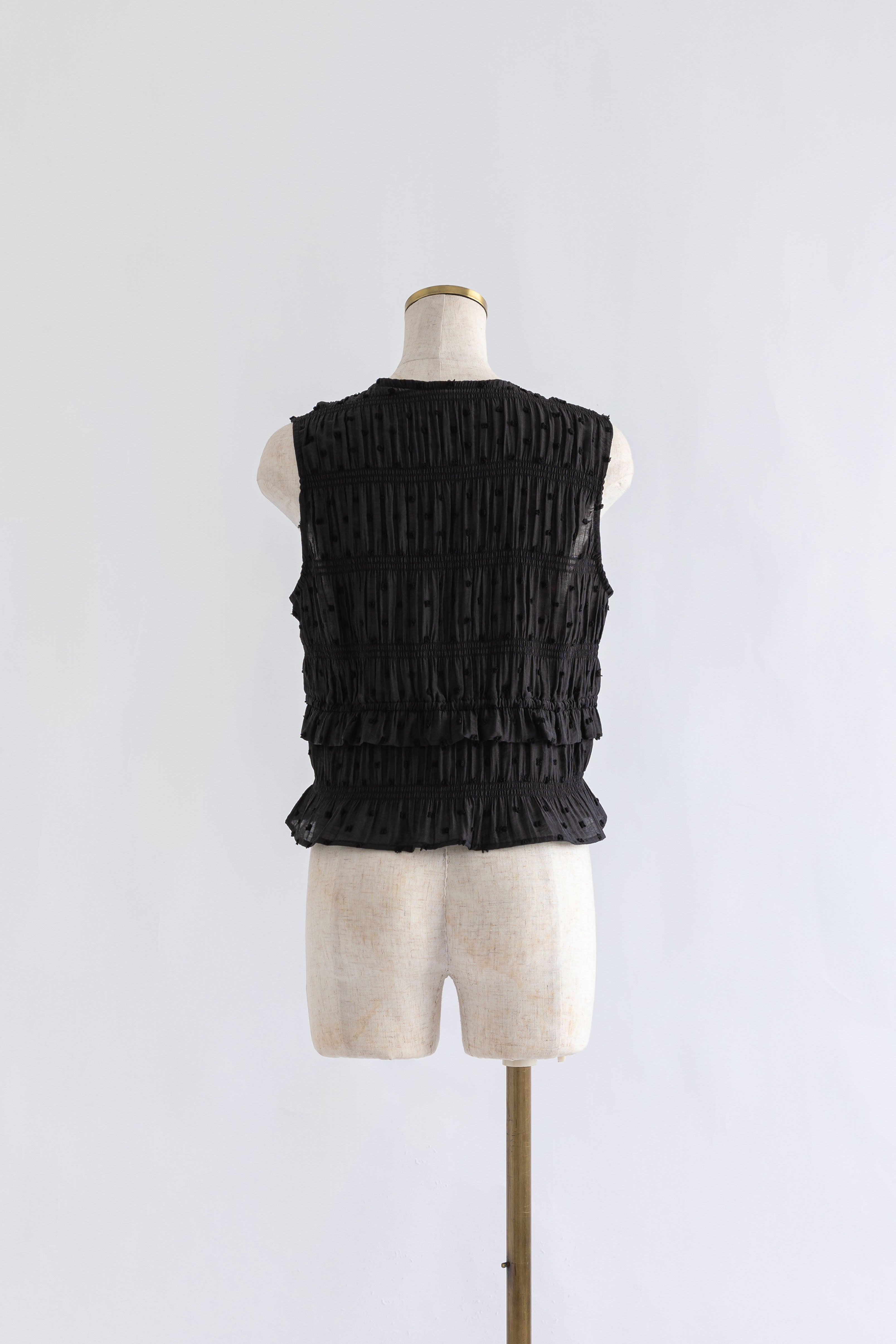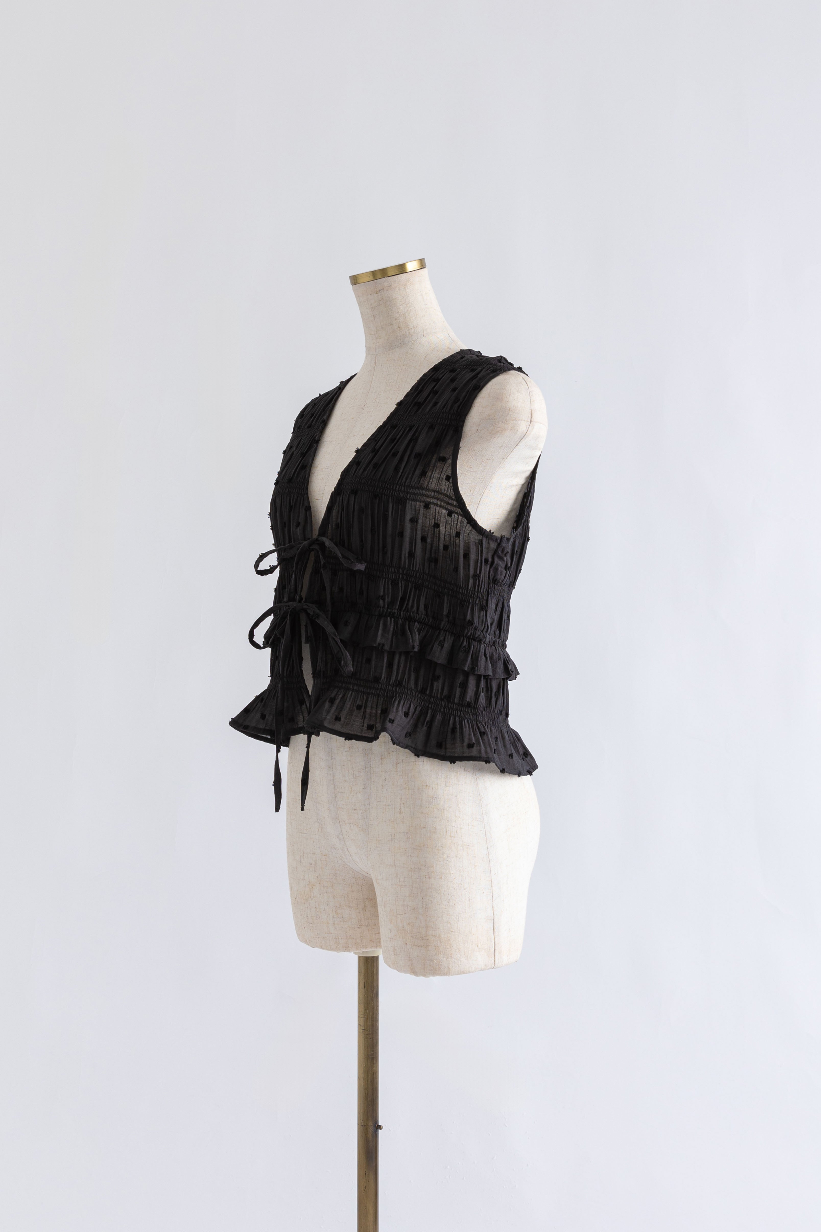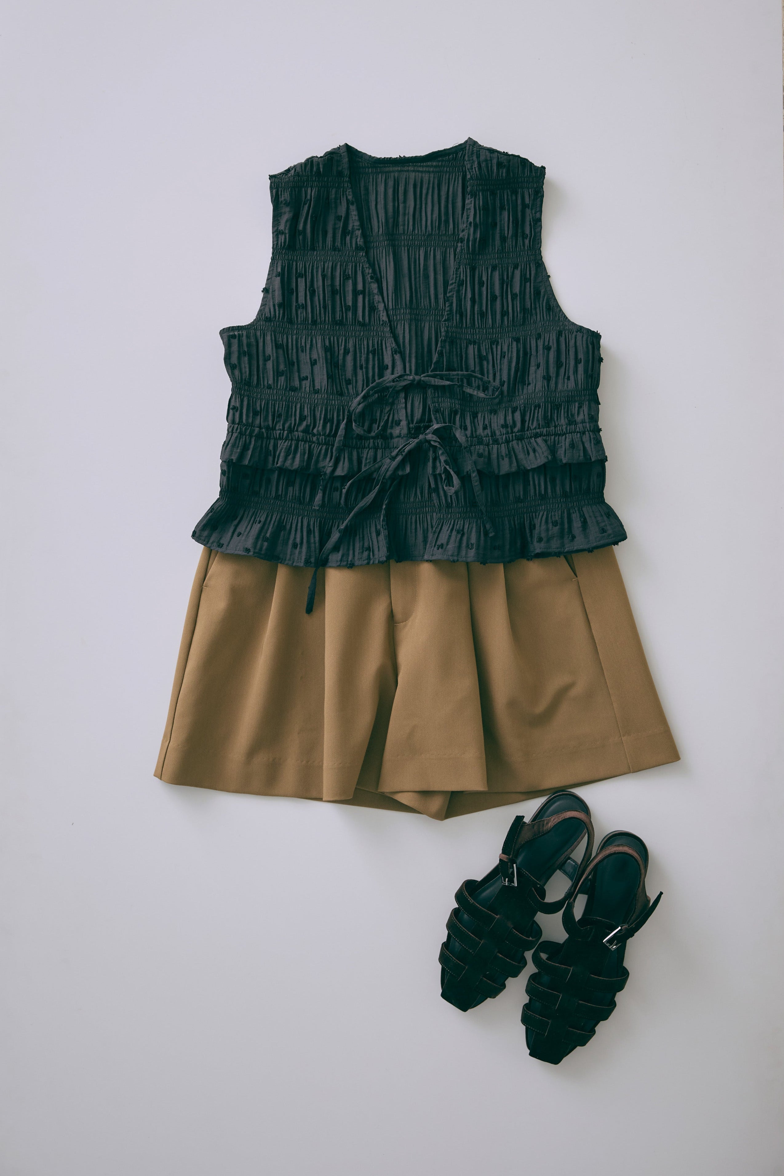 甘さを引き算した大人のためのドットスモックブラウス 【Material】 立体感のあるドットがポイントのドビー織り素材。シャーリングをたっぷり施した、ふくらみのあるシルエットが特徴。軽やかなのに存在感があり、1枚で着映える素材感です。 【Design】 深めのVネックに、フロントのダブルリボンが視線を引くアクセント。 甘くなりがちなスモックデザインをコンパクトなシルエットで引き締め、程よいフェミニンさに仕上げた一枚です。 【Styling point】 クールなデニムやスラックスで甘さを引き算。さらに、ニットパンツなどルーズなアイテムと合わせれば、こなれ感のある大人のリラックススタイルに。 シューズや小物でエッジを効かせるのもおすすめ。