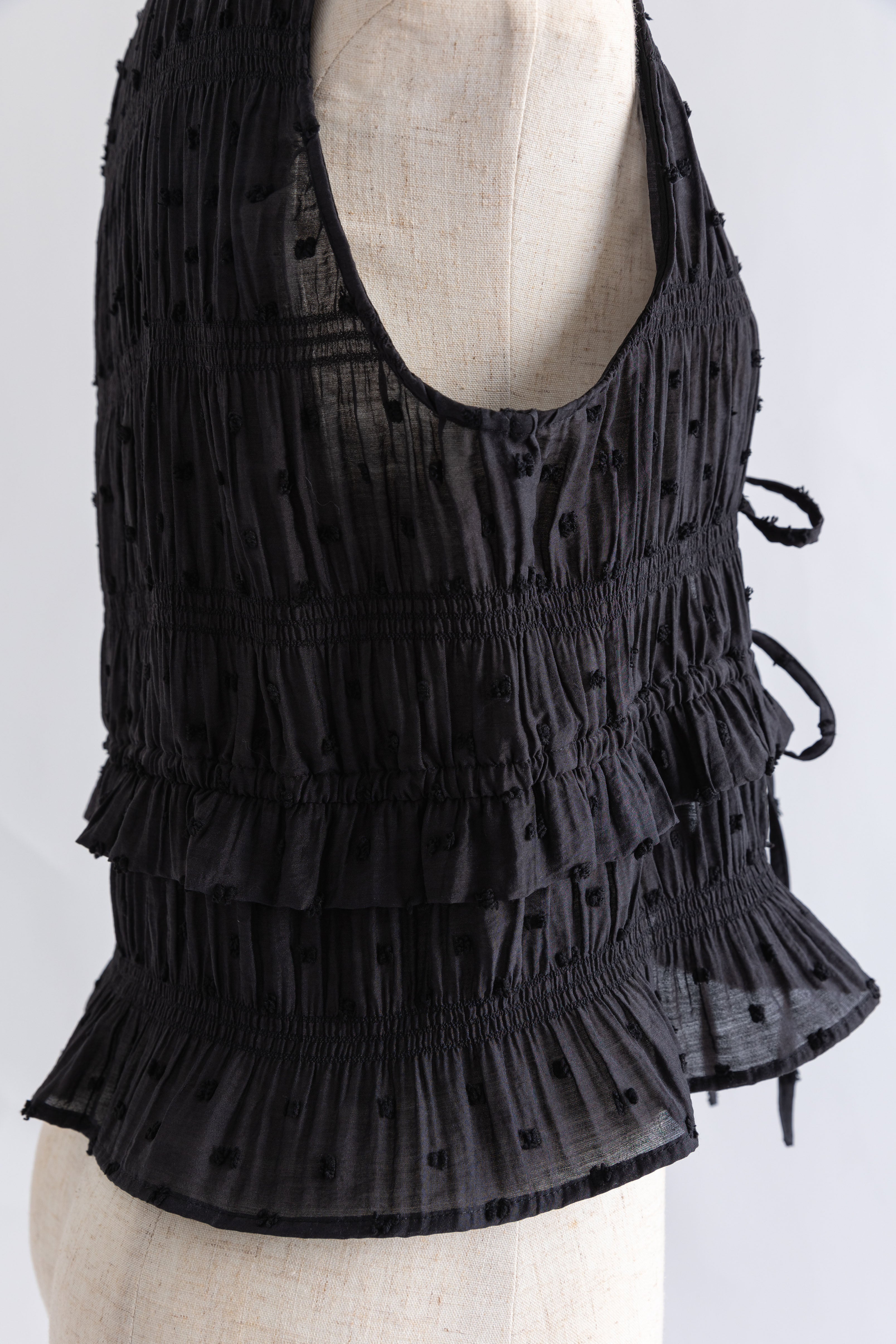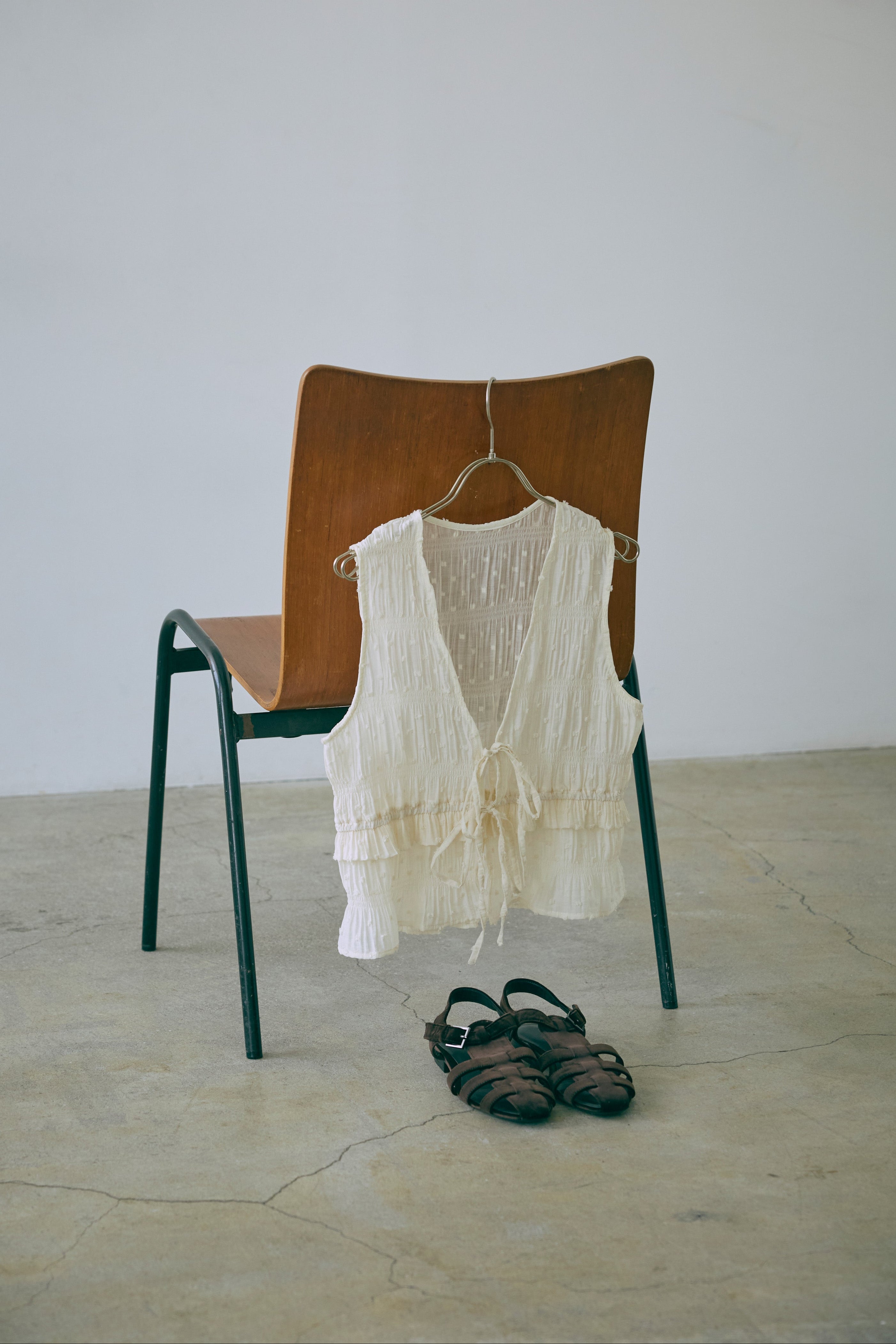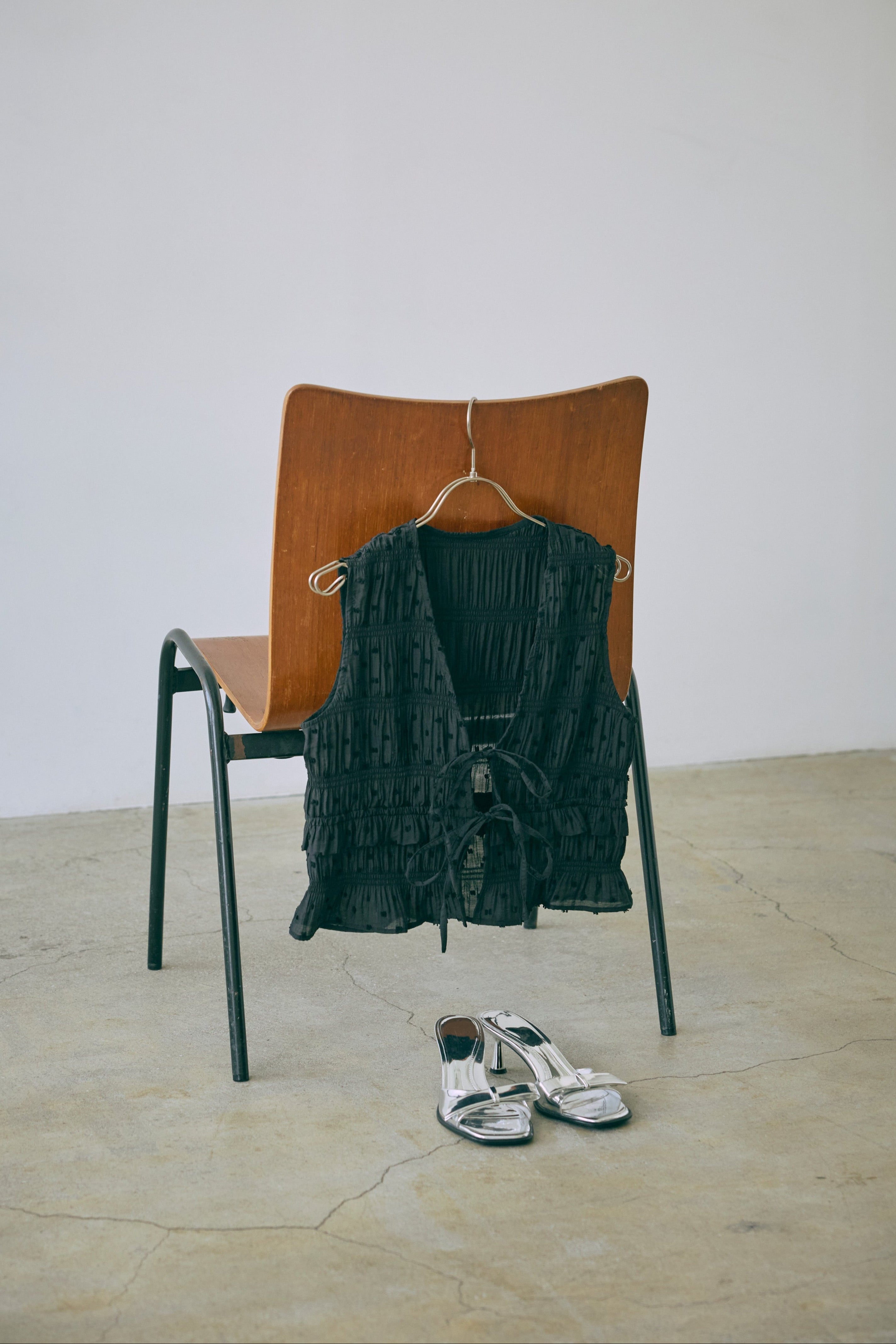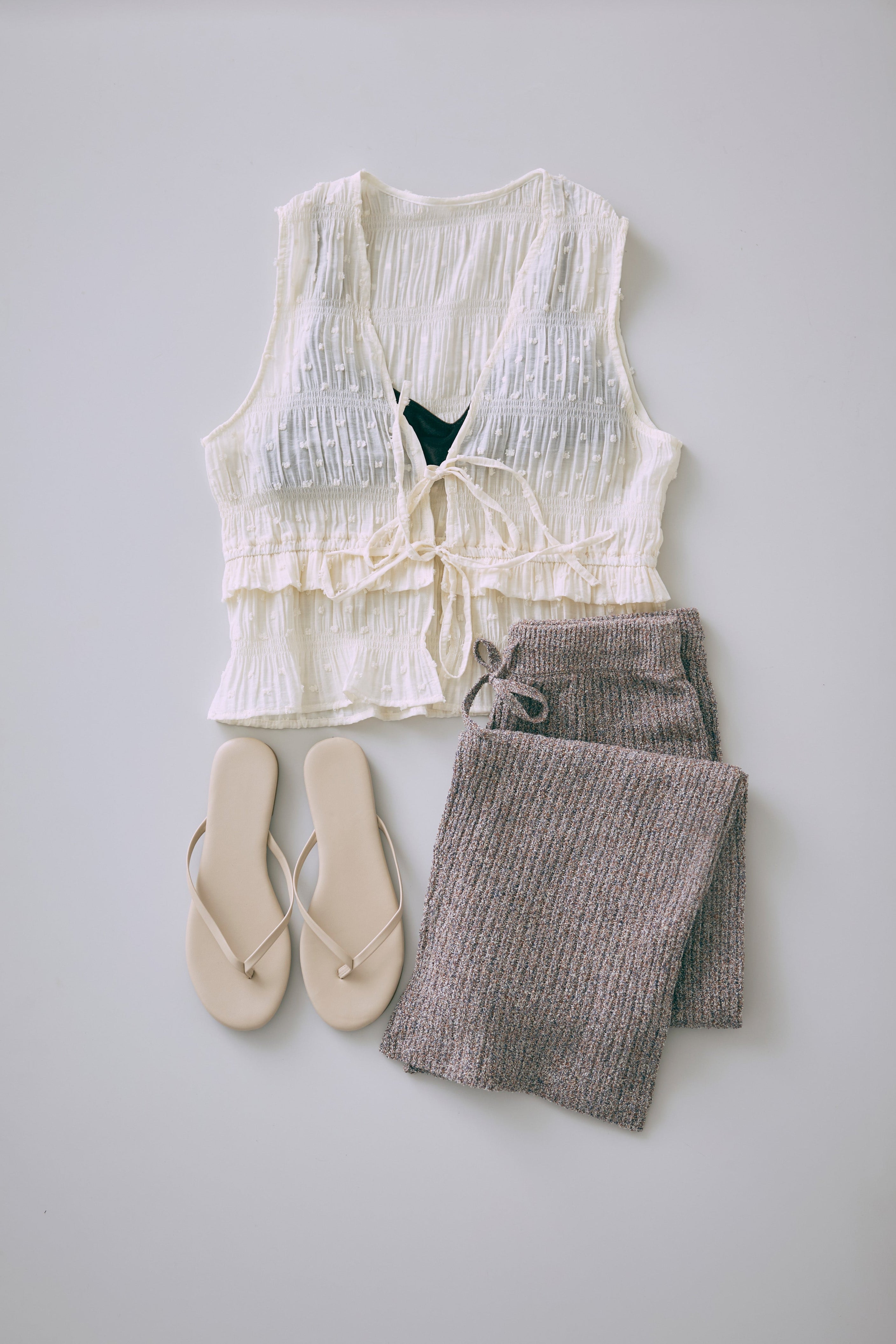 甘さを引き算した大人のためのドットスモックブラウス 【Material】 立体感のあるドットがポイントのドビー織り素材。シャーリングをたっぷり施した、ふくらみのあるシルエットが特徴。軽やかなのに存在感があり、1枚で着映える素材感です。 【Design】 深めのVネックに、フロントのダブルリボンが視線を引くアクセント。 甘くなりがちなスモックデザインをコンパクトなシルエットで引き締め、程よいフェミニンさに仕上げた一枚です。 【Styling point】 クールなデニムやスラックスで甘さを引き算。さらに、ニットパンツなどルーズなアイテムと合わせれば、こなれ感のある大人のリラックススタイルに。 シューズや小物でエッジを効かせるのもおすすめ。