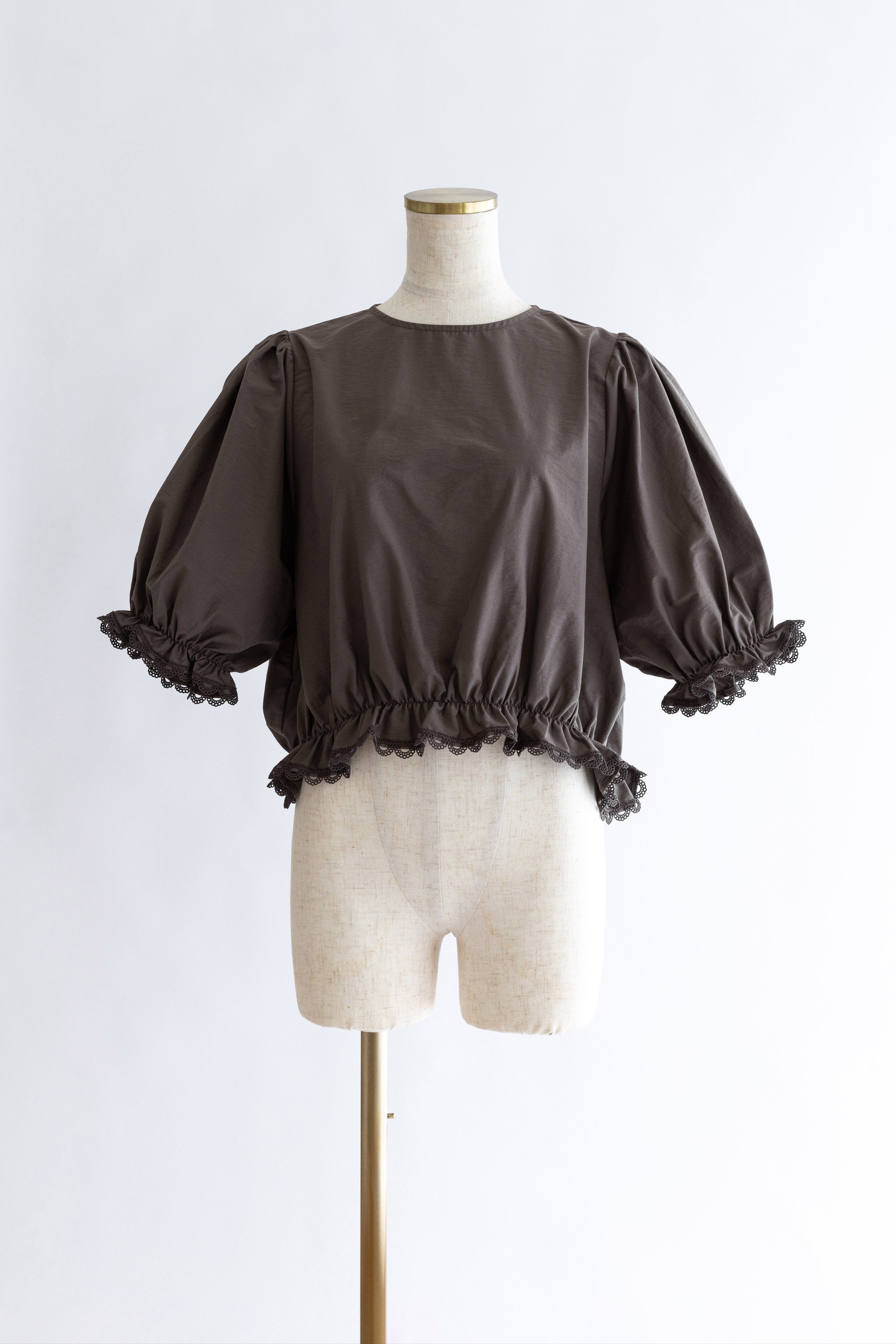 甘さと抜け感のバランスが絶妙。レーストリムがポイントのバルーンブラウス 【Material】 程よいハリとマットな質感が秋ムードにぴったり。軽やかだけど季節感はしっかりキープできるお素材です。 【Design】 裾と袖口にレースをあしらった、ひと目で映える華やかブラウス。バックスタイルにはポイントになる釦を添えて、後ろ姿まで抜かりなく。ボリュームスリーブで旬のバルーンシルエットも楽しめる、甘さもトレンドも欲張れる一枚です。 【Styling point】 短め丈からちらりと肌を見せて、ヘルシーに着こなすのが気分。ミニボトムでとことんガーリーにも、スラックスやワイドパンツでメンズライクに振っても◎。甘辛MIXが自在に楽しめる万能トップスです。
