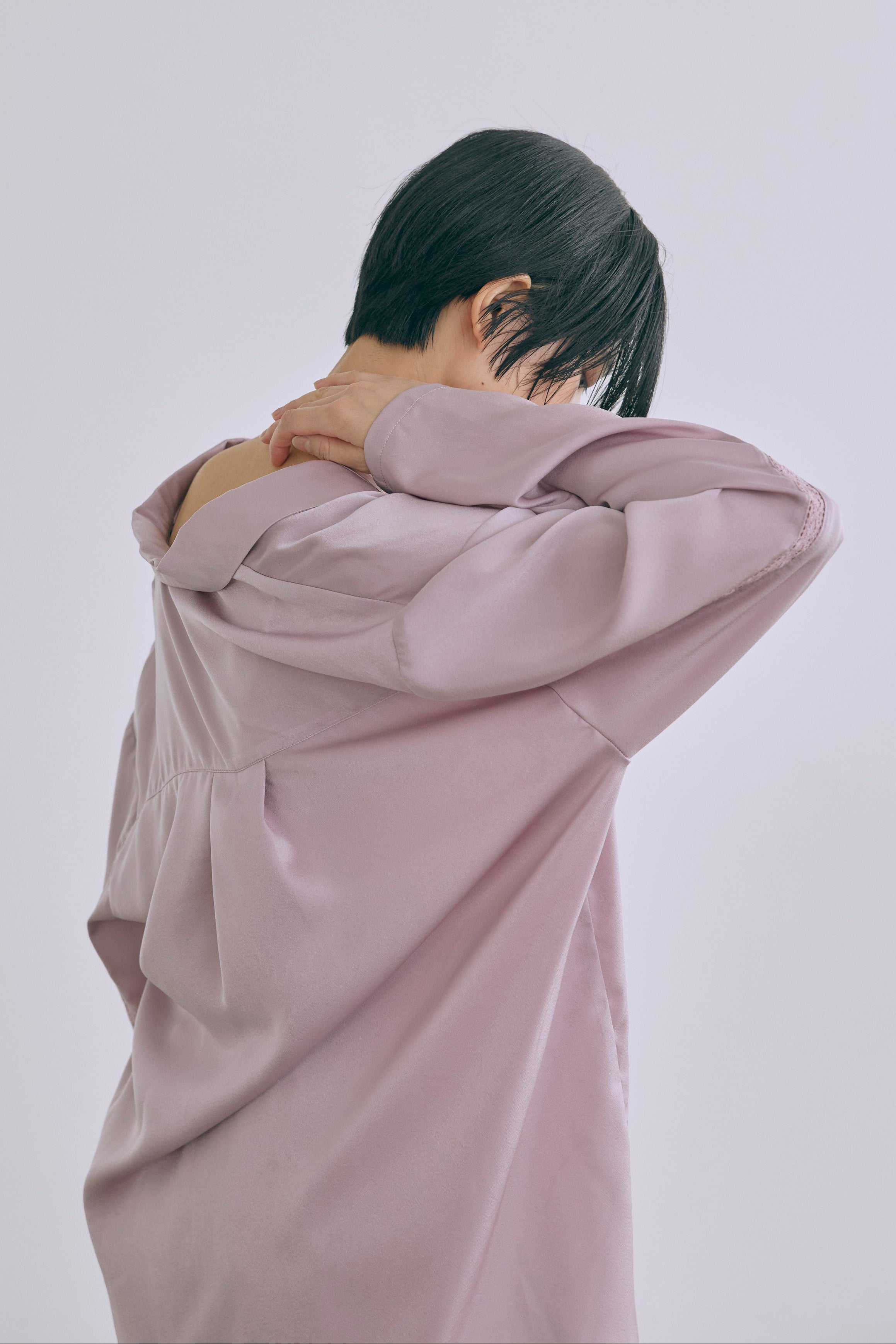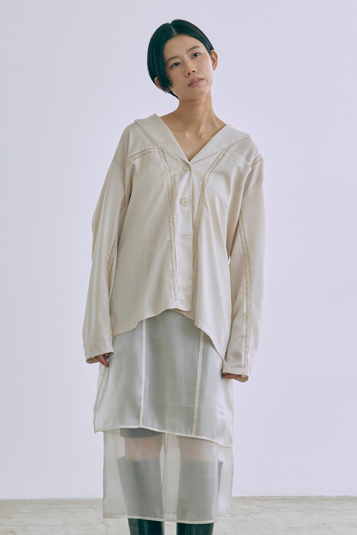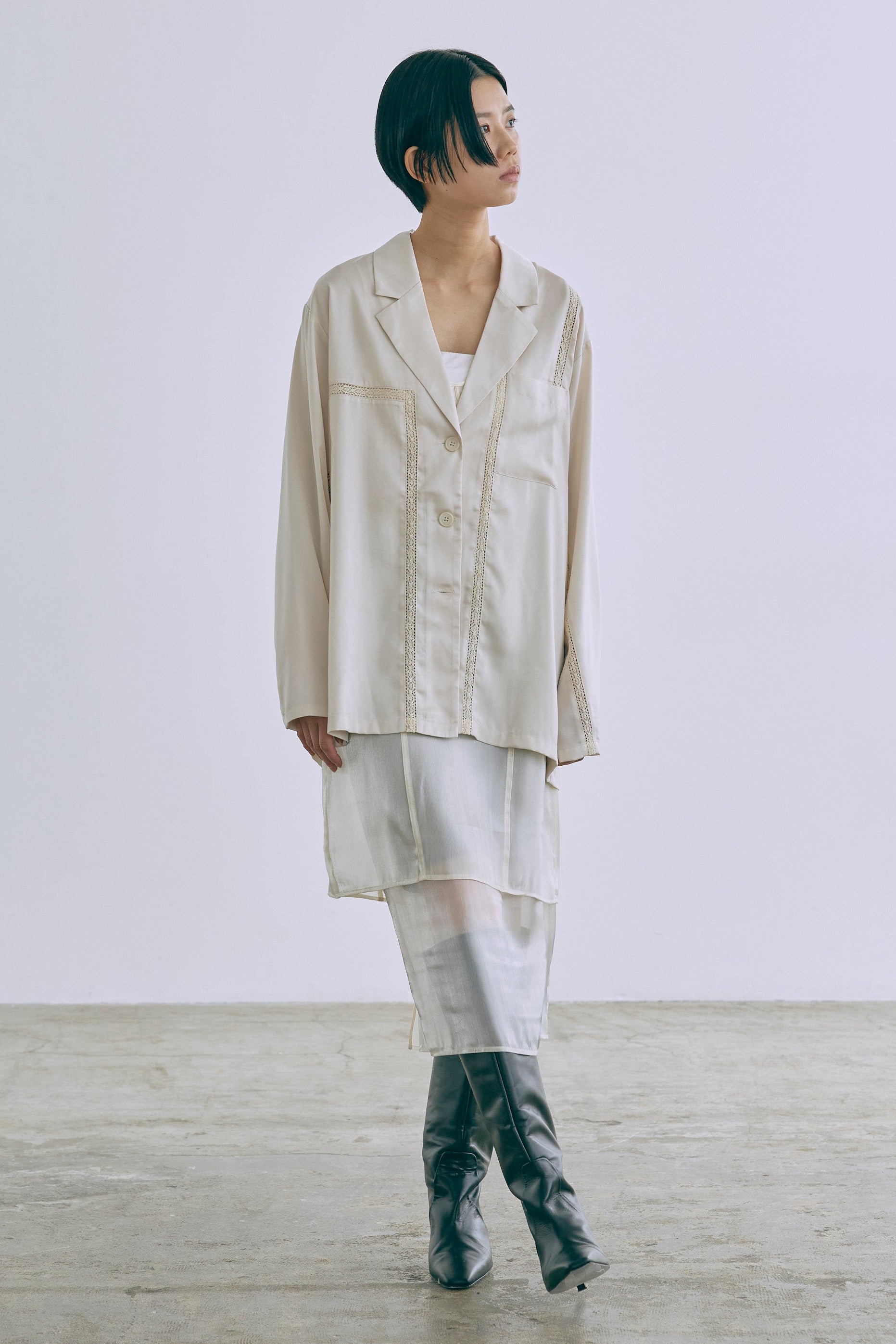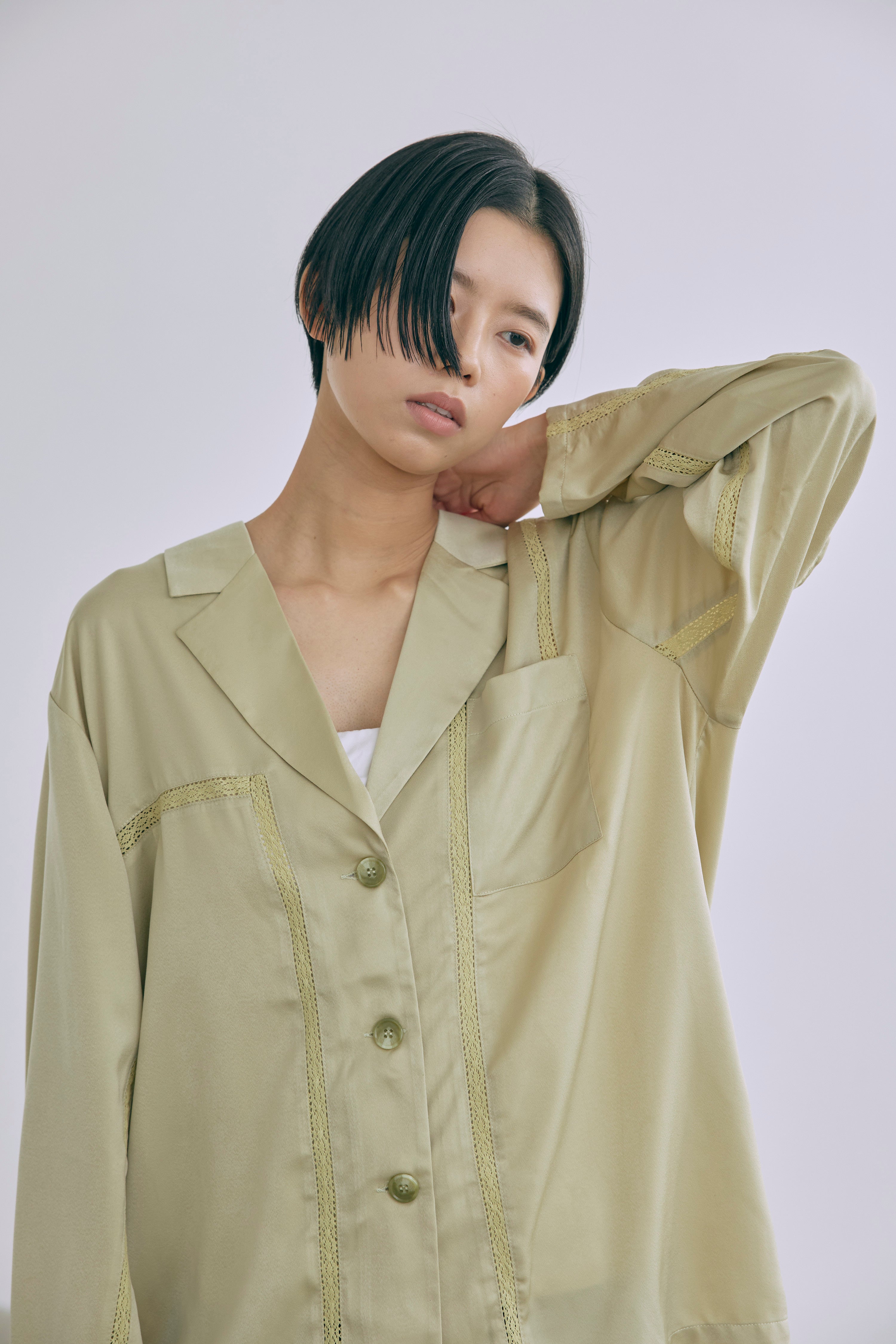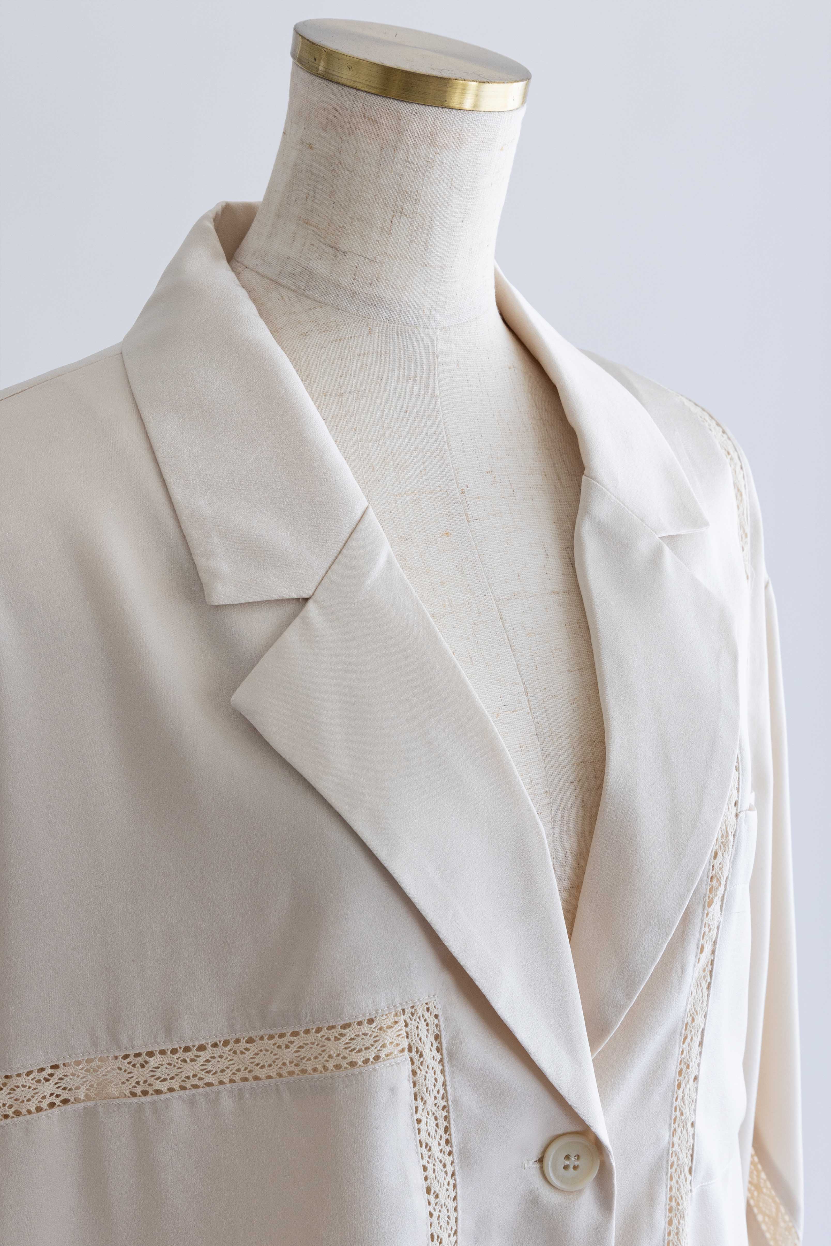 イレギュラーなレーストリムが目を引く、洗練されたシャツジャケット 【Material】 光沢のあるサテン素材を使用した、肌触りの良い滑らかなタッチのシャツジャケットです。 季節の変わり目にも快適に着用できます。 【Design】 シンプルなシャツ型に、フロントや袖にコットンレースを施しています。光沢のあるサテンと異素材のレースが組み合わさることで、上品な可愛らしさを感じるデザインです。 【Styling point】 キャミワンピやタイトスカートに合わせて、より女性らしさをプラスするスタイリングがおすすめです◎ 前ボタンを閉めればきちんと感を出せ、開けて羽織れば抜け感のあるスタイルに。
