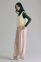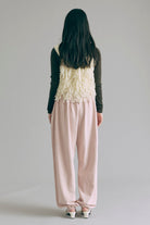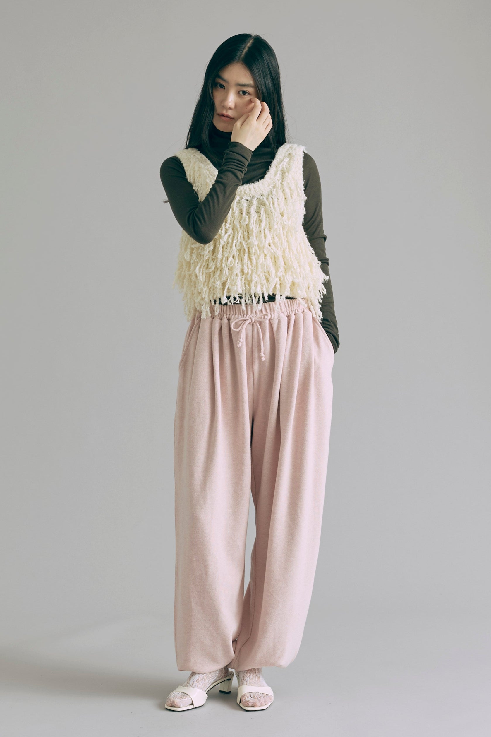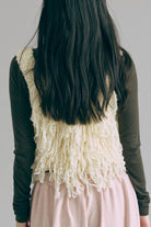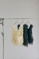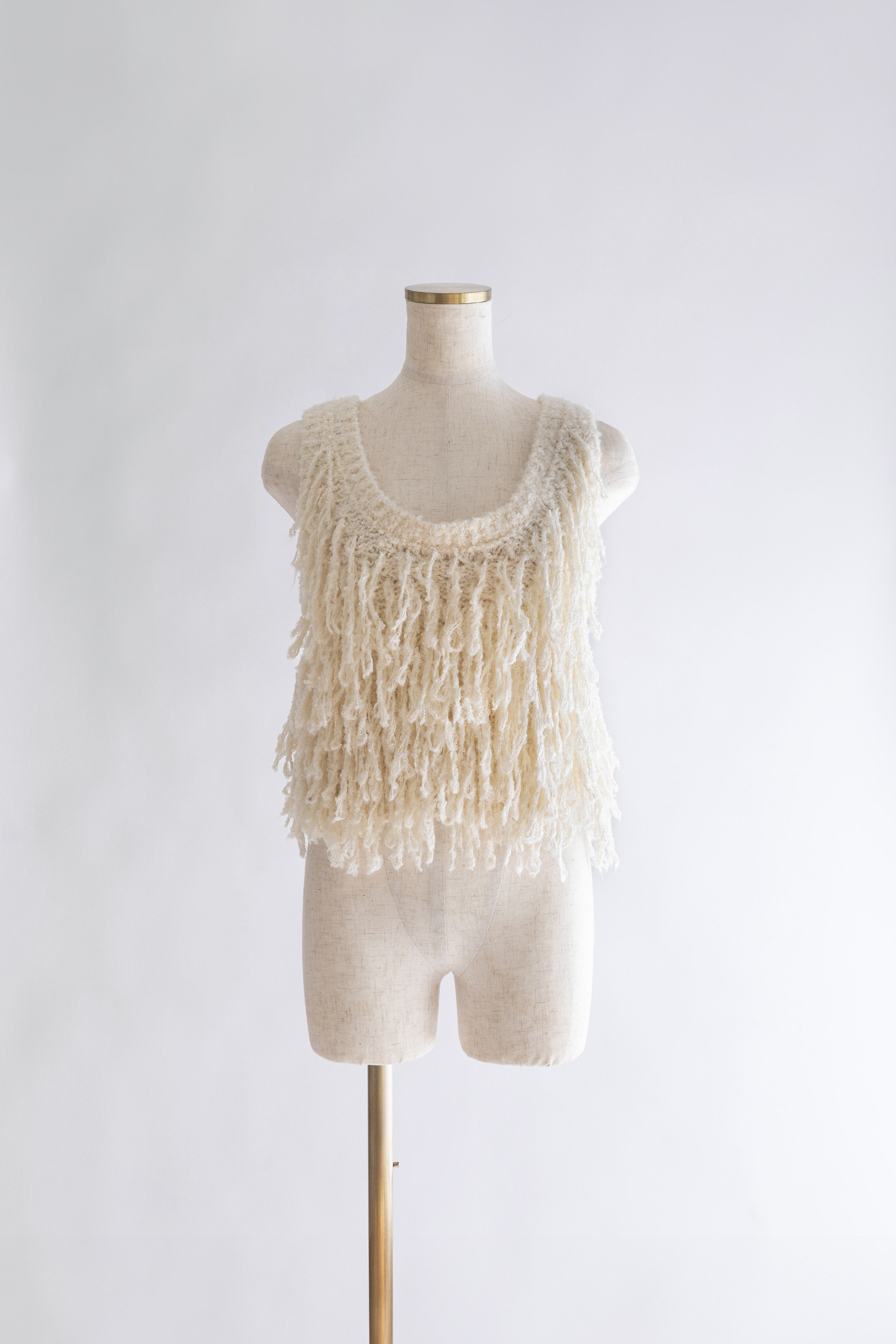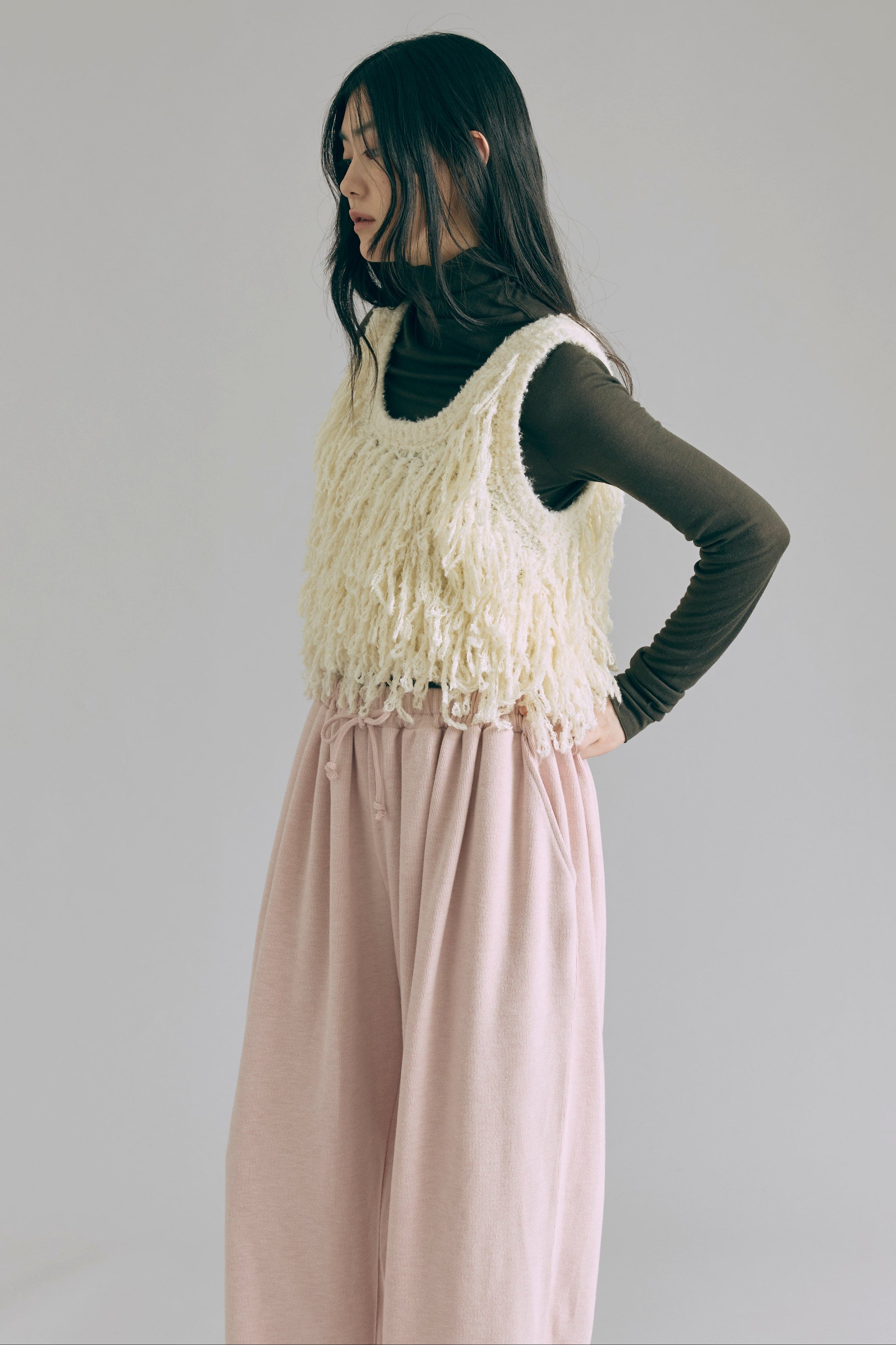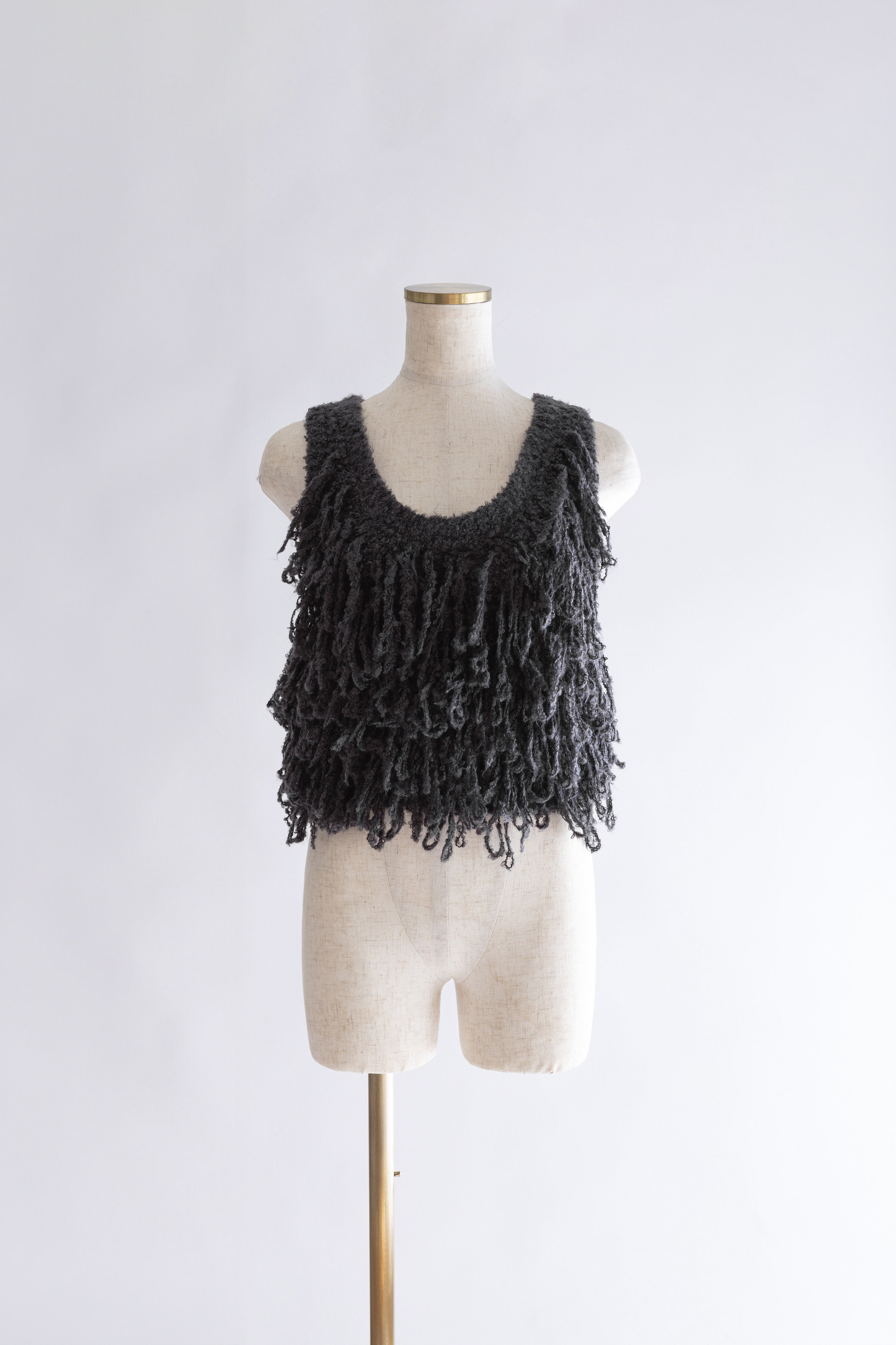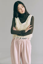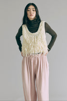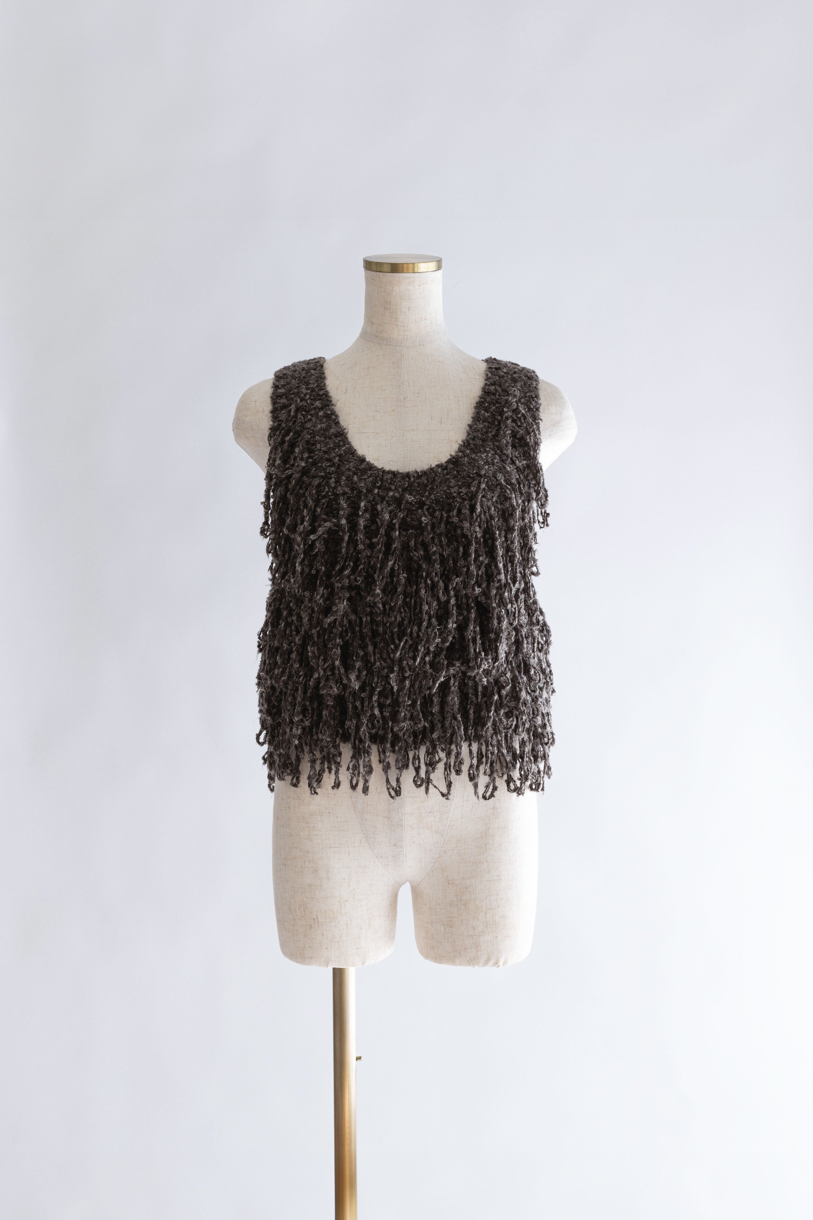 いつものスタイルにプラスして楽しむビスチェ 【Material】 柔らかな肌触りのニット素材。 伸縮性があり、タイトすぎず程よくフィットするバランスで、重ね着しても動きやすく快適です。 【Design】 コンパクトなシルエットに、繊細なフリンジを全体に施した華やかなデザイン。シンプルすぎず派手すぎないバランスで、動くたびに揺れるフリンジがコーディネートにさりげないアクセントを与えてくれます。 デイリーにも取り入れやすい実用性と、モード感のある見映えを両立。 【Styling point】 カットソーやタンクトップにさらっと重ねるだけで、今年らしいレイヤードスタイルが完成。 ジャケットやカーディガンのインナーとしても映えるので、季節を問わずさまざまなコーディネートに取り入れられます。