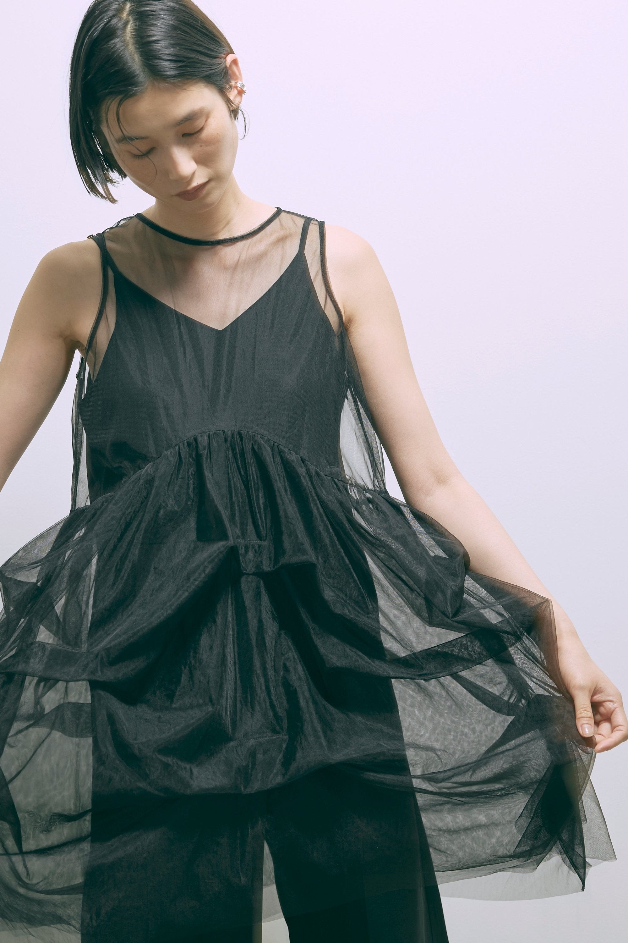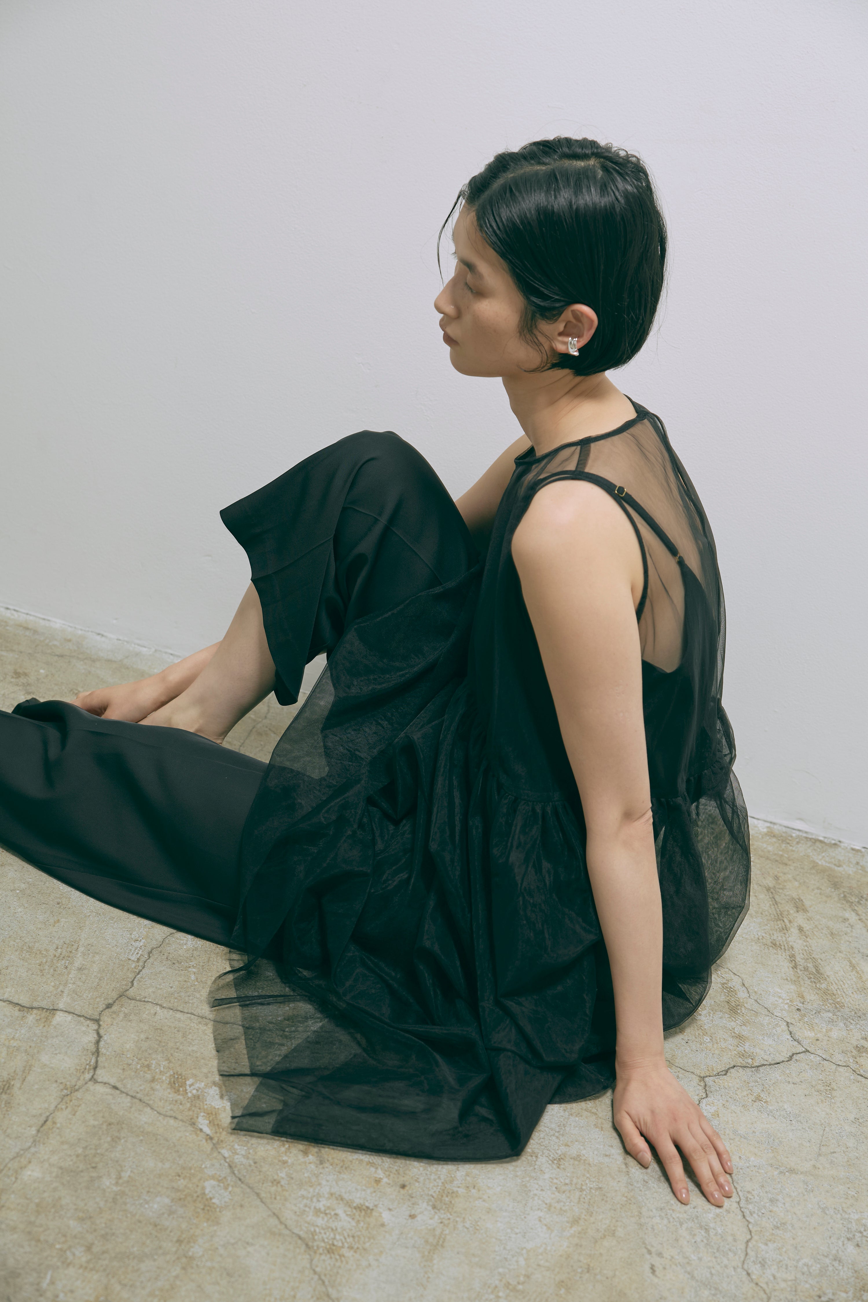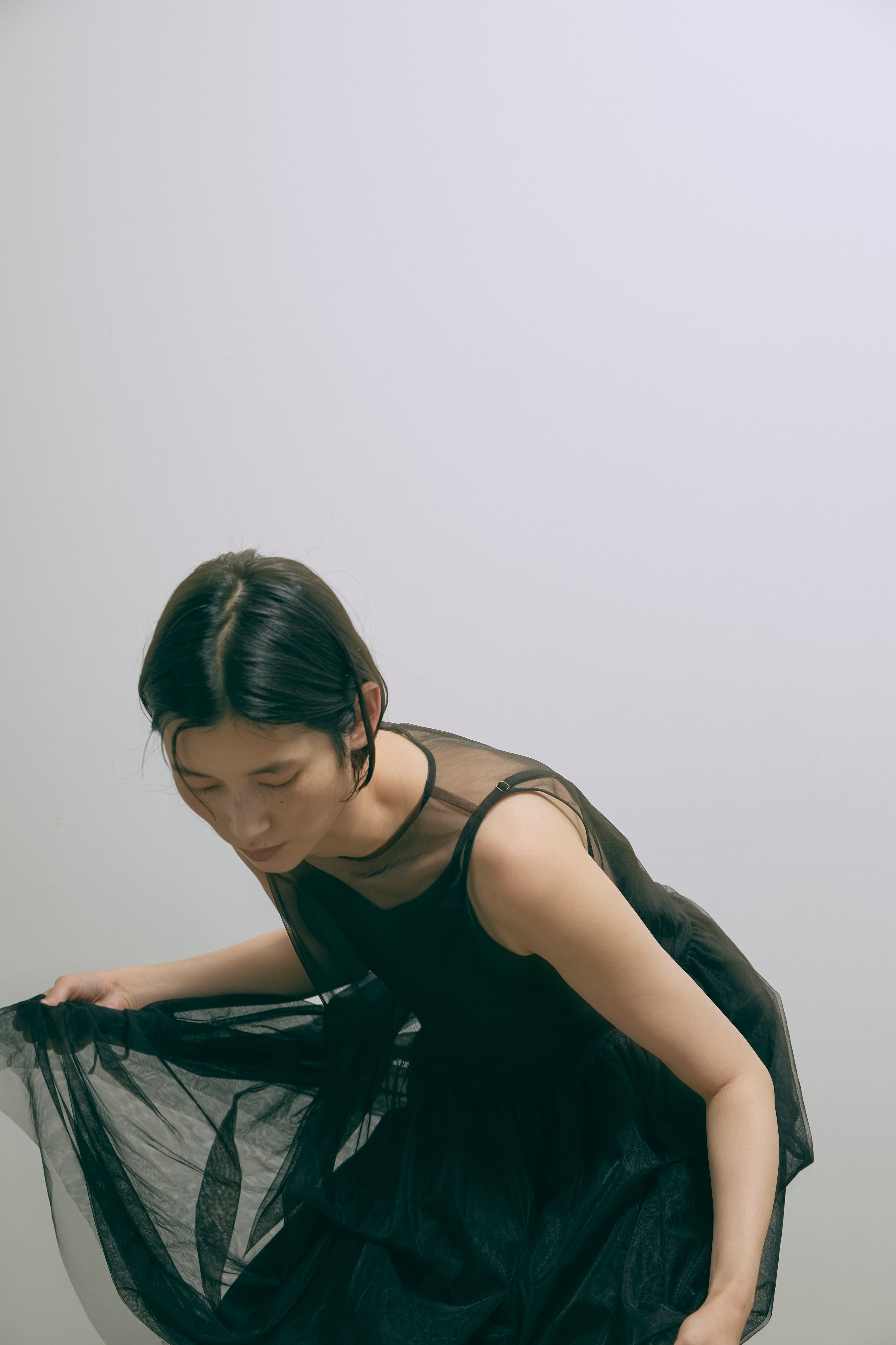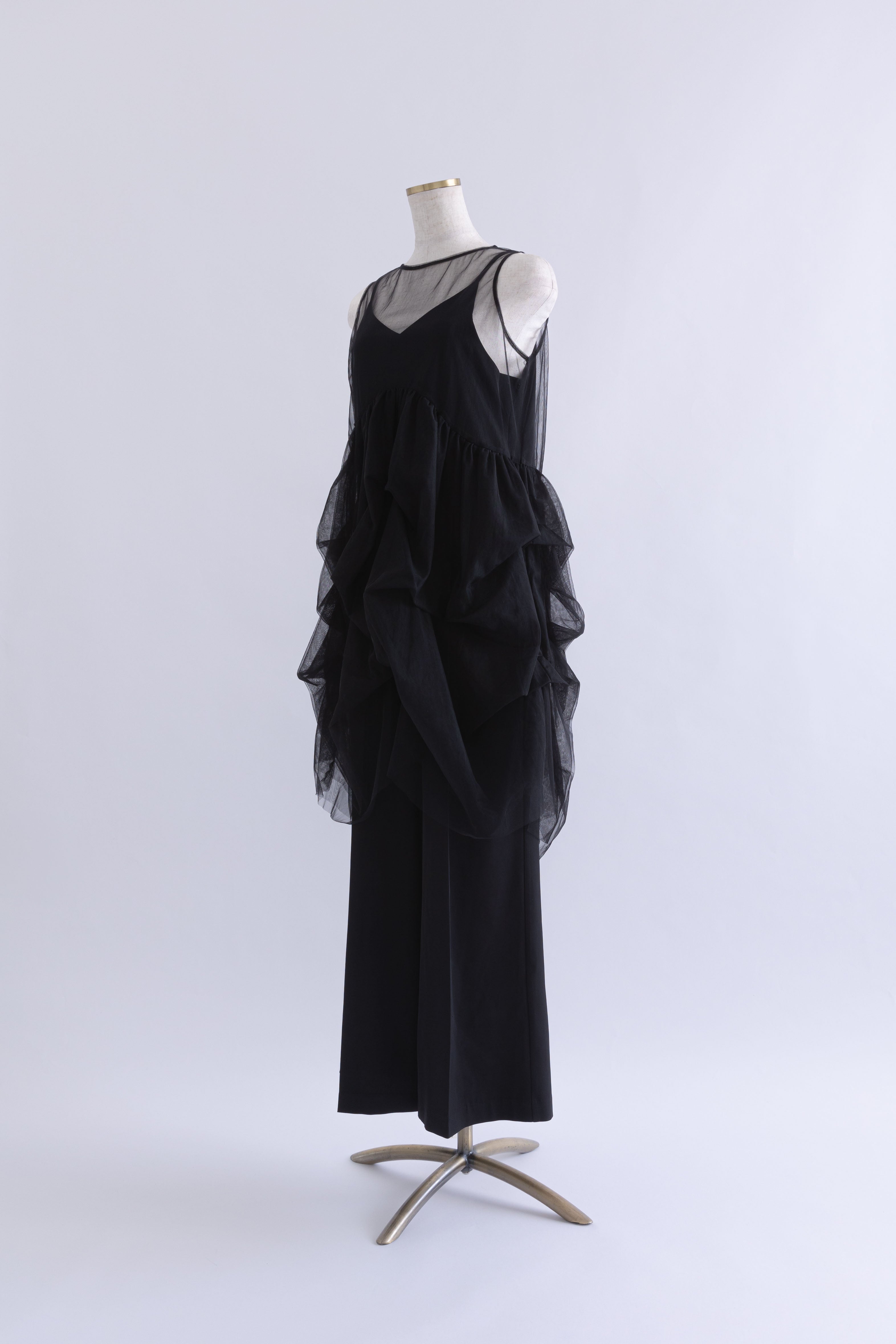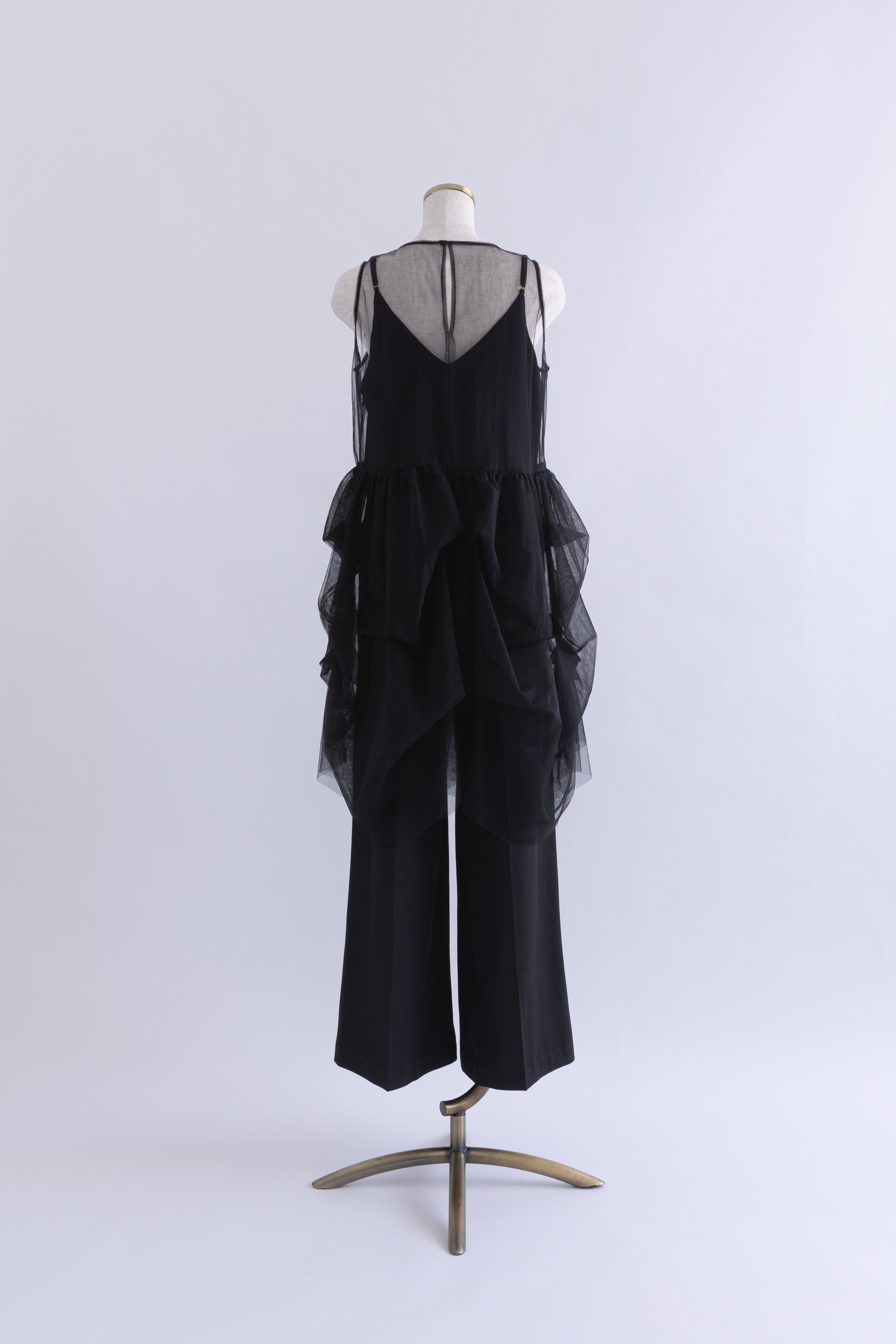 モードでキャッチーなチュールレイヤードのオールインワン。オケージョンシーンはもちろん、単品使いもできる着回しの効くセットアイテム チュールレイヤードオールインワン 【Material】 柔らかなチュールを使用し、立体感を出すために二重構造に仕上げています。インナーのオールインワンには、滑りが良くシワになりにくい中肉の合繊素材を採用し、快適な着心地に。 【Design】 大胆なボリュームを持たせた二重構造のチュール部分は、360°どこから見ても美しく見えるようタックデザインを取り入れました。オールインワンはオケージョンシーンにもふさわしい、すっきりとしたシルエットが特徴。胸元はややアメスリ寄りの内側ラインで、ファスナー開閉によりスムーズな着脱が可能です。 【Styling point】 セットで着こなすだけで決まるデザインですが、それぞれ単品でも普段のスタイルに取り入れやすいアイテムです。