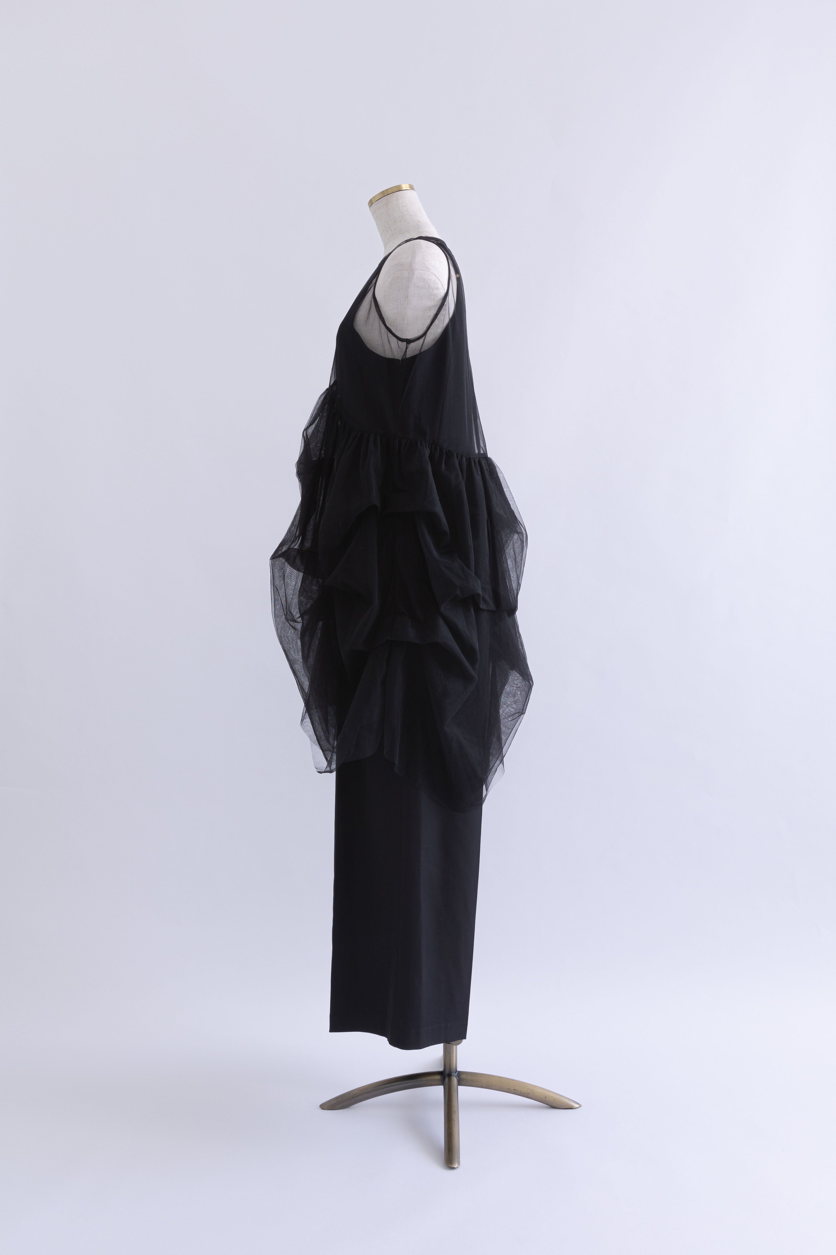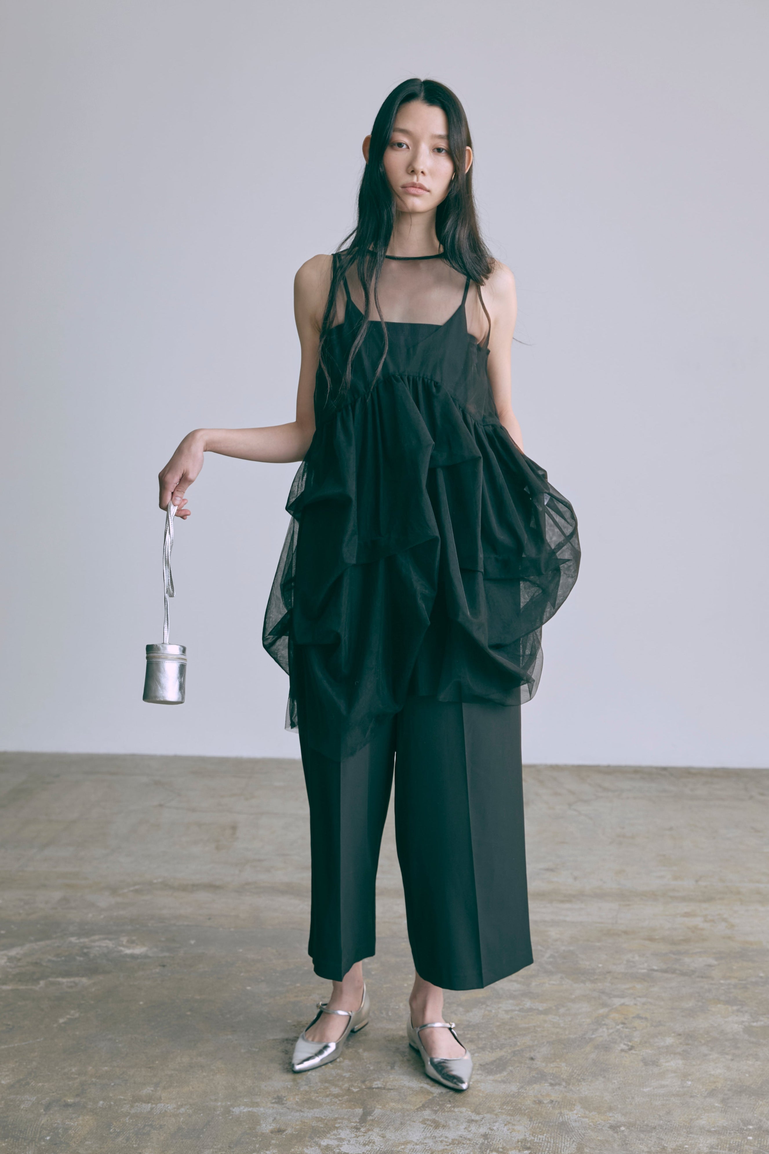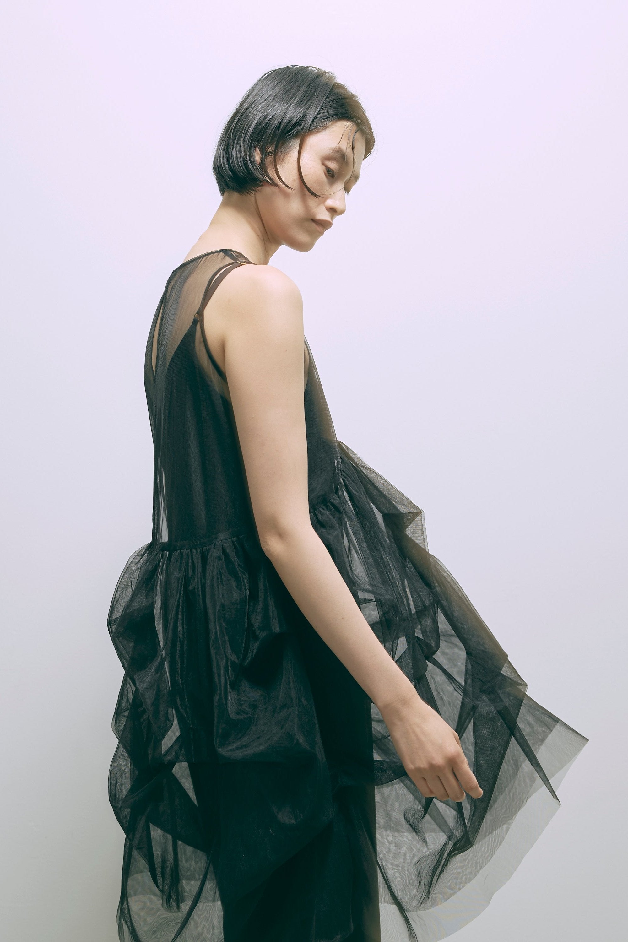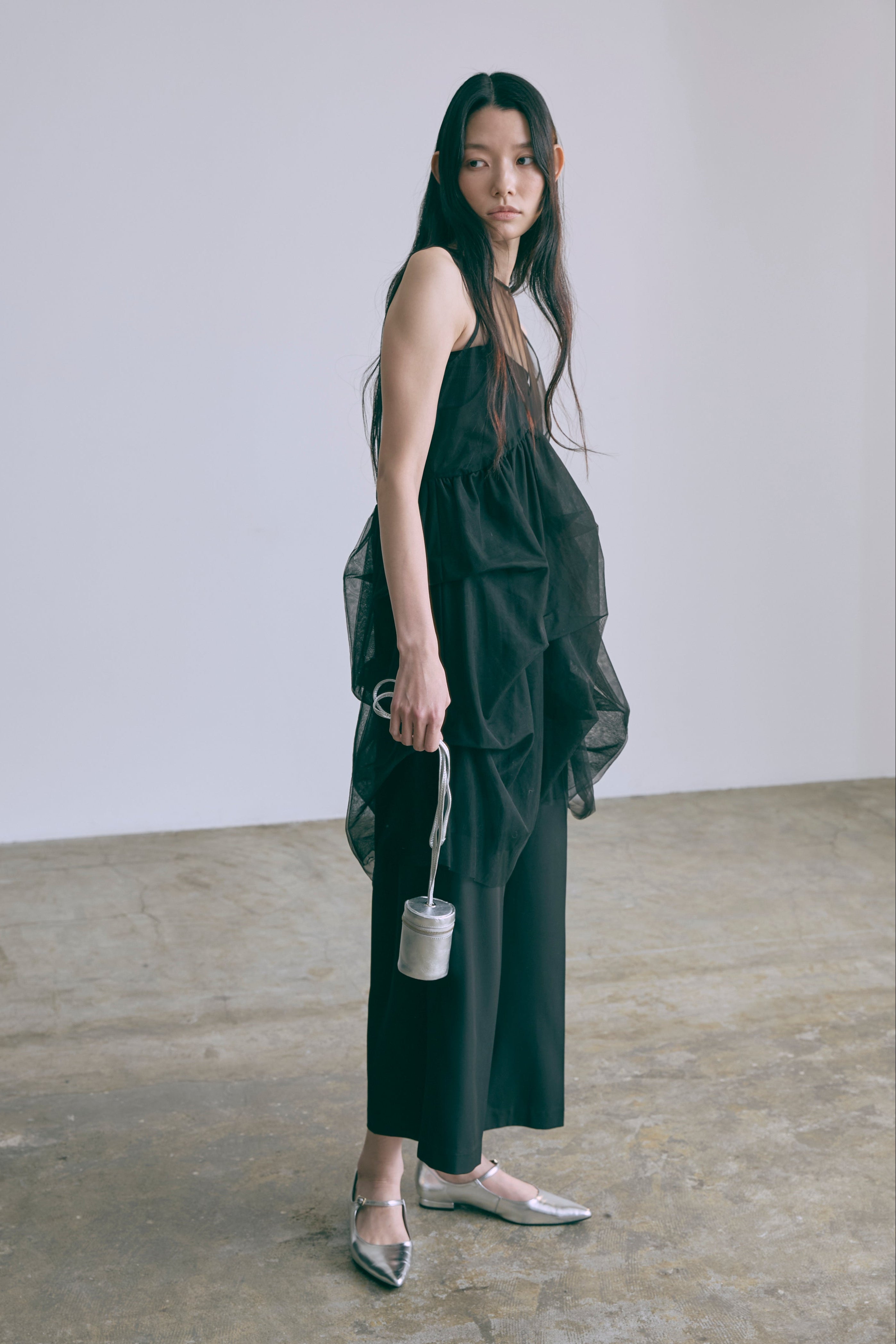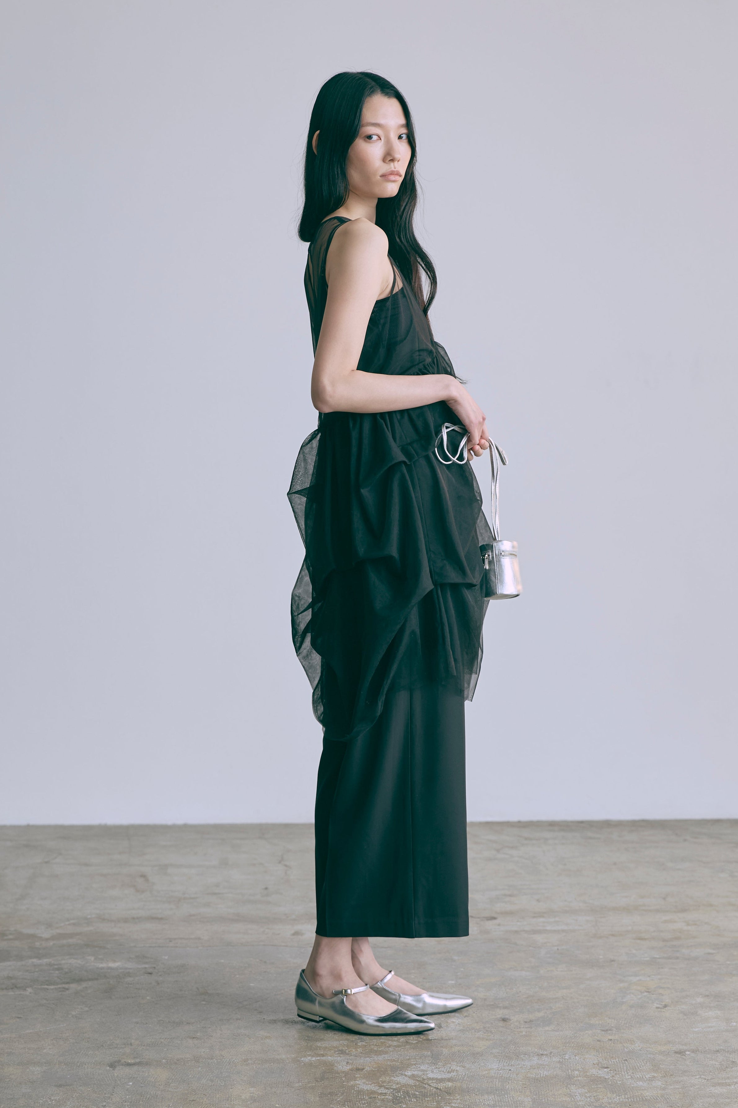 モードでキャッチーなチュールレイヤードのオールインワン。オケージョンシーンはもちろん、単品使いもできる着回しの効くセットアイテム チュールレイヤードオールインワン 【Material】 柔らかなチュールを使用し、立体感を出すために二重構造に仕上げています。インナーのオールインワンには、滑りが良くシワになりにくい中肉の合繊素材を採用し、快適な着心地に。 【Design】 大胆なボリュームを持たせた二重構造のチュール部分は、360°どこから見ても美しく見えるようタックデザインを取り入れました。オールインワンはオケージョンシーンにもふさわしい、すっきりとしたシルエットが特徴。胸元はややアメスリ寄りの内側ラインで、ファスナー開閉によりスムーズな着脱が可能です。 【Styling point】 セットで着こなすだけで決まるデザインですが、それぞれ単品でも普段のスタイルに取り入れやすいアイテムです。