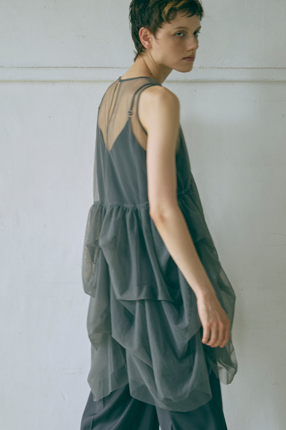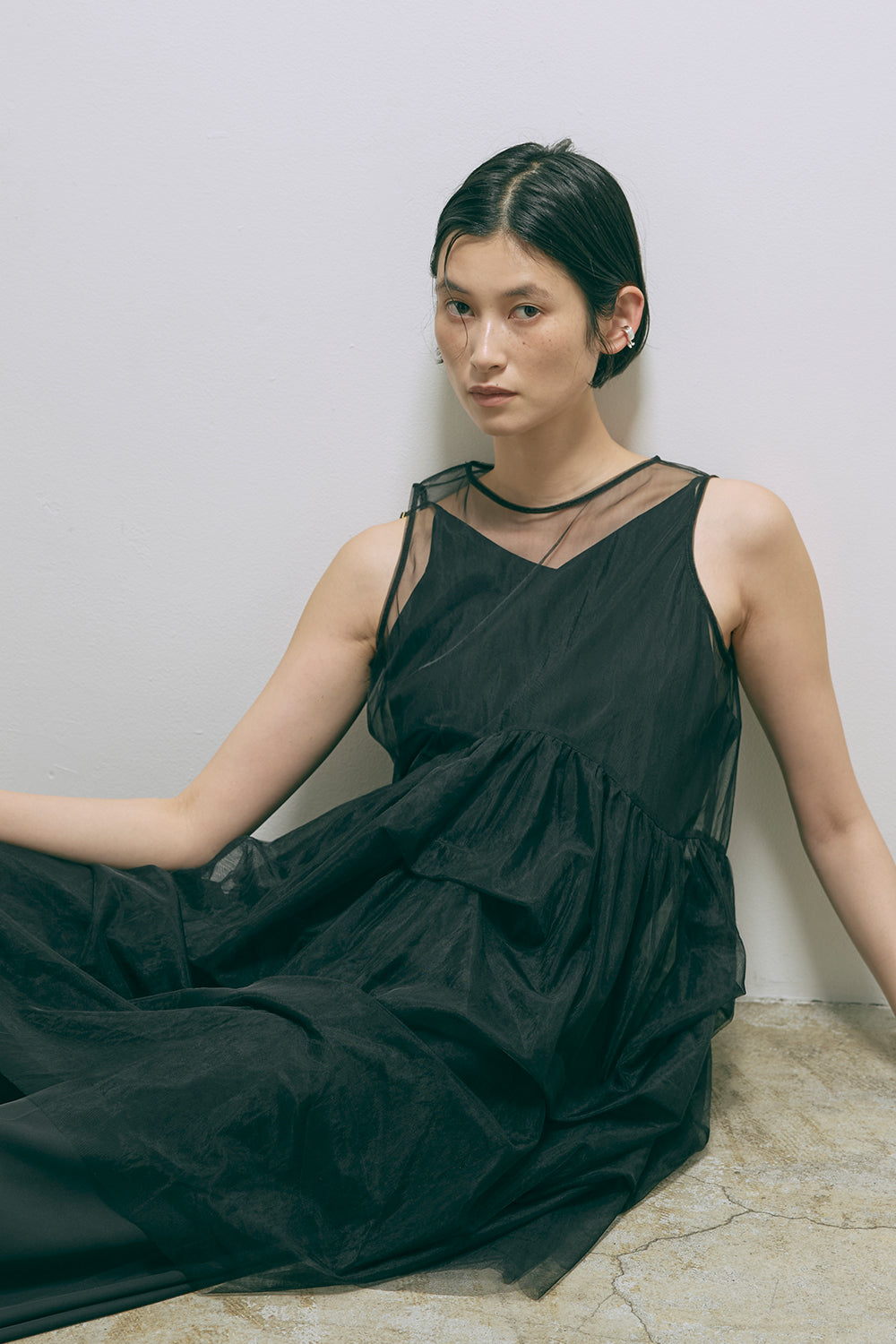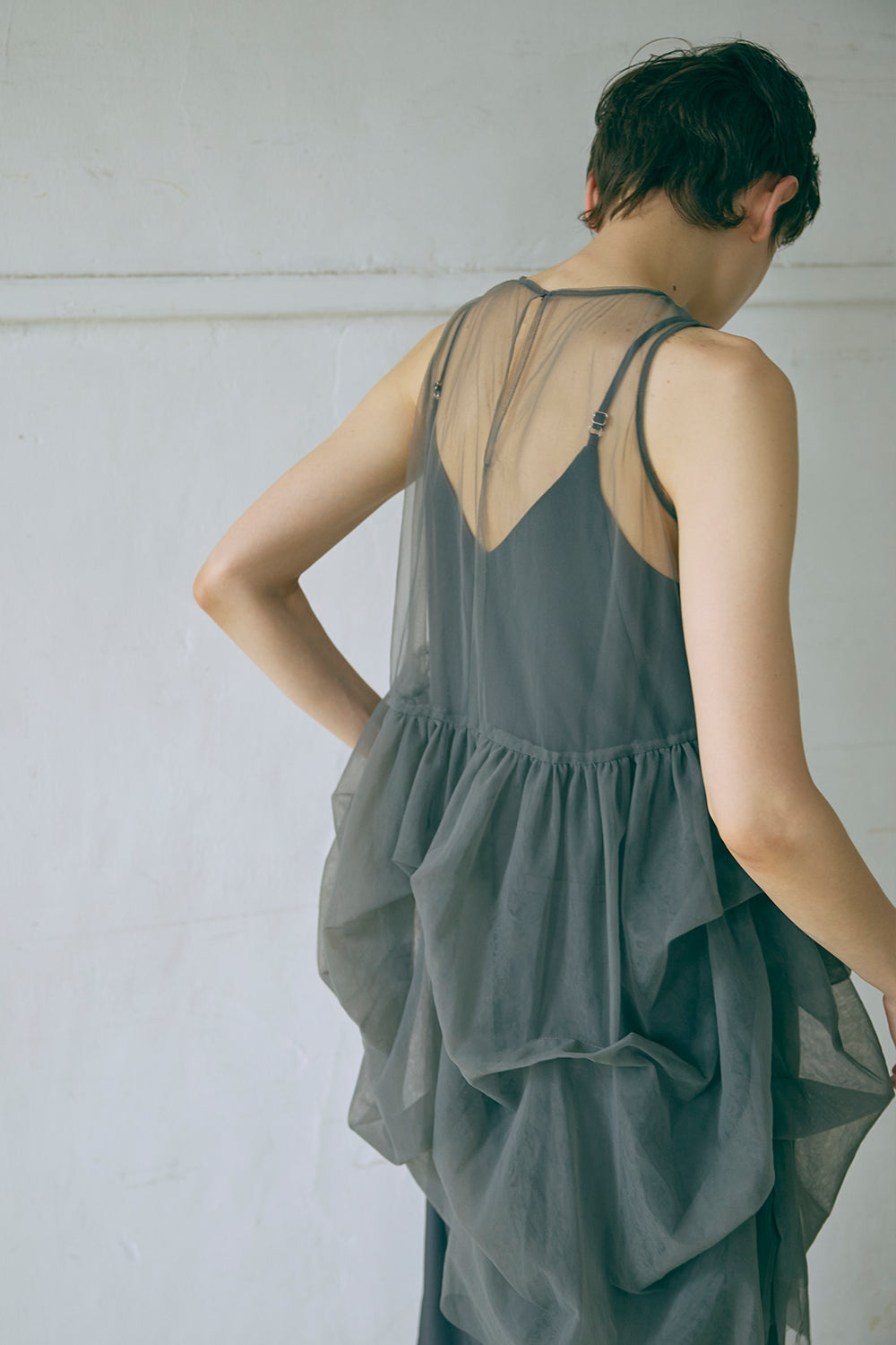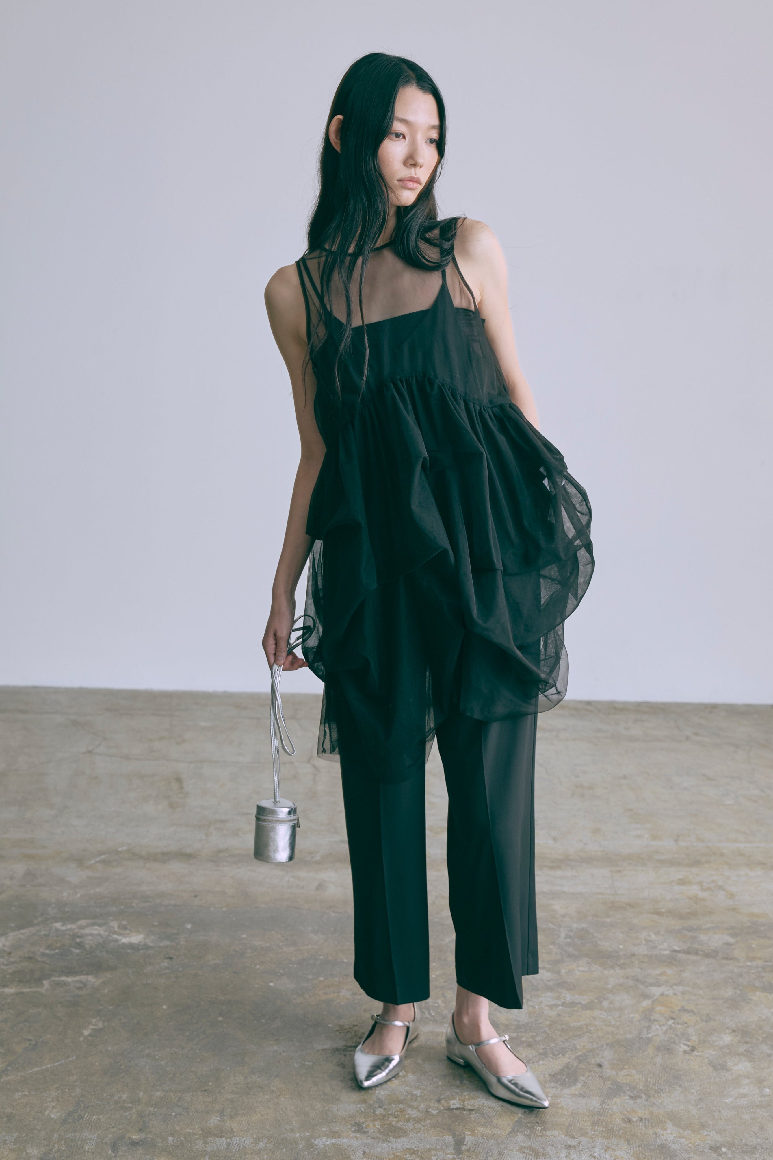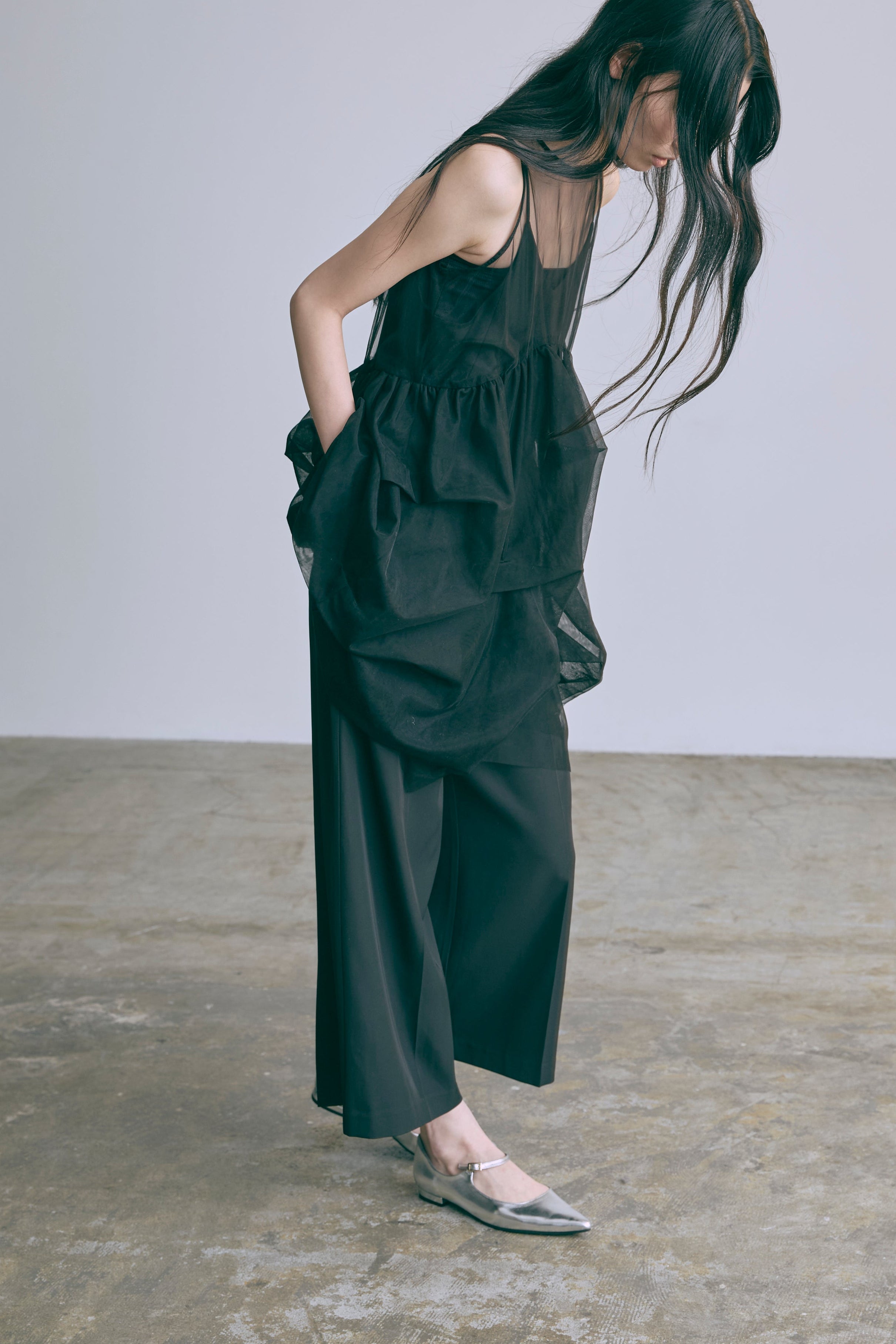 モードでキャッチーなチュールレイヤードのオールインワン。オケージョンシーンはもちろん、単品使いもできる着回しの効くセットアイテム チュールレイヤードオールインワン 【Material】 柔らかなチュールを使用し、立体感を出すために二重構造に仕上げています。インナーのオールインワンには、滑りが良くシワになりにくい中肉の合繊素材を採用し、快適な着心地に。 【Design】 大胆なボリュームを持たせた二重構造のチュール部分は、360°どこから見ても美しく見えるようタックデザインを取り入れました。オールインワンはオケージョンシーンにもふさわしい、すっきりとしたシルエットが特徴。胸元はややアメスリ寄りの内側ラインで、ファスナー開閉によりスムーズな着脱が可能です。 【Styling point】 セットで着こなすだけで決まるデザインですが、それぞれ単品でも普段のスタイルに取り入れやすいアイテムです。