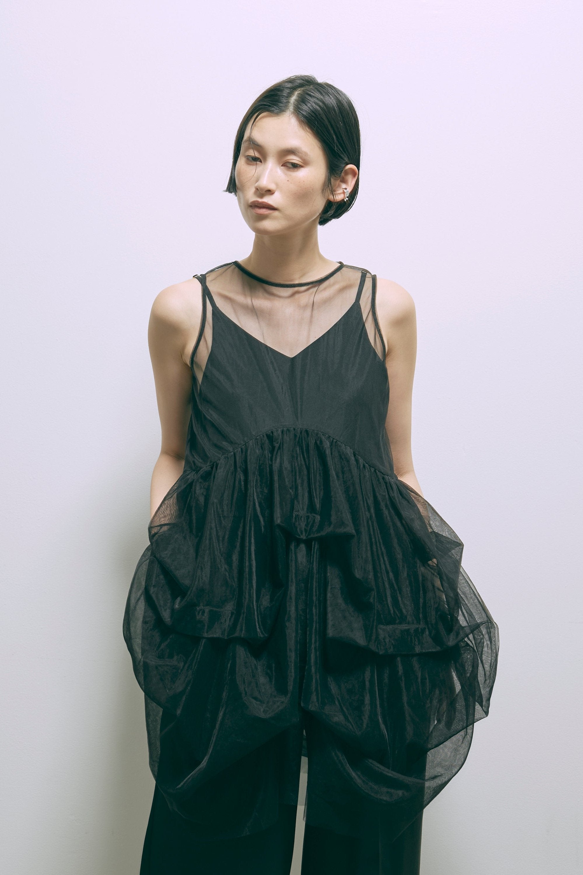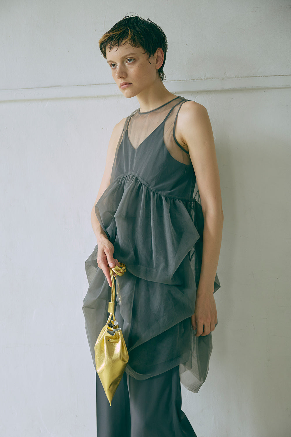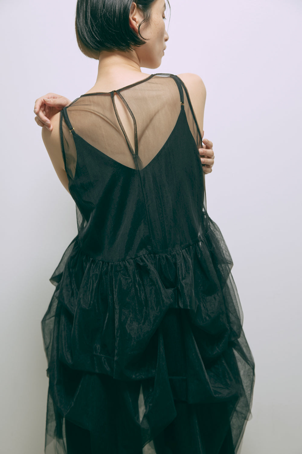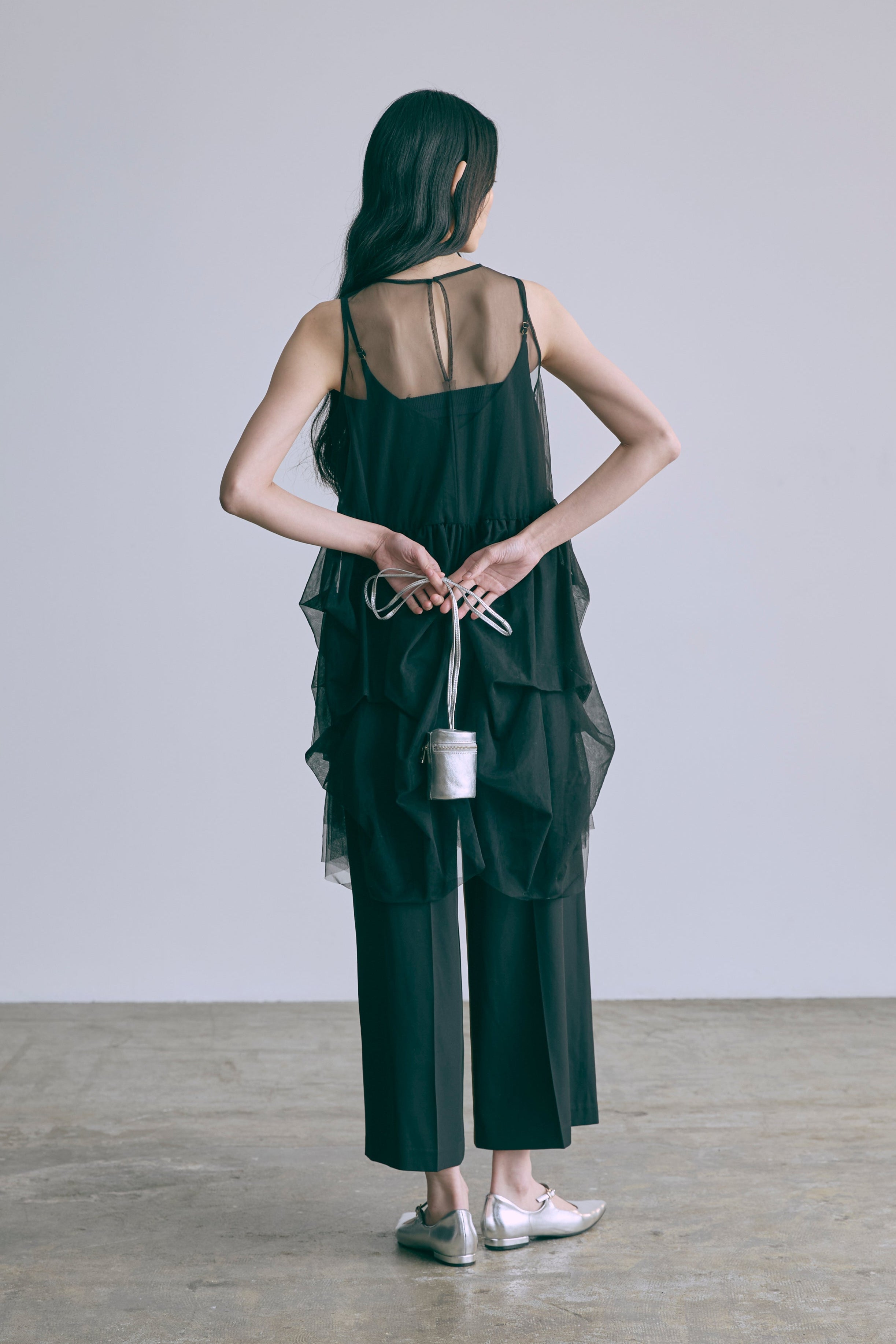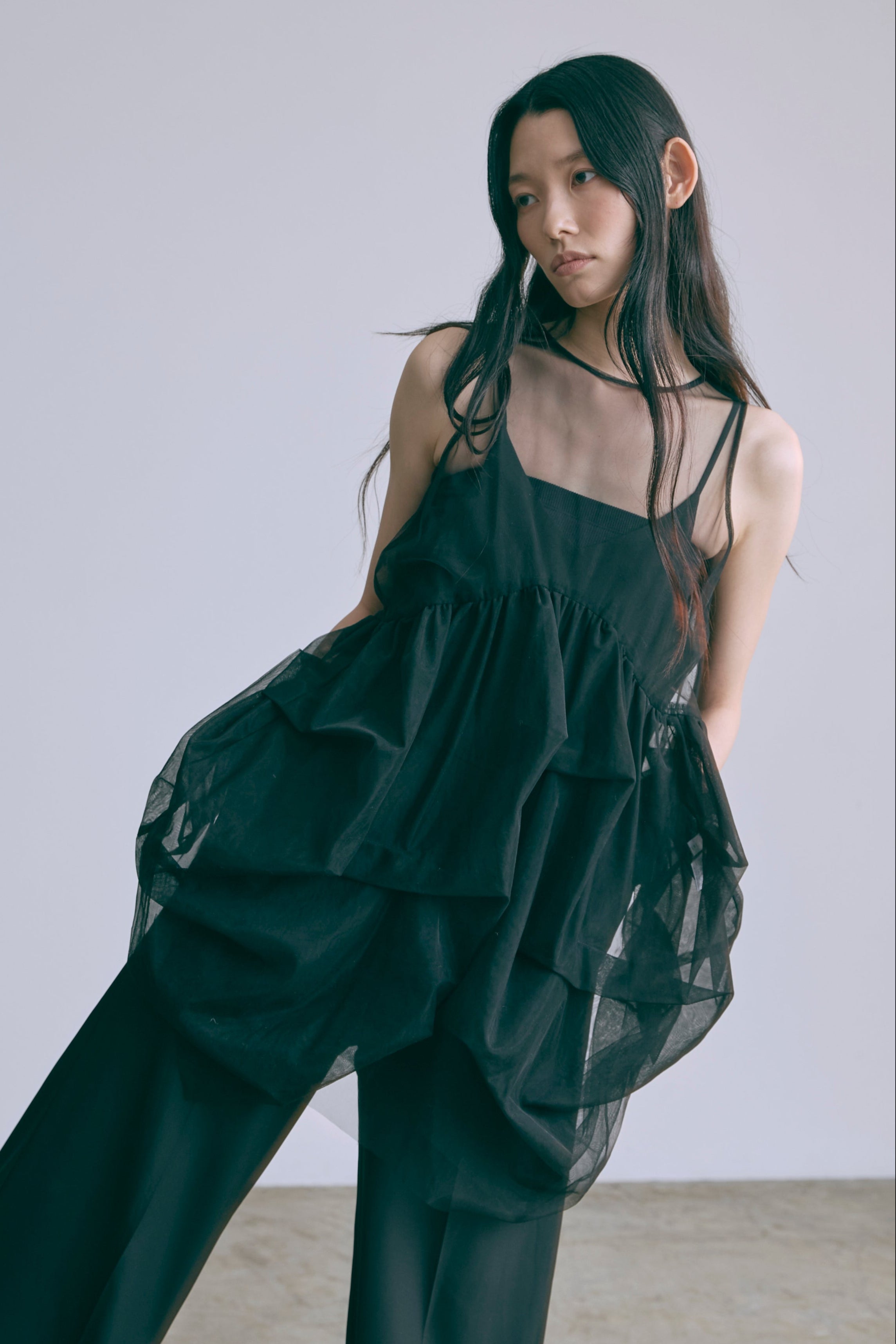 モードでキャッチーなチュールレイヤードのオールインワン。オケージョンシーンはもちろん、単品使いもできる着回しの効くセットアイテム チュールレイヤードオールインワン 【Material】 柔らかなチュールを使用し、立体感を出すために二重構造に仕上げています。インナーのオールインワンには、滑りが良くシワになりにくい中肉の合繊素材を採用し、快適な着心地に。 【Design】 大胆なボリュームを持たせた二重構造のチュール部分は、360°どこから見ても美しく見えるようタックデザインを取り入れました。オールインワンはオケージョンシーンにもふさわしい、すっきりとしたシルエットが特徴。胸元はややアメスリ寄りの内側ラインで、ファスナー開閉によりスムーズな着脱が可能です。 【Styling point】 セットで着こなすだけで決まるデザインですが、それぞれ単品でも普段のスタイルに取り入れやすいアイテムです。