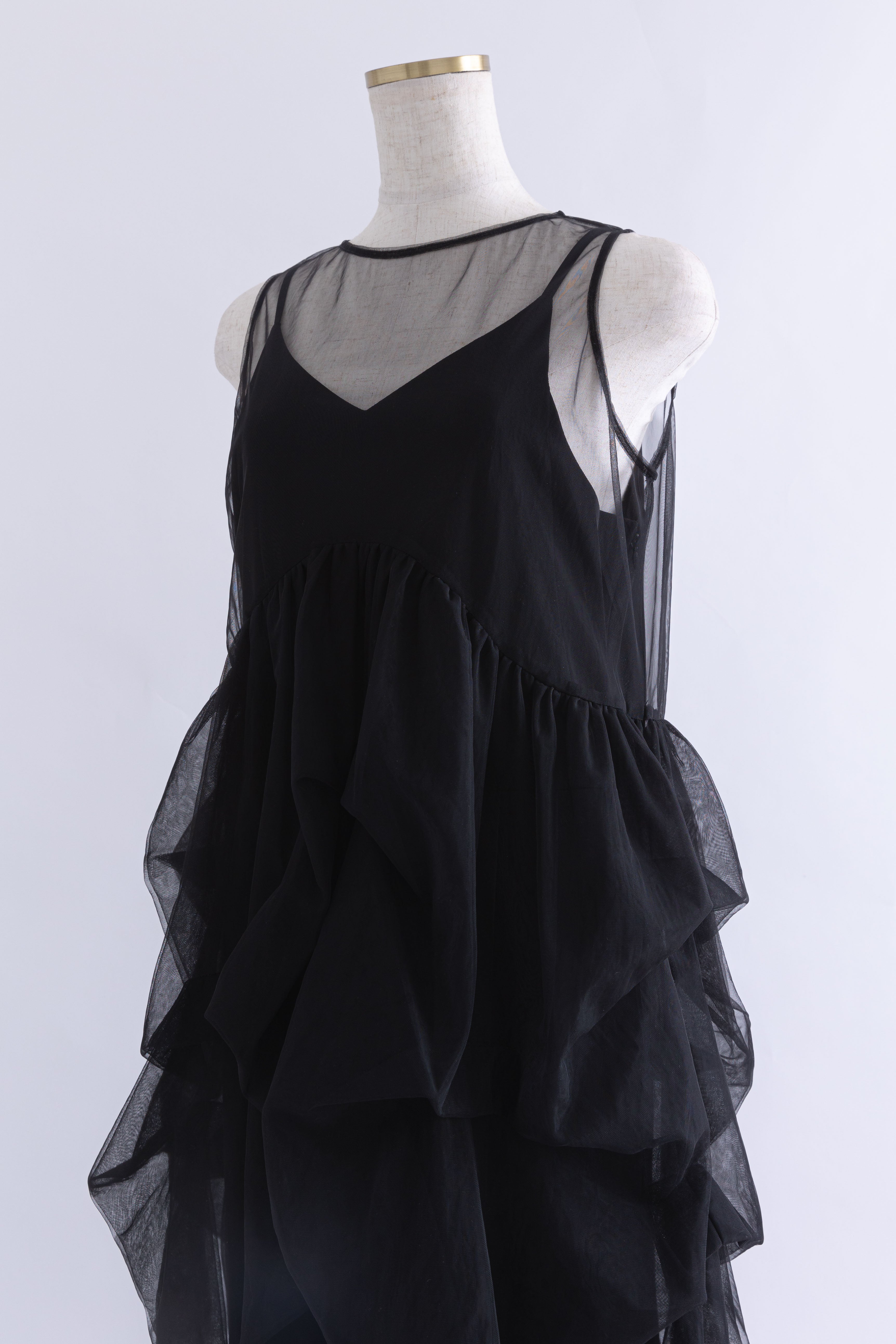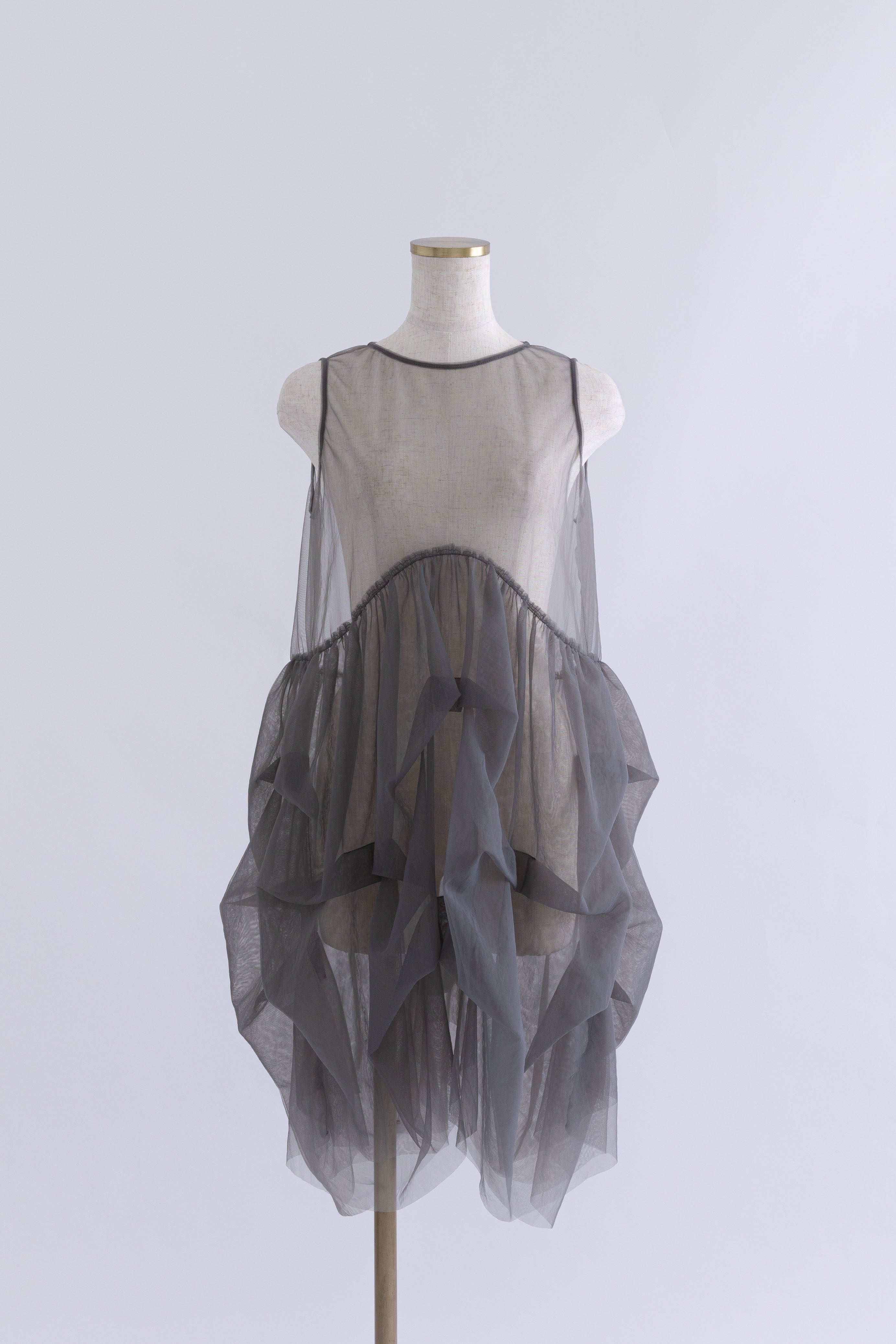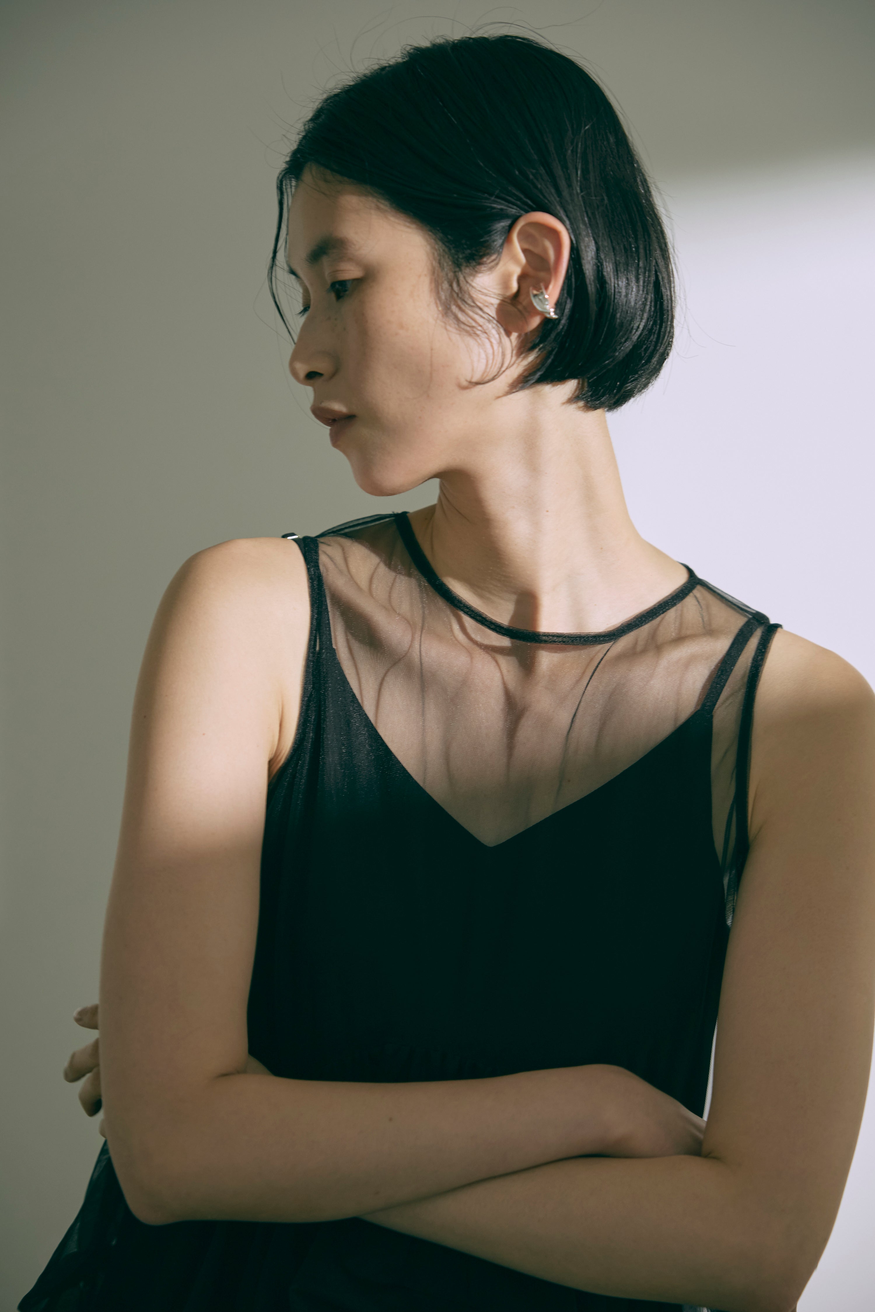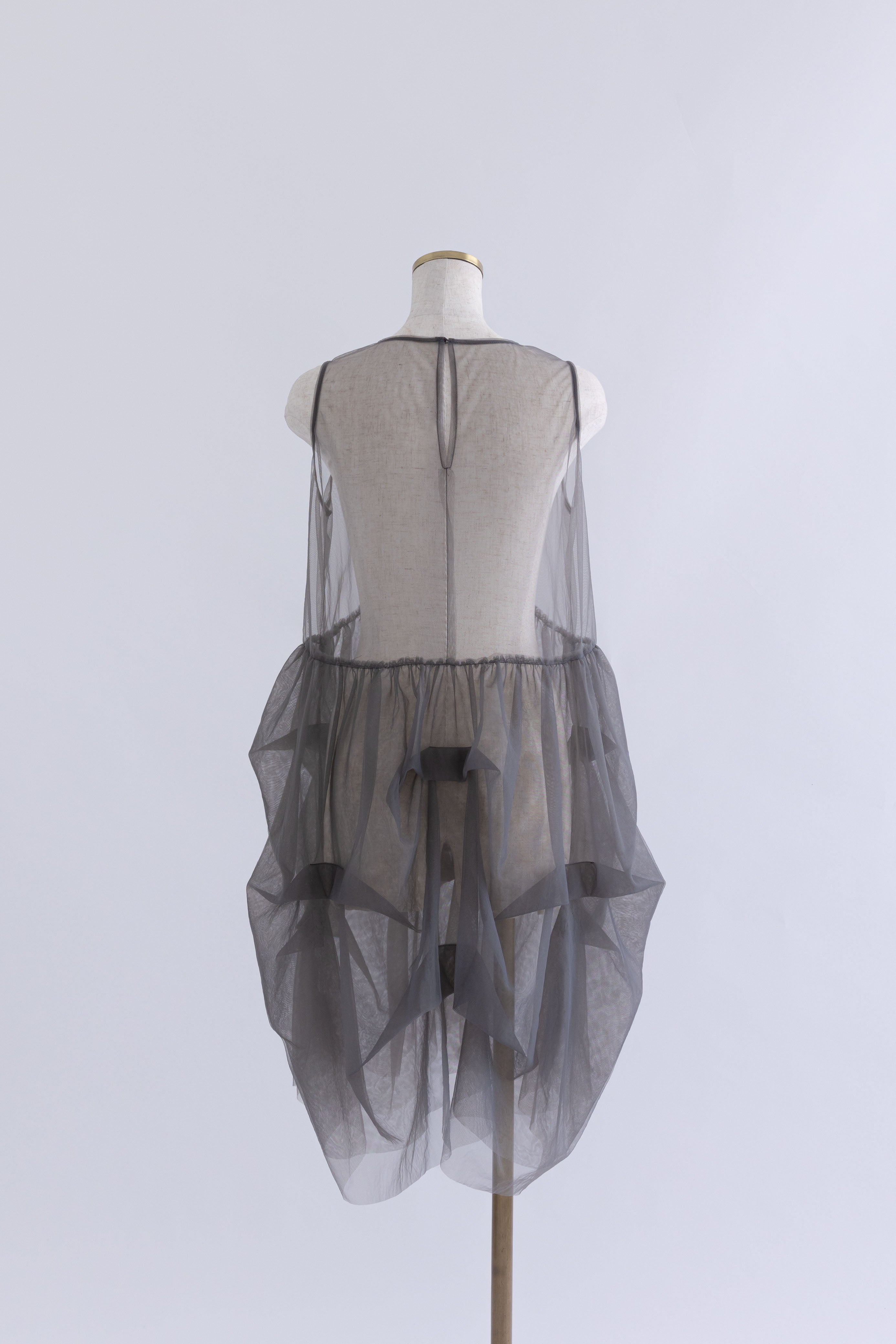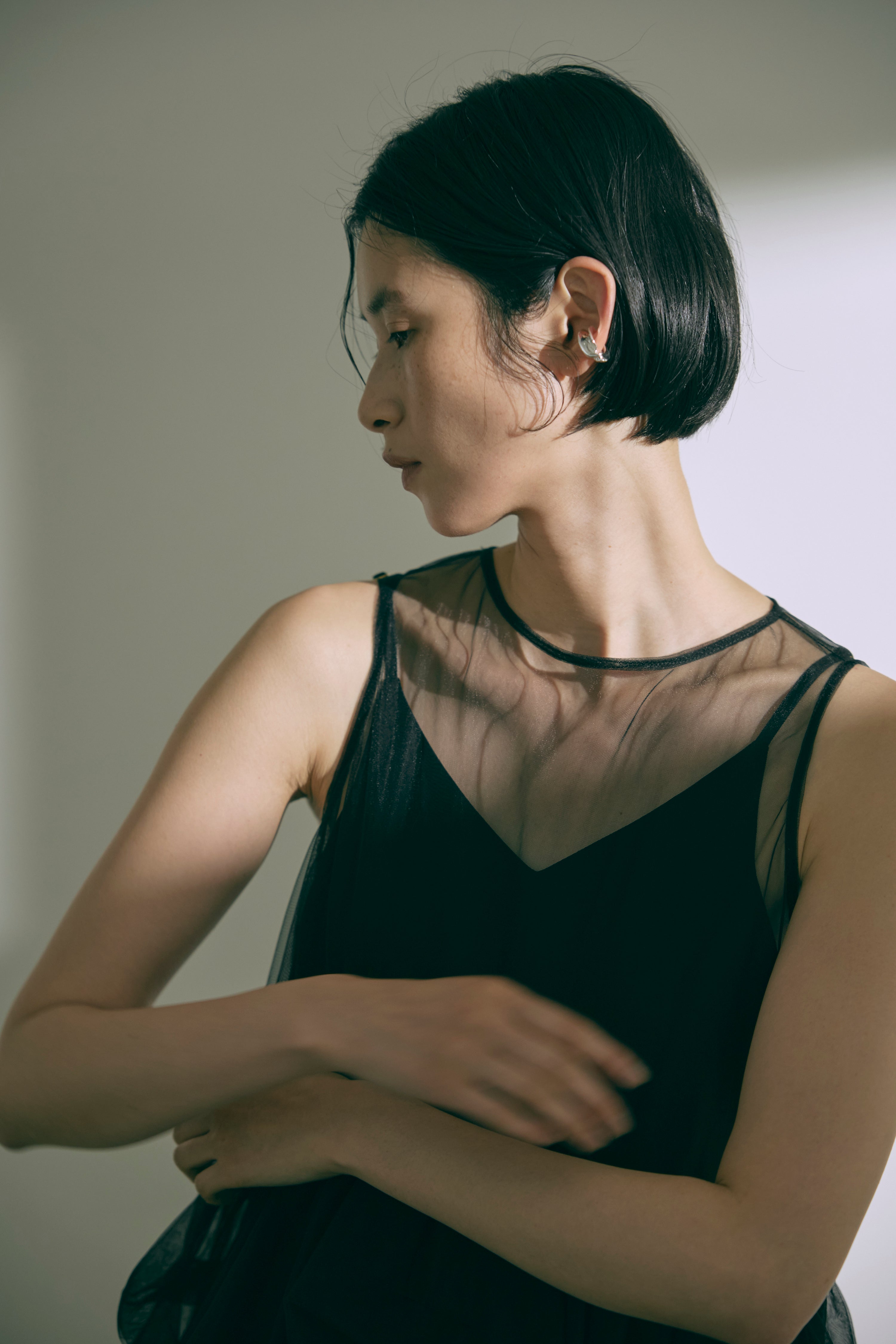 モードでキャッチーなチュールレイヤードのオールインワン。オケージョンシーンはもちろん、単品使いもできる着回しの効くセットアイテム チュールレイヤードオールインワン 【Material】 柔らかなチュールを使用し、立体感を出すために二重構造に仕上げています。インナーのオールインワンには、滑りが良くシワになりにくい中肉の合繊素材を採用し、快適な着心地に。 【Design】 大胆なボリュームを持たせた二重構造のチュール部分は、360°どこから見ても美しく見えるようタックデザインを取り入れました。オールインワンはオケージョンシーンにもふさわしい、すっきりとしたシルエットが特徴。胸元はややアメスリ寄りの内側ラインで、ファスナー開閉によりスムーズな着脱が可能です。 【Styling point】 セットで着こなすだけで決まるデザインですが、それぞれ単品でも普段のスタイルに取り入れやすいアイテムです。