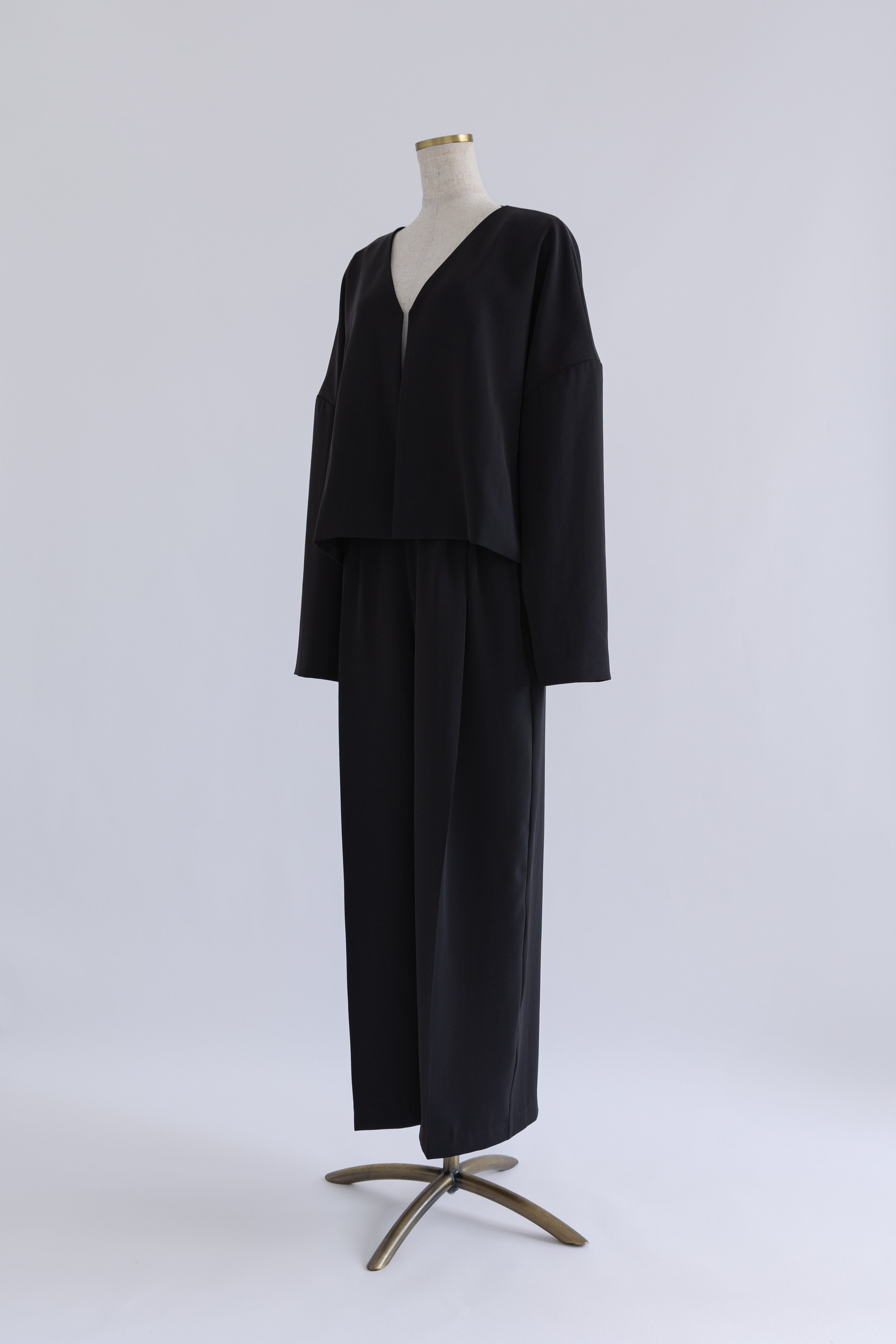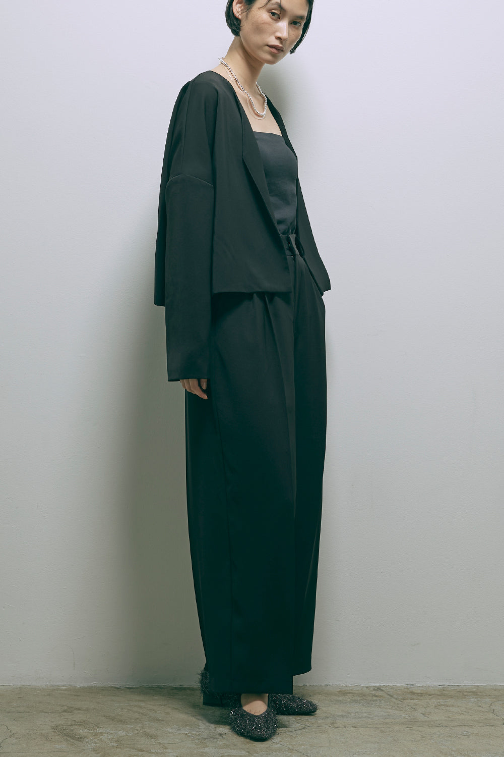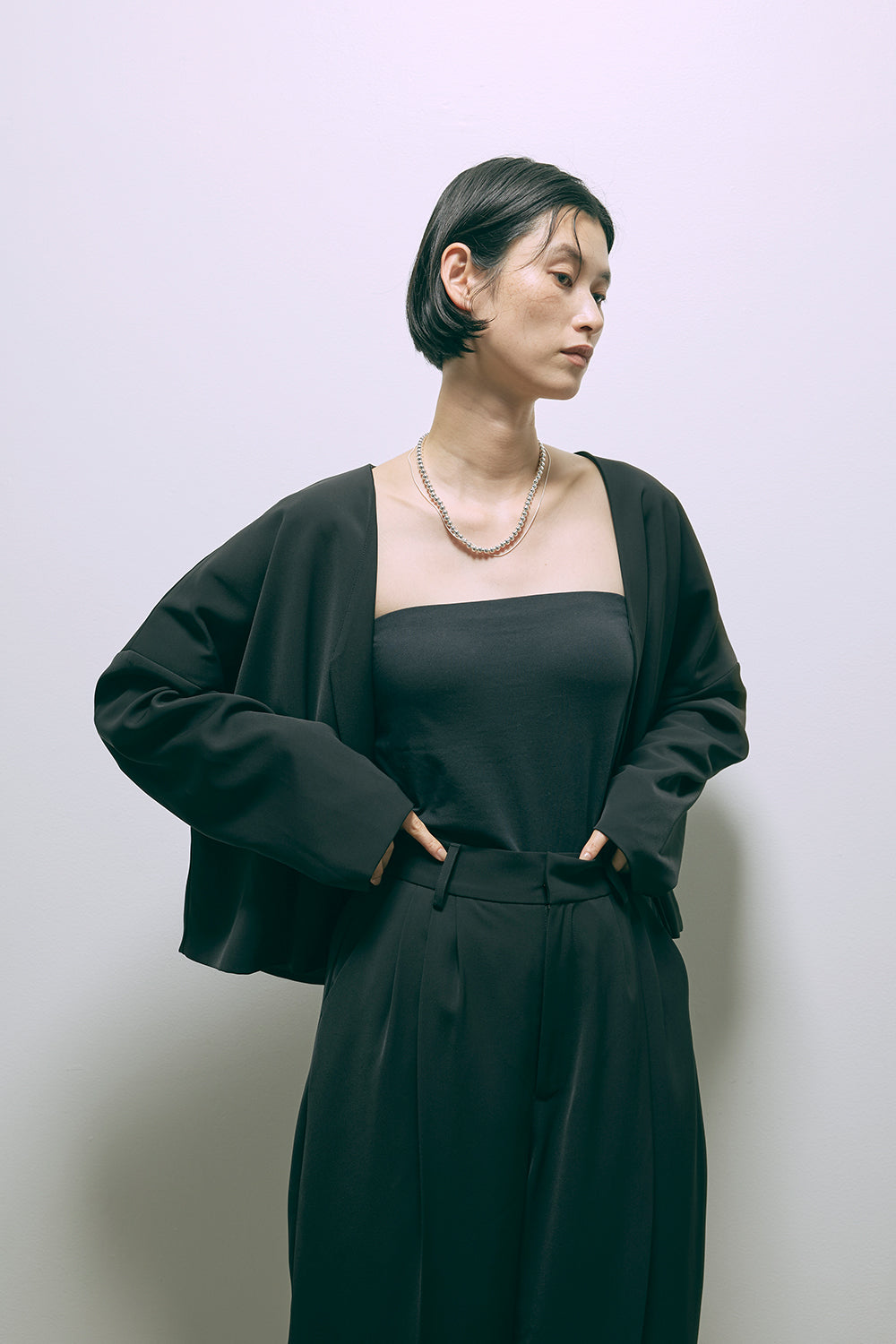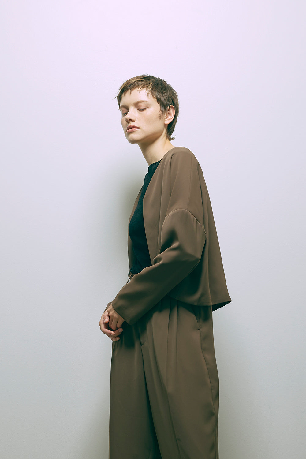 シンプルでありながらフォルムにこだわった、モード感あふれるセットアップ ドロップショルダーソフトジャケットセットアップ 【Material】 シワになりにくく、美しい落ち感のある合繊素材を使用。マットな質感が高級感を演出します。 【Design】 肩のラインを少しずらし、薄手の肩パッドを入れたフォルムが美しいジャケット。フロントには留め具をあえて設けず、カーディガンのようにラフに羽織れるデザインにしました。パンツはシンプルさを追求し、素材の落ち感を活かしたベーシックなデザインに仕上げています。 【Styling point】 セットでの着用がおすすめのモードなセットアップ。ベーシックなカラーなので、オケージョンシーンや学校行事、フォーマルな場面にも最適です。