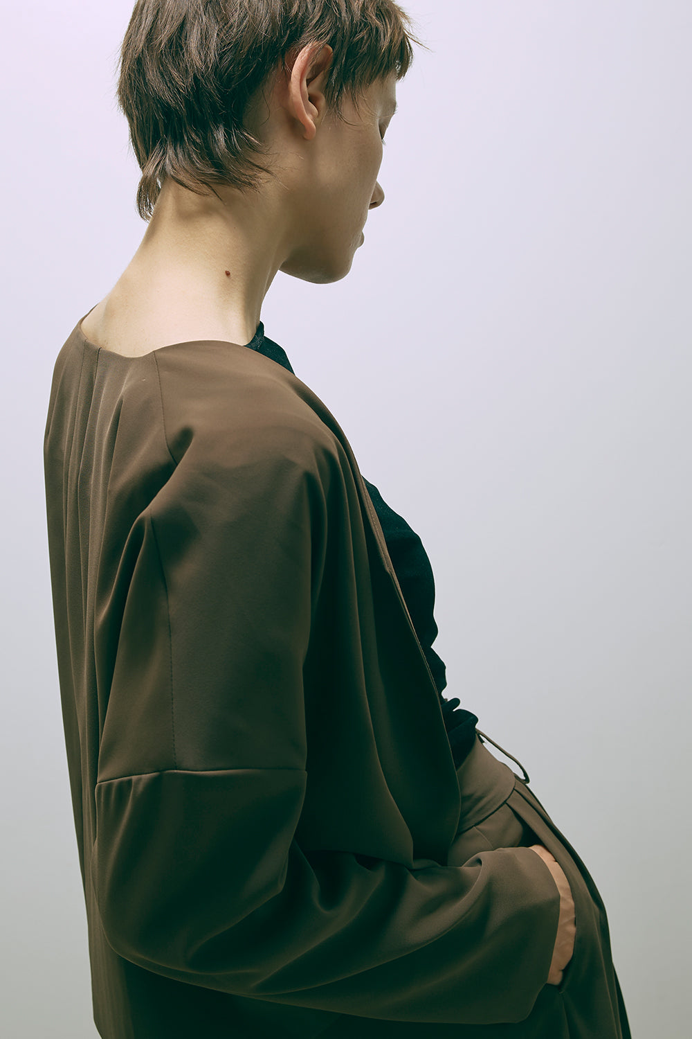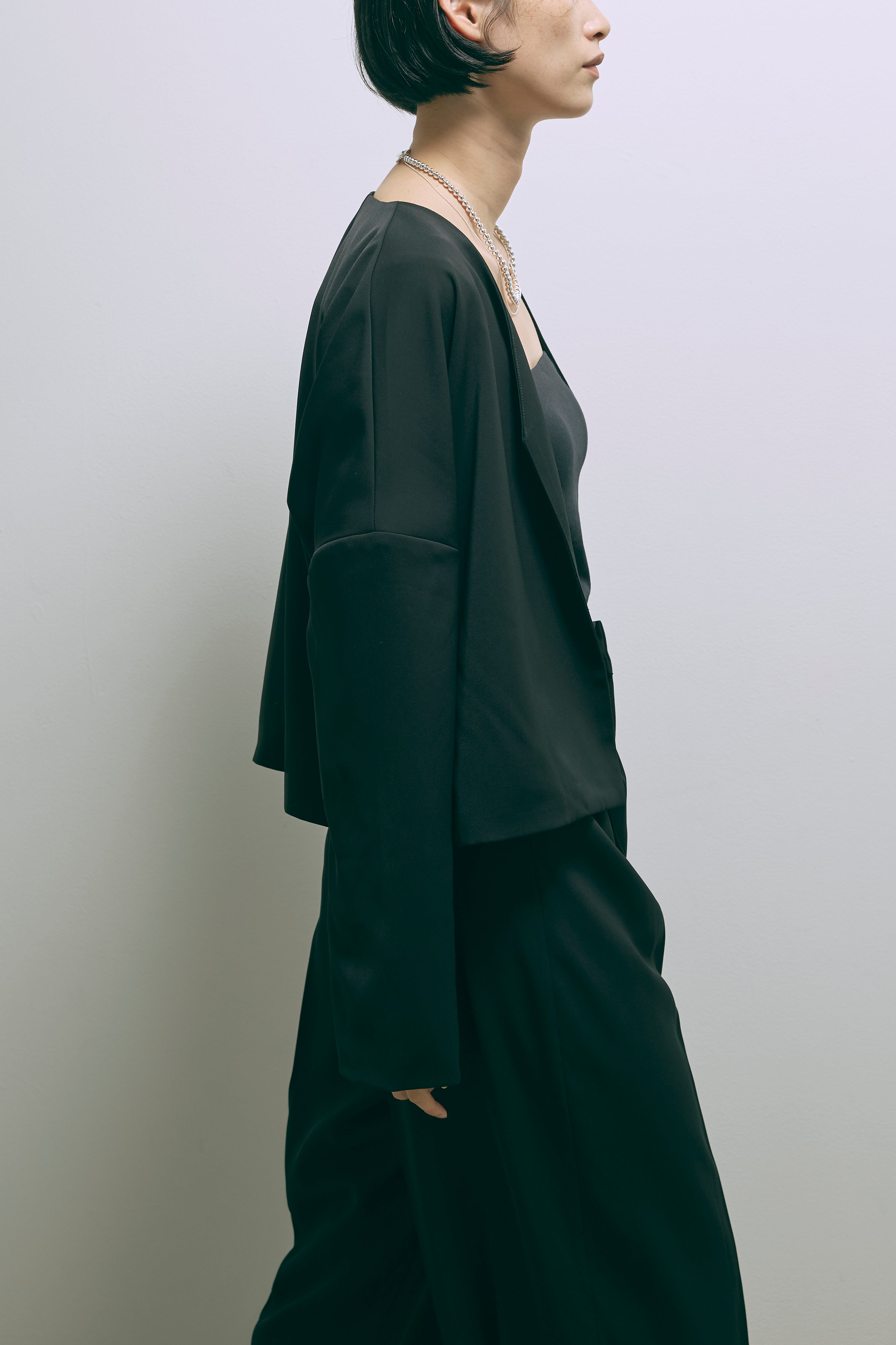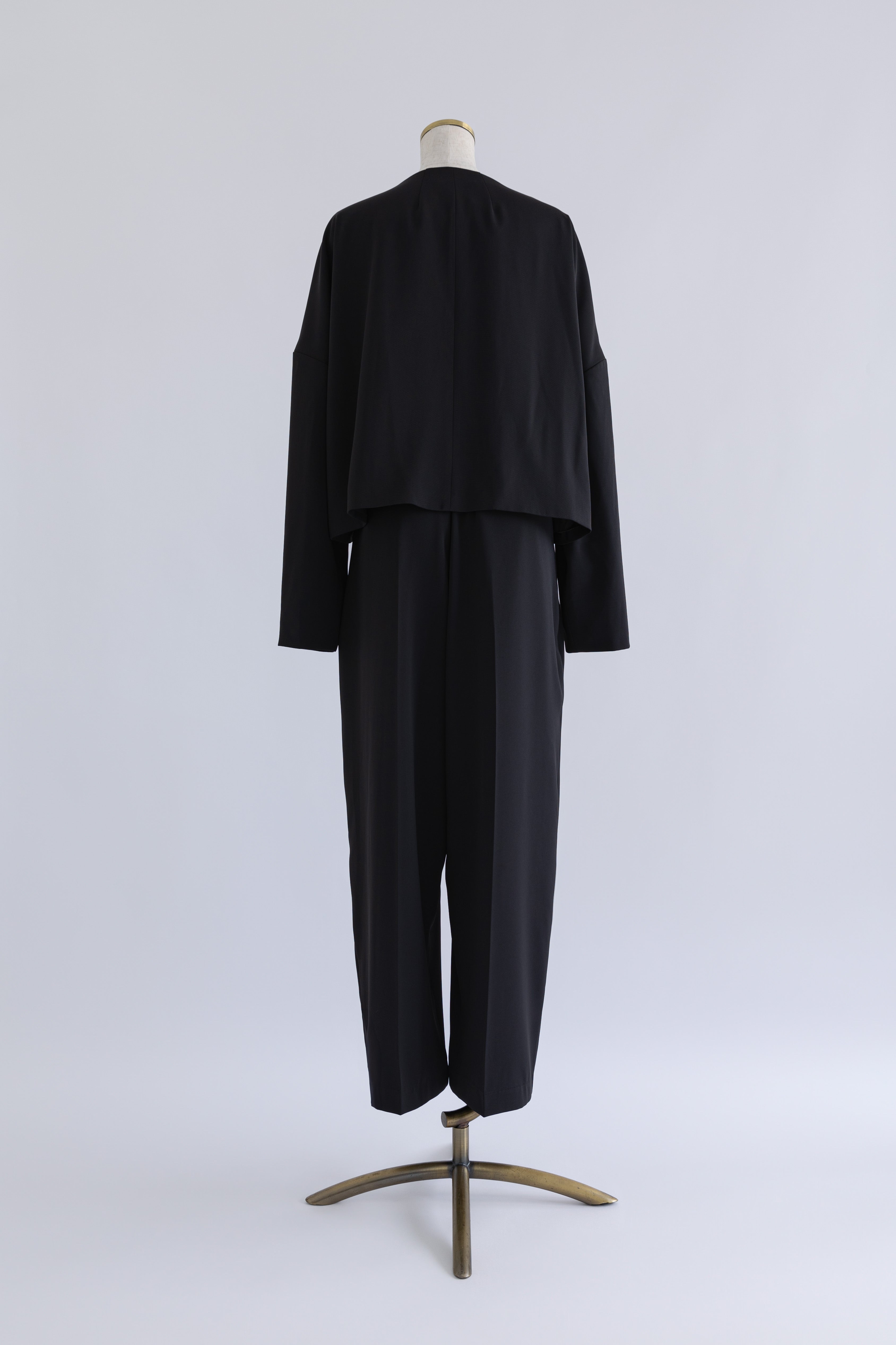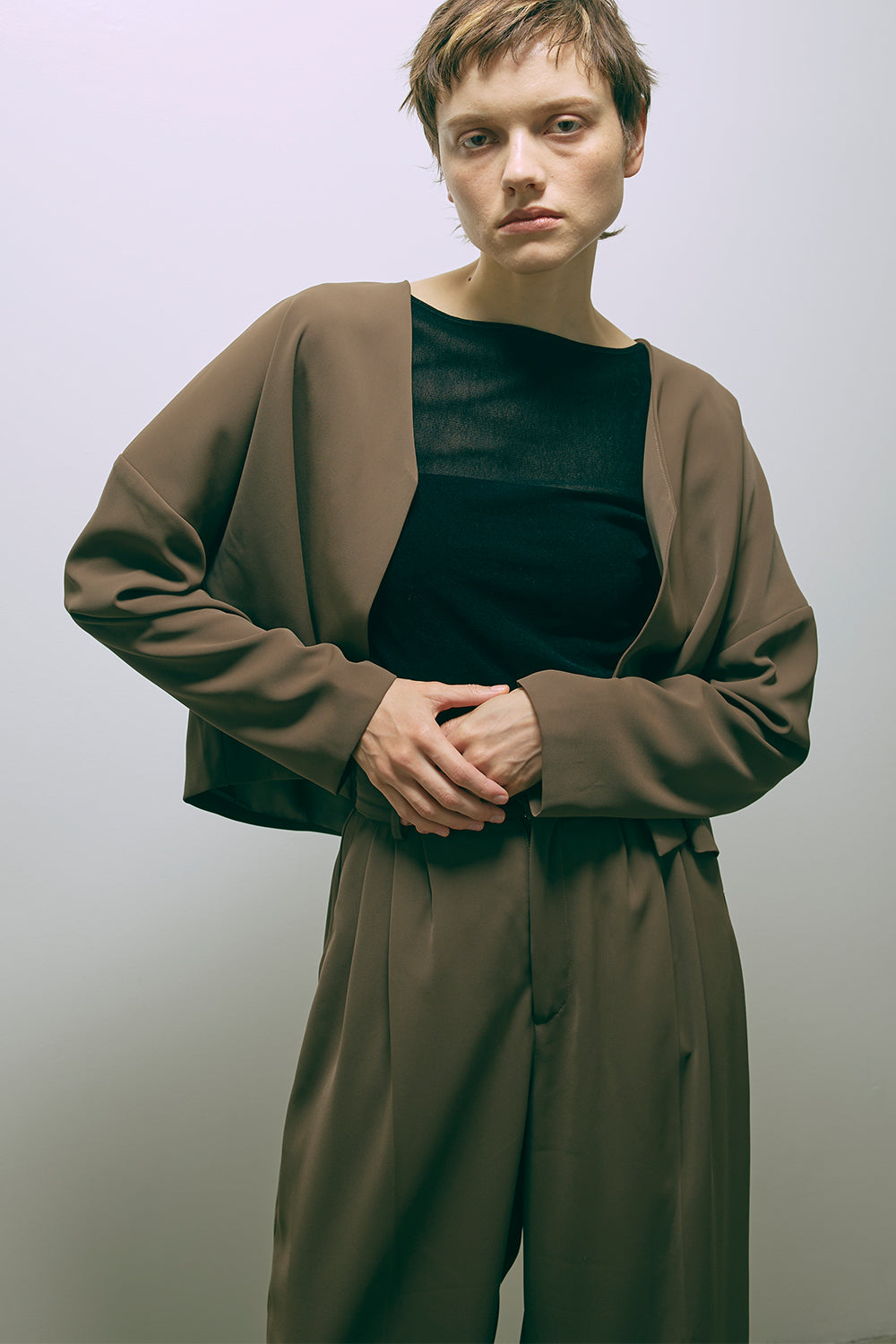シンプルでありながらフォルムにこだわった、モード感あふれるセットアップ ドロップショルダーソフトジャケットセットアップ 【Material】 シワになりにくく、美しい落ち感のある合繊素材を使用。マットな質感が高級感を演出します。 【Design】 肩のラインを少しずらし、薄手の肩パッドを入れたフォルムが美しいジャケット。フロントには留め具をあえて設けず、カーディガンのようにラフに羽織れるデザインにしました。パンツはシンプルさを追求し、素材の落ち感を活かしたベーシックなデザインに仕上げています。 【Styling point】 セットでの着用がおすすめのモードなセットアップ。ベーシックなカラーなので、オケージョンシーンや学校行事、フォーマルな場面にも最適です。