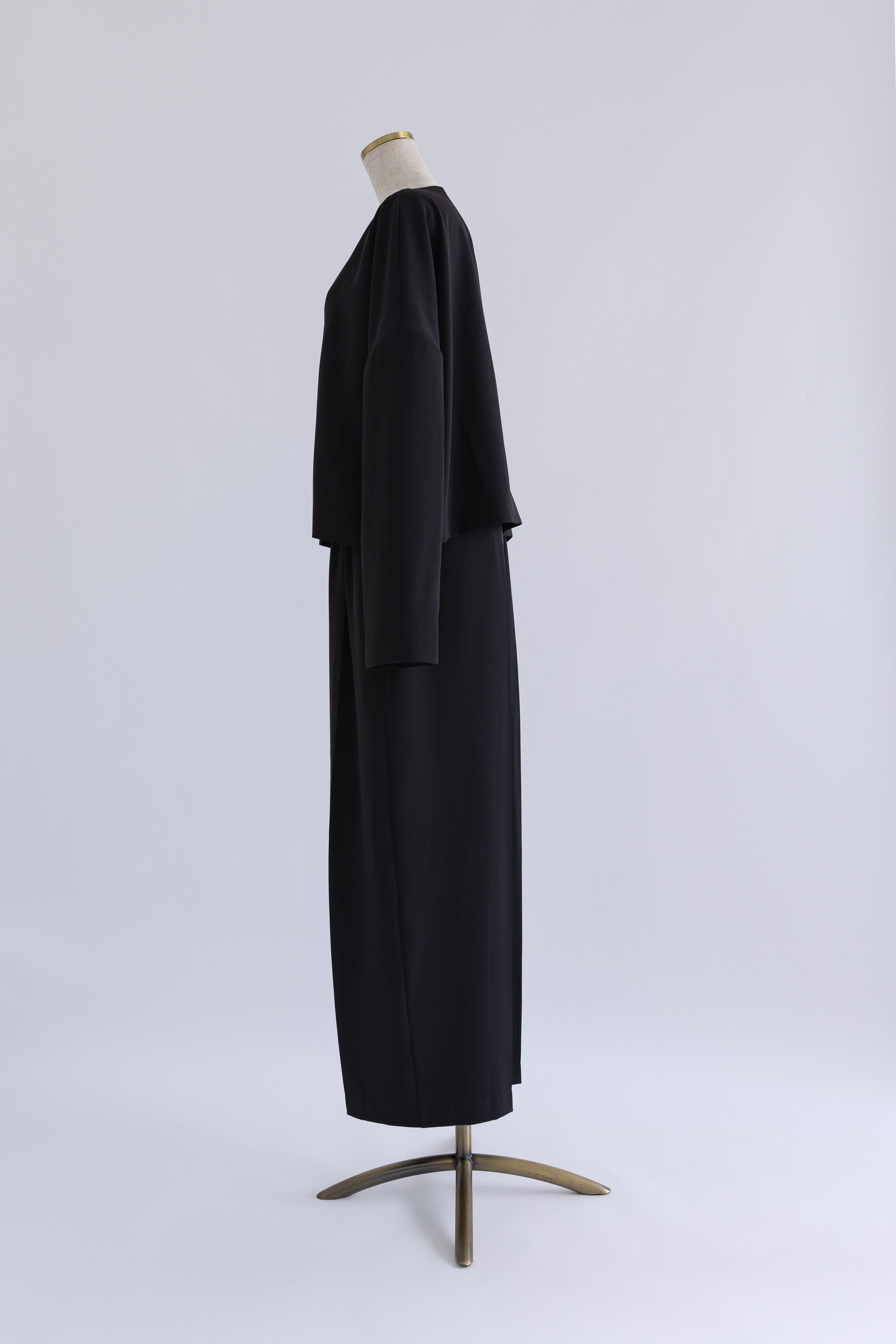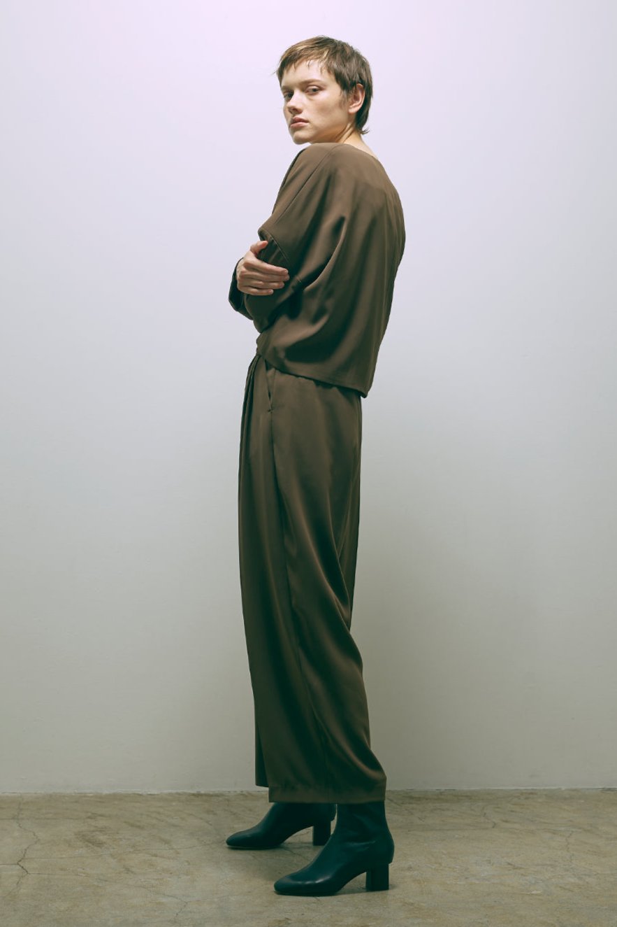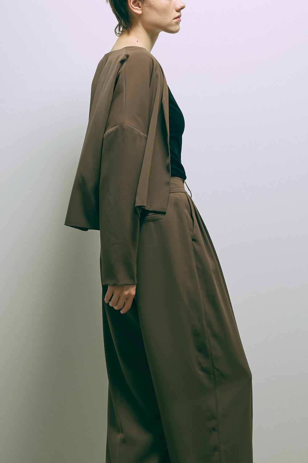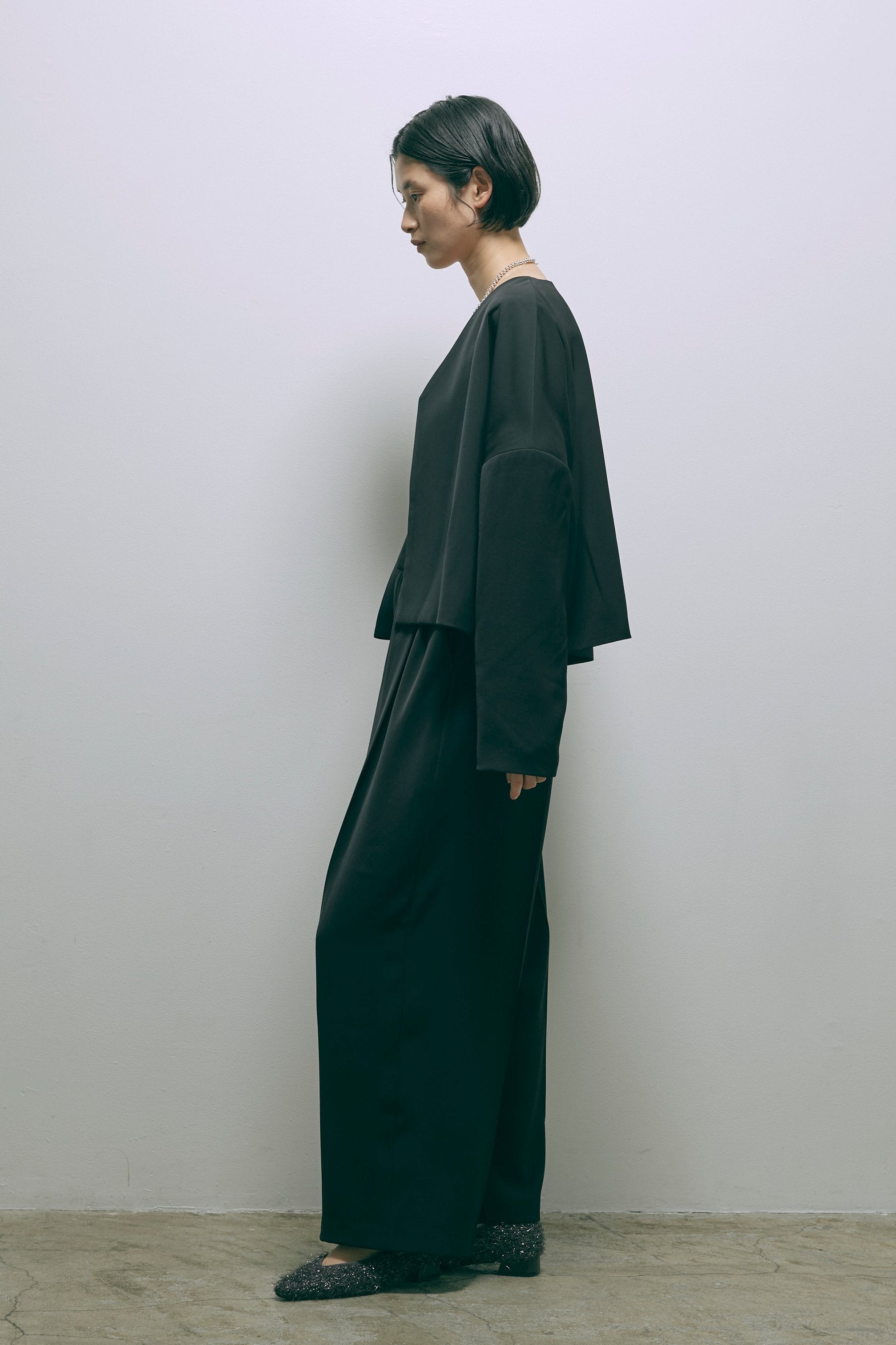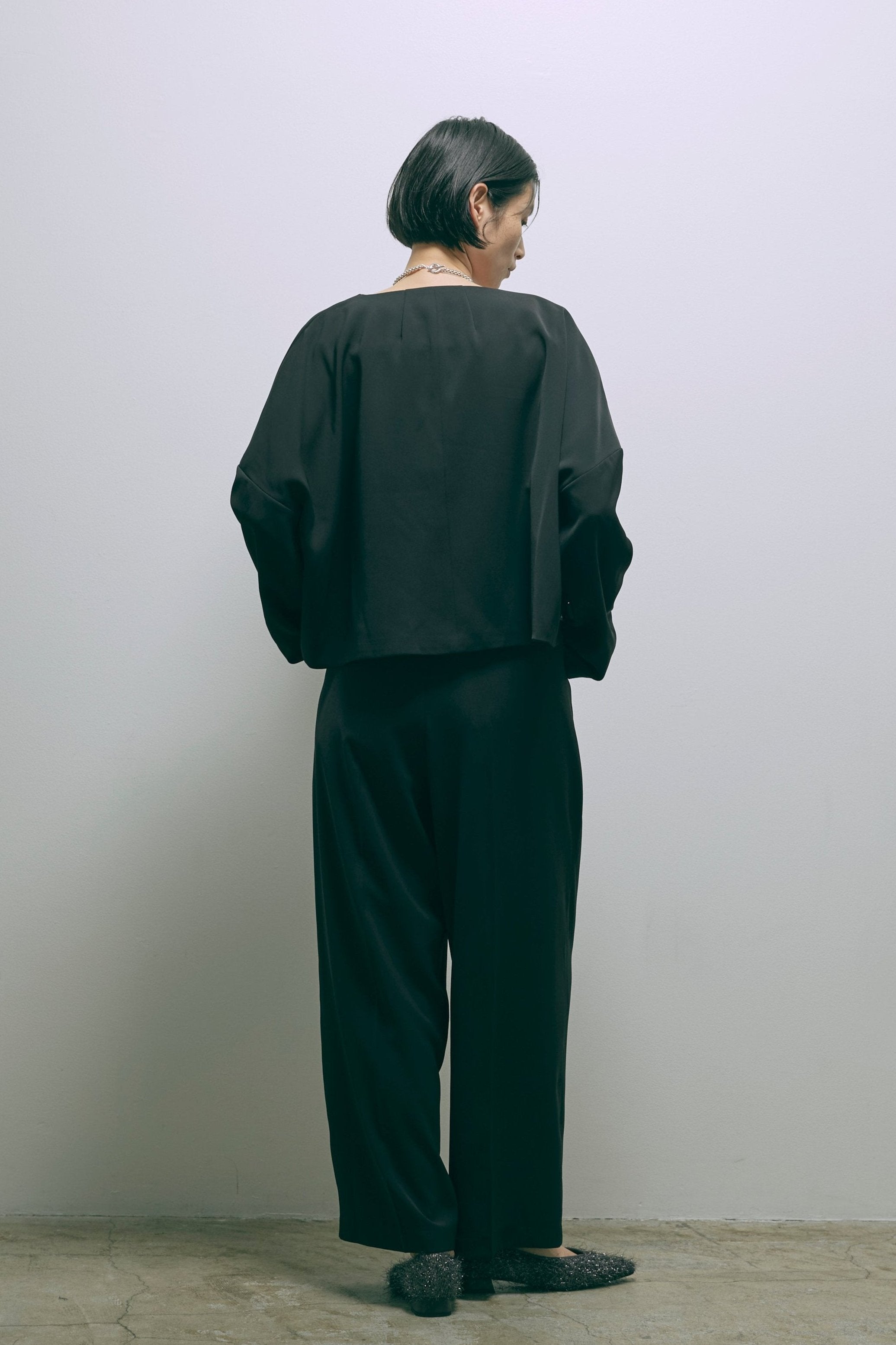 シンプルでありながらフォルムにこだわった、モード感あふれるセットアップ ドロップショルダーソフトジャケットセットアップ 【Material】 シワになりにくく、美しい落ち感のある合繊素材を使用。マットな質感が高級感を演出します。 【Design】 肩のラインを少しずらし、薄手の肩パッドを入れたフォルムが美しいジャケット。フロントには留め具をあえて設けず、カーディガンのようにラフに羽織れるデザインにしました。パンツはシンプルさを追求し、素材の落ち感を活かしたベーシックなデザインに仕上げています。 【Styling point】 セットでの着用がおすすめのモードなセットアップ。ベーシックなカラーなので、オケージョンシーンや学校行事、フォーマルな場面にも最適です。