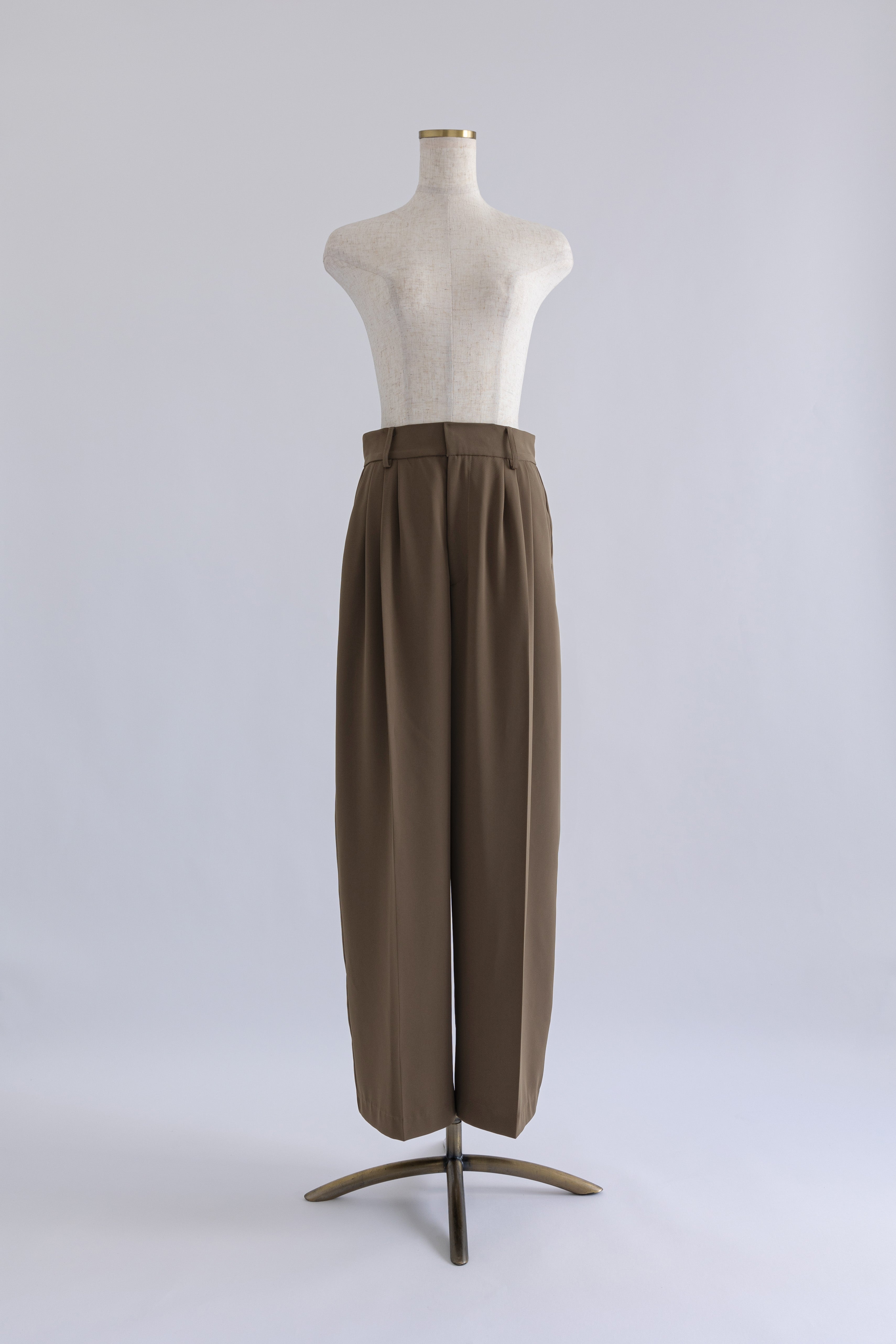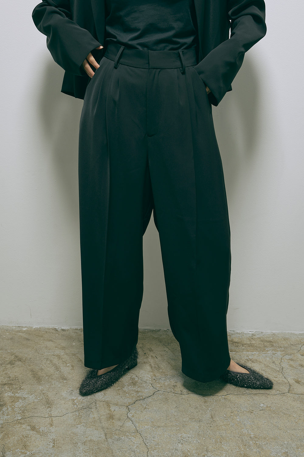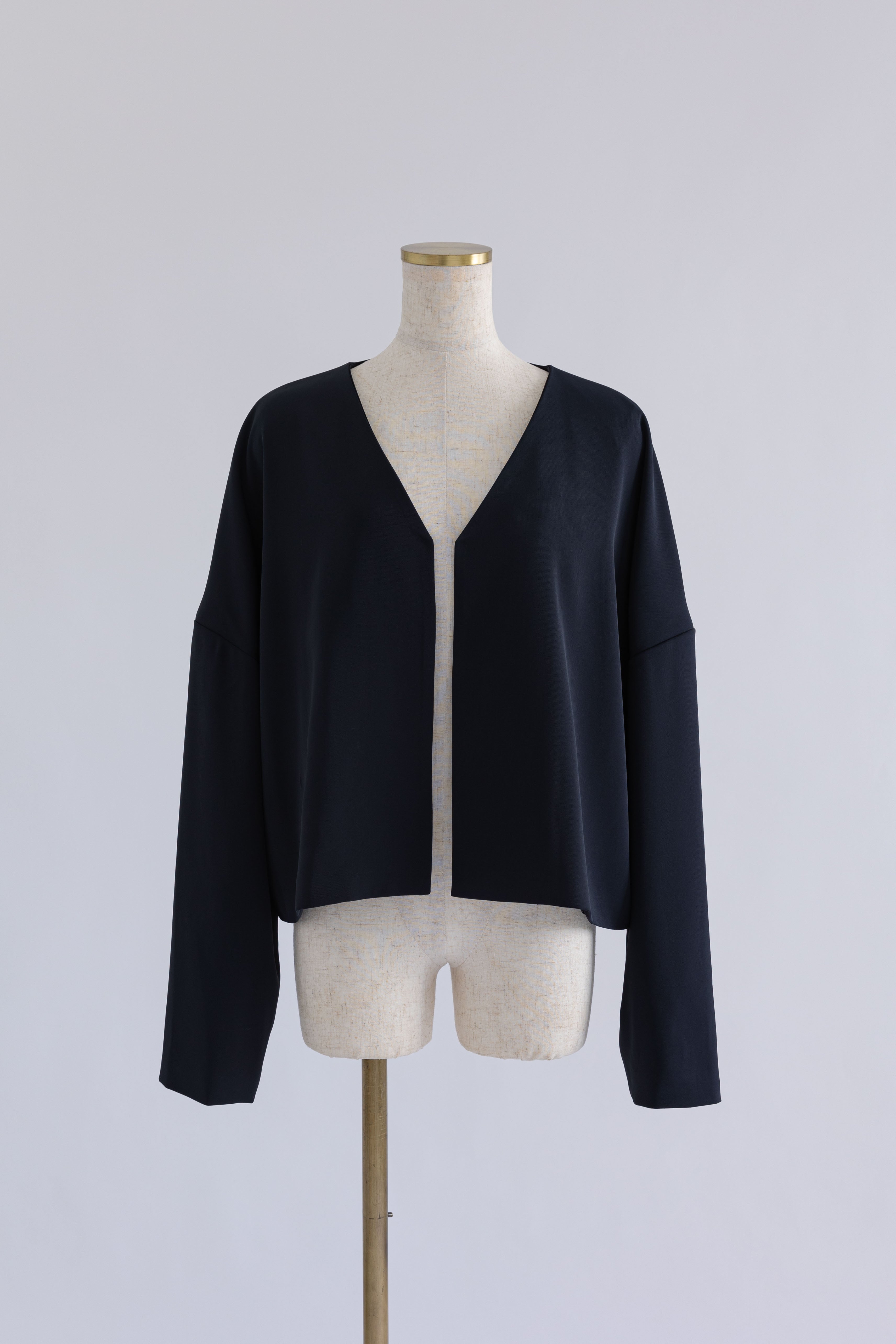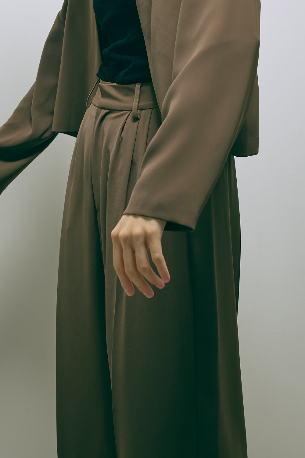 シンプルでありながらフォルムにこだわった、モード感あふれるセットアップ ドロップショルダーソフトジャケットセットアップ 【Material】 シワになりにくく、美しい落ち感のある合繊素材を使用。マットな質感が高級感を演出します。 【Design】 肩のラインを少しずらし、薄手の肩パッドを入れたフォルムが美しいジャケット。フロントには留め具をあえて設けず、カーディガンのようにラフに羽織れるデザインにしました。パンツはシンプルさを追求し、素材の落ち感を活かしたベーシックなデザインに仕上げています。 【Styling point】 セットでの着用がおすすめのモードなセットアップ。ベーシックなカラーなので、オケージョンシーンや学校行事、フォーマルな場面にも最適です。