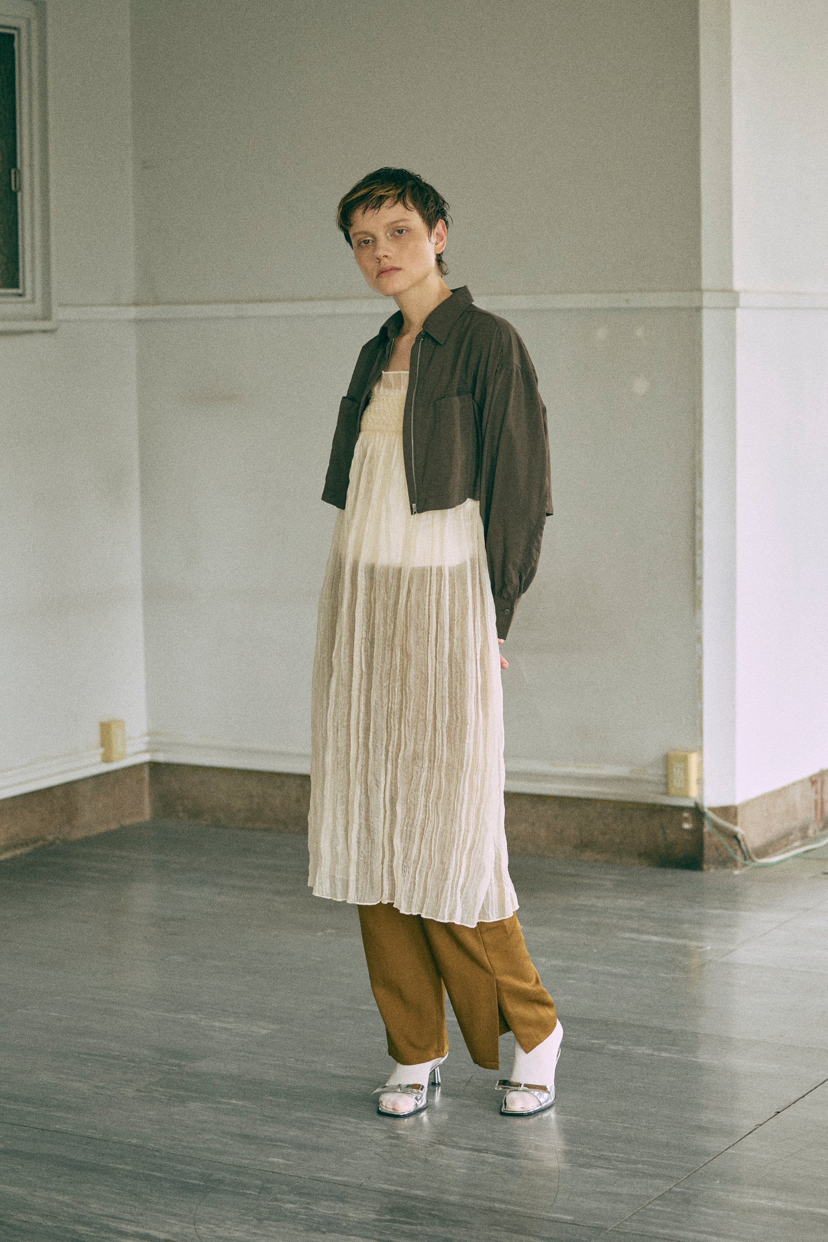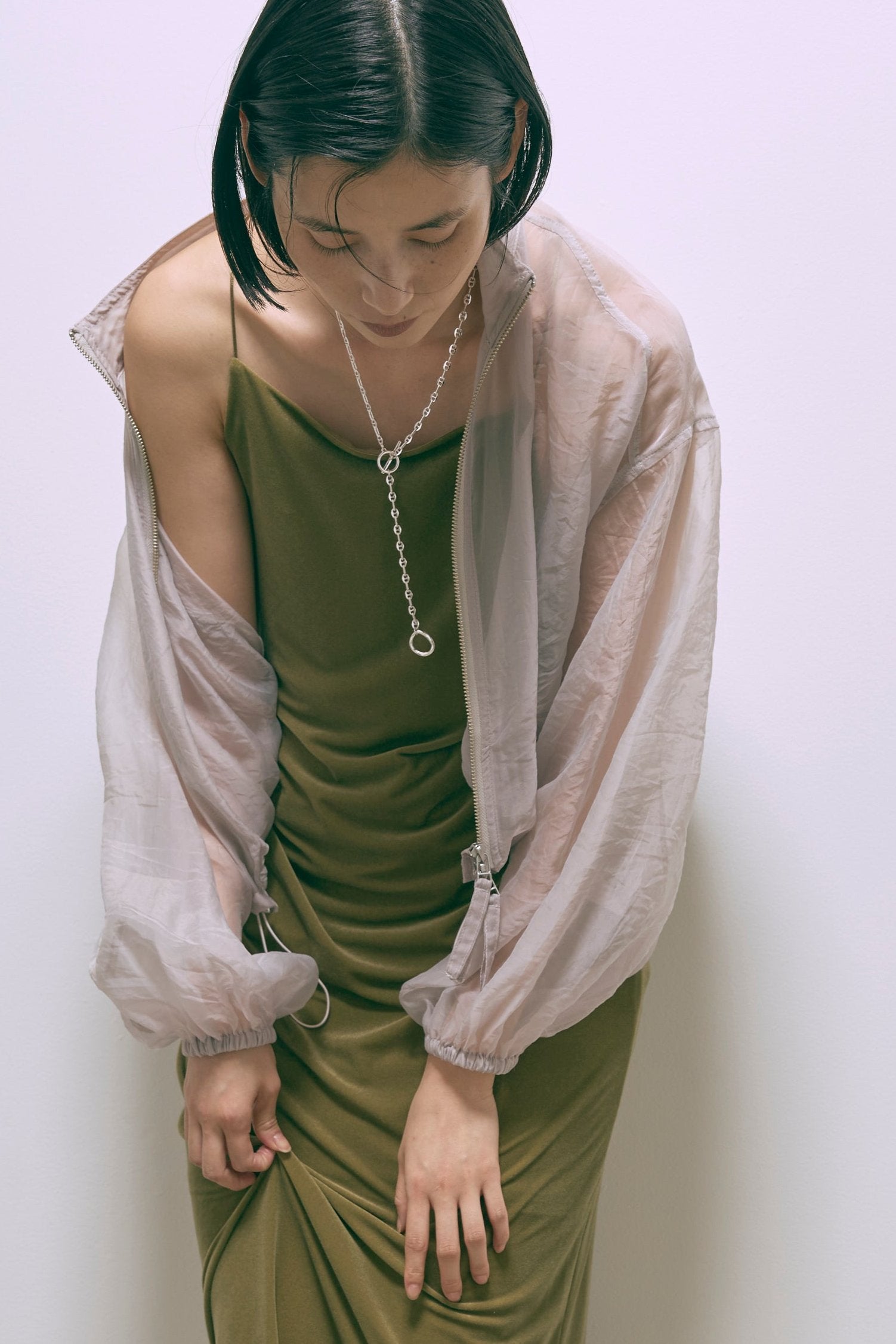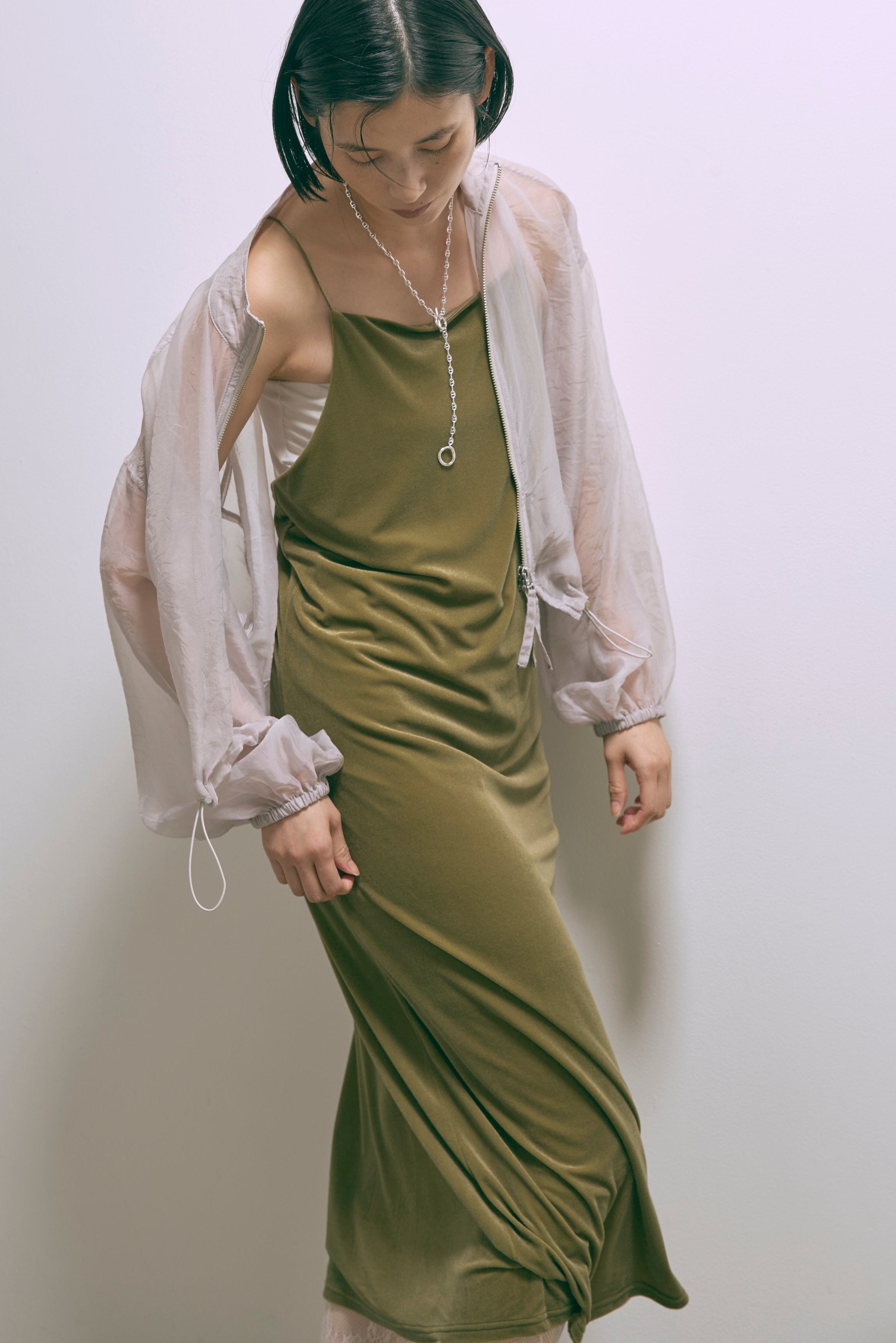 秋冬ムードを高めるベロアキャミワンピース 【Material】 しなやかで柔らかな触り心地で、マットな表面感が特徴のベロア素材。 【Design】 ナローラインでストンと生地に落ち感があり、綺麗なシルエットにしてくれます。 バックオープンのデザインでサテン紐を使用しているので後ろ姿も抜かりなくかわいいです。 【Styling point】 ハイゲージのニットやタートルネックのニットをインナーとしてご着用いただくのがおすすめです。 ダボっとしたニットやスウェットを上からかぶってロングスカートのように使っていただくのも素敵です。 シャツなどを合わせてハンサムなテイストと合わせてバランスをとったり、様々なレイヤードスタイルをお楽しみいただけます。