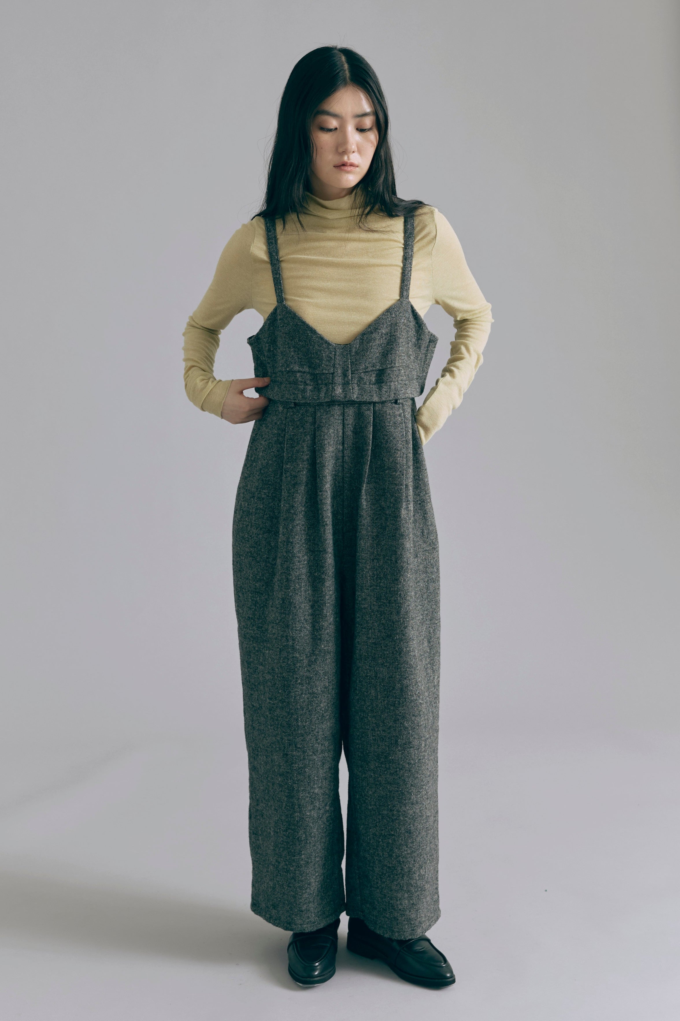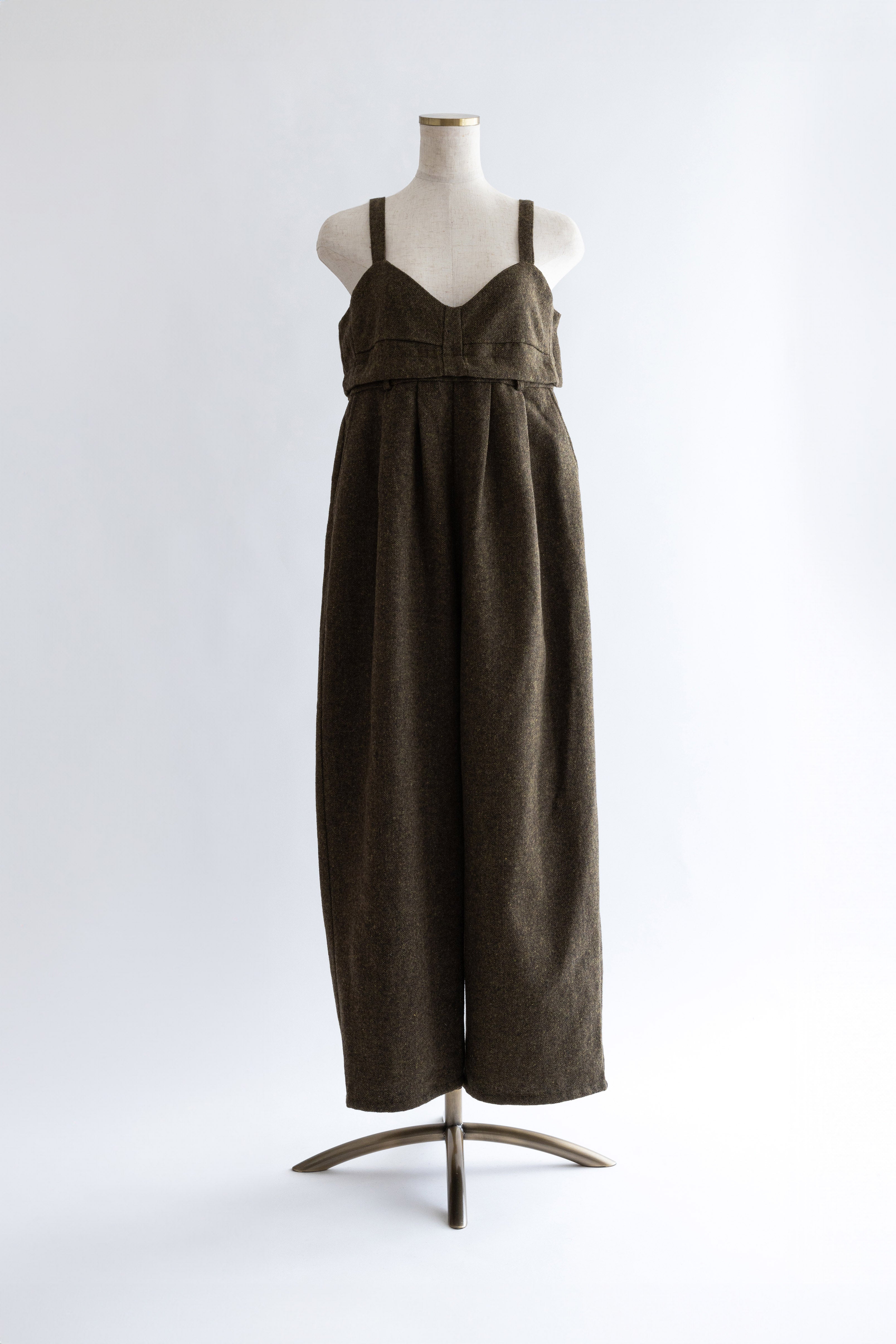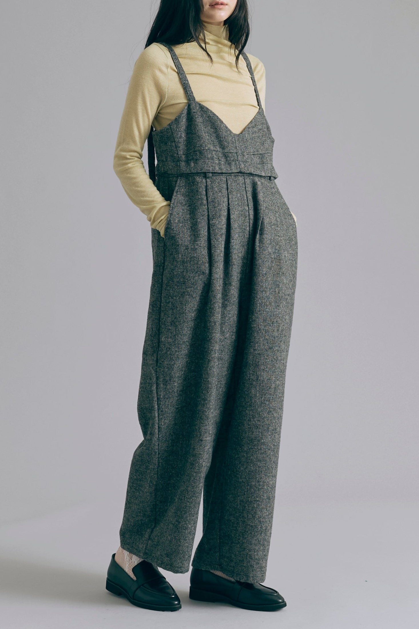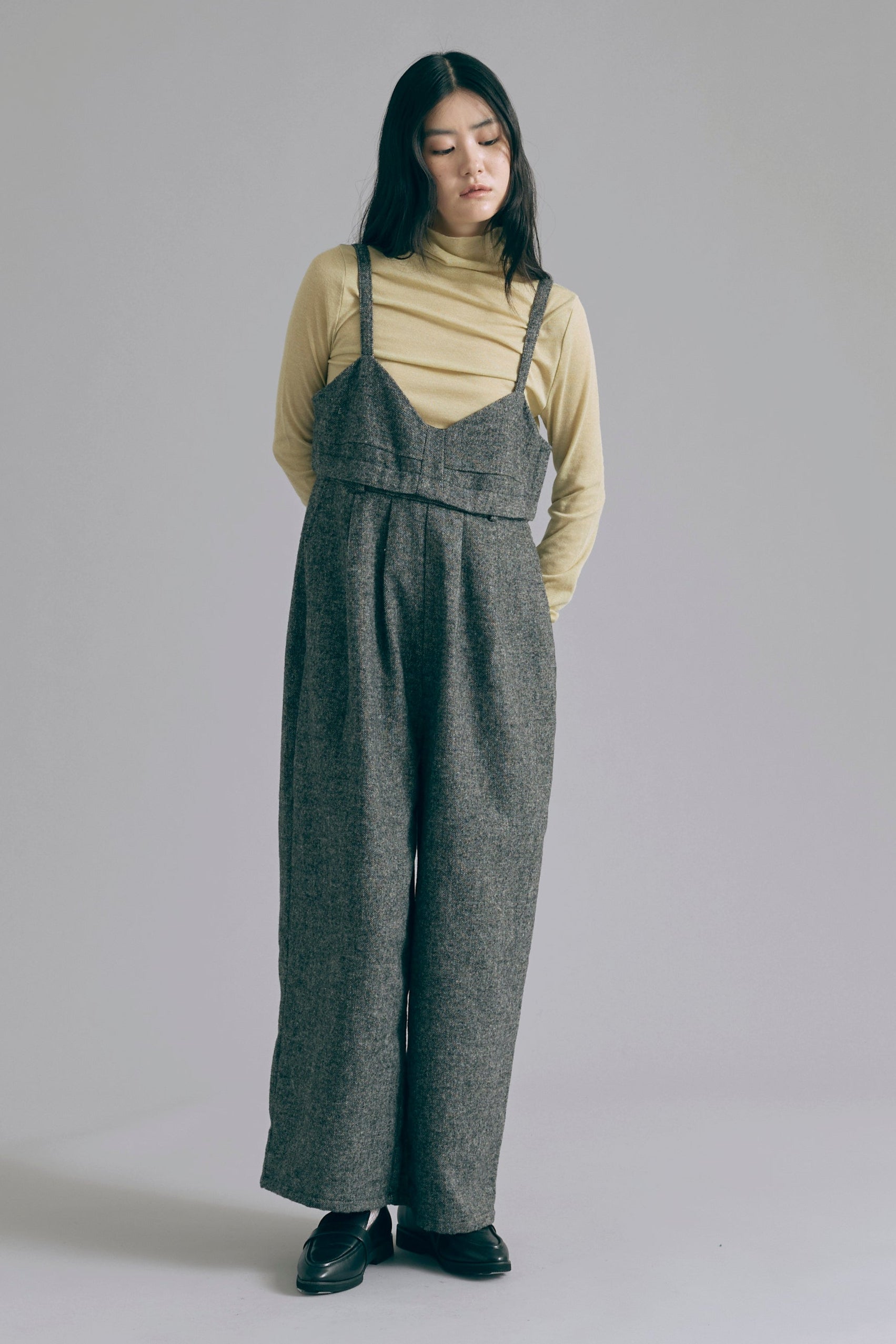 気分で変えれる2Wayスタイル 【Material】 しっかりとした生地感です。裏地付きで快適さにも配慮。 【Design】 胸元のビスチェデザインにコンビネゾンを掛け合わせた、他にはない存在感のある一着。ビスチェ部分は取り外し可能な2Way仕様で、その日の気分やシーンに合わせて印象をチェンジできます。 【Styling point】 オンの日はジャケットやヒールを合わせて洗練された着こなしに、オフの日はスニーカーやカーディガンでリラックス感のあるスタイリングがおすすめ。 インナー次第で季節感を変えられるので、ワードローブに加えておきたい一着です。デイリー使いはもちろん、ちょっとしたお呼ばれや旅行にも◎