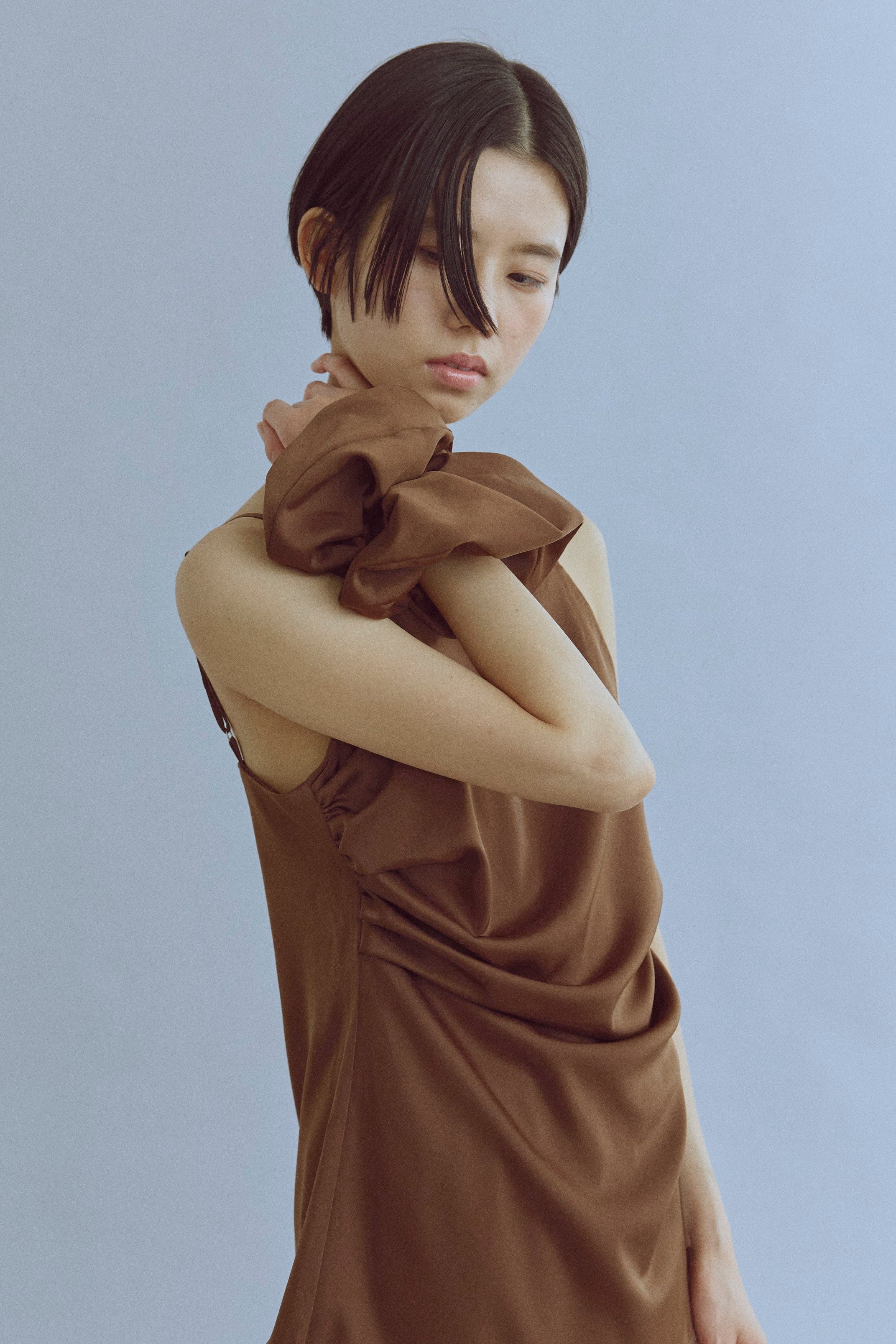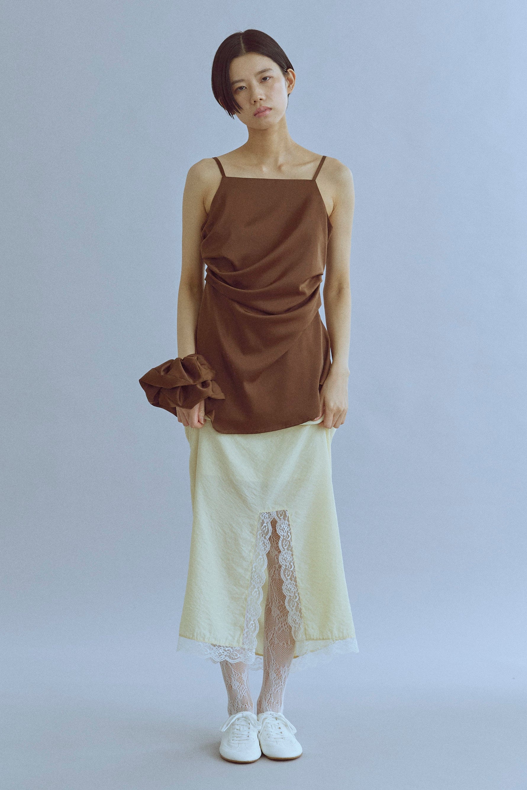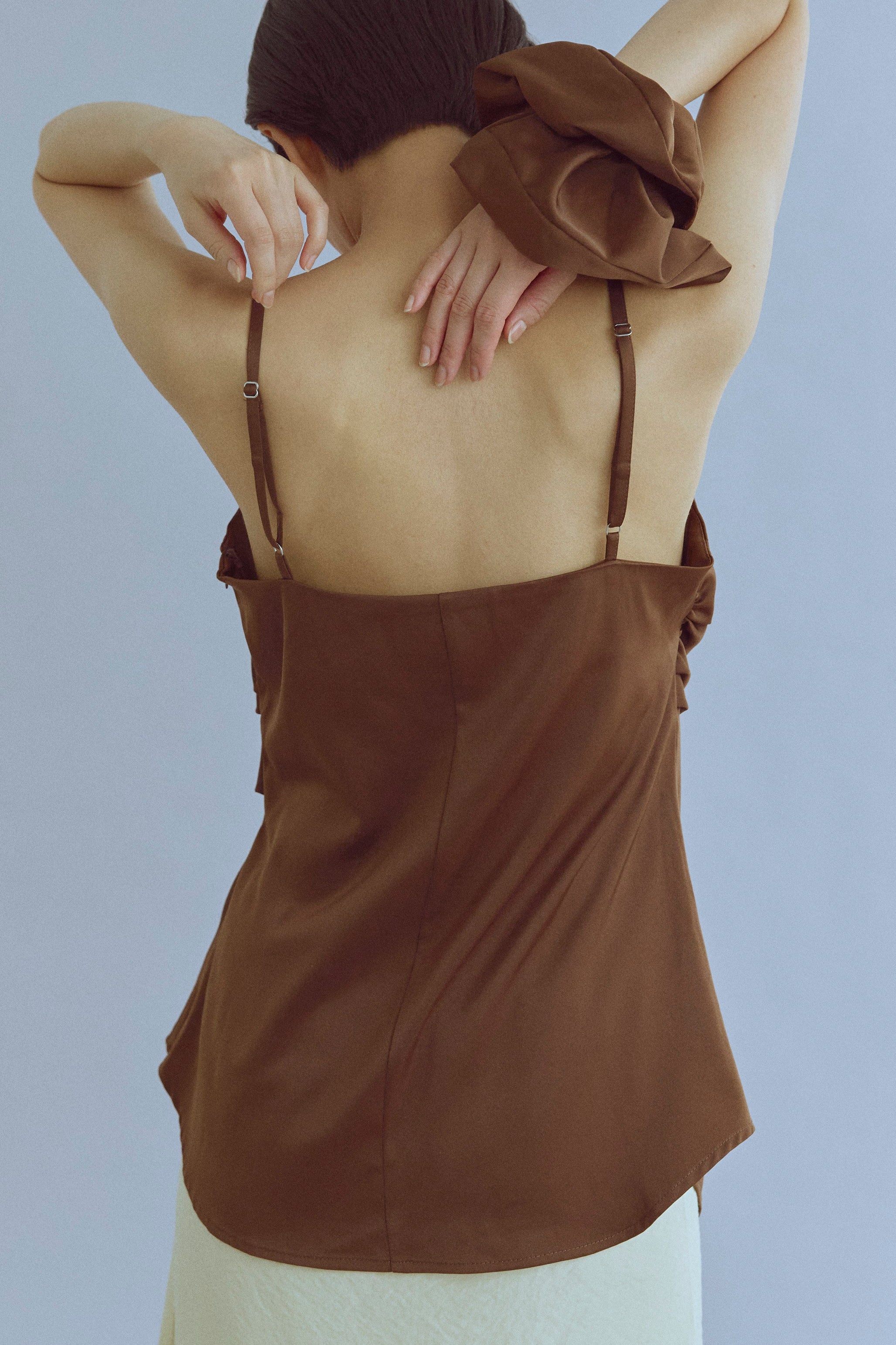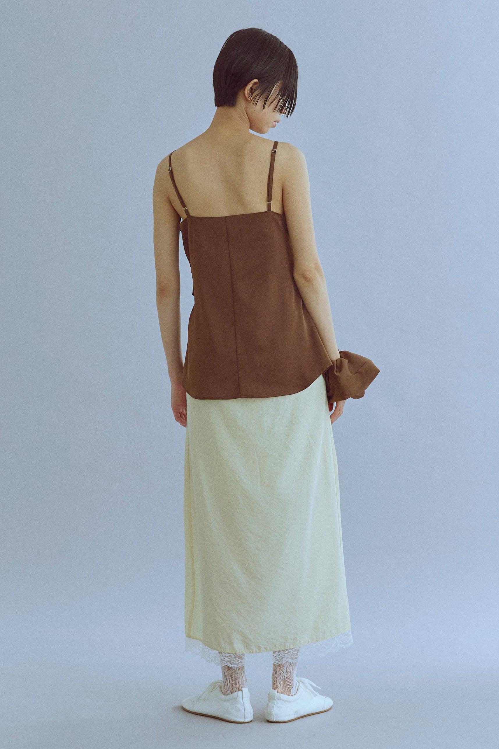 統一感をプラスするキャミ&シュシュセット 【Material】 やわらかく落ち感のある素材で、ほどよいマットな光沢が上品なキャミソール。さらっとした肌触りで、汗ばむ季節でも快適に着れます。付属のシュシュも同素材で作られているので、統一感のあるスタイリングが楽しめるのも魅力です。 【Design】 デコルテラインをきれいに見せるすっきりとしたデザインで、女性らしいシルエットに◎シュシュはボリュームがあり、まとめ髪をするときに存在感を出してくれる万能アイテムです。 【Styling point】 タイトスカートやワイドパンツと合わせて、フェミニンに。シュシュはまとめ髪に華やかさをプラスしてくれるだけでなく、手首にアクセサリー感覚でつけても可愛いアクセントになります。
