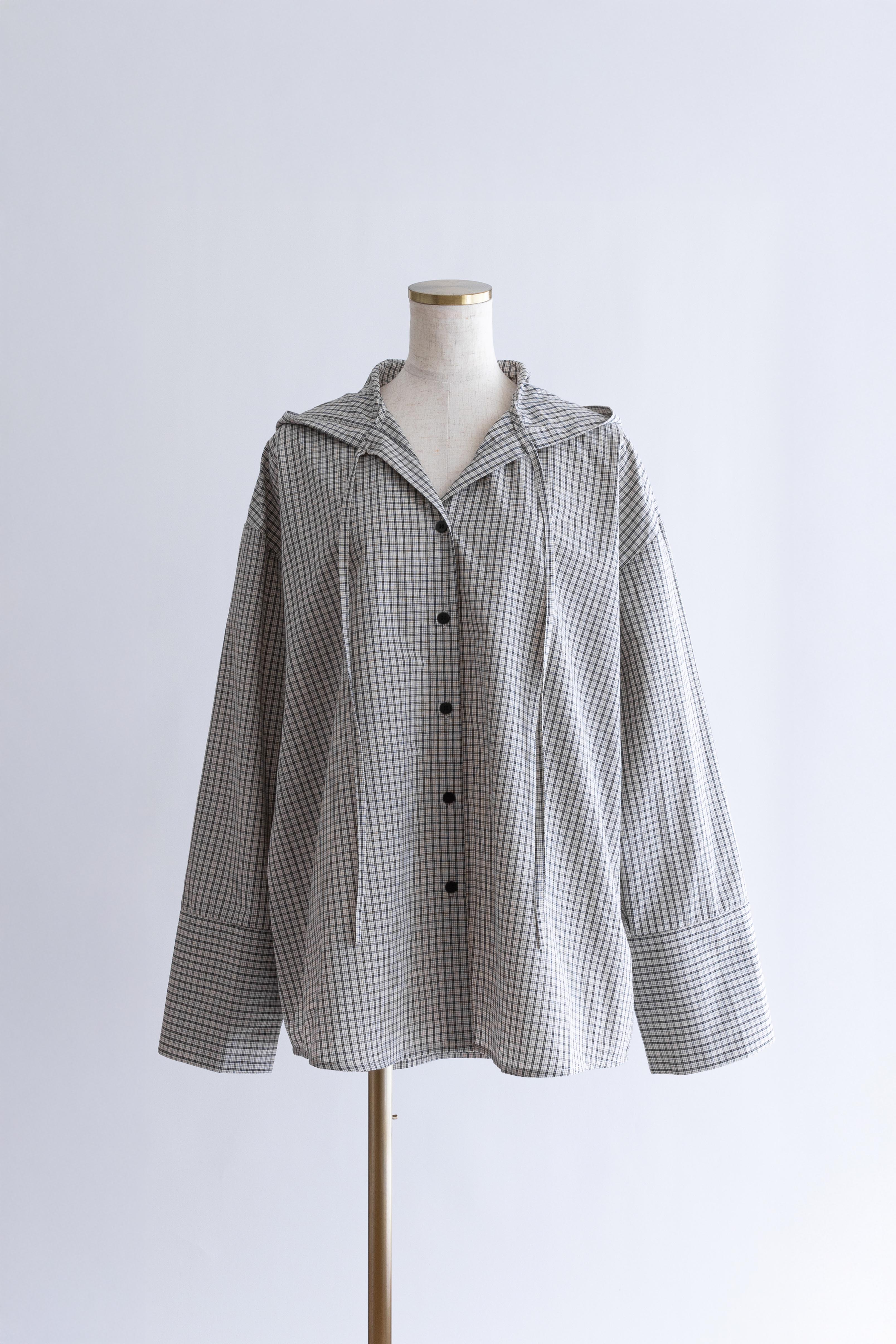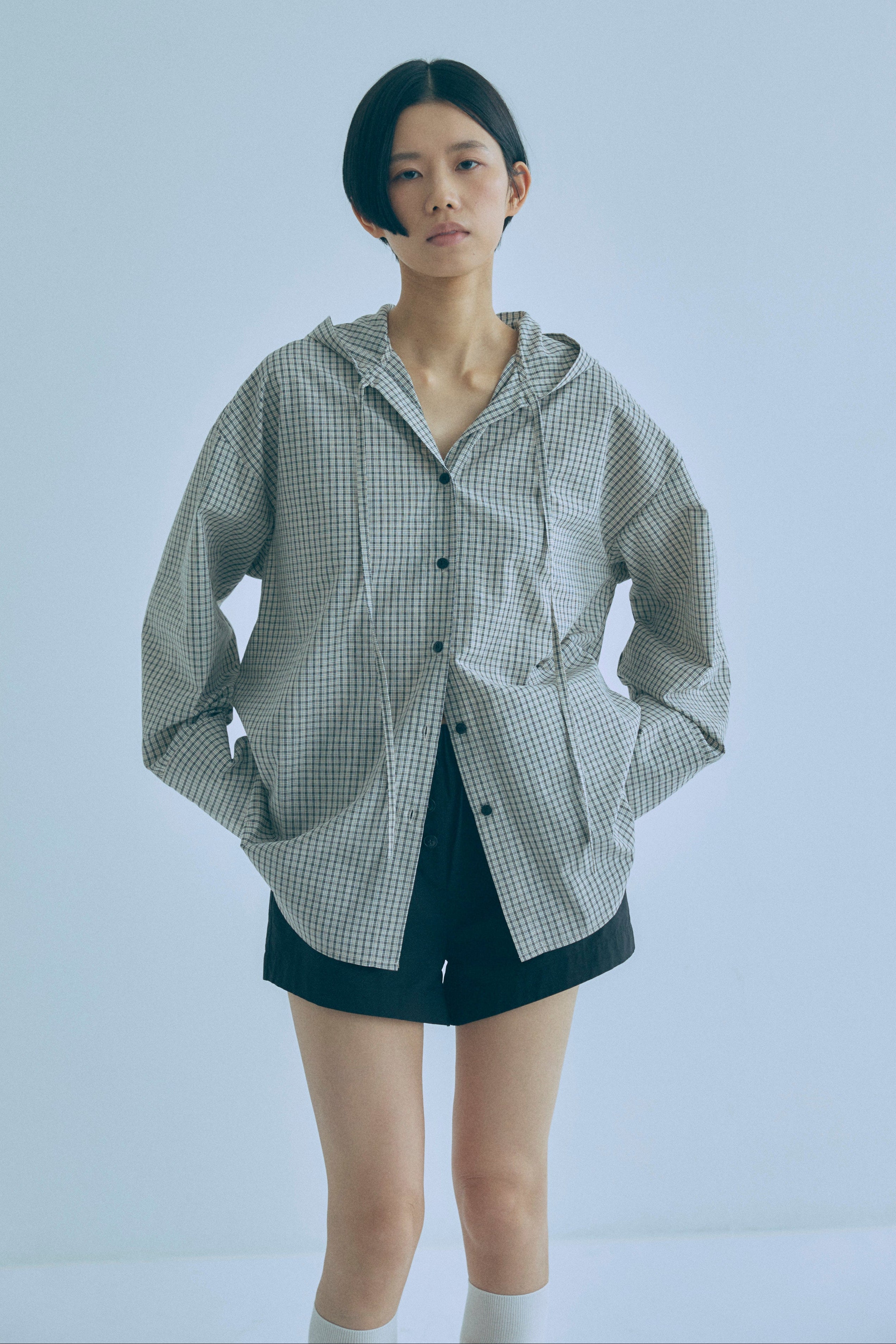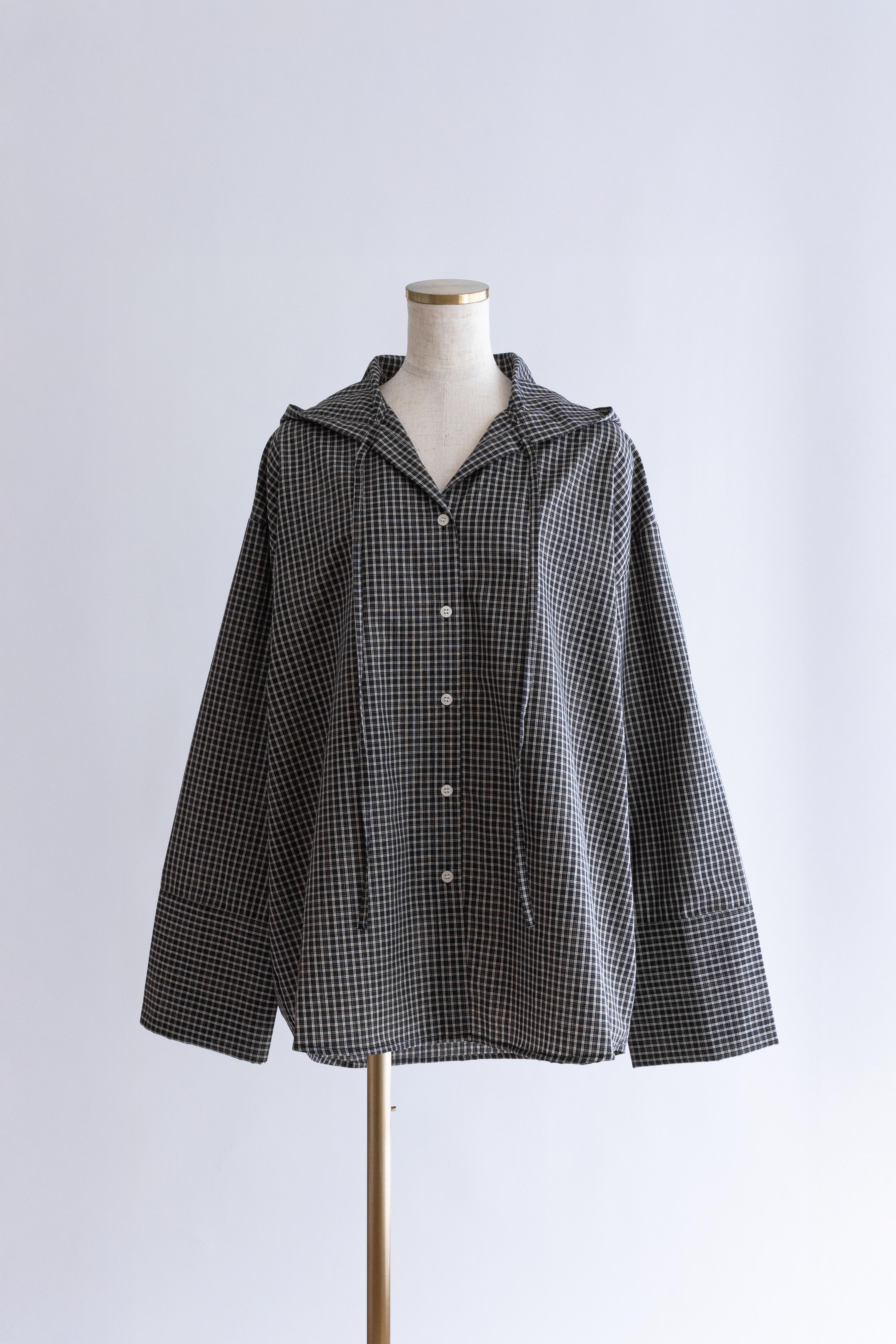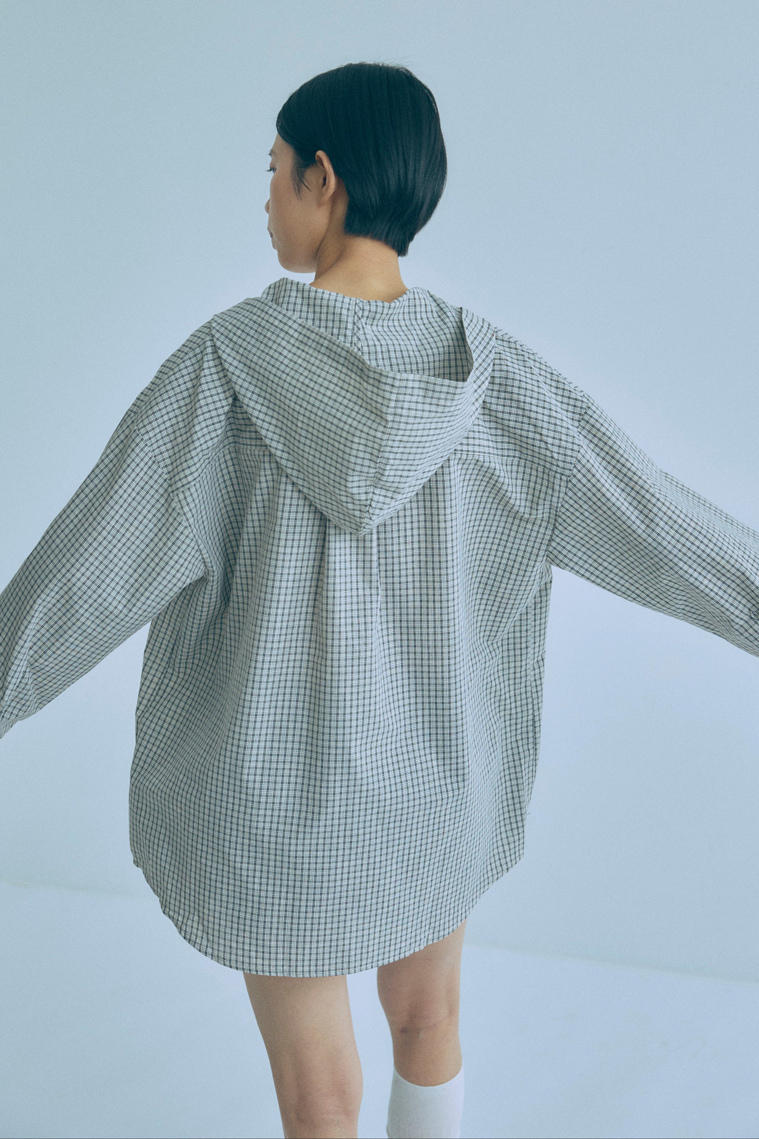 フード付きで抜け感をつくる、チェックオーバーサイズシャツ 【Material】 柔らかく軽やかな素材を使用し、肌に優しく快適な着心地。程よいハリ感があるため、オーバーサイズでもだらしなく見えず、きれいなシルエットをキープします。デイリーに取り入れやすい素材感です。 【Design】 クラシカルなチェック柄にフードを組み合わせた、程よくラフなデザイン。肩まわりや身幅にゆとりを持たせたオーバーサイズシルエットで、ゆるっと着られるリラックス感が魅力です。フードがスタイリングのアクセントになり、羽織るだけでこなれた印象に仕上がります。 【Styling point】 シャツをワンピース感覚でミニ丈ボトムと合わせ、タイツやニーハイソックスを重ねたスタイリングがおすすめ。カジュアルさの中に女性らしさをプラスできます。チェック柄はボトムを選ばず合わせやすく、デニムやワイドパンツとも好相性で、着回し力の高い一着です。