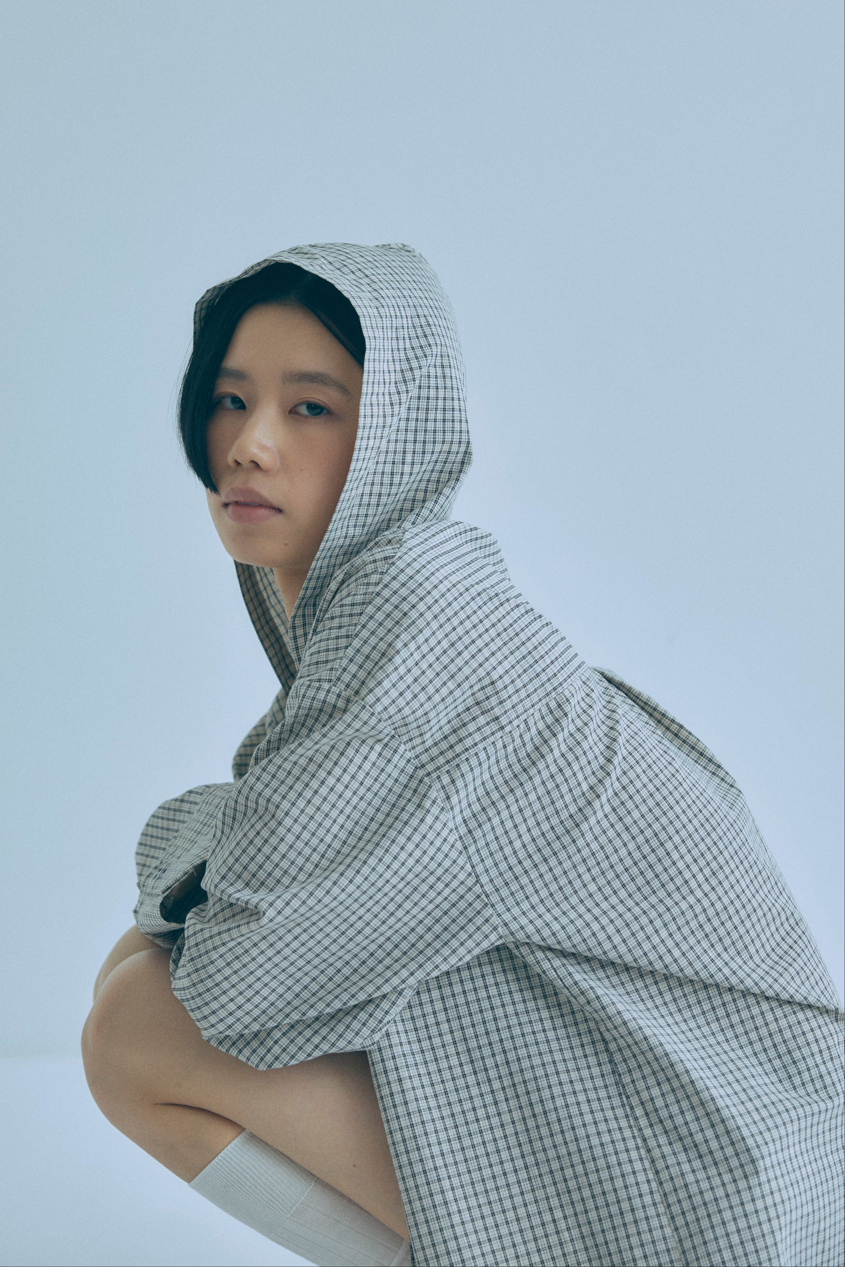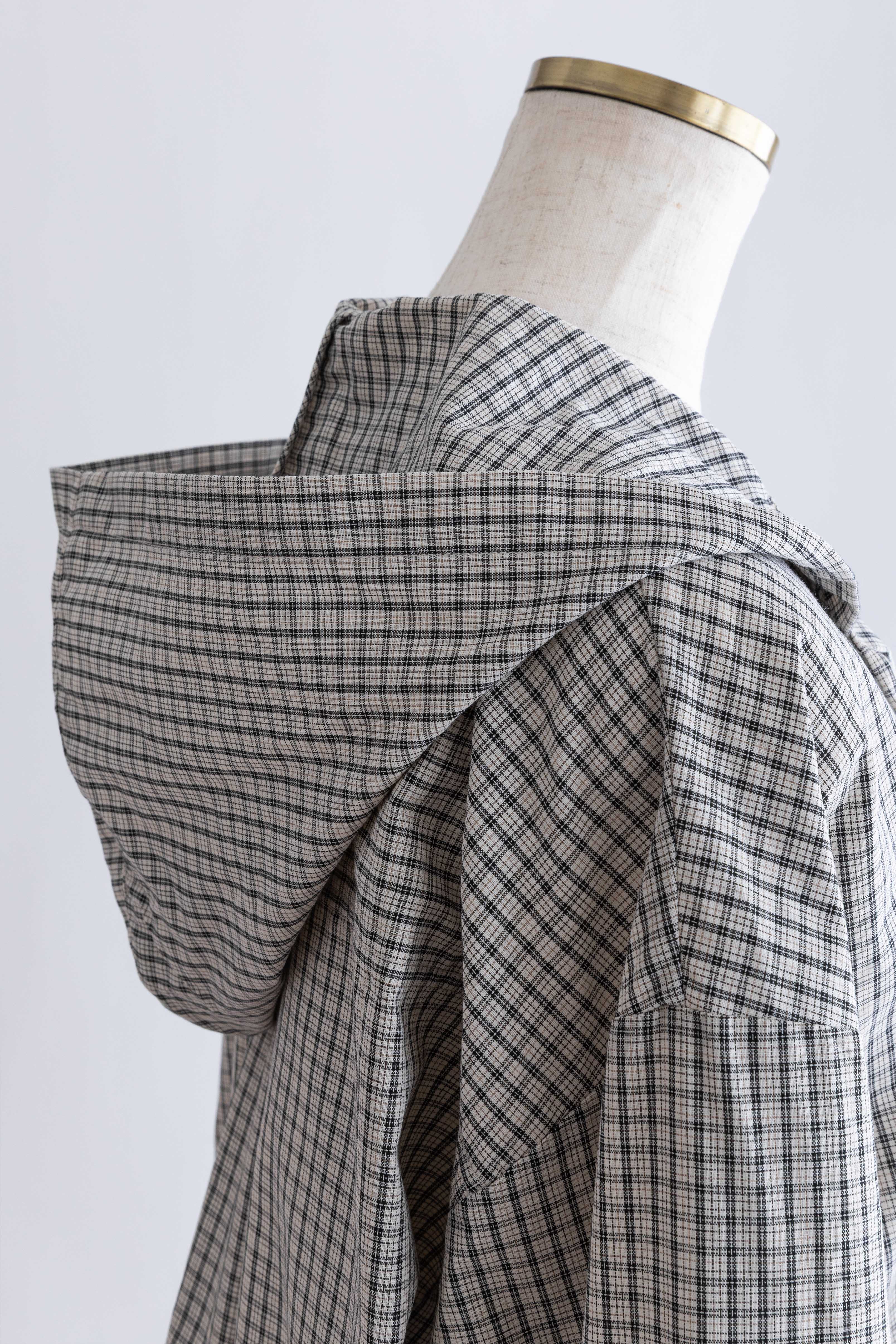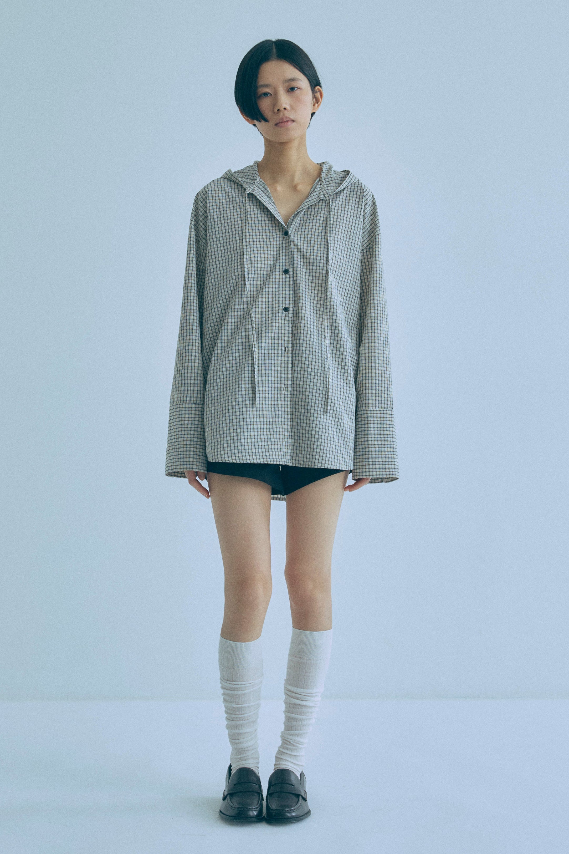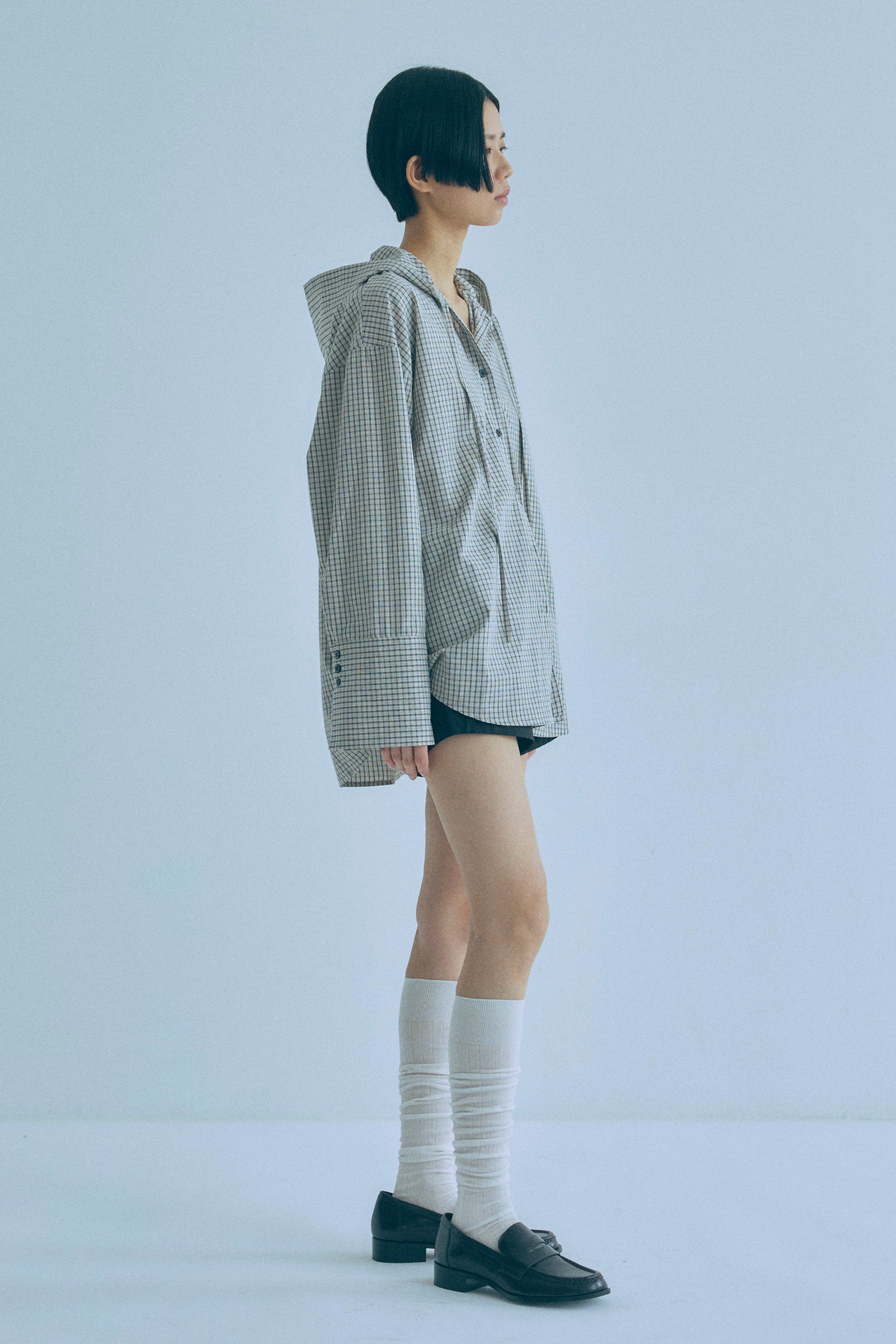 フード付きで抜け感をつくる、チェックオーバーサイズシャツ 【Material】 柔らかく軽やかな素材を使用し、肌に優しく快適な着心地。程よいハリ感があるため、オーバーサイズでもだらしなく見えず、きれいなシルエットをキープします。デイリーに取り入れやすい素材感です。 【Design】 クラシカルなチェック柄にフードを組み合わせた、程よくラフなデザイン。肩まわりや身幅にゆとりを持たせたオーバーサイズシルエットで、ゆるっと着られるリラックス感が魅力です。フードがスタイリングのアクセントになり、羽織るだけでこなれた印象に仕上がります。 【Styling point】 シャツをワンピース感覚でミニ丈ボトムと合わせ、タイツやニーハイソックスを重ねたスタイリングがおすすめ。カジュアルさの中に女性らしさをプラスできます。チェック柄はボトムを選ばず合わせやすく、デニムやワイドパンツとも好相性で、着回し力の高い一着です。