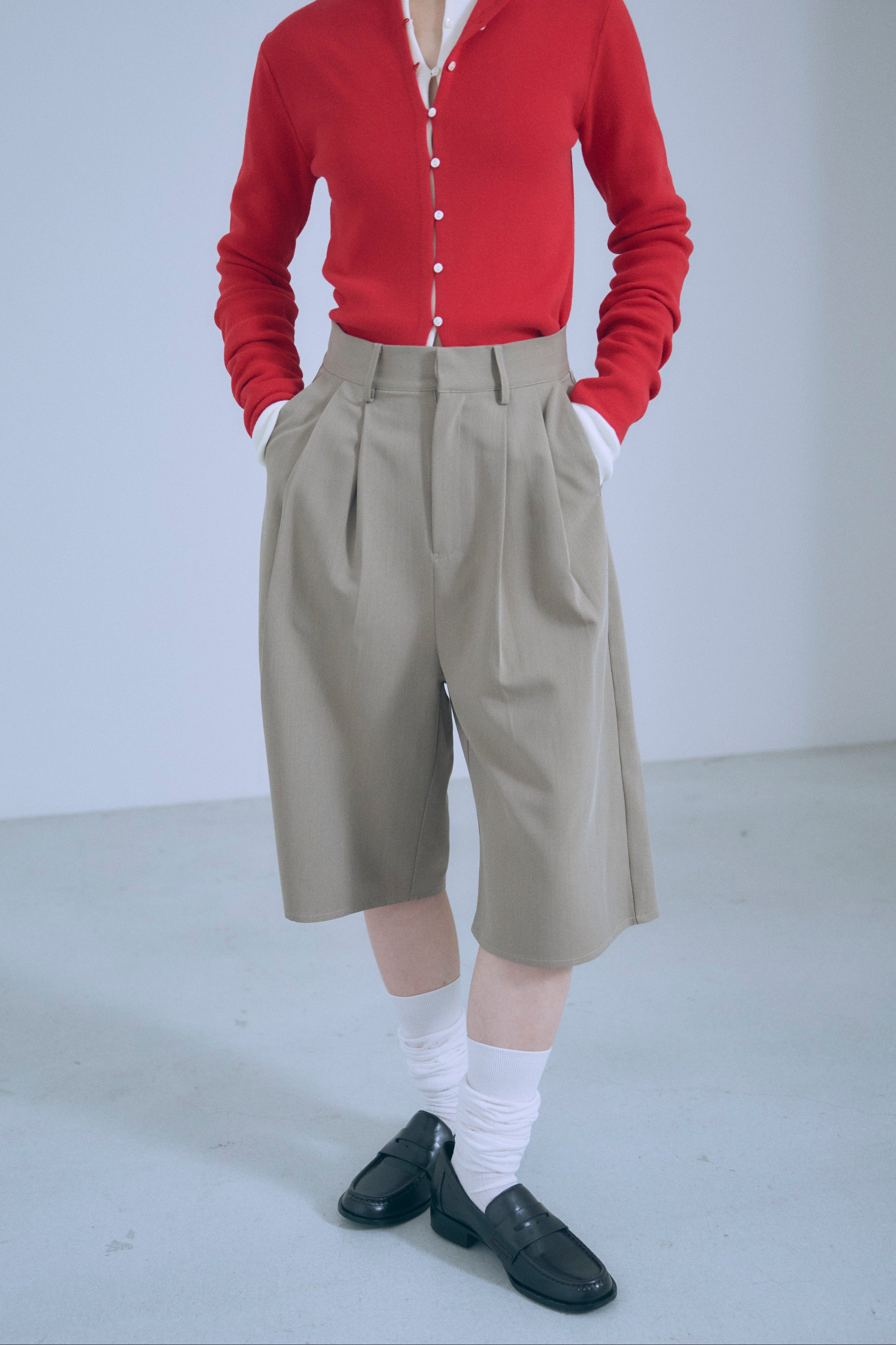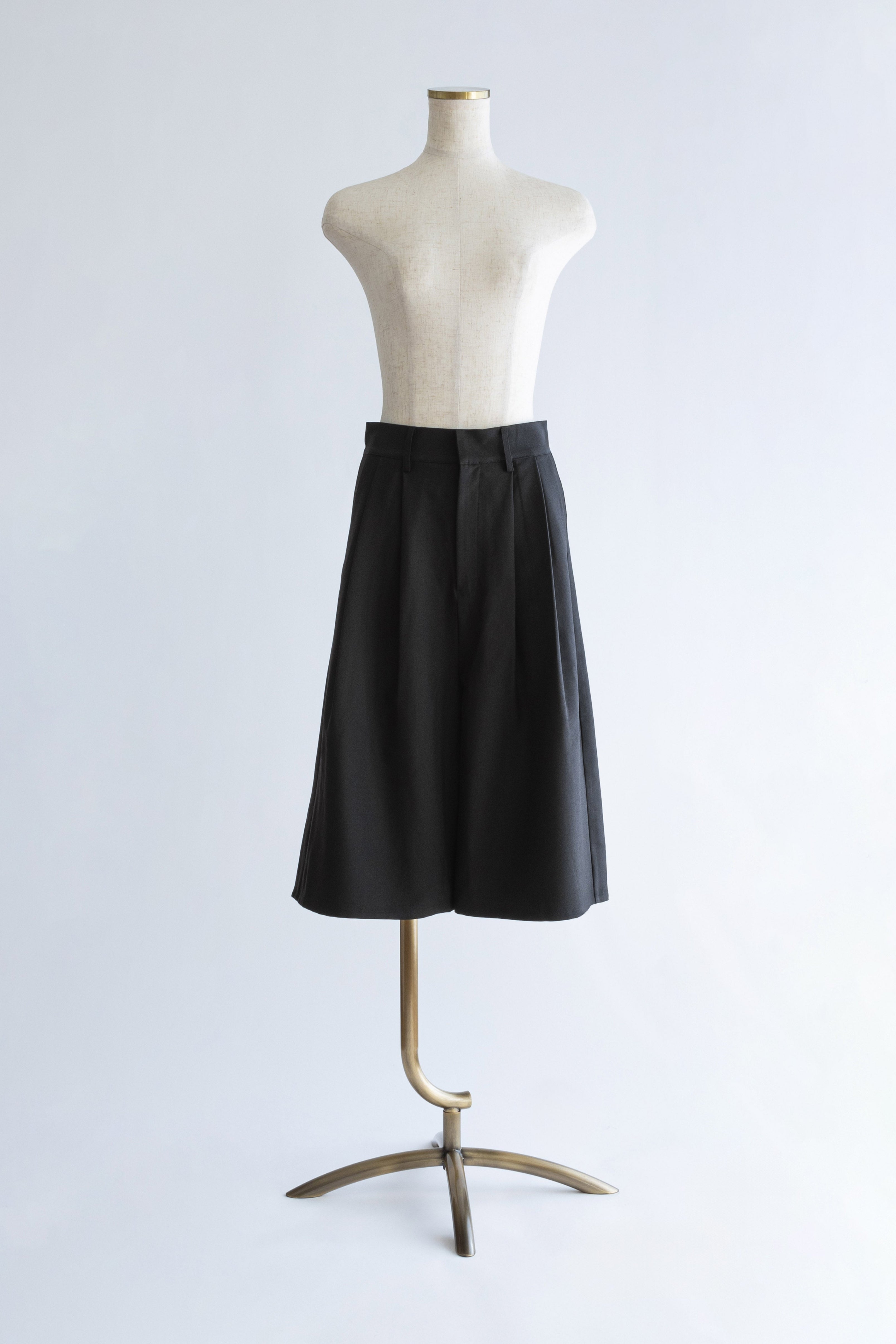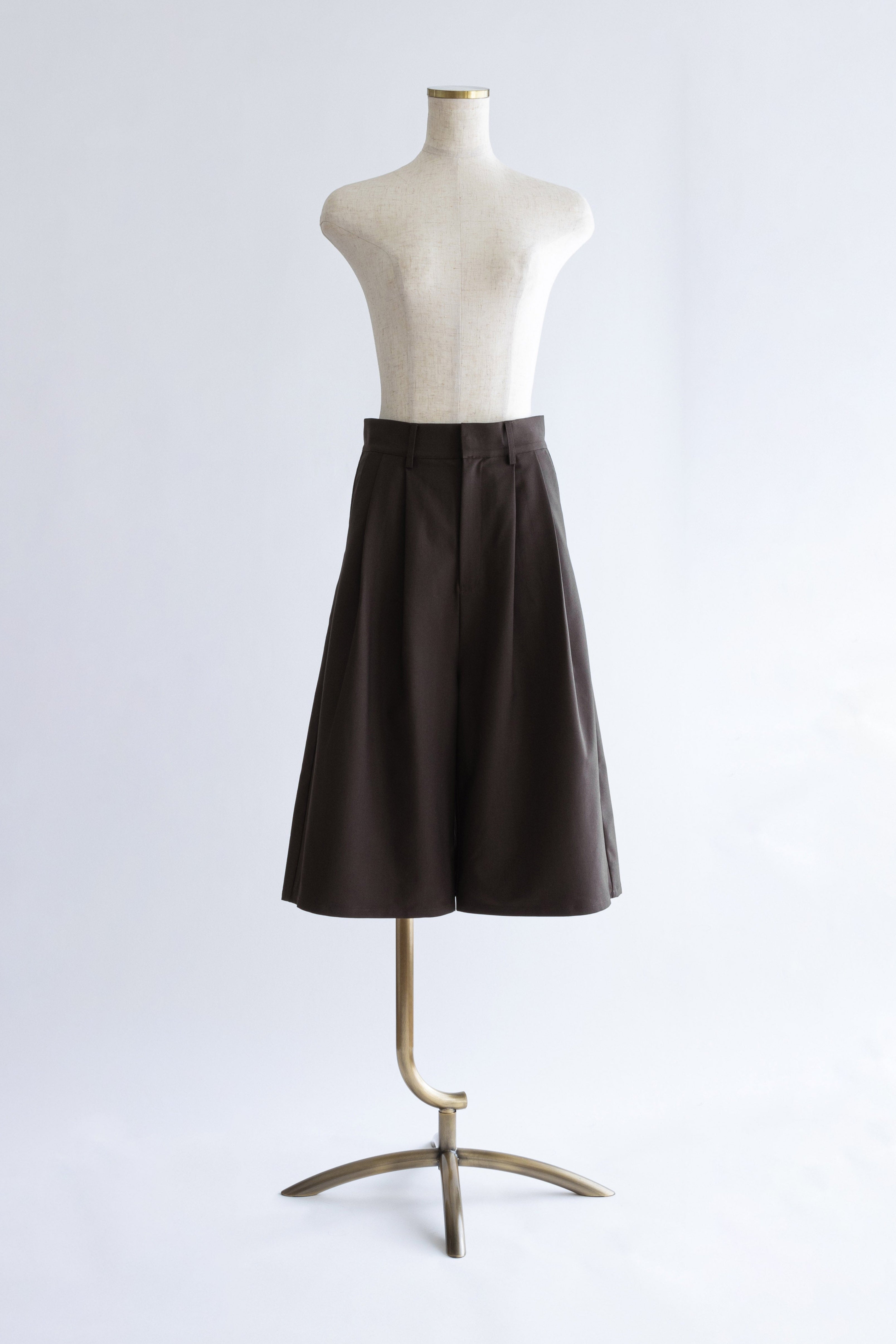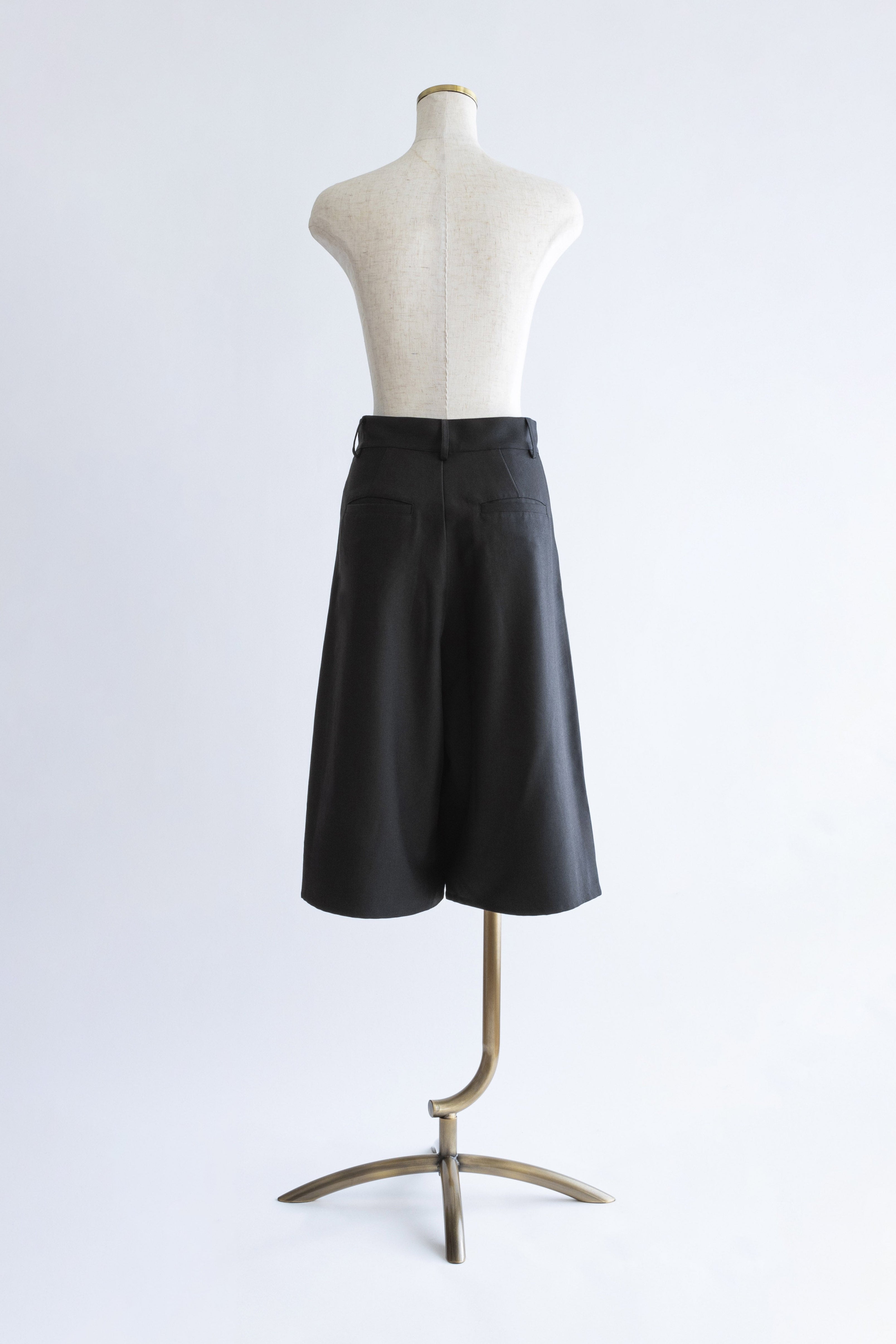 シンプルで抜け感のある、大人のハーフパンツ 【Material】 軽やかなタッチの素材を使用し、さらっとした肌触りが心地よい一本。ゆったりとしたシルエットで動きやすく、リラックス感のあるラクな穿き心地を叶えます。デイリーに取り入れやすい素材感です。 【Design】 膝が隠れるほどの丈感で、カジュアルになりすぎずバランス良く着用できるデザイン。腰まわりはすっきりと見える設計で、野暮ったさを感じさせません。フロントに施した2タックが立体感のあるシルエットを生み、裾に向かって自然に落ちるラインが脚をきれいに見せてくれます。長く愛用できるベーシックな一本です。 【Styling point】 オーバーサイズシャツを合わせたルーズなスタイリングはもちろん、コンパクトなトップスを合わせてすっきりまとめても好バランス。スウェットやロンTとも相性が良く、シーズンを問わず活躍する万能ハーフパンツです。