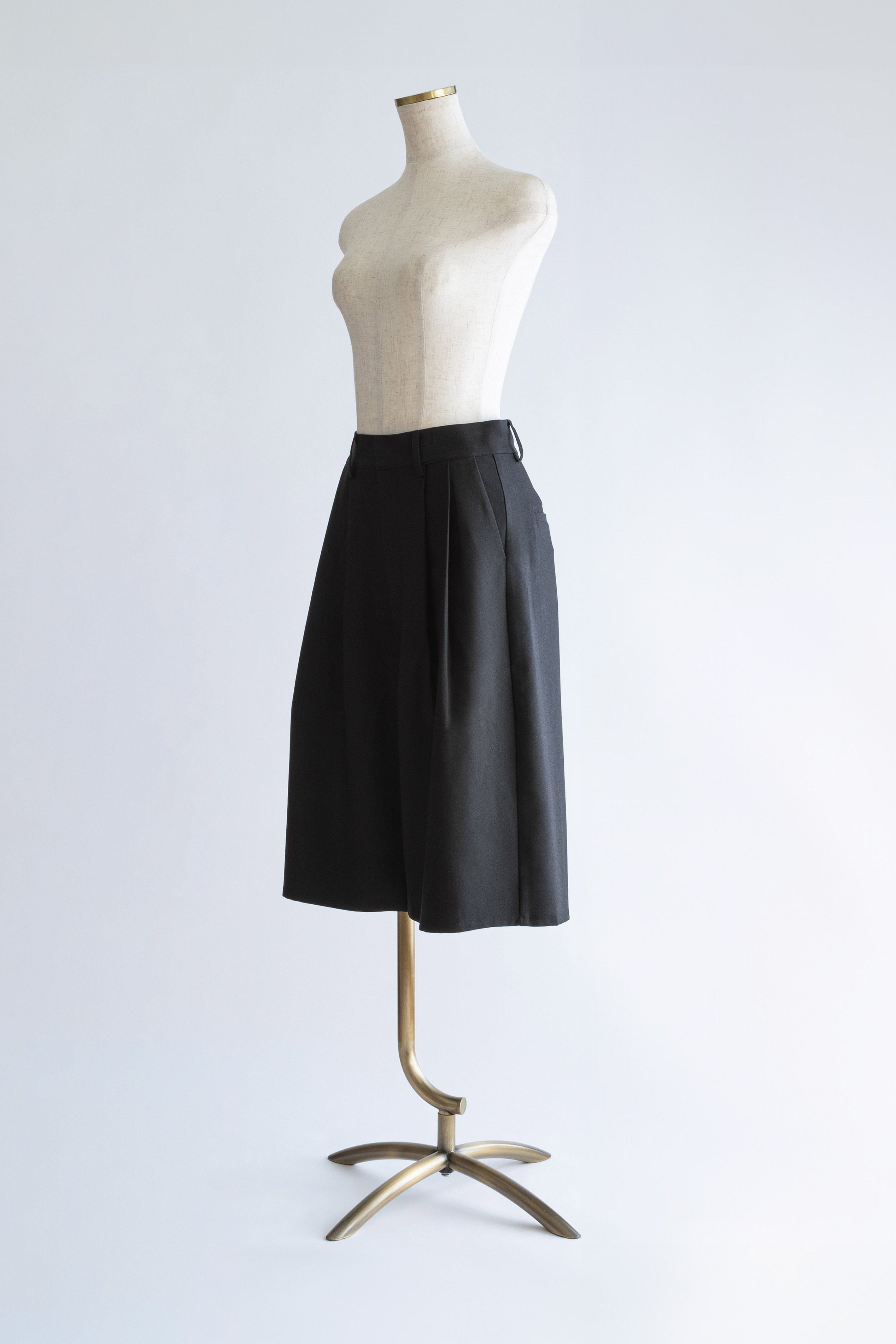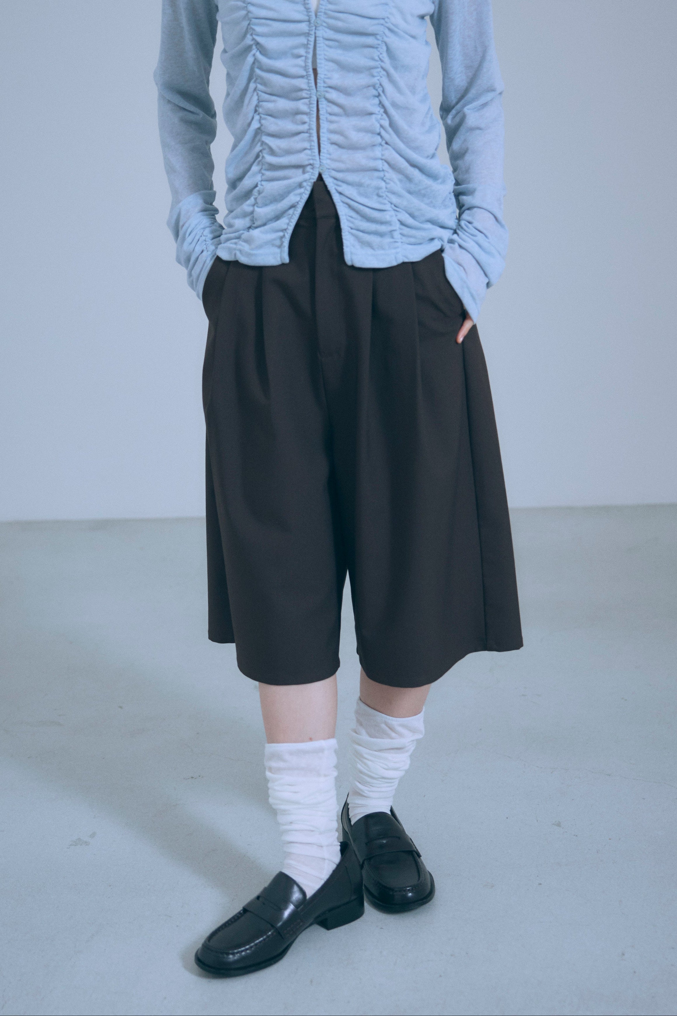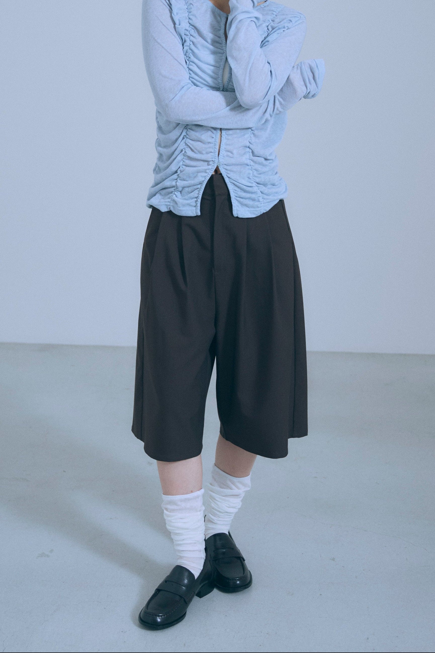 シンプルで抜け感のある、大人のハーフパンツ 【Material】 軽やかなタッチの素材を使用し、さらっとした肌触りが心地よい一本。ゆったりとしたシルエットで動きやすく、リラックス感のあるラクな穿き心地を叶えます。デイリーに取り入れやすい素材感です。 【Design】 膝が隠れるほどの丈感で、カジュアルになりすぎずバランス良く着用できるデザイン。腰まわりはすっきりと見える設計で、野暮ったさを感じさせません。フロントに施した2タックが立体感のあるシルエットを生み、裾に向かって自然に落ちるラインが脚をきれいに見せてくれます。長く愛用できるベーシックな一本です。 【Styling point】 オーバーサイズシャツを合わせたルーズなスタイリングはもちろん、コンパクトなトップスを合わせてすっきりまとめても好バランス。スウェットやロンTとも相性が良く、シーズンを問わず活躍する万能ハーフパンツです。