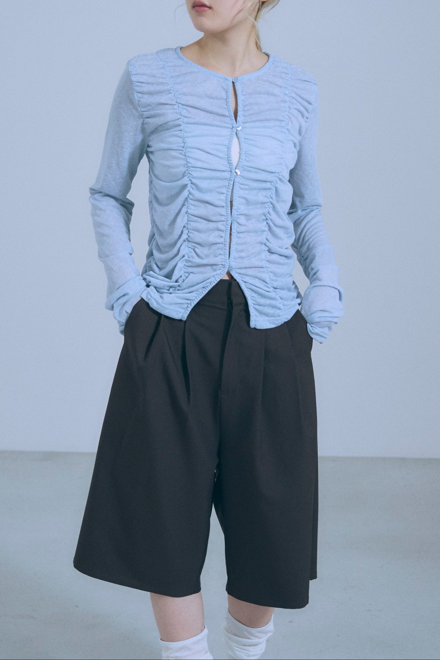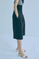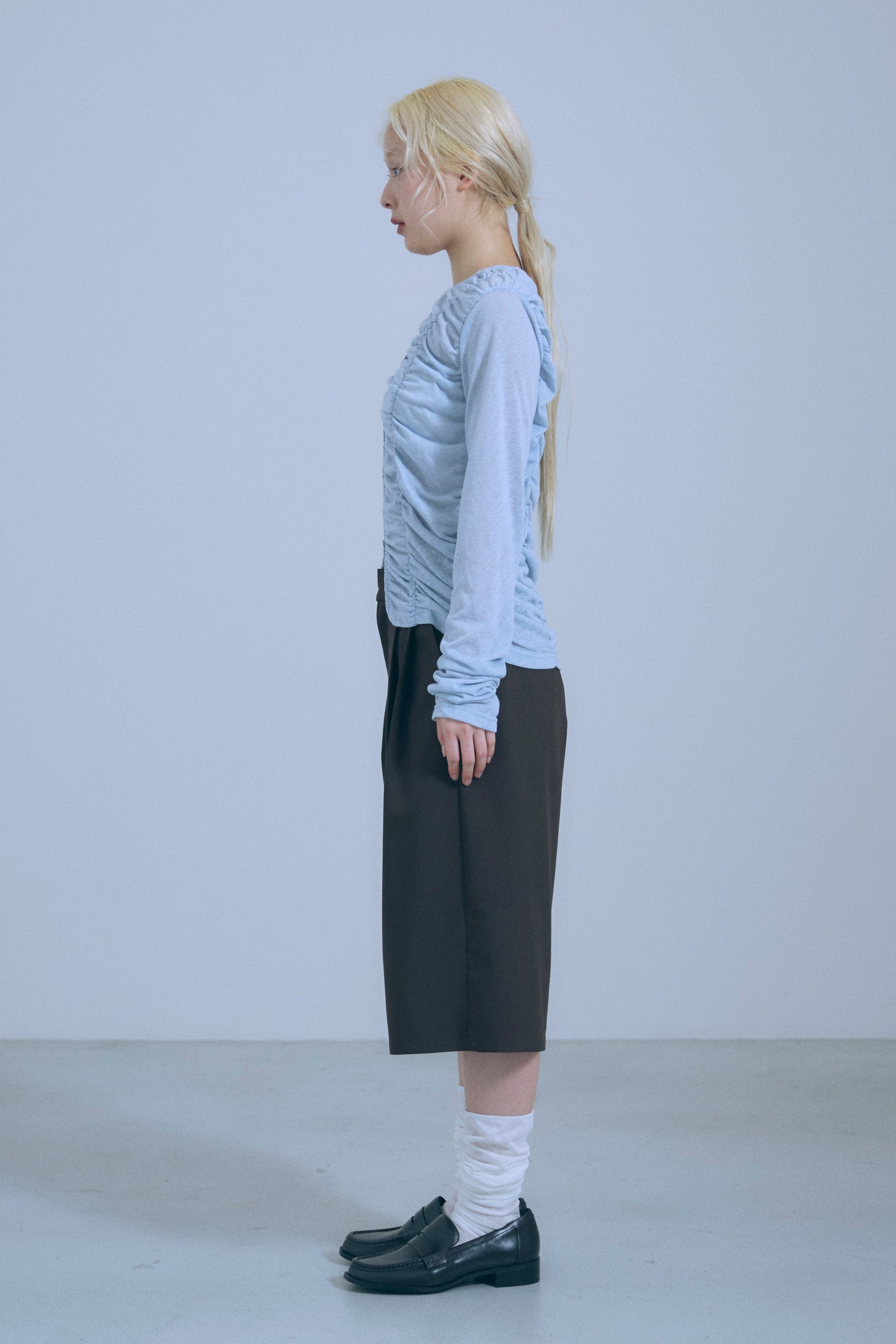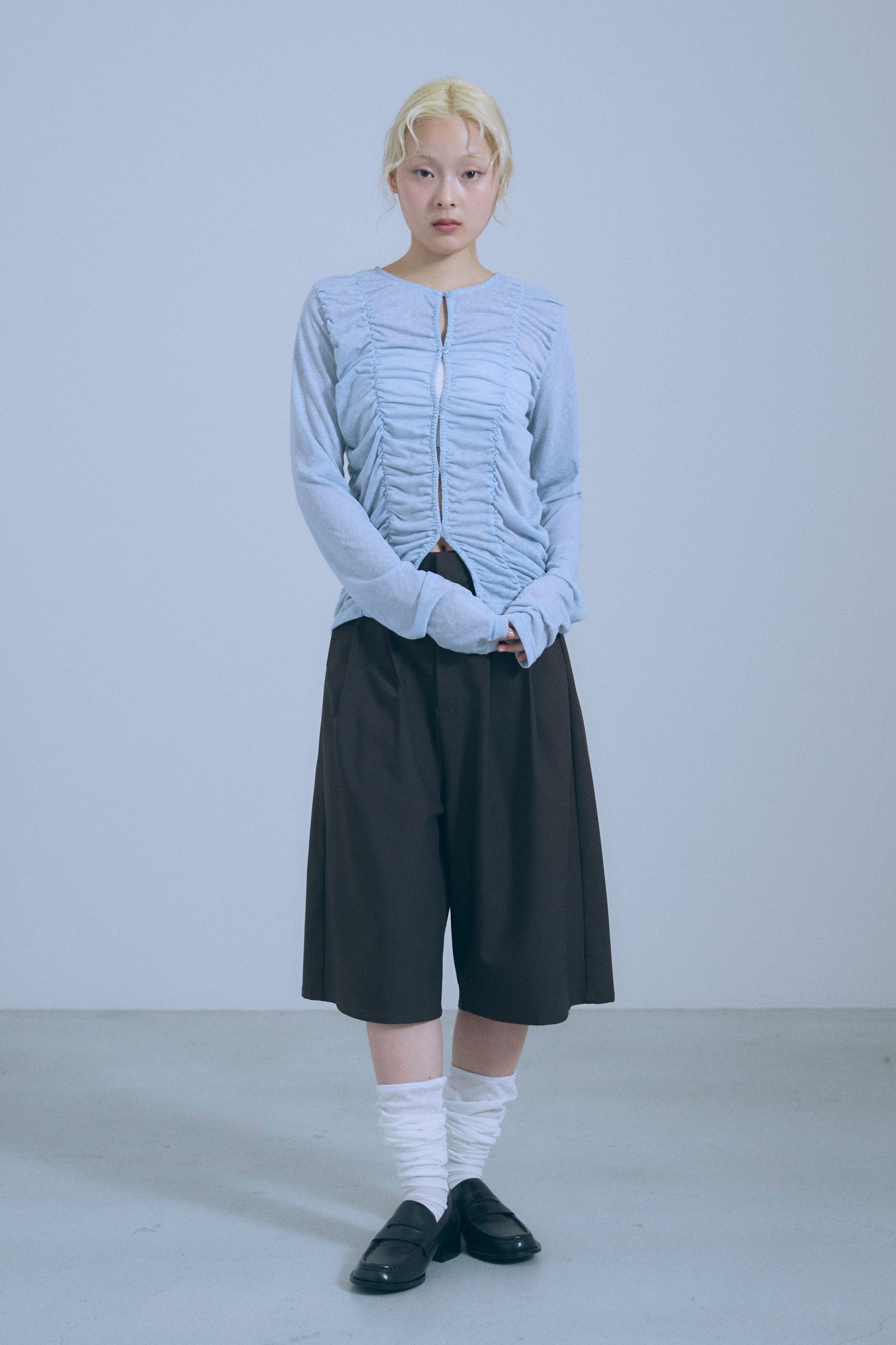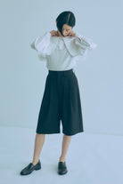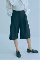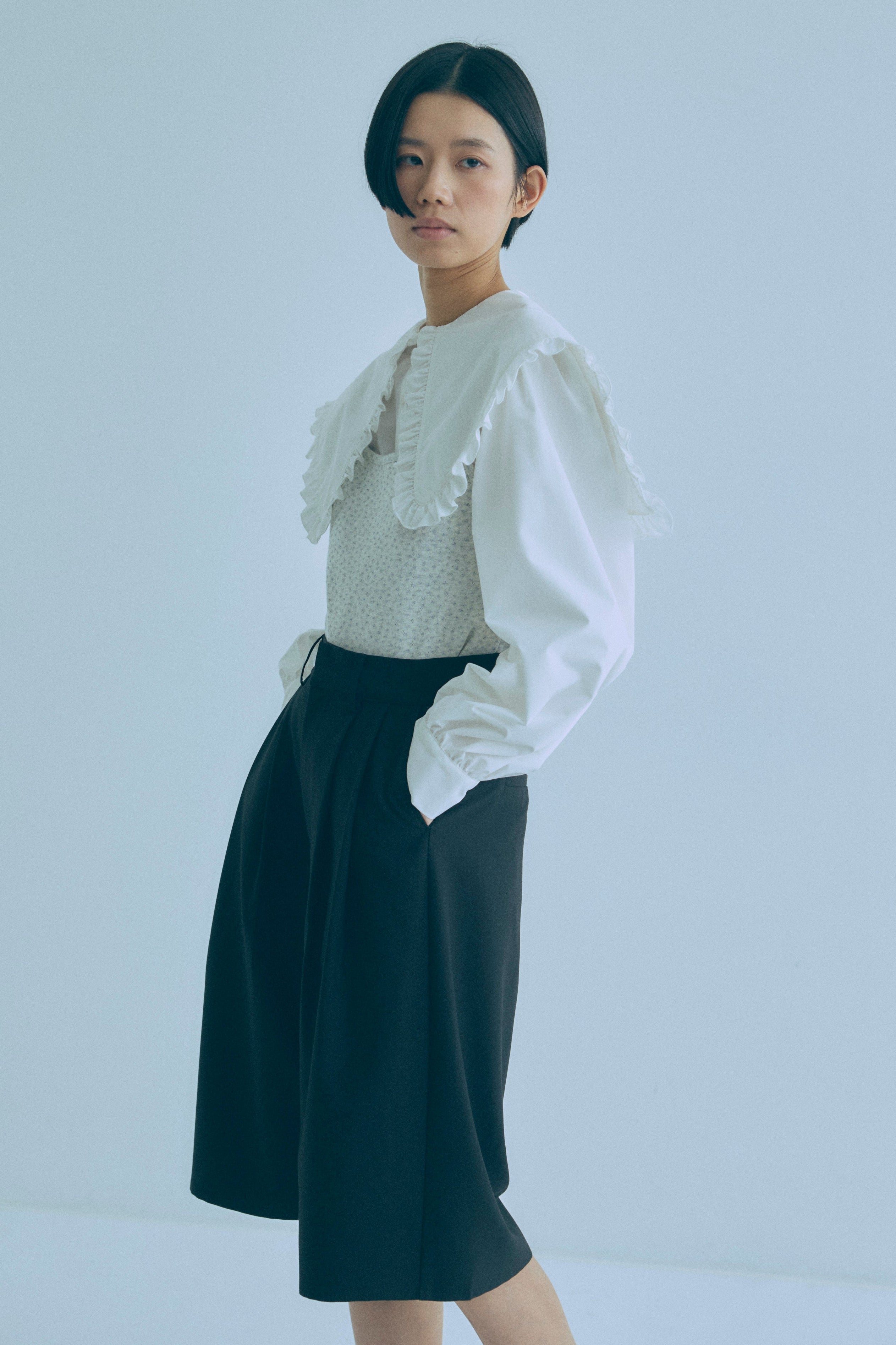 シンプルで抜け感のある、大人のハーフパンツ 【Material】 軽やかなタッチの素材を使用し、さらっとした肌触りが心地よい一本。ゆったりとしたシルエットで動きやすく、リラックス感のあるラクな穿き心地を叶えます。デイリーに取り入れやすい素材感です。 【Design】 膝が隠れるほどの丈感で、カジュアルになりすぎずバランス良く着用できるデザイン。腰まわりはすっきりと見える設計で、野暮ったさを感じさせません。フロントに施した2タックが立体感のあるシルエットを生み、裾に向かって自然に落ちるラインが脚をきれいに見せてくれます。長く愛用できるベーシックな一本です。 【Styling point】 オーバーサイズシャツを合わせたルーズなスタイリングはもちろん、コンパクトなトップスを合わせてすっきりまとめても好バランス。スウェットやロンTとも相性が良く、シーズンを問わず活躍する万能ハーフパンツです。