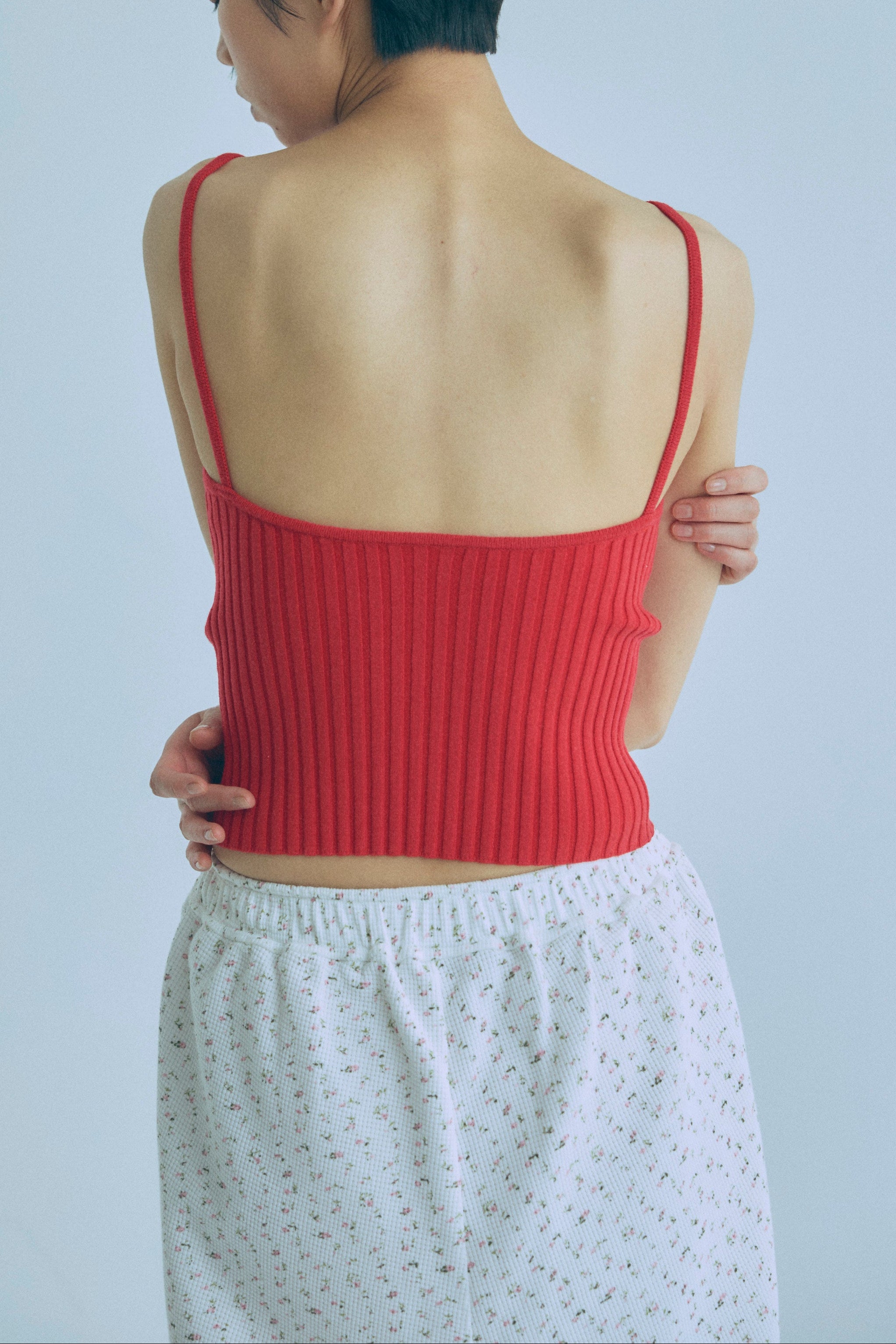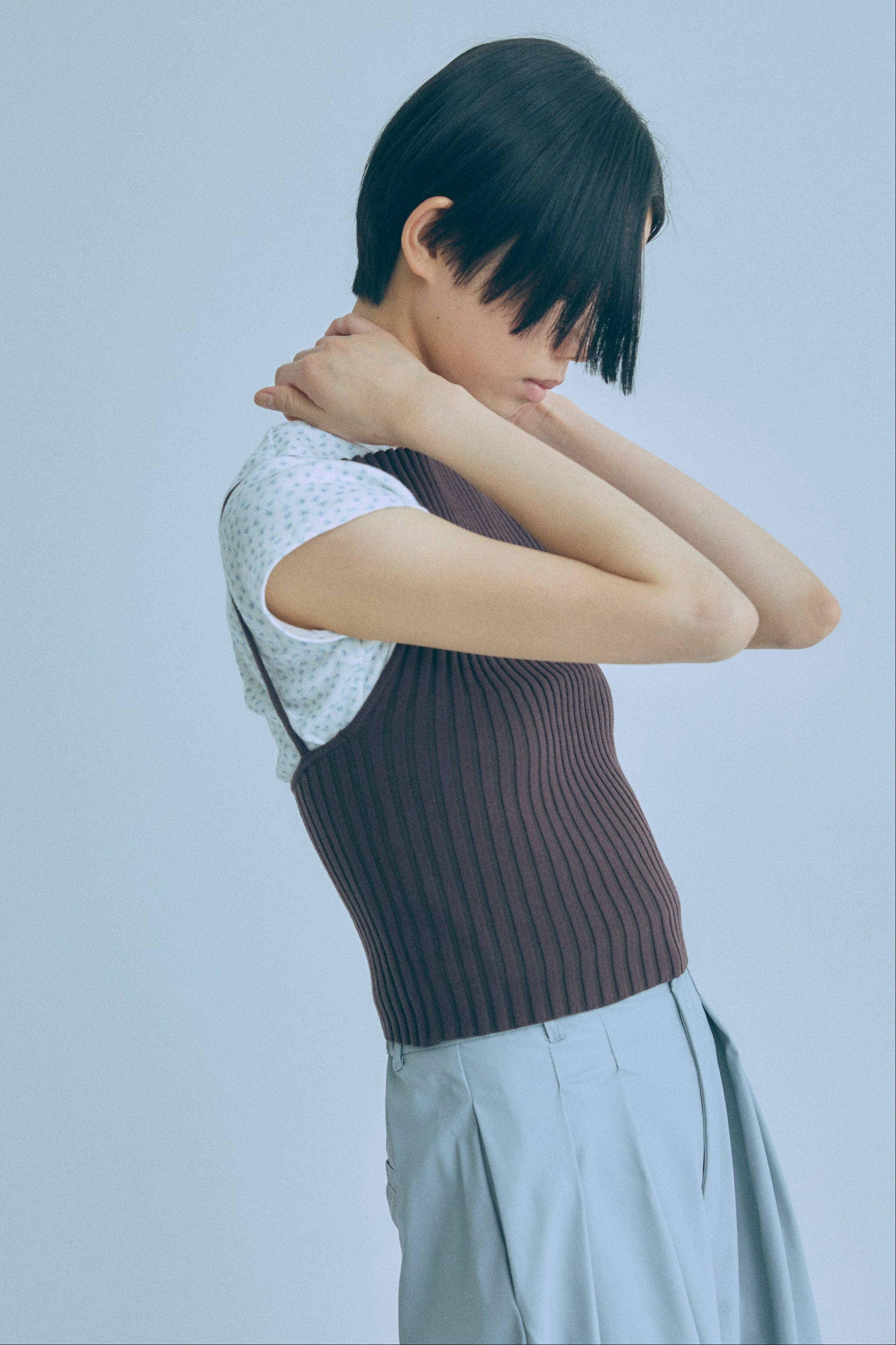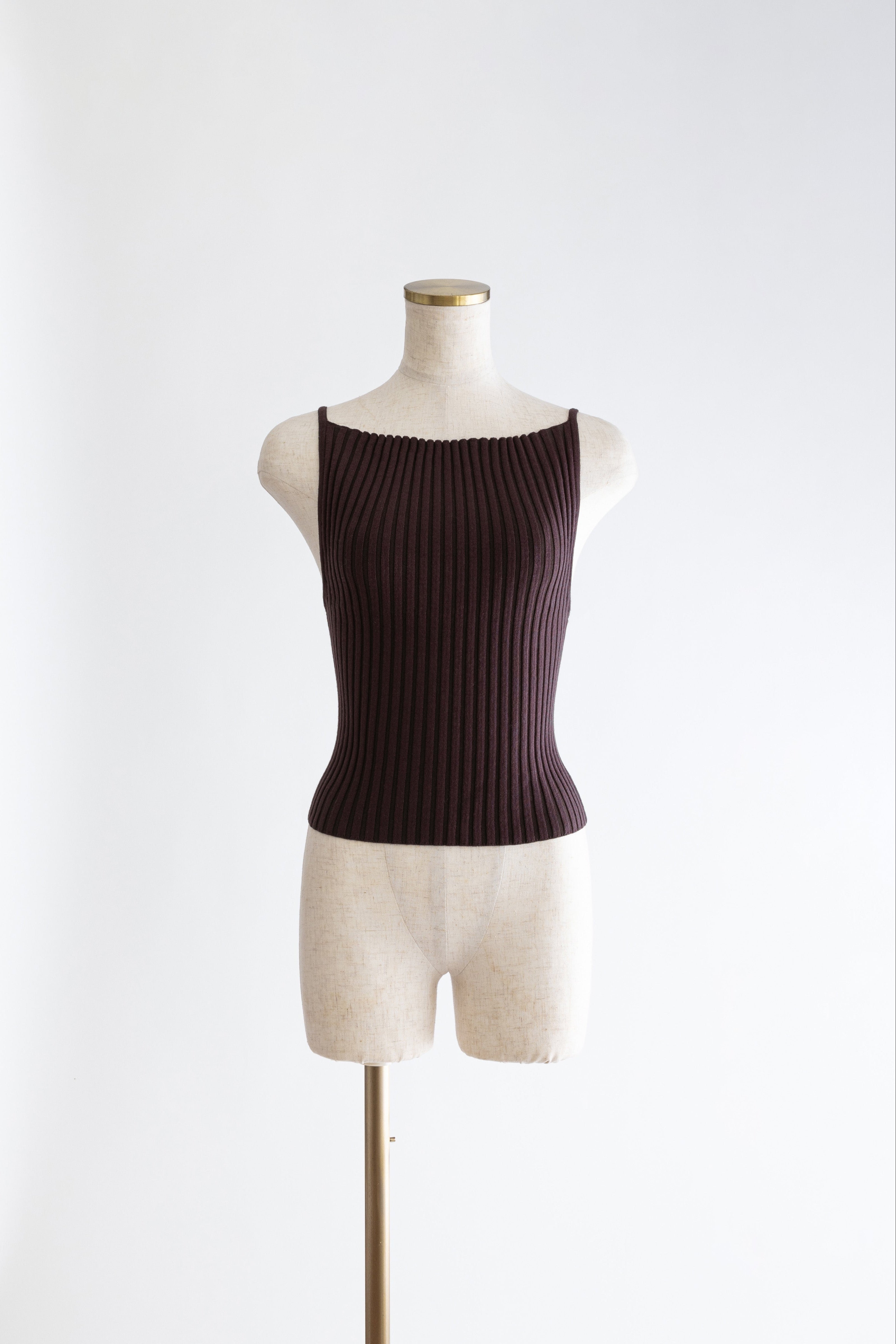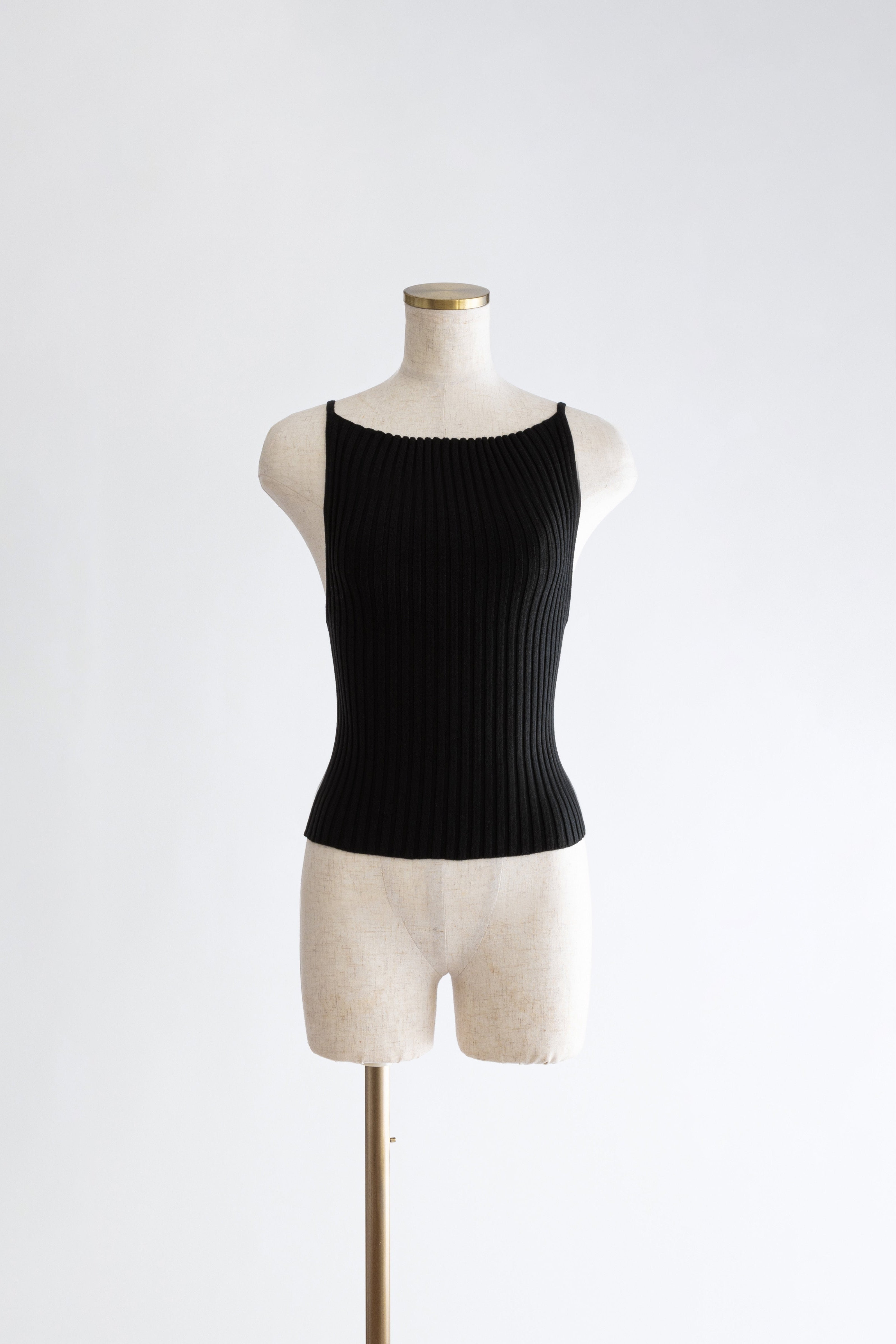 ボートネックが映える、華奢見えニットキャミ 【Material】 柔らかく伸びのあるリブニット素材を使用。体に心地よくフィットし、肌触りもやさしいため、長時間着用してもストレスを感じにくい着心地です。 【Design】 背中が大胆にあいたバックデザインがポイントで、さりげない女性らしい抜け感を演出。フロントはシンプルなボートネックにすることで、デコルテをすっきりと見せ、バランスの取れた印象に仕上げています。縦リブのラインが体のラインをきれいに見せ、華奢見えも叶える一枚。レイヤードにも活躍するデザインです。 【Styling point】 ボトムスを選ばず、幅広いスタイリングに対応。一枚で着るのはもちろん、シャツやカーディガンのインナーとして合わせれば、さりげなくデザイン性を効かせた着こなしが楽しめます。シーズンレスで活躍する万能ニットキャミです。