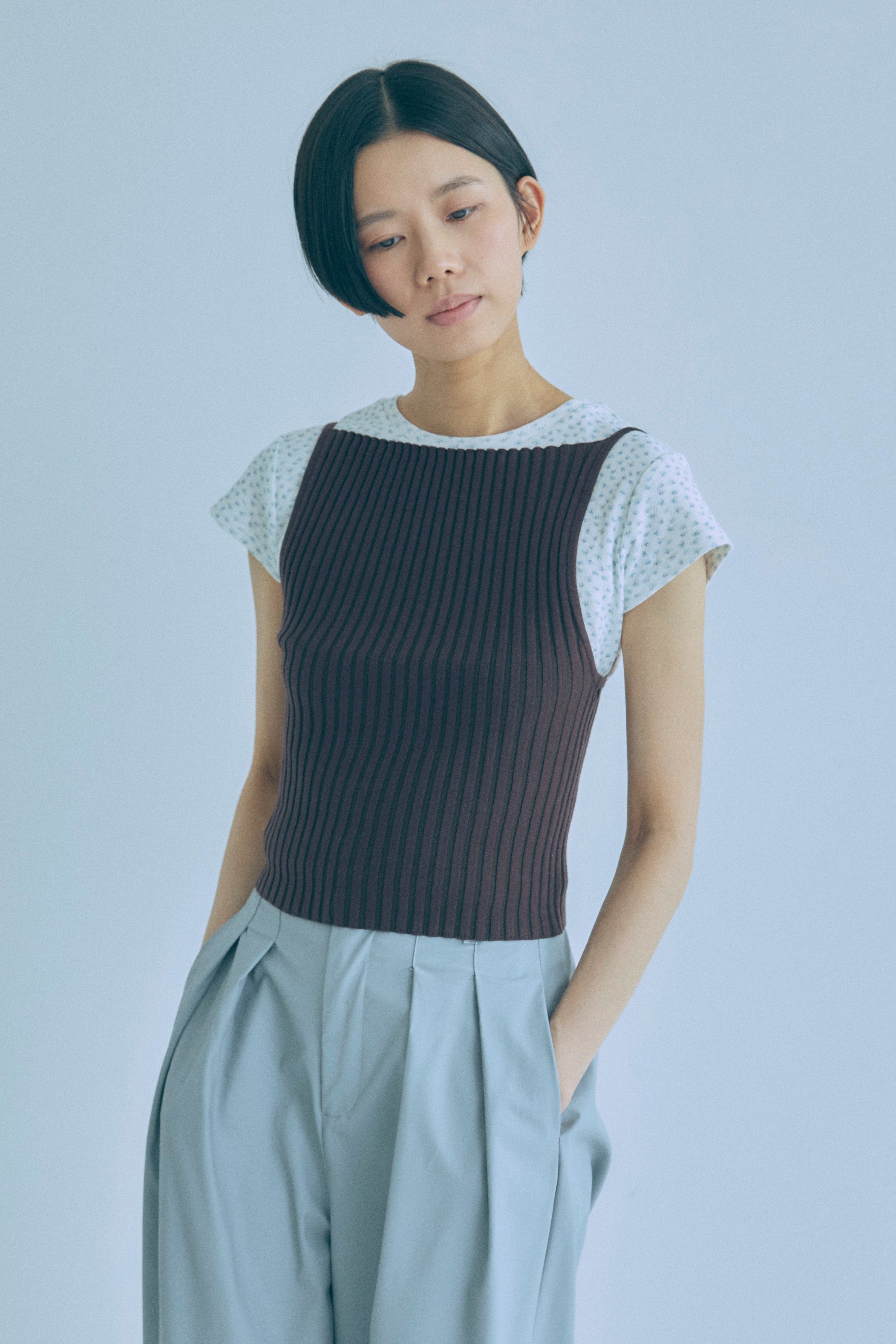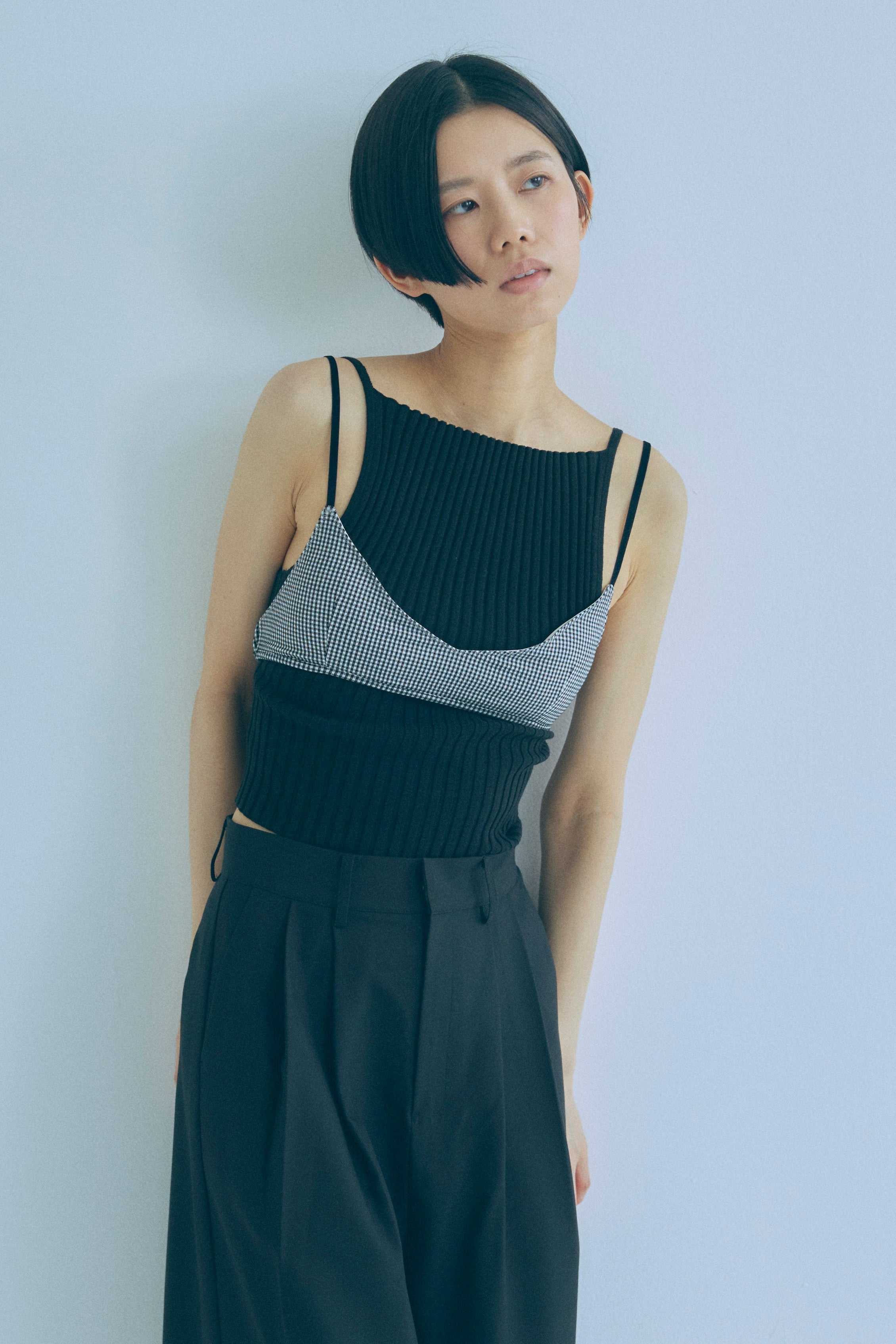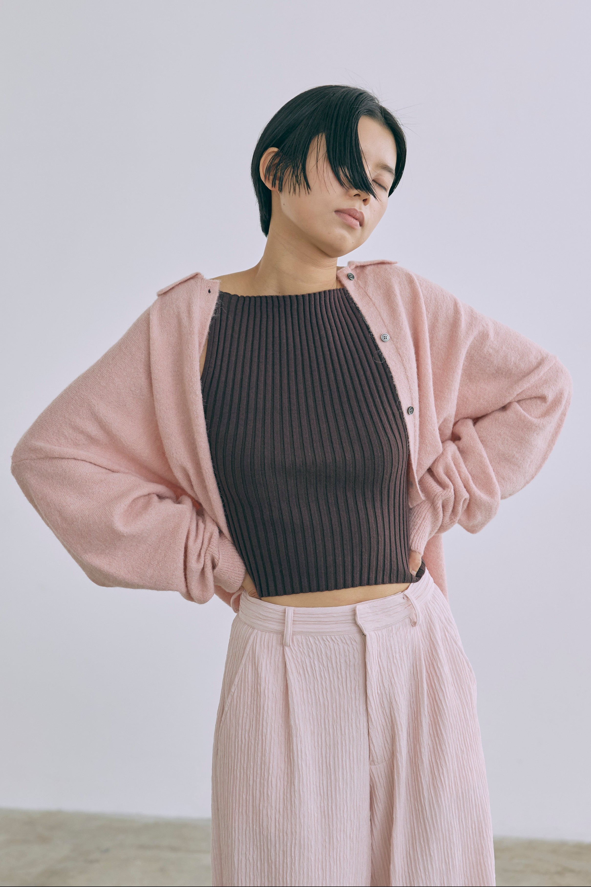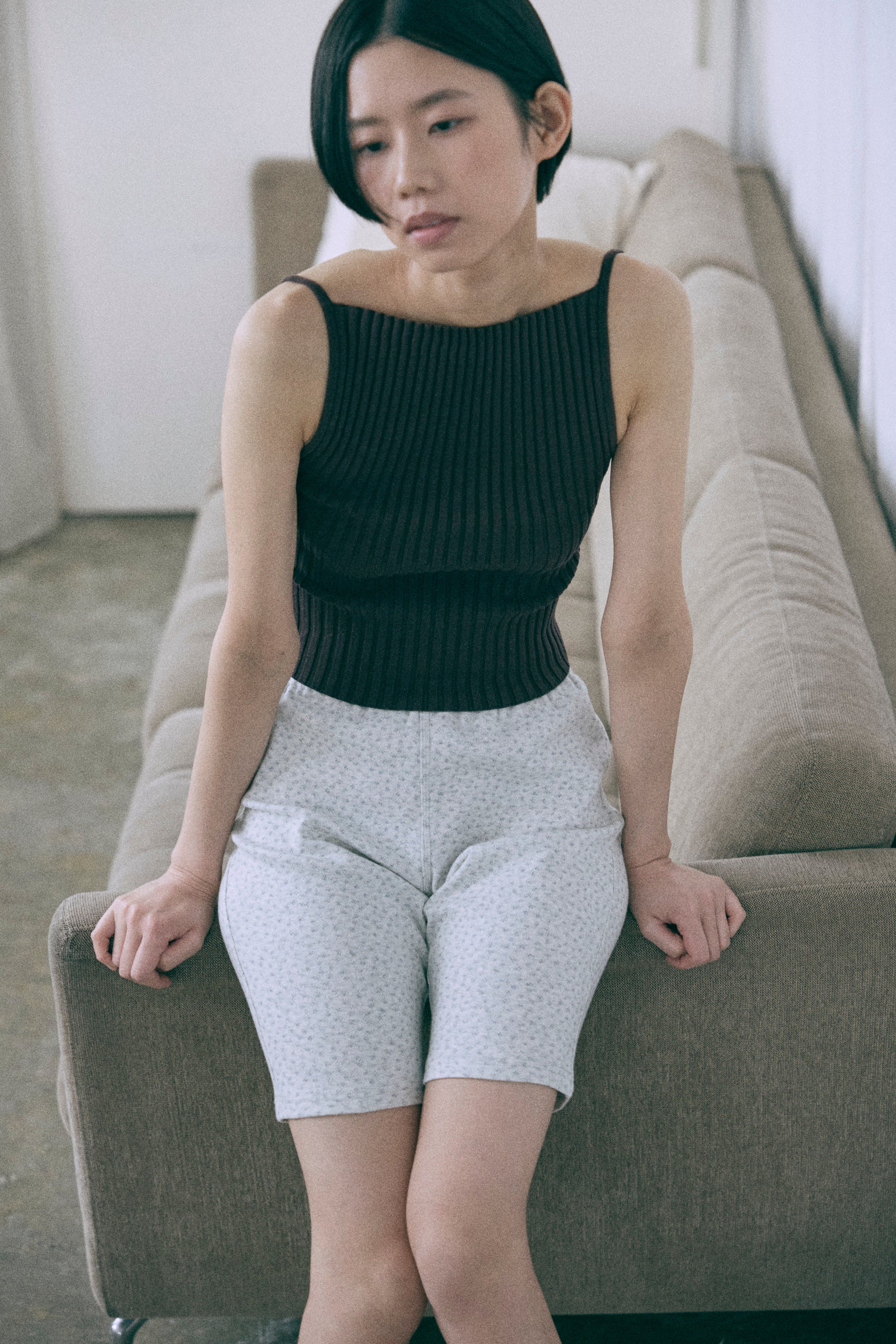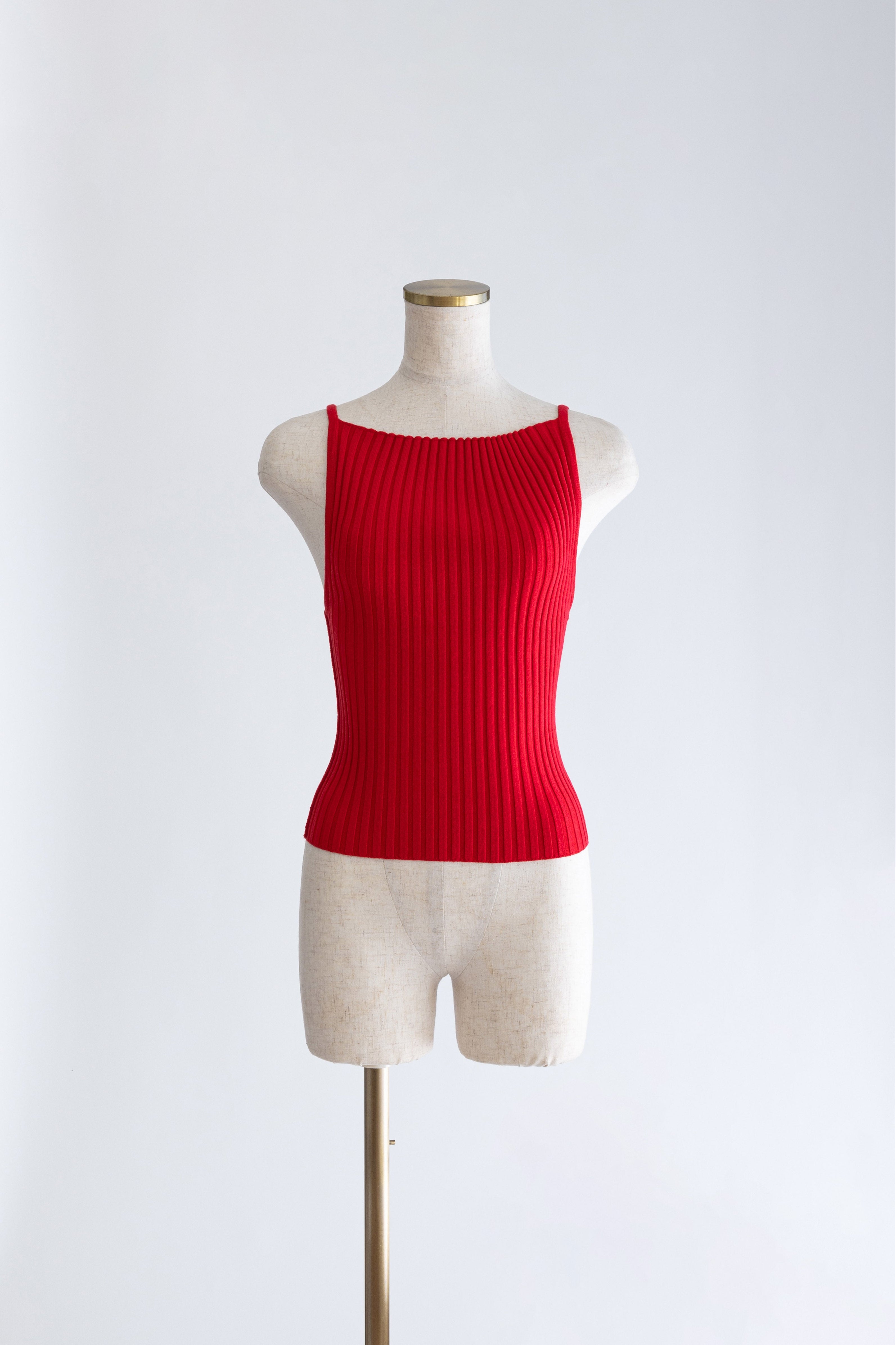 ボートネックが映える、華奢見えニットキャミ 【Material】 柔らかく伸びのあるリブニット素材を使用。体に心地よくフィットし、肌触りもやさしいため、長時間着用してもストレスを感じにくい着心地です。 【Design】 背中が大胆にあいたバックデザインがポイントで、さりげない女性らしい抜け感を演出。フロントはシンプルなボートネックにすることで、デコルテをすっきりと見せ、バランスの取れた印象に仕上げています。縦リブのラインが体のラインをきれいに見せ、華奢見えも叶える一枚。レイヤードにも活躍するデザインです。 【Styling point】 ボトムスを選ばず、幅広いスタイリングに対応。一枚で着るのはもちろん、シャツやカーディガンのインナーとして合わせれば、さりげなくデザイン性を効かせた着こなしが楽しめます。シーズンレスで活躍する万能ニットキャミです。