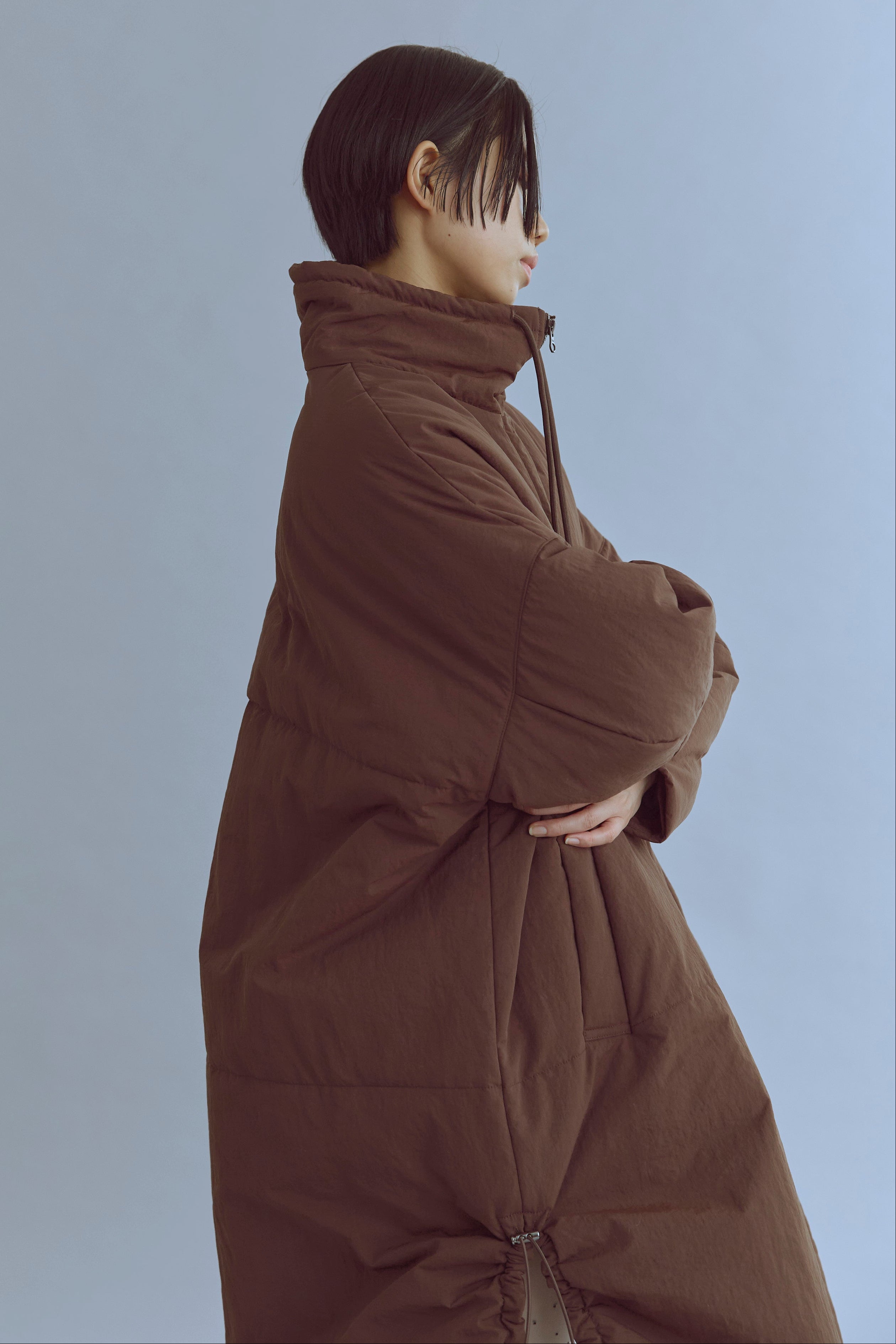 昨年大人気だったパテッドコートがリニューアル!包まれるような温もりと丸みのあるシルエットが魅力の大人のパテッドコート 【Material】 マットな質感のナイロン素材を使用し、程よい分量で中綿を入れることで着膨れしにくい仕上がりに。高い保温性があり、しっかりとした着丈で真冬の寒さにも対応します。 シレ―加工を施した生地にアップデートし、より密度を高くすることで使用に伴う中綿の飛び出しなどを改善しました。 【Design】 落ち着いたカラーに新色のブルーを追加。また身長や体型によりフィットするように、サイズ展開を増やしました。 こだわりのディテールでシックで上品な印象に仕上げました。ダブルジップ仕様も開閉しやすいようにファスナーの長さを変更。開閉の調整でフロントスタイルの変化も楽しめます。また、裾サイドのドロストを絞ることでシルエットが大きく変わり、その日の気分に合わせたアレンジも可能です。 【Styling point】 フロントを閉めた状態でダブルジップの下部分を少し開け、ロングブーツと合わせたスタイルもおすすめです。 スタッフ一押しは、サイドのドロストをしっかり絞って丸みのあるシルエットを楽しむ着こなし。このコートの最大の可愛さを引き出すポイントです。