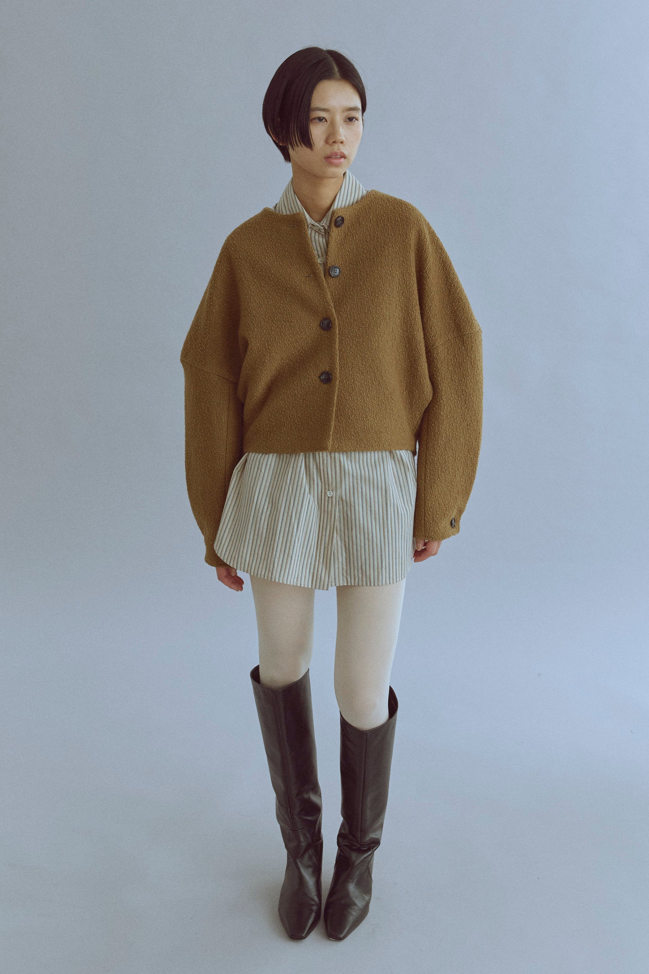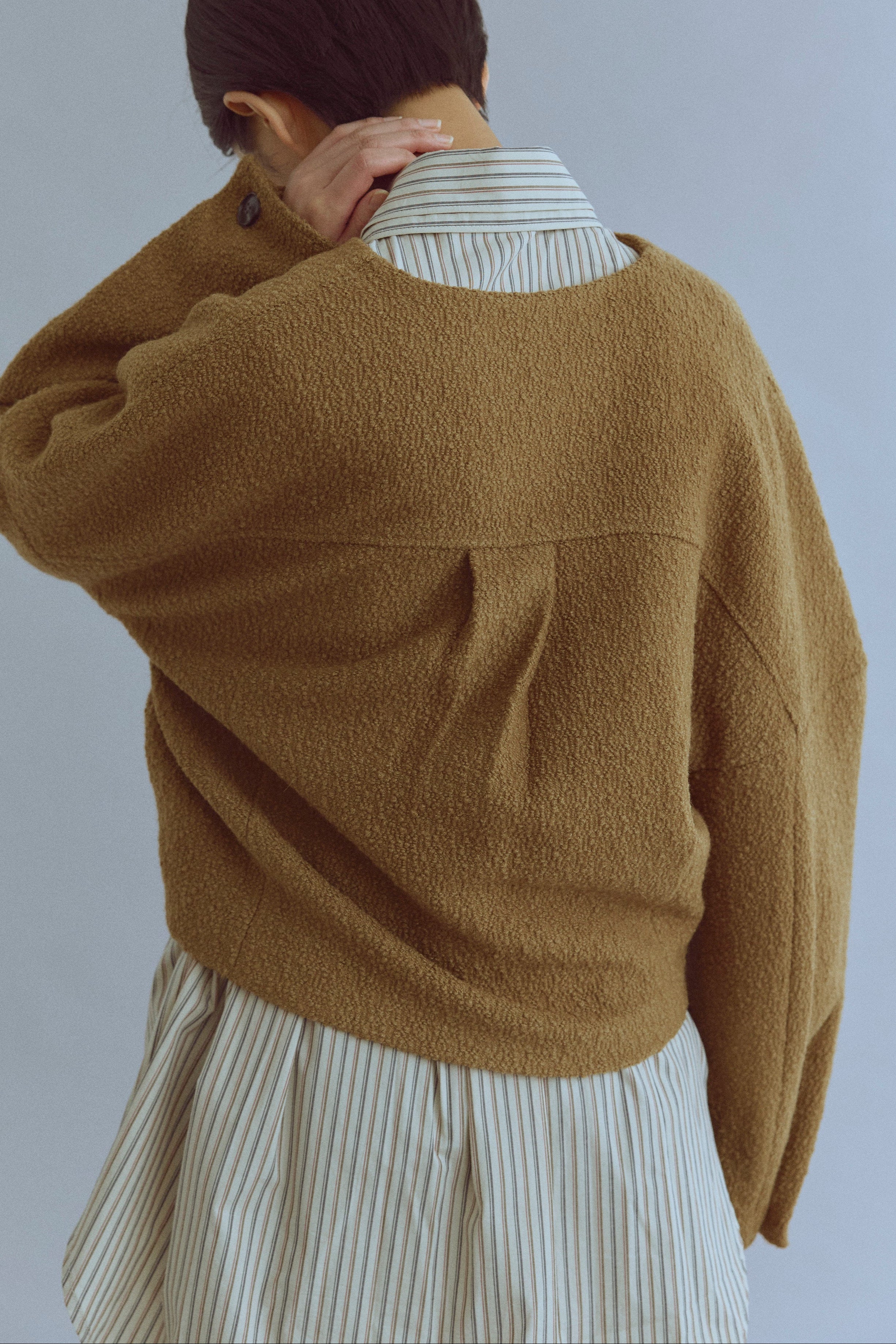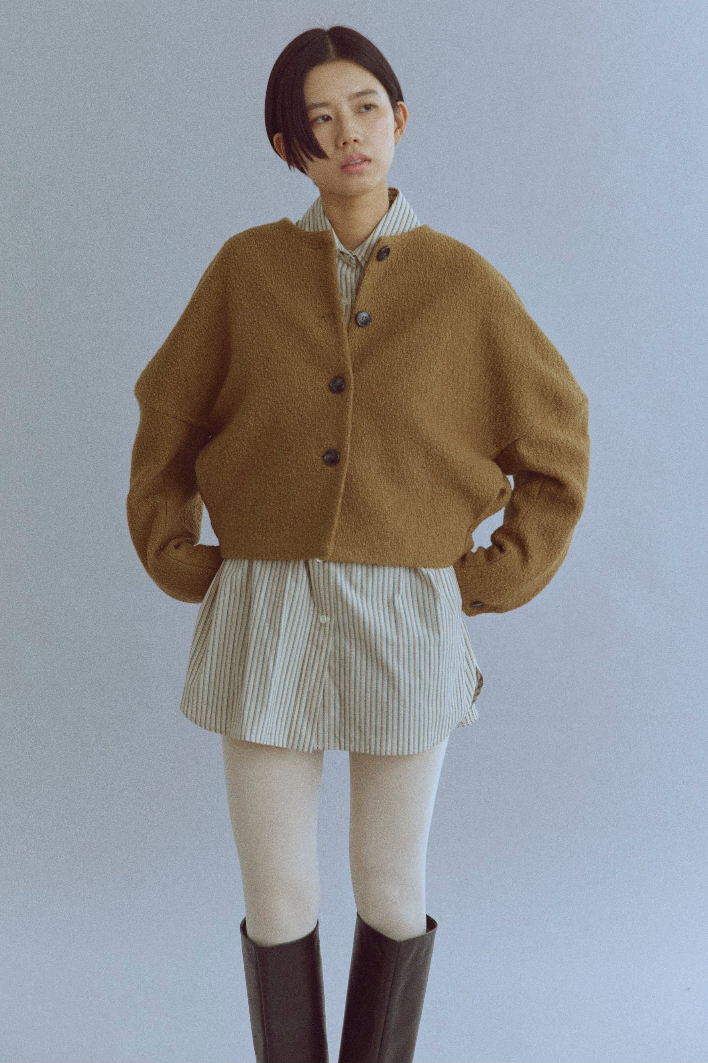 丸みのあるシルエットが魅力な、ブークレウールのコクーンジャケット 【Material】 表面に立体感のあるブークレウール素材を使用。 見た目にも温かみがあり、羽織るだけで優しい印象にしてくれます。表情豊かな素材感が、スタイリングに奥行きをプラスしてくれるのもポイント。 【Design】 肩のラインを落としたコクーンシルエットが特徴◎ ふんわりと丸みを帯びたフォルムが、女性らしい柔らかさをプラスしてくれます。程よいゆとりがあるので、体型を選ばず着ていただけます。 【Styling point】 セットアップで着用していただきたいアイテム◎ ブーツ合わせだと、季節感や特別感を高めてくれます。単品使いもできるので、使い勝手の良さが魅力です。 ◇同素材で下記ご用意しております。 Boucle Cocoon Skirt(品番:94021)
