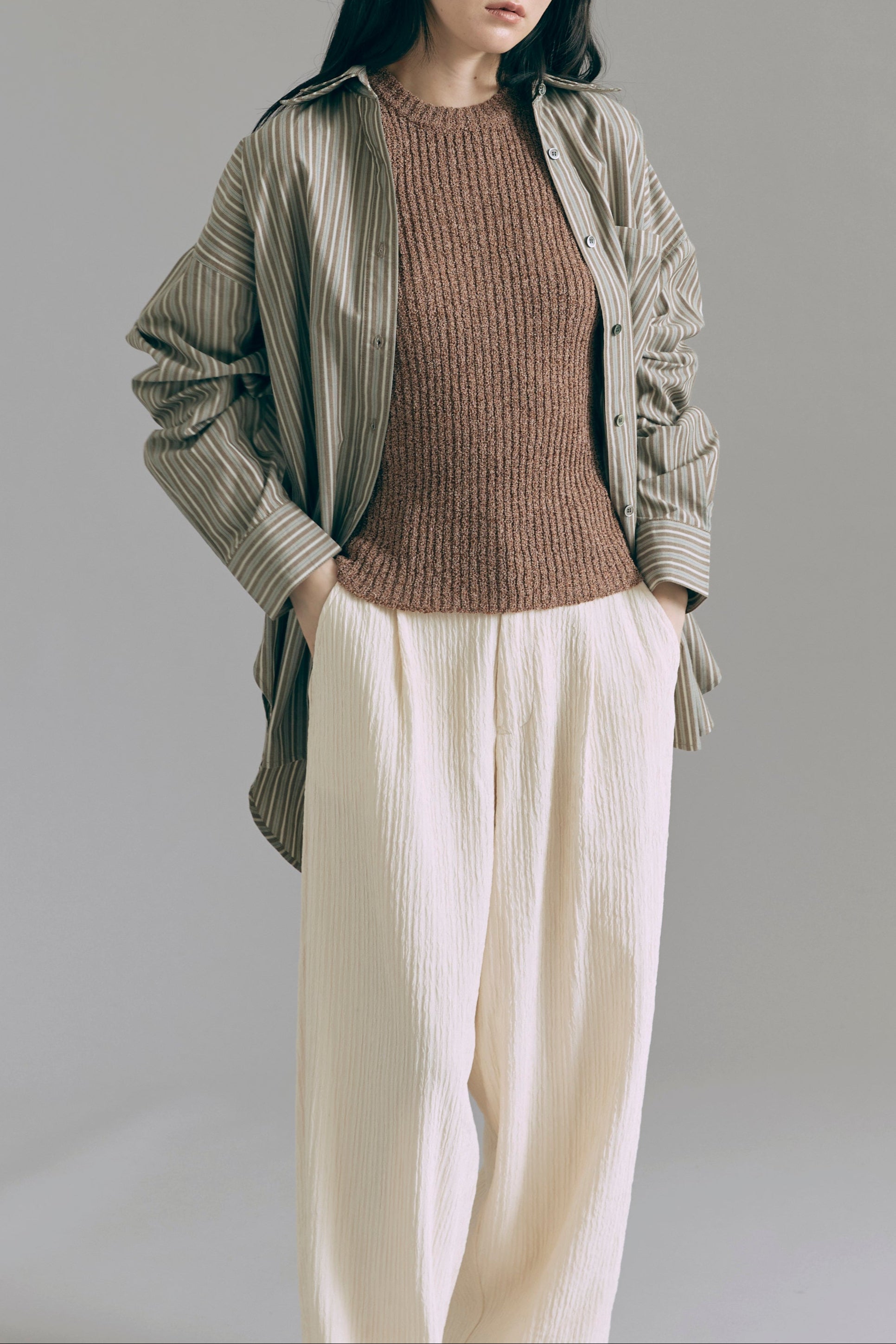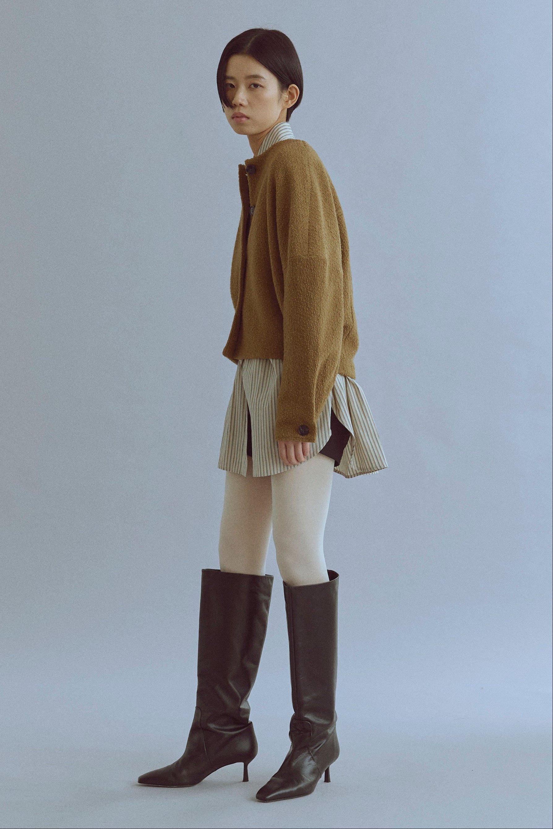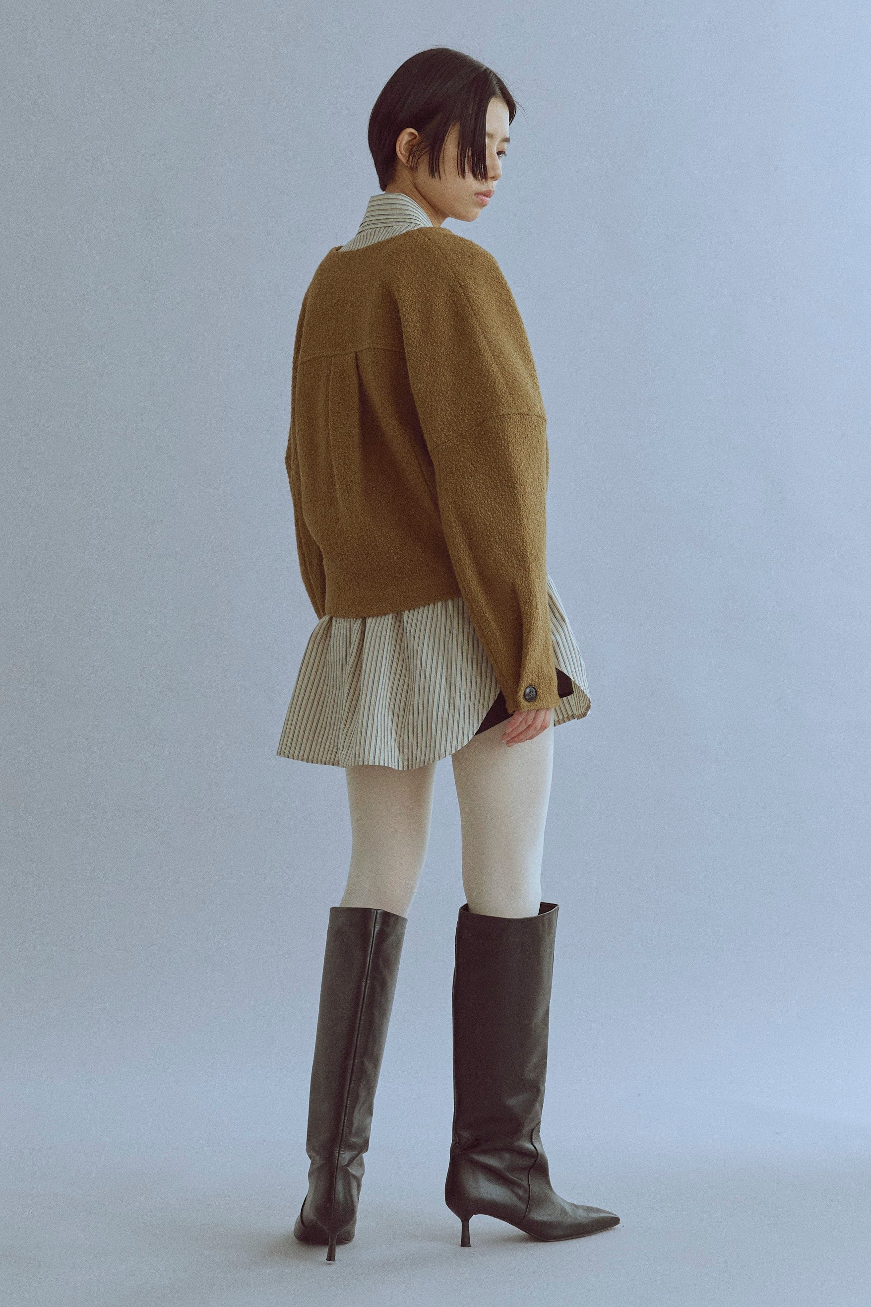 丸みのあるシルエットが魅力な、ブークレウールのコクーンジャケット 【Material】 表面に立体感のあるブークレウール素材を使用。 見た目にも温かみがあり、羽織るだけで優しい印象にしてくれます。表情豊かな素材感が、スタイリングに奥行きをプラスしてくれるのもポイント。 【Design】 肩のラインを落としたコクーンシルエットが特徴◎ ふんわりと丸みを帯びたフォルムが、女性らしい柔らかさをプラスしてくれます。程よいゆとりがあるので、体型を選ばず着ていただけます。 【Styling point】 セットアップで着用していただきたいアイテム◎ ブーツ合わせだと、季節感や特別感を高めてくれます。単品使いもできるので、使い勝手の良さが魅力です。 ◇同素材で下記ご用意しております。 Boucle Cocoon Skirt(品番:94021)