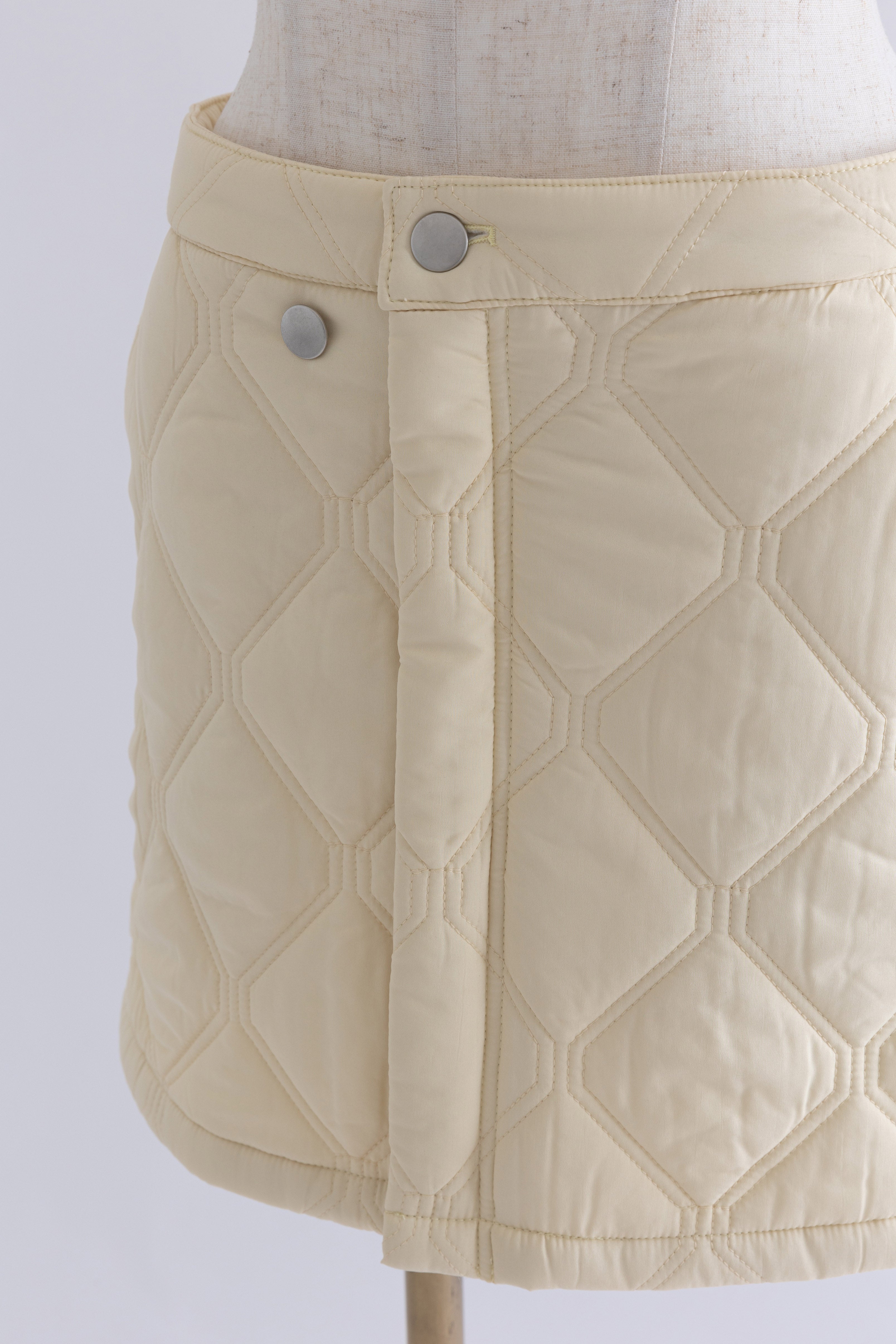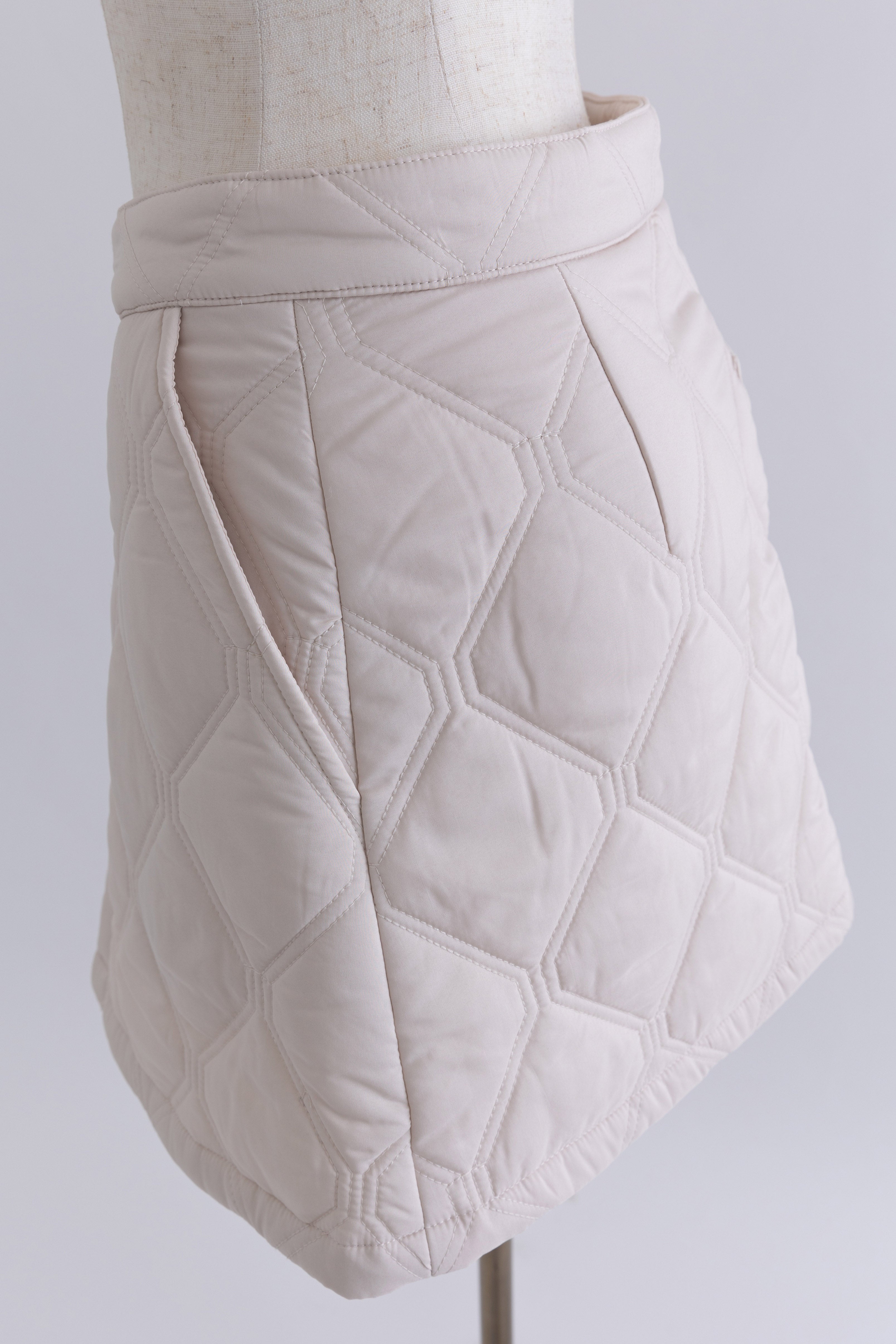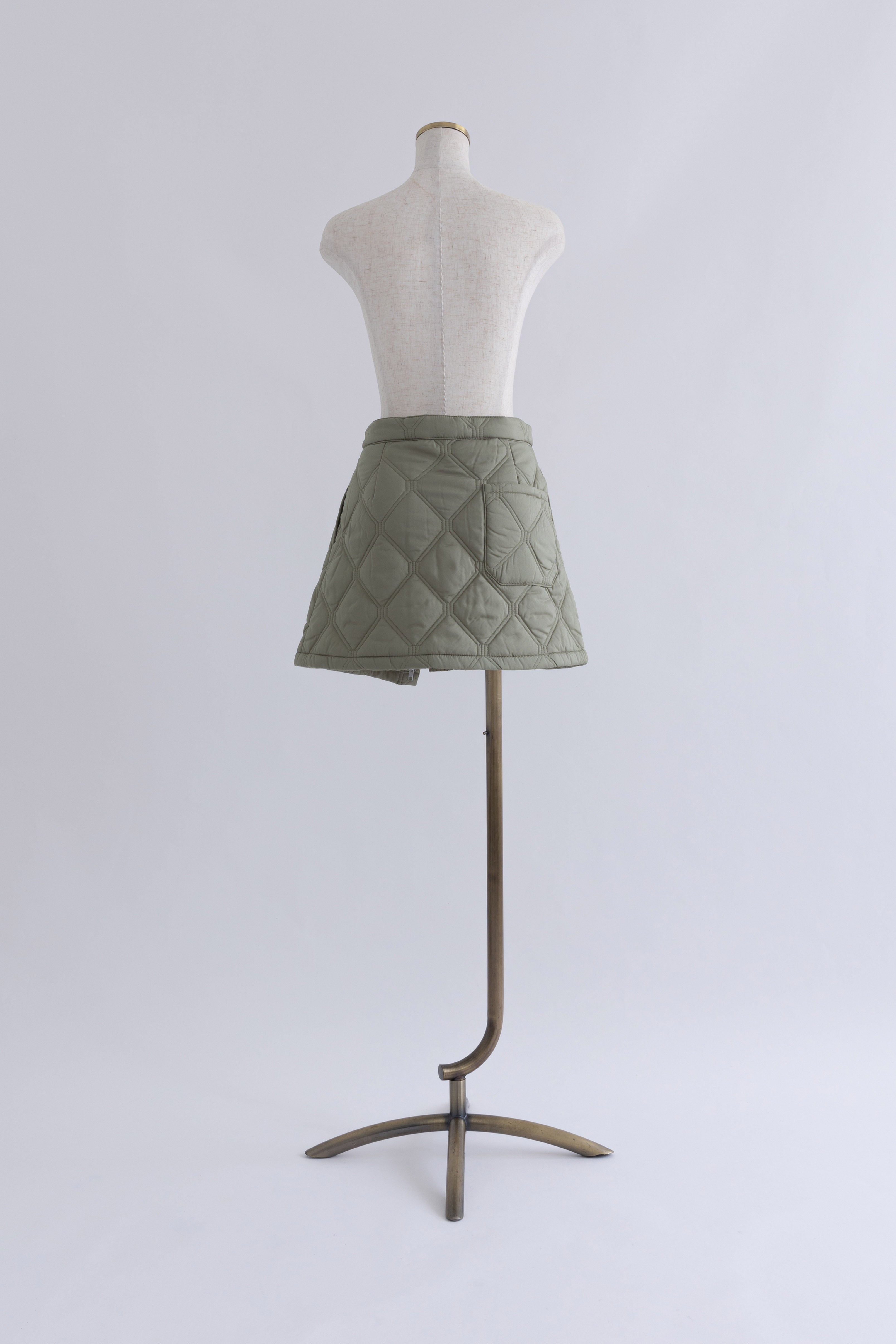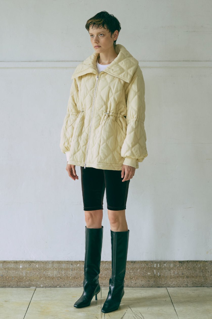 オリジナルのキルトデザインとビッグカラーがポイントのキルティングジャケット 【Material】 ふわふわと軽く、暖かい中綿素材を使用しています。 【Design】 シンプルながらも他にはない、すっきりとしたオリジナルのキルトデザインが魅力です。最大の特徴は、ウエスト部分のドロストを絞ることで、メリハリのあるシルエットを作り出せる点です。大きな襟とお袖のデザインも印象的で、スタイリングにアクセントを加えます。 【Styling point】 ボリューム感のあるアウターなので、すっきりとしたボトムスとのコーディネートがおすすめです。ウエストのドロストを調整して、気分やスタイリングに合わせたシルエットをお楽しみください。 ◇同素材で下記ご用意しております。 Quilting Muffler(品番:97010) 2Way Quilted Wrap Mini Skirt(品番:94012)