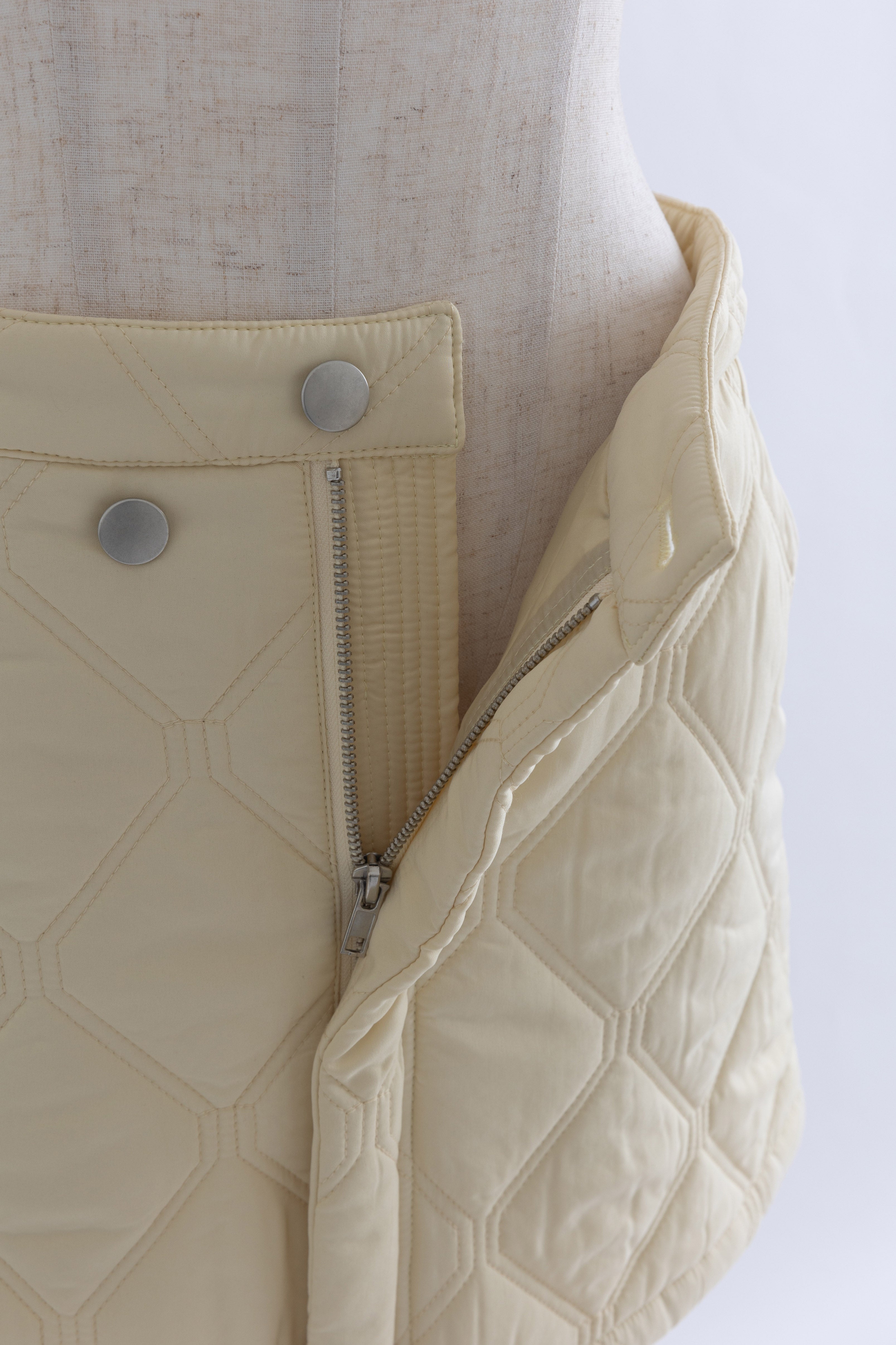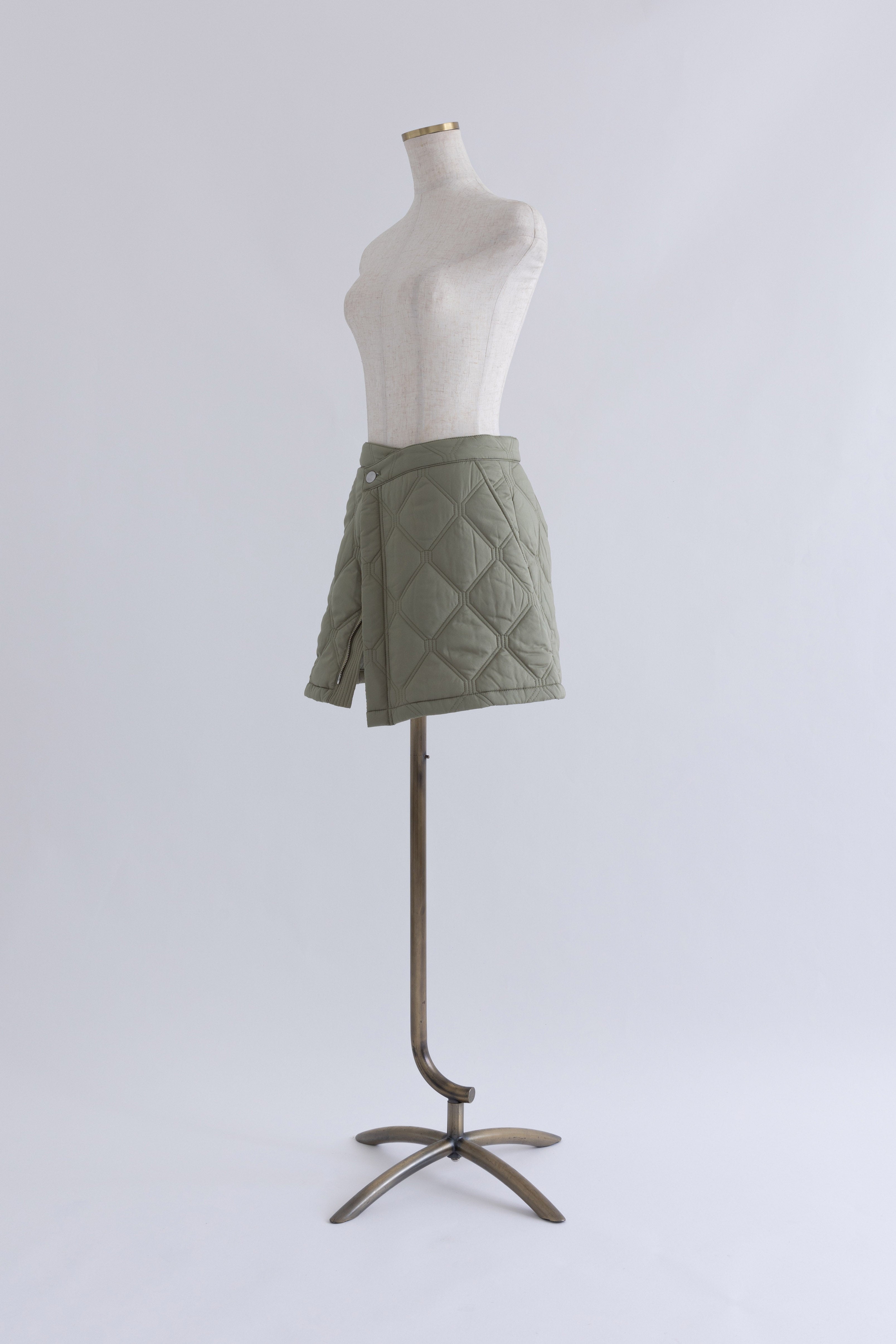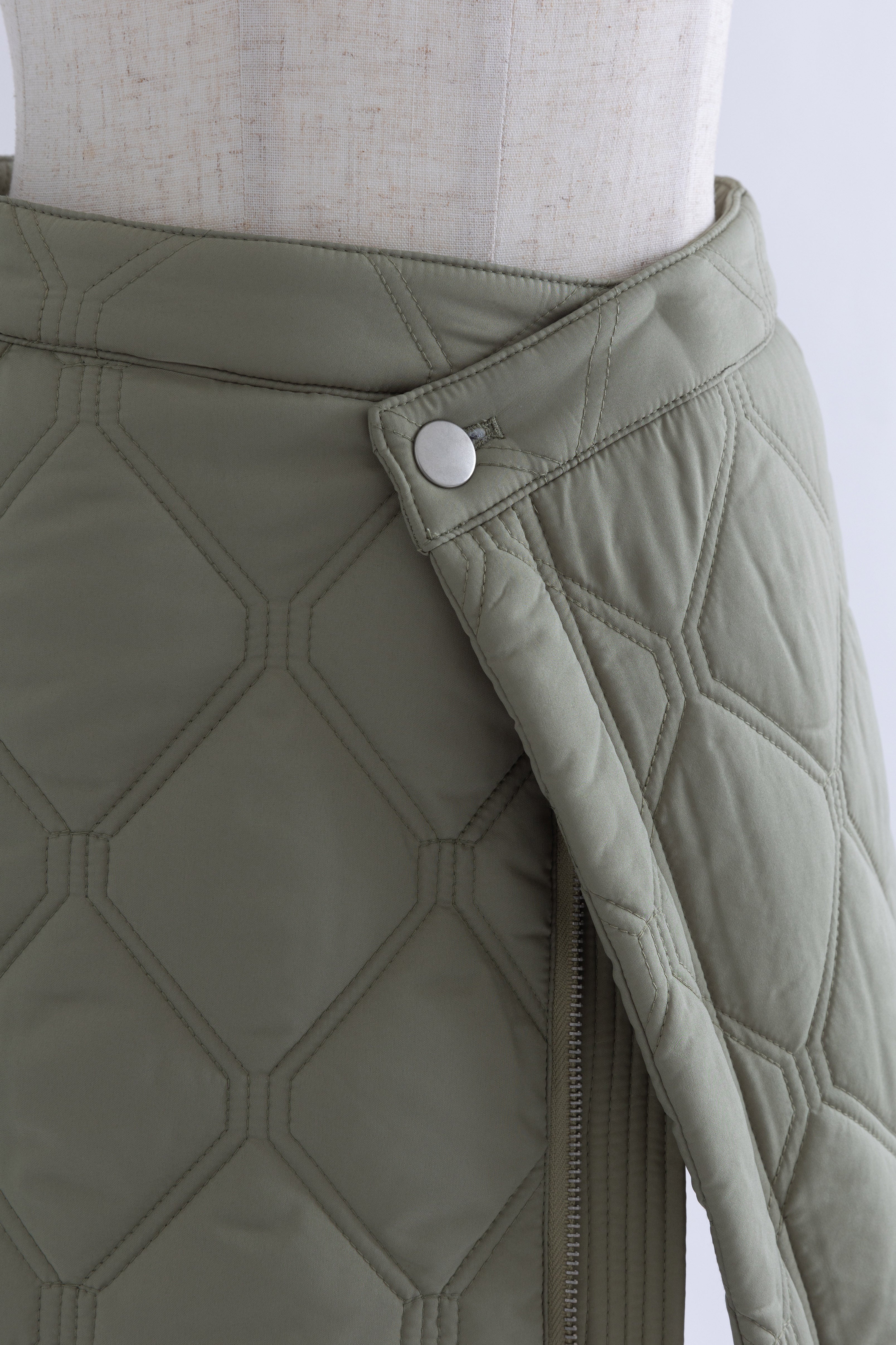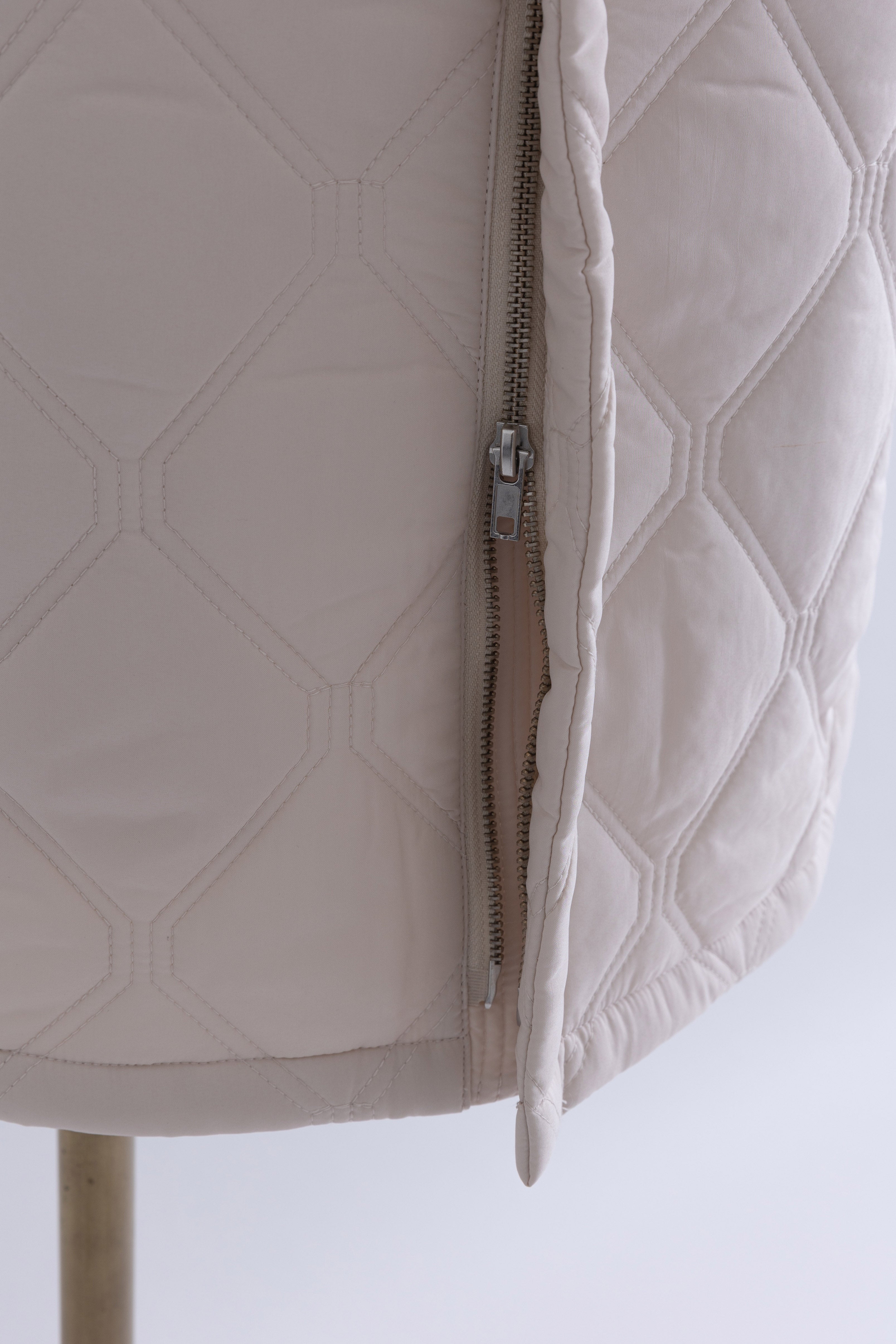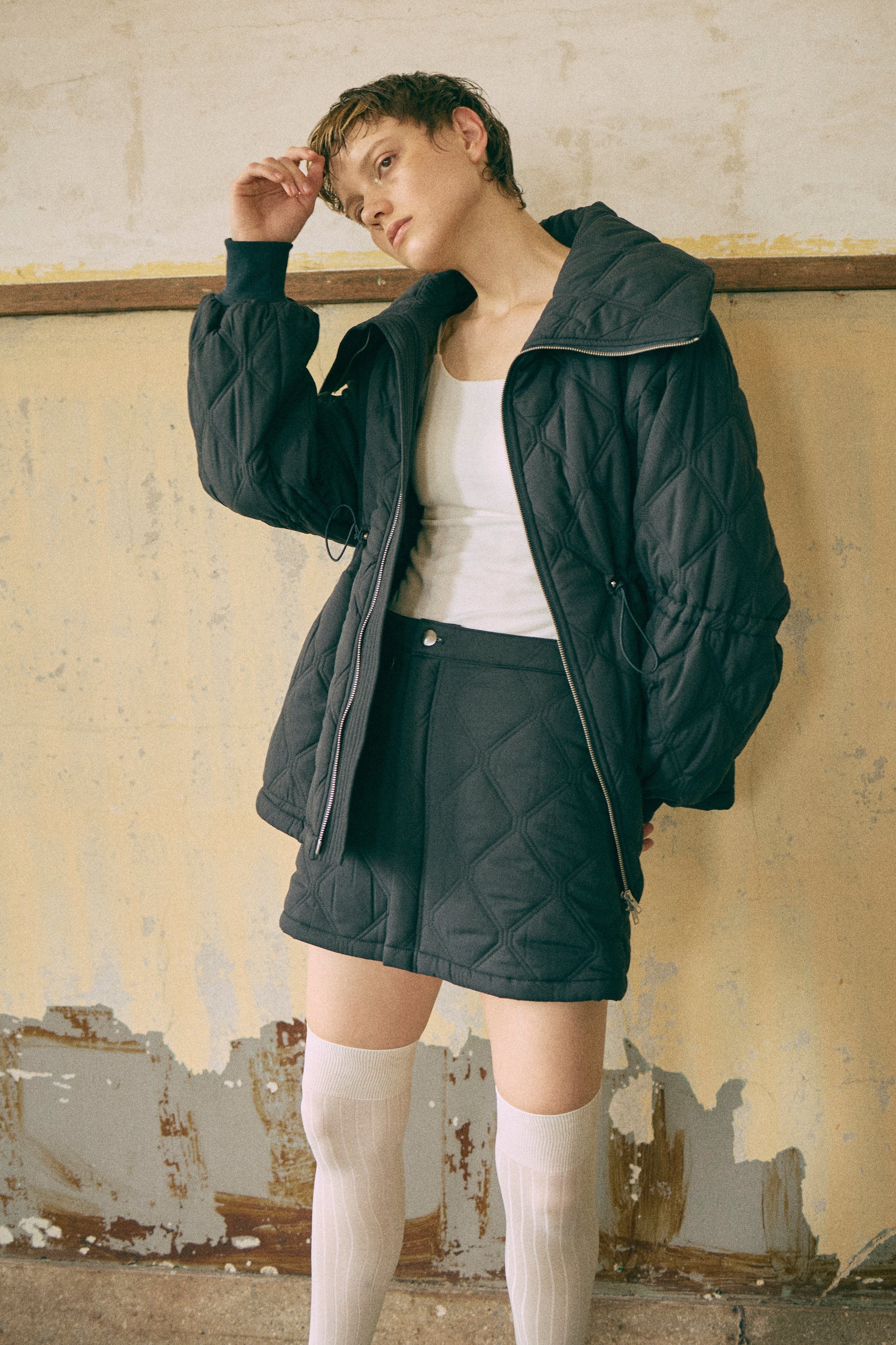 オリジナルのキルトデザインとビッグカラーがポイントのキルティングジャケット 【Material】 ふわふわと軽く、暖かい中綿素材を使用しています。 【Design】 シンプルながらも他にはない、すっきりとしたオリジナルのキルトデザインが魅力です。最大の特徴は、ウエスト部分のドロストを絞ることで、メリハリのあるシルエットを作り出せる点です。大きな襟とお袖のデザインも印象的で、スタイリングにアクセントを加えます。 【Styling point】 ボリューム感のあるアウターなので、すっきりとしたボトムスとのコーディネートがおすすめです。ウエストのドロストを調整して、気分やスタイリングに合わせたシルエットをお楽しみください。 ◇同素材で下記ご用意しております。 Quilting Muffler(品番:97010) 2Way Quilted Wrap Mini Skirt(品番:94012)