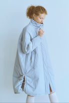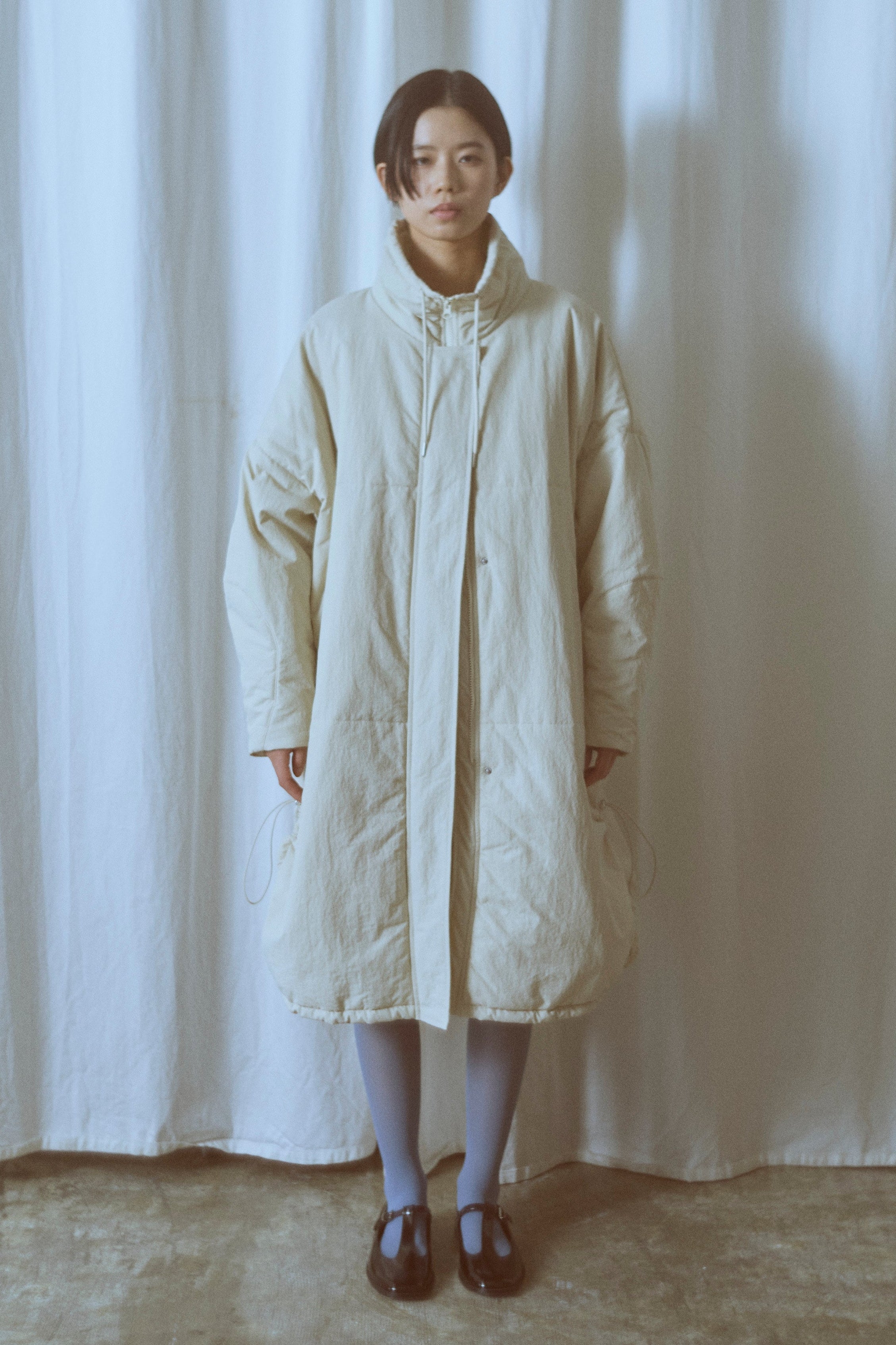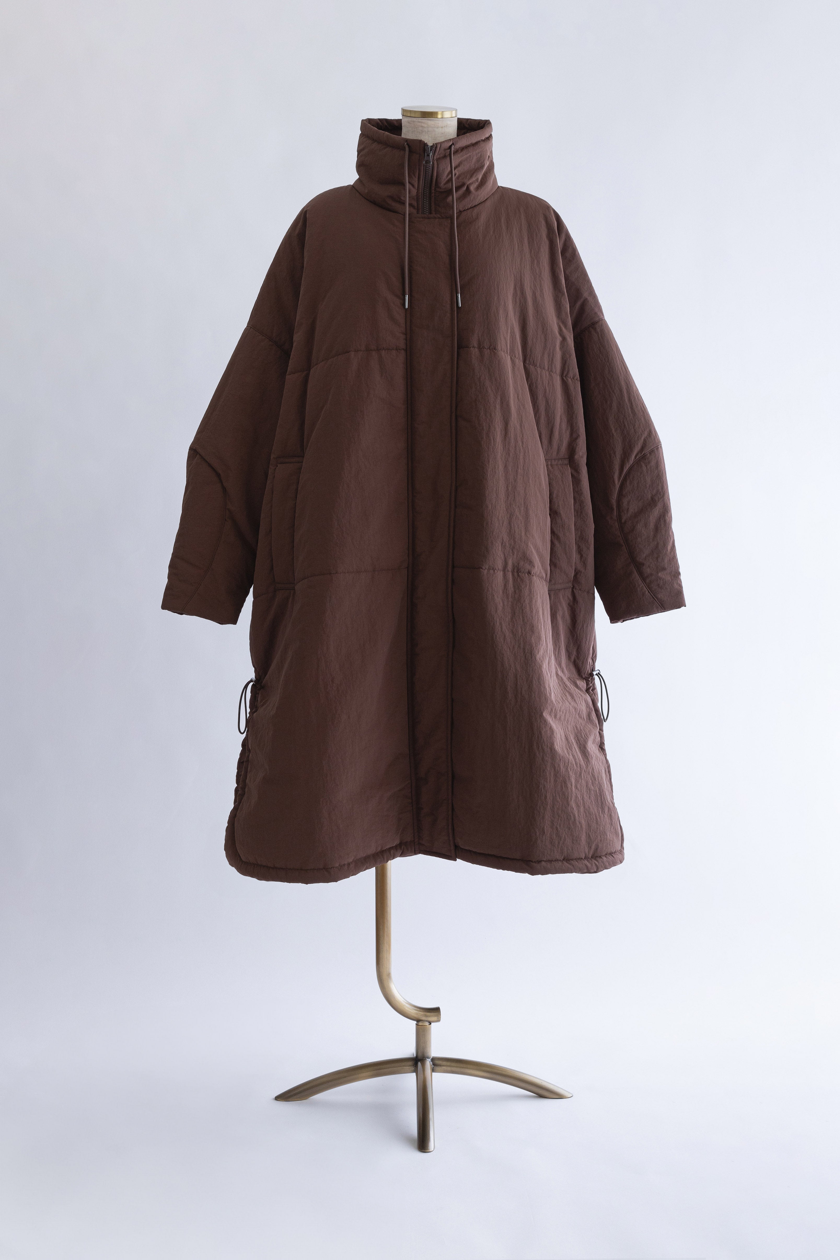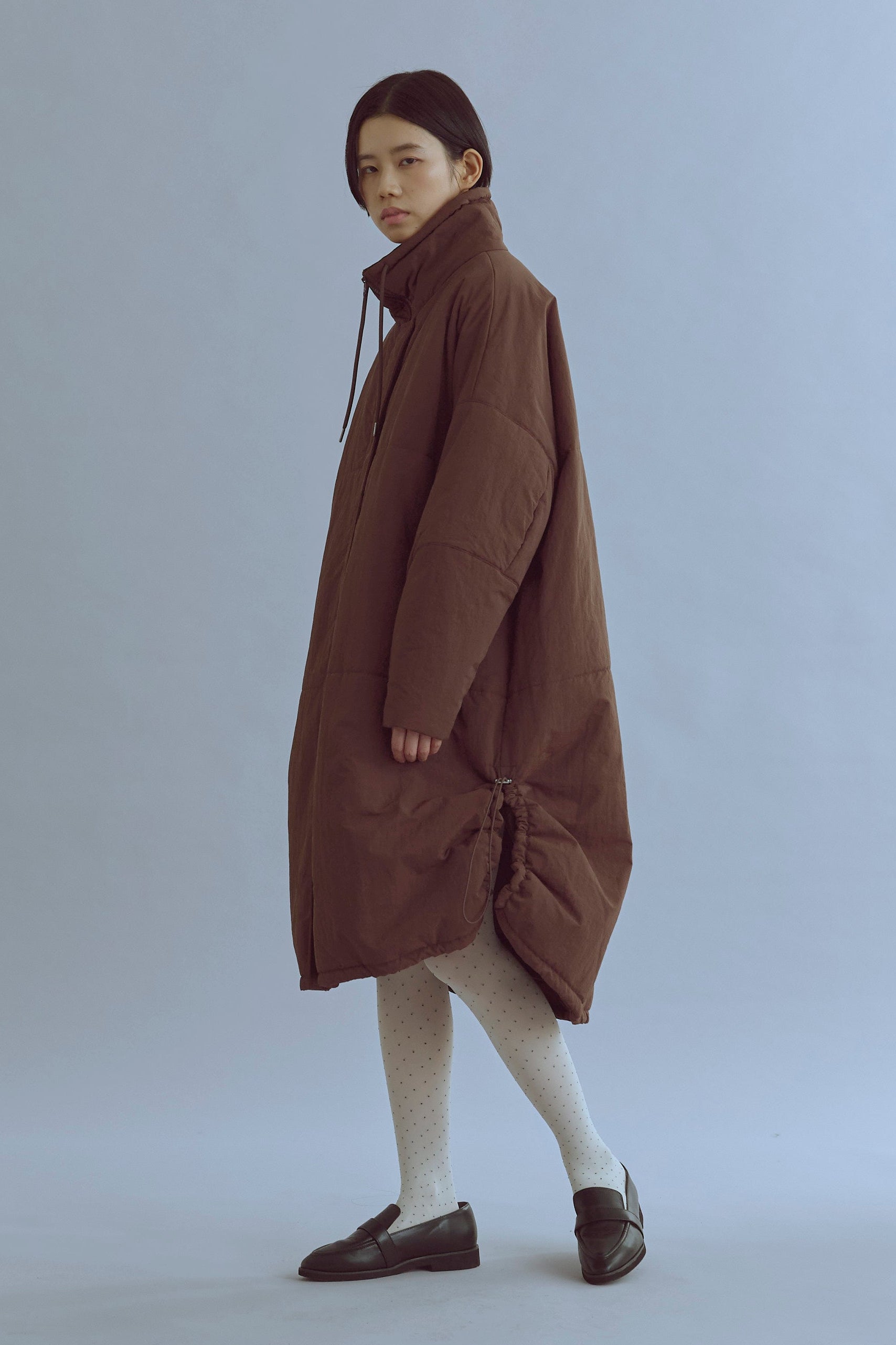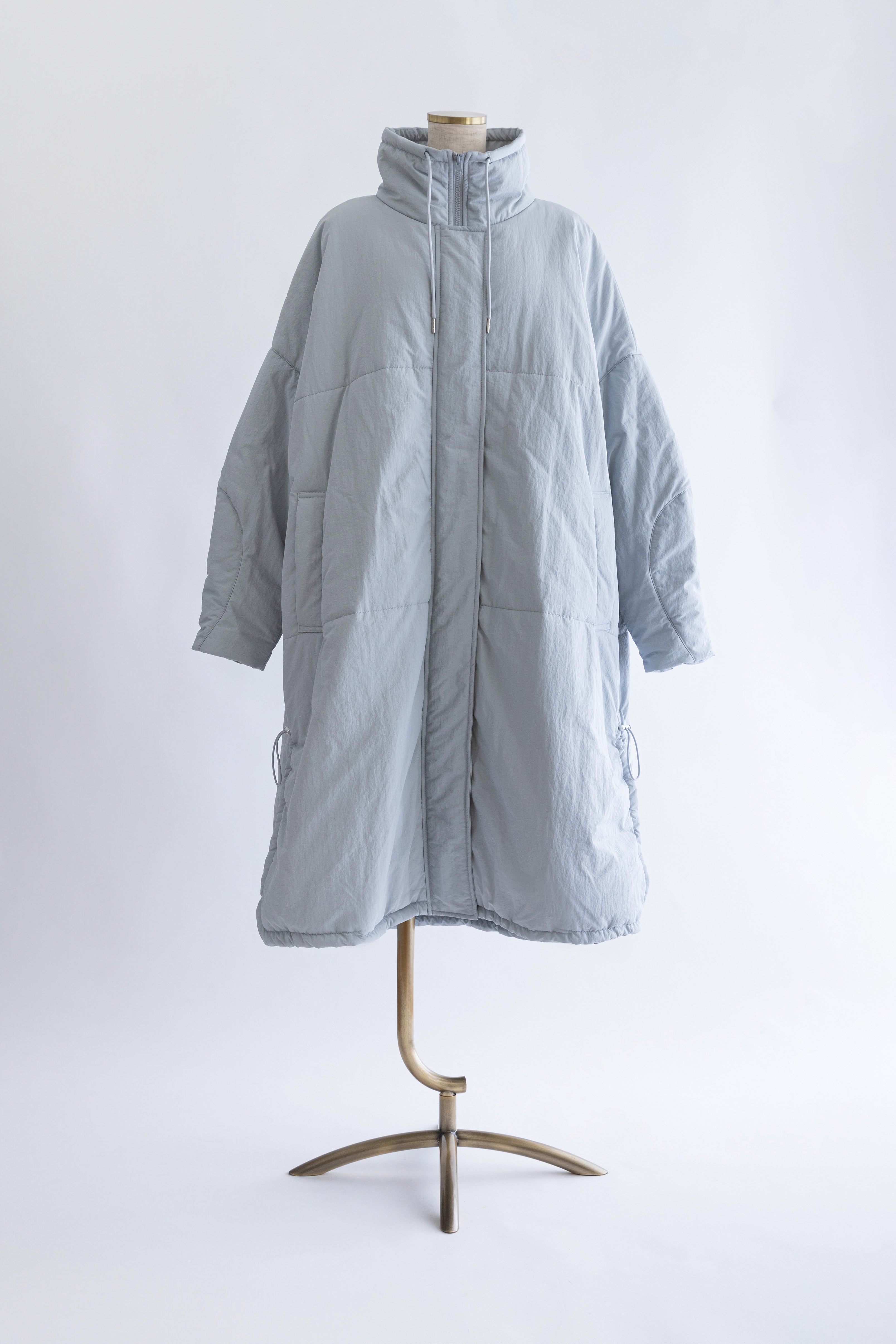 昨年大人気だったパテッドコートがリニューアル!包まれるような温もりと丸みのあるシルエットが魅力の大人のパテッドコート 【Material】 マットな質感のナイロン素材を使用し、程よい分量で中綿を入れることで着膨れしにくい仕上がりに。高い保温性があり、しっかりとした着丈で真冬の寒さにも対応します。 シレ―加工を施した生地にアップデートし、より密度を高くすることで使用に伴う中綿の飛び出しなどを改善しました。 【Design】 落ち着いたカラーに新色のブルーを追加。また身長や体型によりフィットするように、サイズ展開を増やしました。 こだわりのディテールでシックで上品な印象に仕上げました。ダブルジップ仕様も開閉しやすいようにファスナーの長さを変更。開閉の調整でフロントスタイルの変化も楽しめます。また、裾サイドのドロストを絞ることでシルエットが大きく変わり、その日の気分に合わせたアレンジも可能です。 【Styling point】 フロントを閉めた状態でダブルジップの下部分を少し開け、ロングブーツと合わせたスタイルもおすすめです。 スタッフ一押しは、サイドのドロストをしっかり絞って丸みのあるシルエットを楽しむ着こなし。このコートの最大の可愛さを引き出すポイントです。