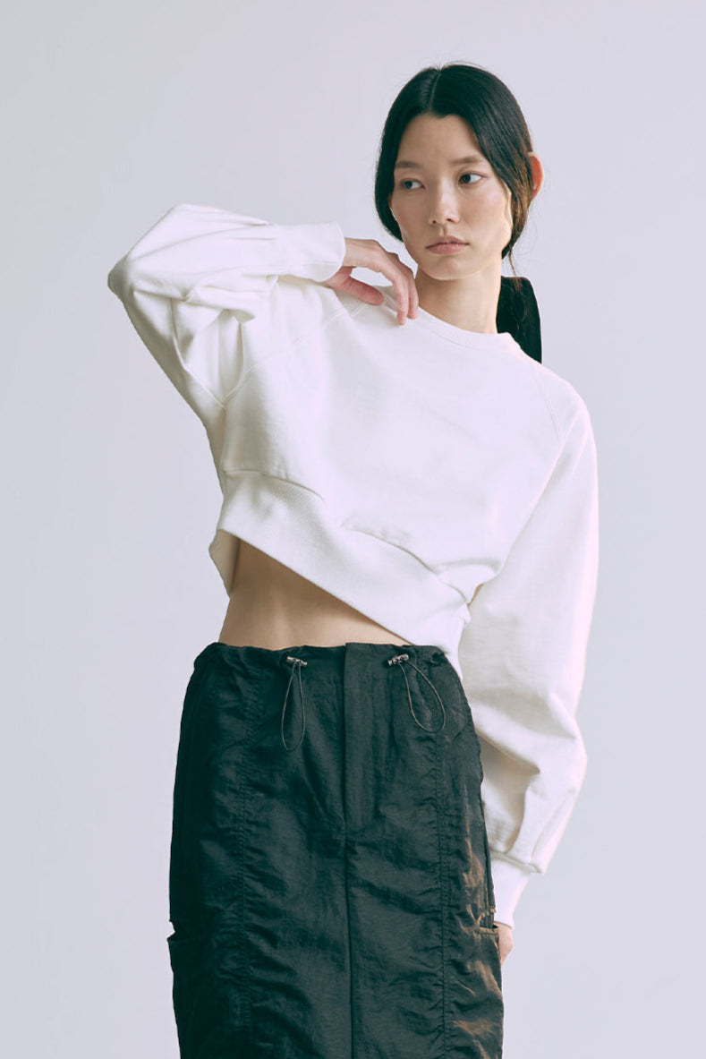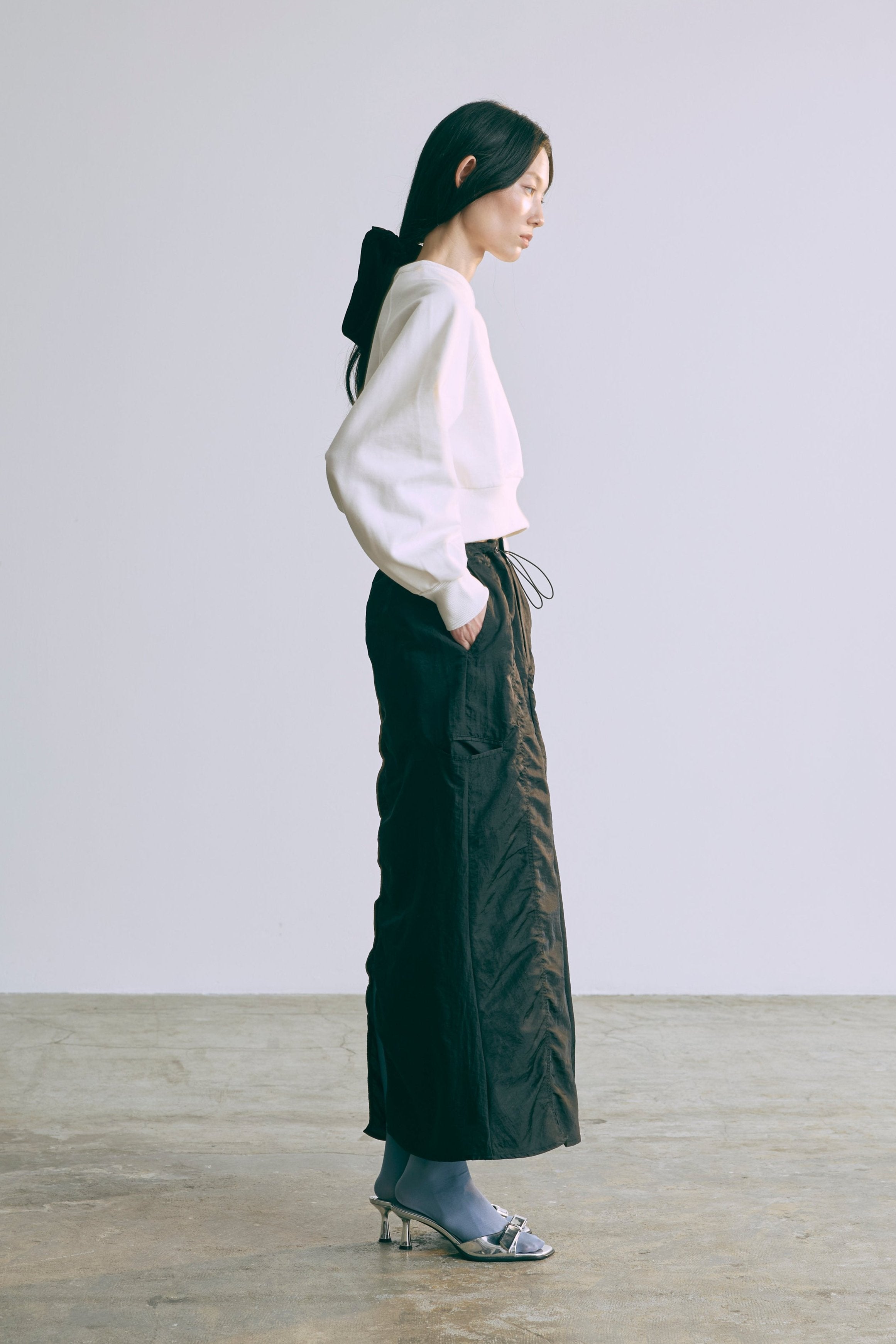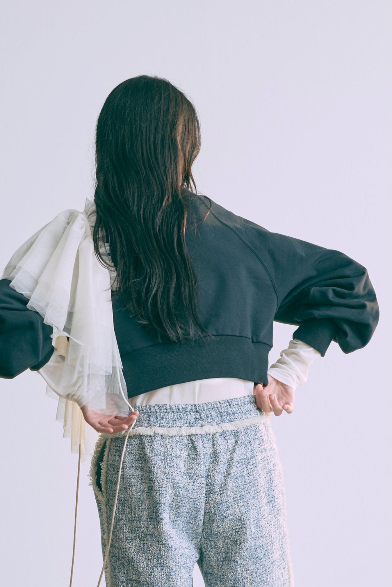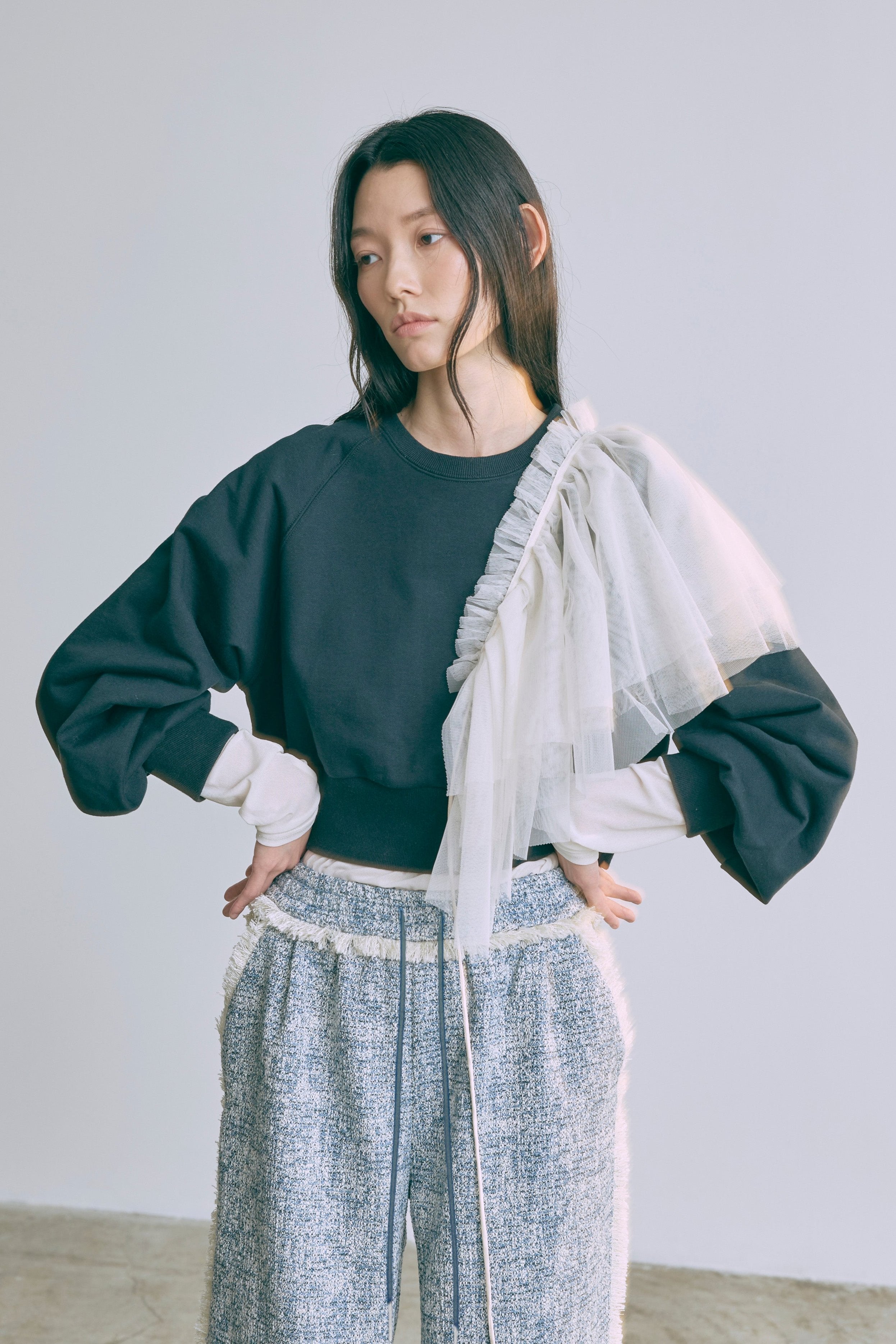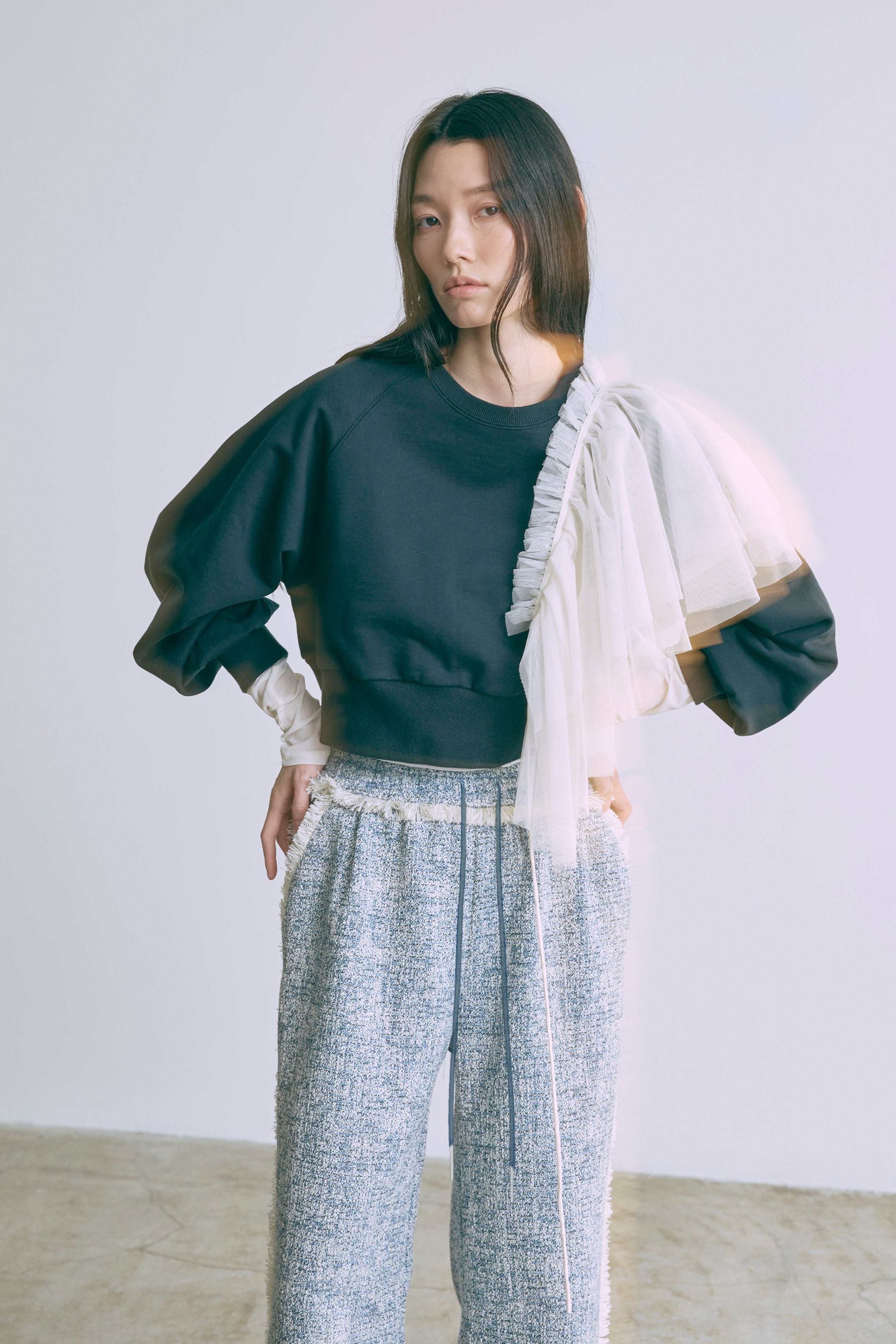 無駄を省いた大人のフリルブラウス 【Material】 上品な光沢感がありつつも、表面のしわ感がヴィンテージライクな印象のニュアンスを生み出します。 適度なハリと落ち感を併せ持った素材感により馴染み良く、着心地抜群です。 【Design】 フロントのタックと首元のフリルにこだわり、ふんわりとしたシルエットに仕上げました。袖は指先までかかる長めのフレアスリーブで、内側にスリットを入れることで程よい抜け感を演出しています。一枚で着ても、インナーとしても映える大人のフリルブラウスです。 【Styling point】 一枚でさらりと着るのはもちろん、ニットのインナーとしても活躍します。ボトムスはデニムやワイドパンツなど、少しメンズライクなアイテムと合わせたMIXスタイルがおすすめです。 ◇同素材で下記ご用意しております。 Gathered Volume Blouse(品番:91009) Volume Sleeve Soft Flare Dress(品番:95004)