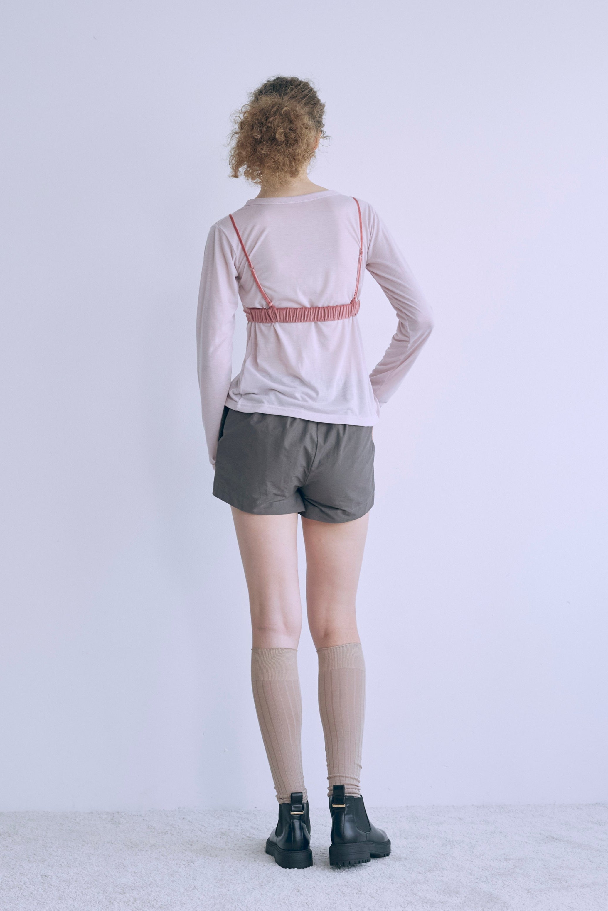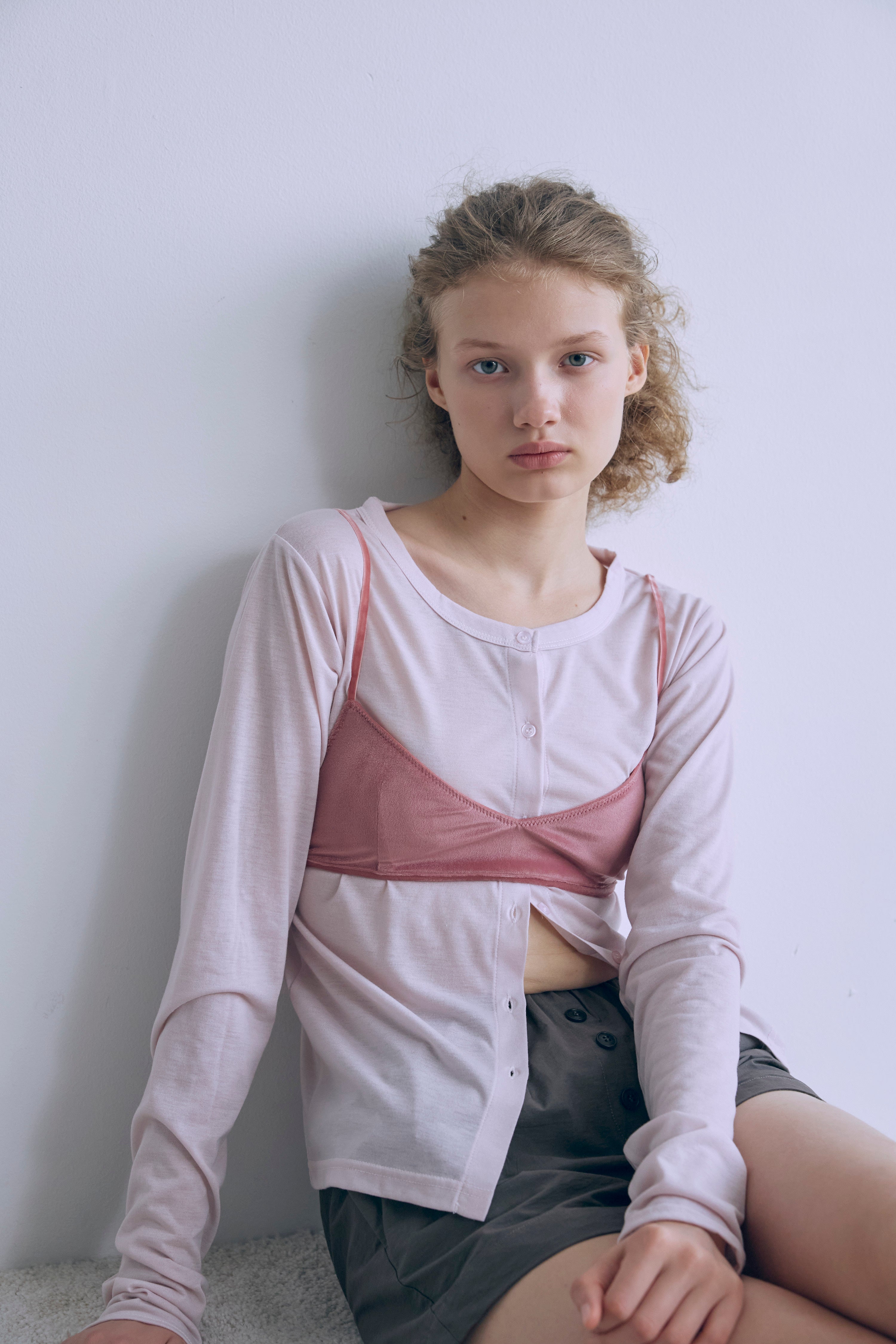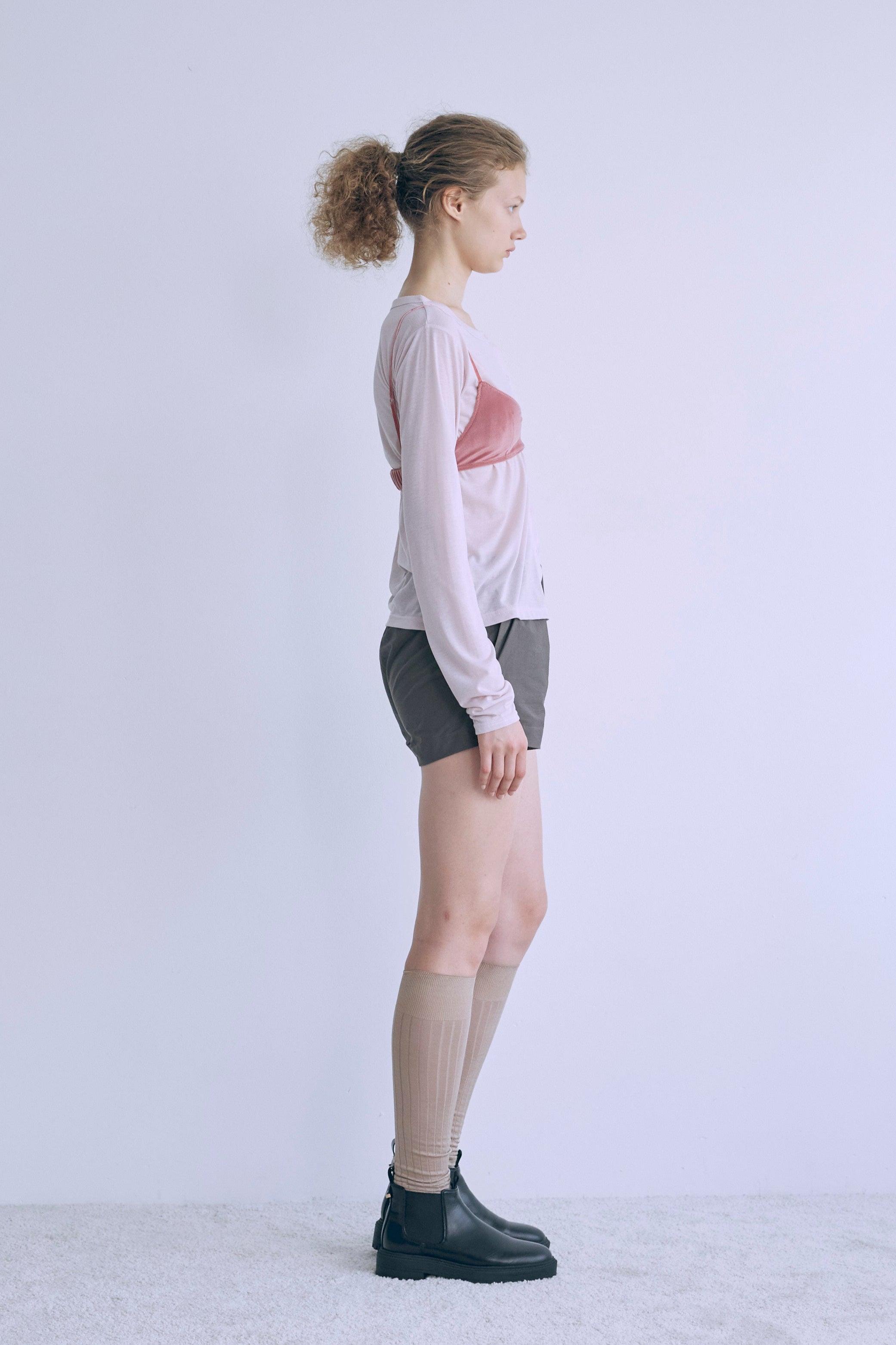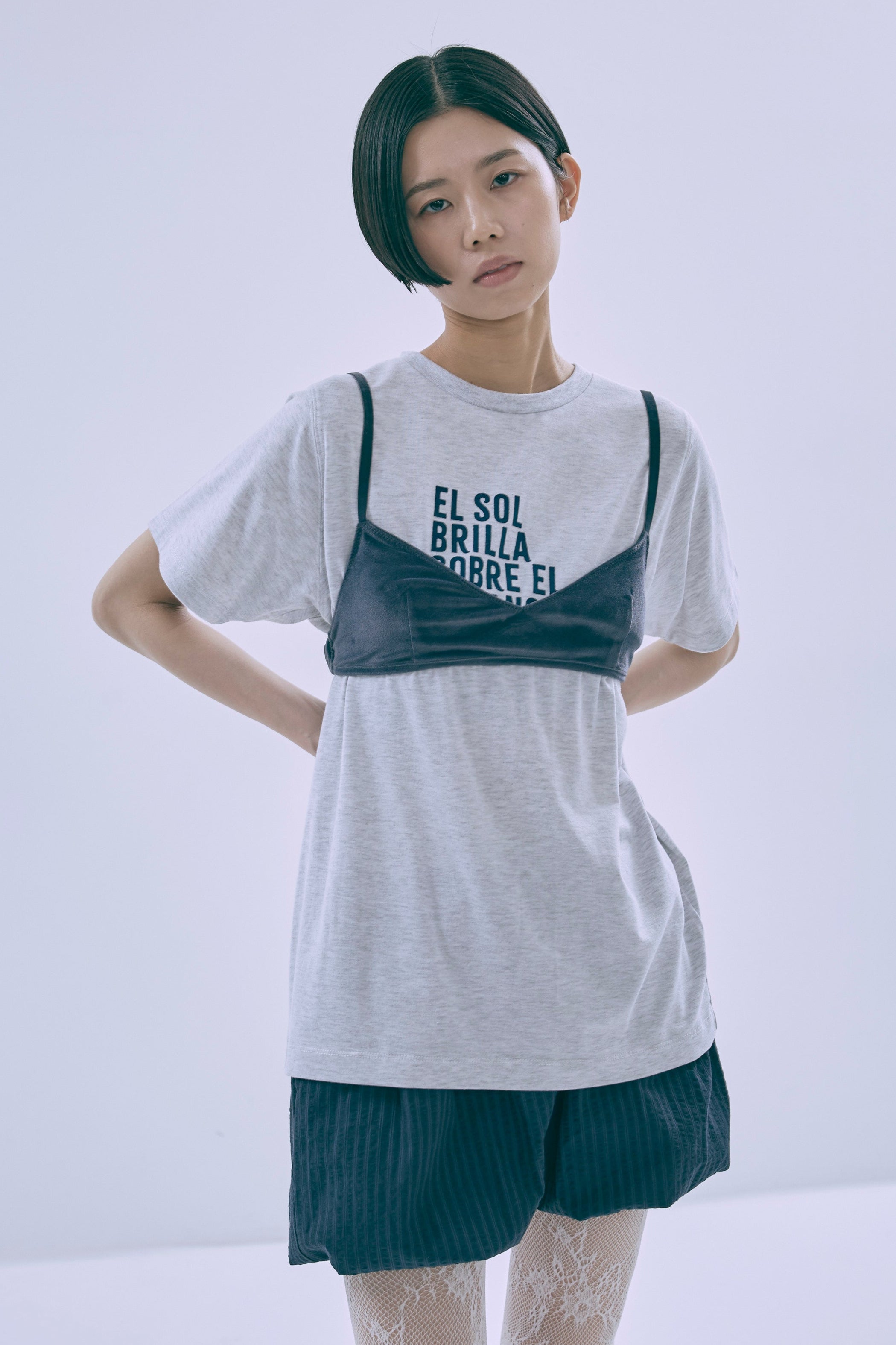 インにもアウトにも。着こなし自在なベロアブラトップ 【Material】 やわらかな肌ざわりと上品な微光沢が魅力のベロア素材を使用。ほどよい厚みでシーズンレスに着回せます。 【Design】 ビスチェ感覚で着られるブラトップ。カップは取り外し可能で、シーンや気分に合わせて調整できるのも嬉しいポイントです。 【Styling Point】 シャツやTシャツの上にレイヤードすれば、旬なスタイリングに。透け感トップスのインナーとしても活躍し、さりげなく覗かせるだけでこなれた印象に仕上がります。インナー見えしないデザインだから、1枚で着てもスタイリッシュに決まります。