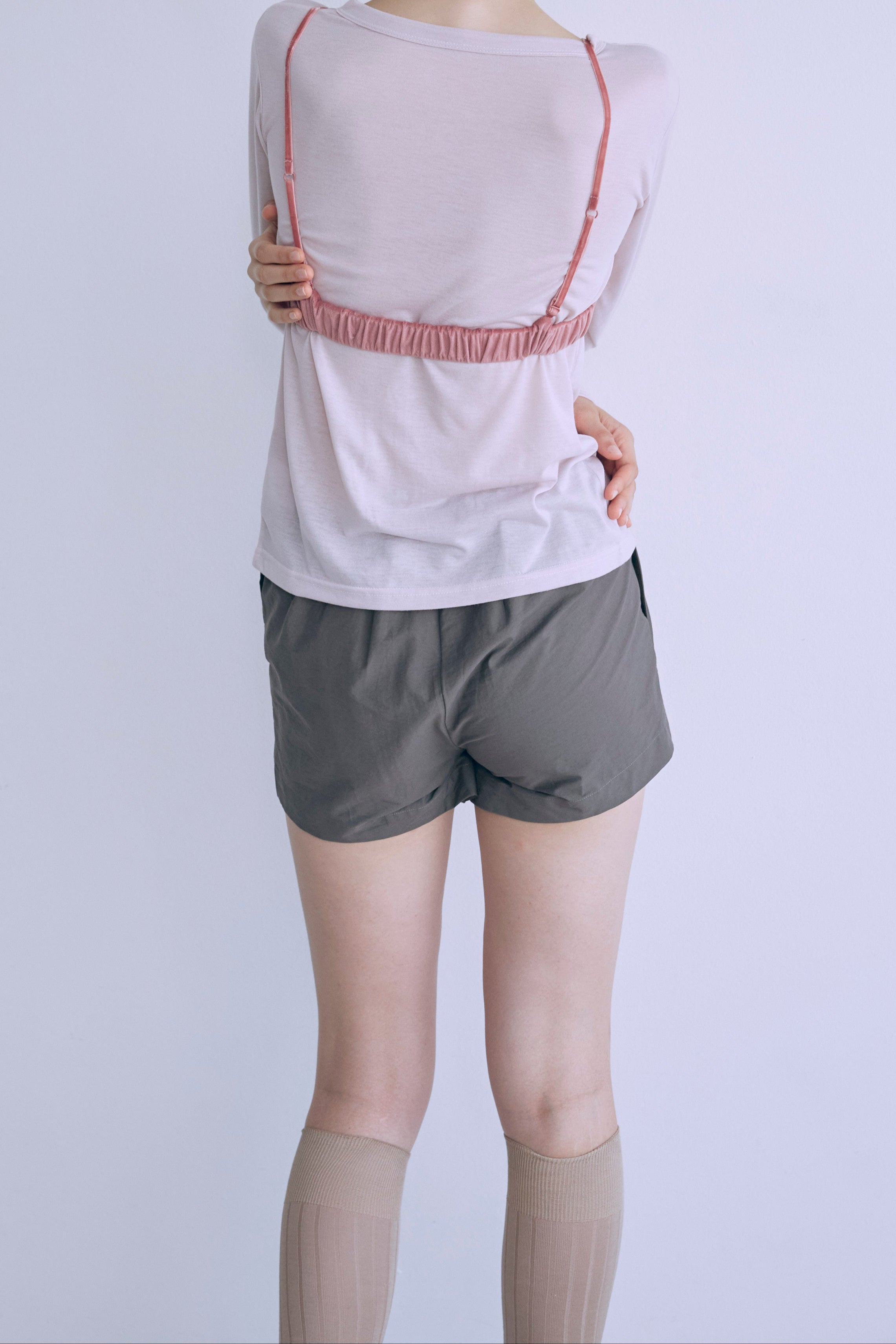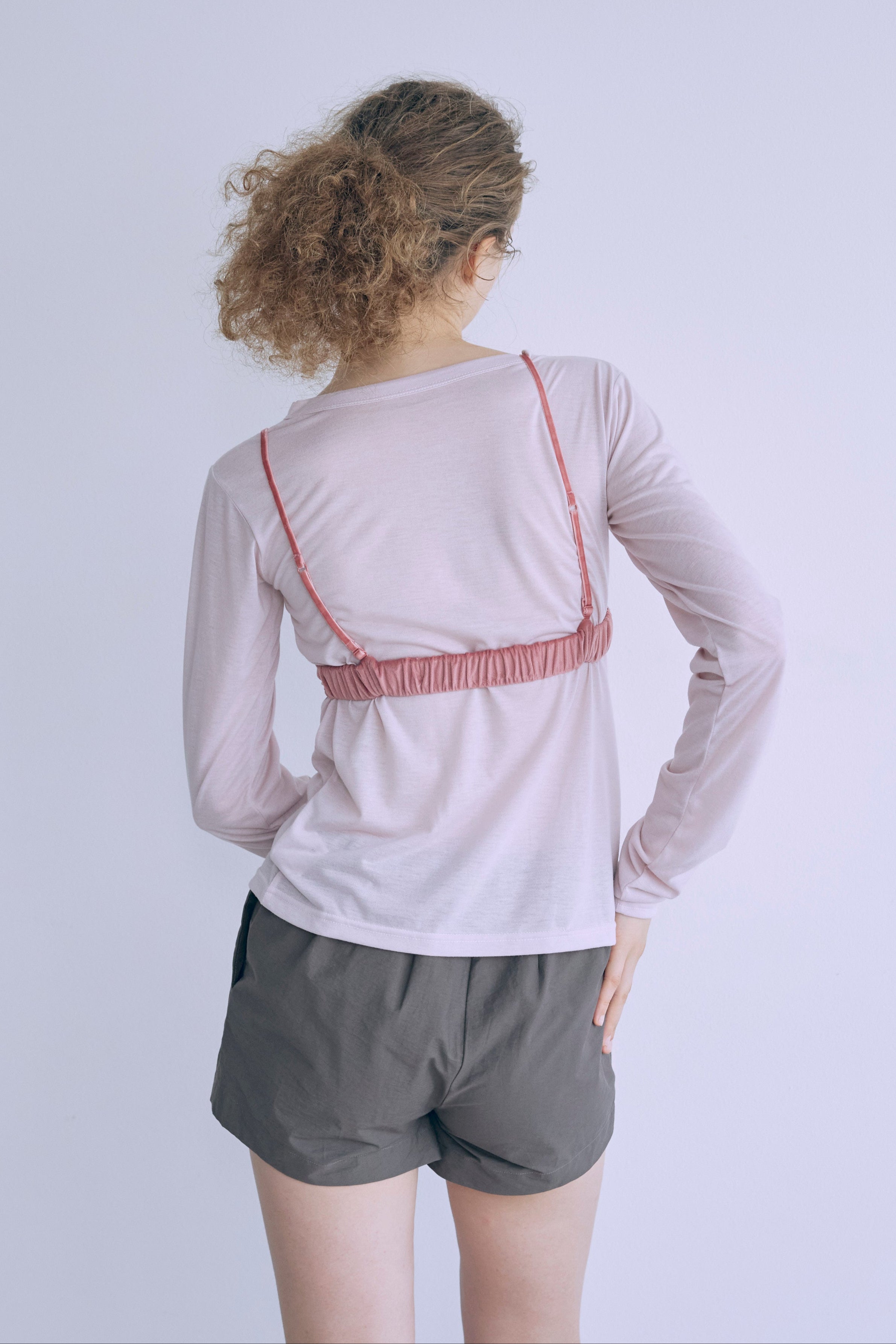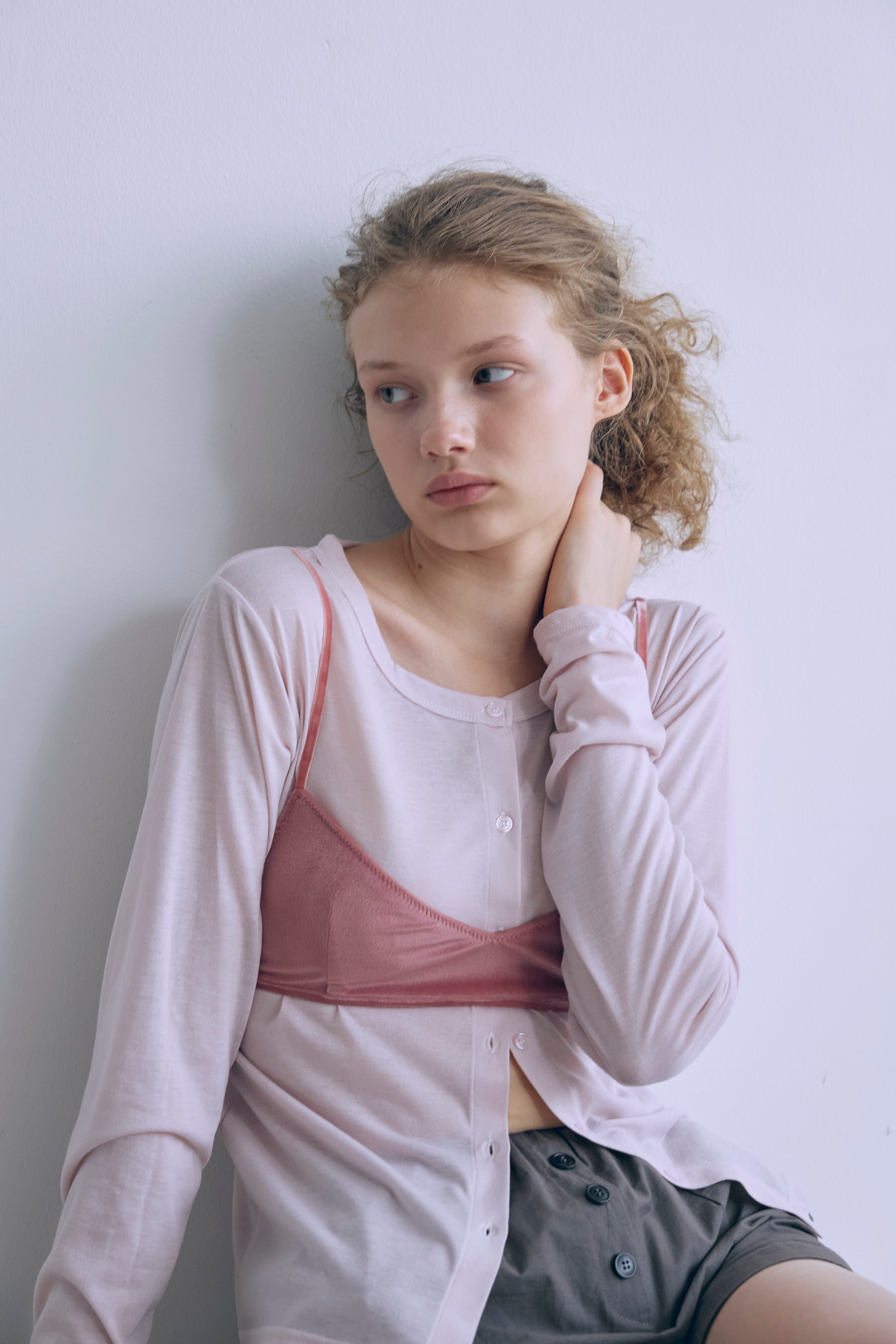 インにもアウトにも。着こなし自在なベロアブラトップ 【Material】 やわらかな肌ざわりと上品な微光沢が魅力のベロア素材を使用。ほどよい厚みでシーズンレスに着回せます。 【Design】 ビスチェ感覚で着られるブラトップ。カップは取り外し可能で、シーンや気分に合わせて調整できるのも嬉しいポイントです。 【Styling Point】 シャツやTシャツの上にレイヤードすれば、旬なスタイリングに。透け感トップスのインナーとしても活躍し、さりげなく覗かせるだけでこなれた印象に仕上がります。インナー見えしないデザインだから、1枚で着てもスタイリッシュに決まります。
