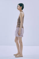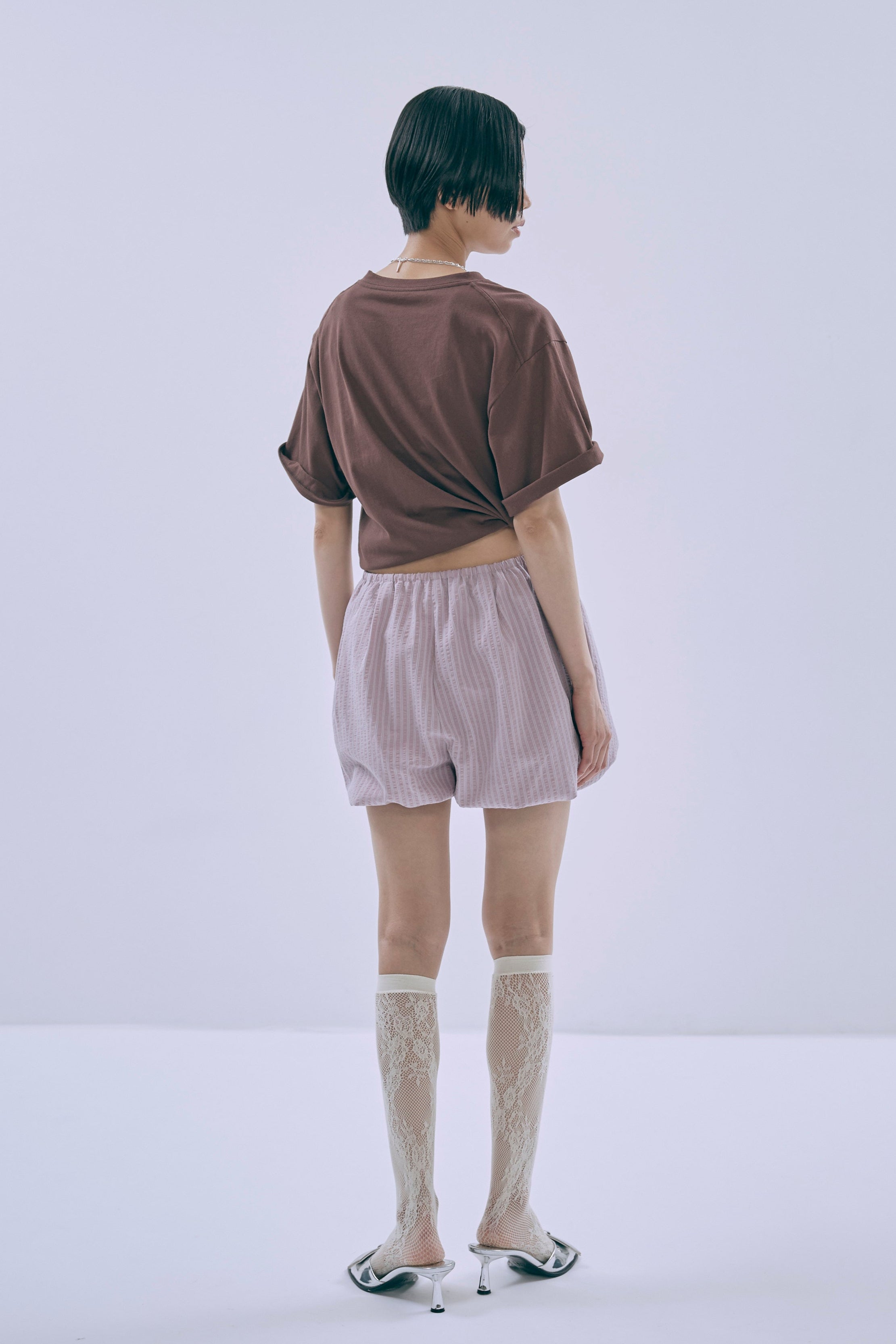 【Material】 ドビーストライプ柄は、大人でも履きやすい微配色で、シンプルながらも表情豊かな印象に。 サッカー生地で表面感があり、さらっと涼し気な印象にしてくれます。 【Design】 トレンドのバルーンシルエットのショートパンツ。 ローウエストで履いていただくサイズにしています。 スカート見えするようなボリューム感は、裏地と裾ゴムでふわっと感をキープしつつ、インナーの心配をせずに履いていただけます。 【Styling point】 コンパクトなTシャツやショート丈のサマーニットなどシンプルなアイテムと相性のいいアイテムです。
