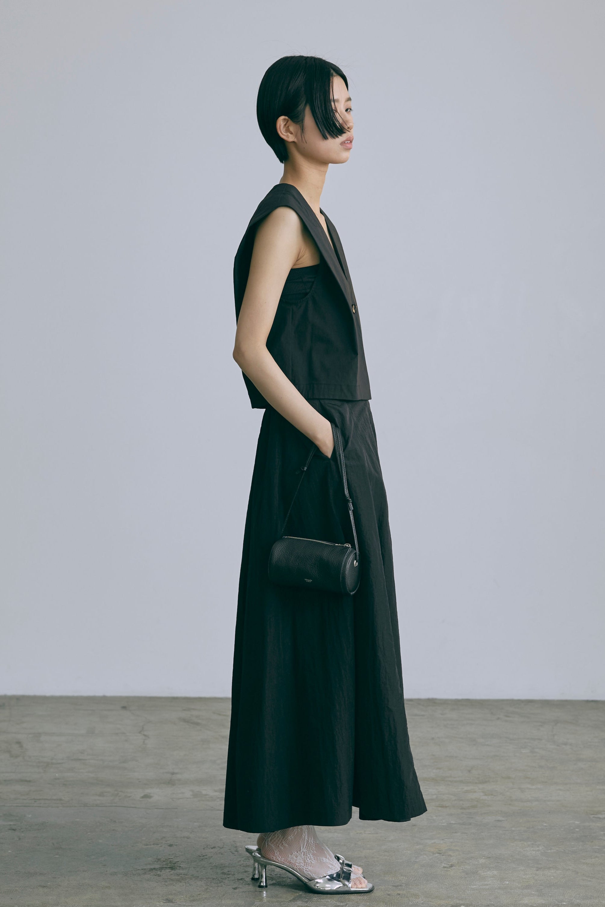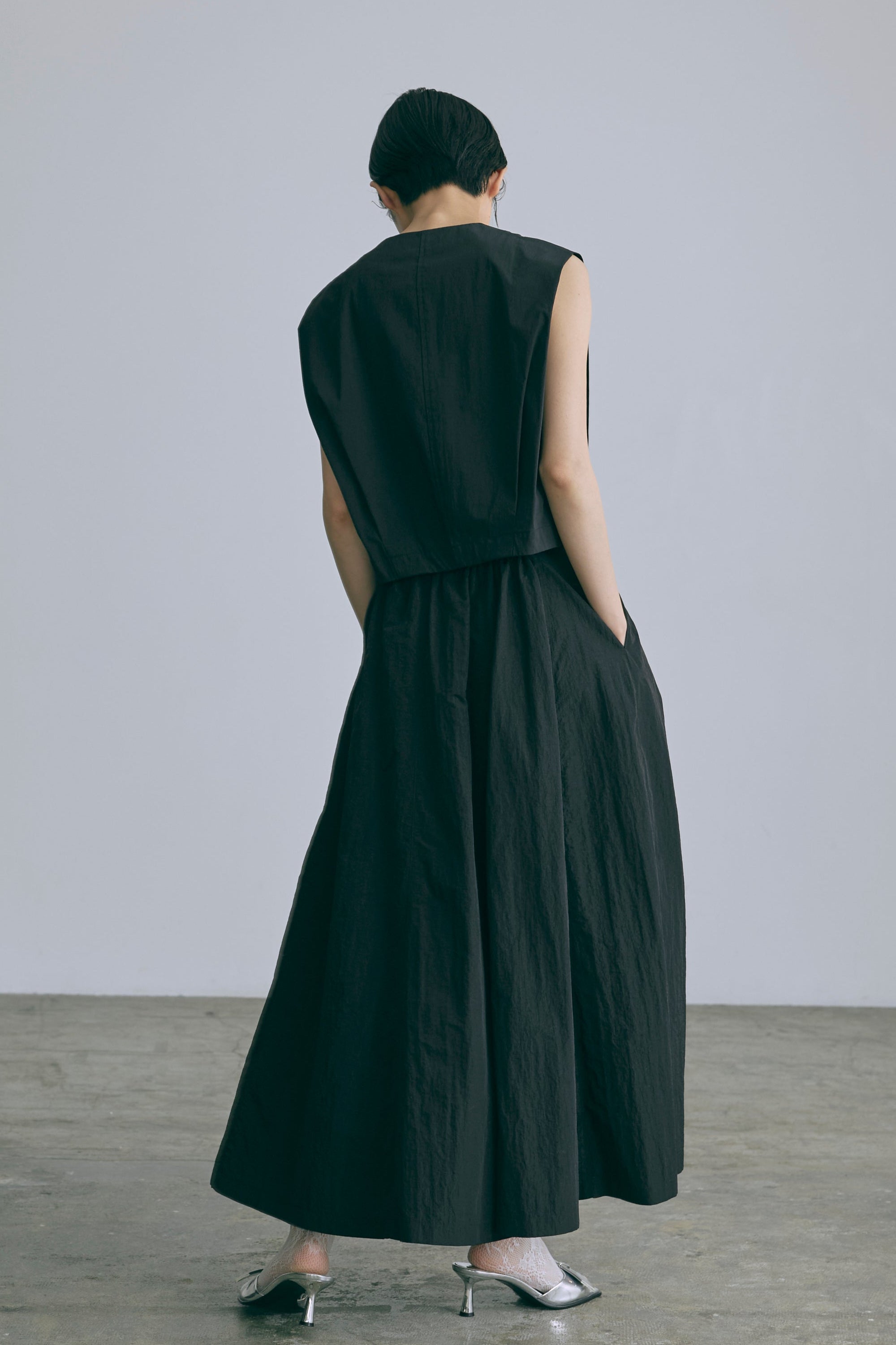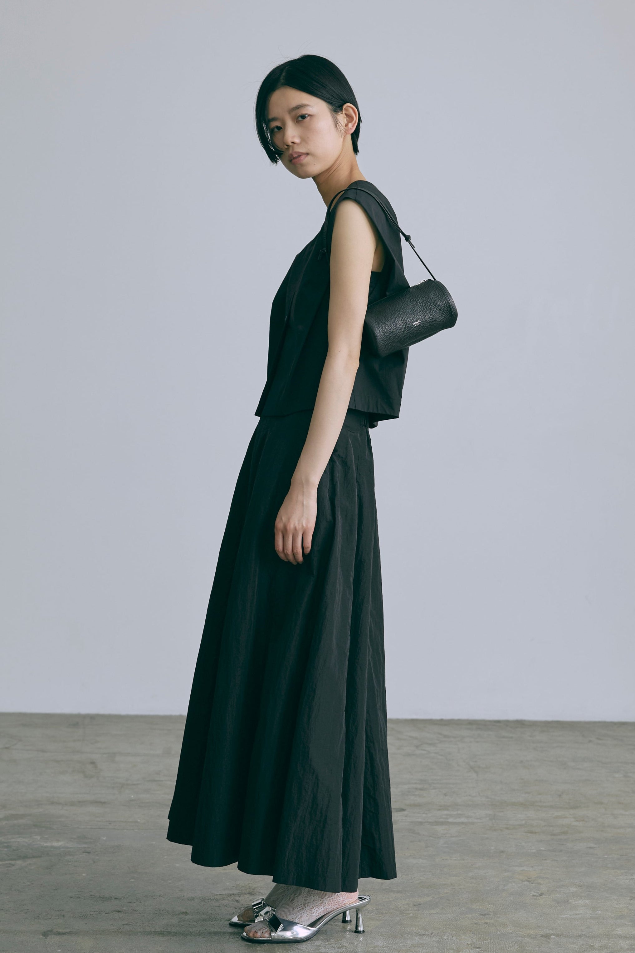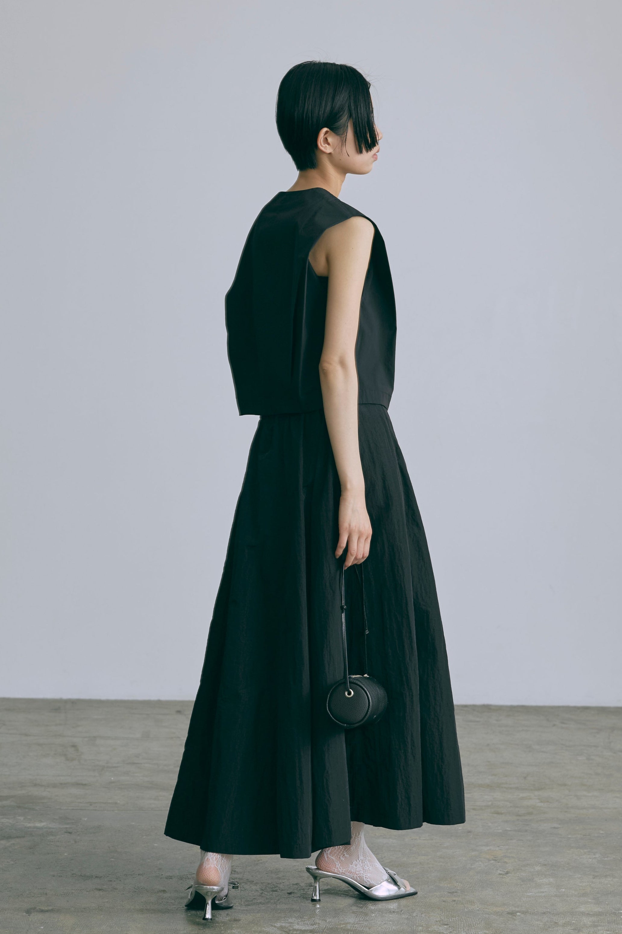 動きに合わせて軽やかに揺れるエアリースカート ナイロンタフタフレアスカート 【Material】 ヴィンテージワッシャー加工を施した、表情豊かなナイロン100%の軽量タフタ素材を使用。輝きのある光沢が、モードなスタイリングにもぴったりです。 【Design】 縦の切り替えでウエストをすっきり見せつつ、ボリューム感を大切にしたシルエットが特徴のスカートです。 【Styling point】 トップスはインして着るのがおすすめ。カジュアルなカットソーやニットなど、どんなトップスとも相性が良く、幅広いスタイリングを楽しめます。カジュアルにもモードにも着こなせる、汎用性の高いアイテムです。