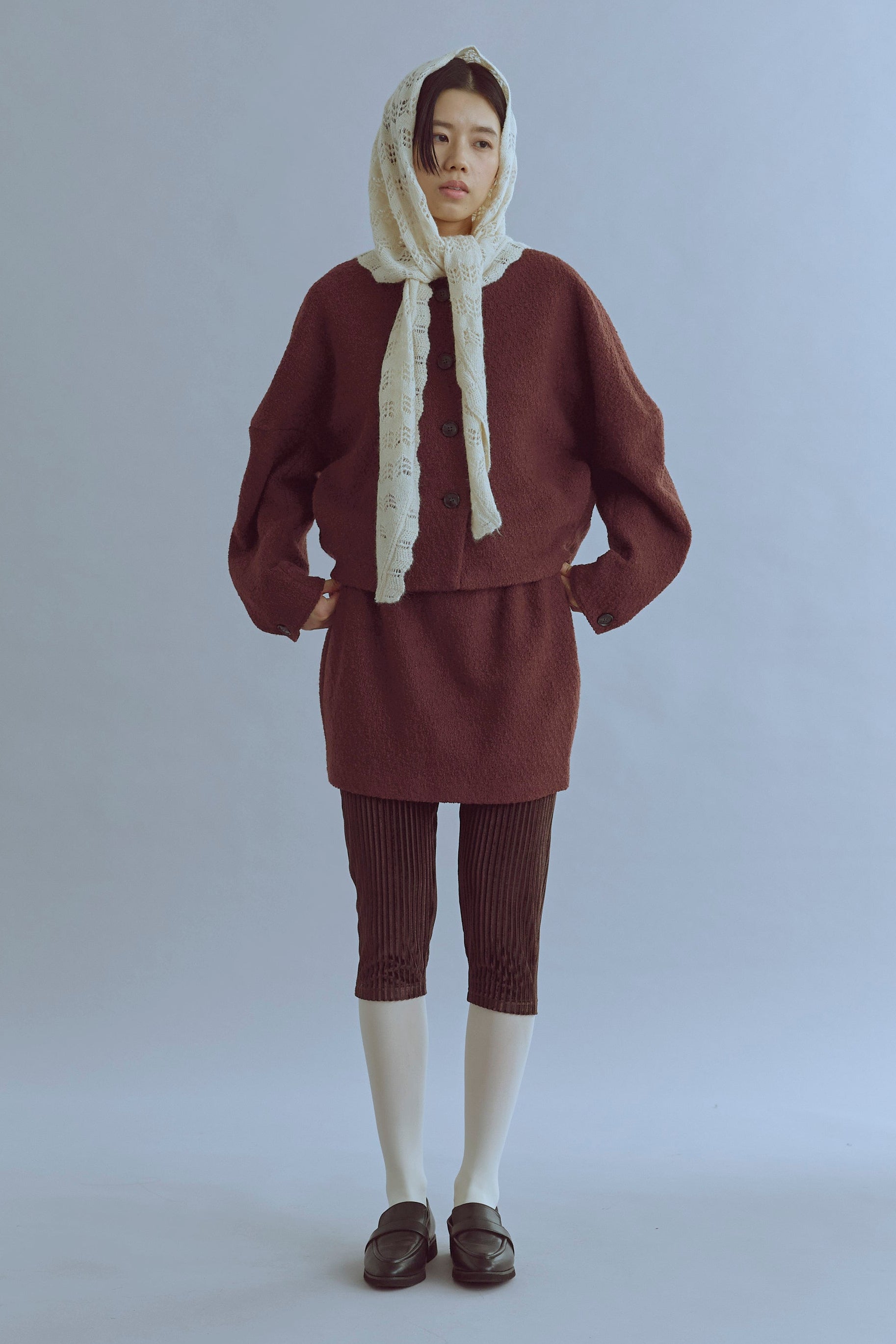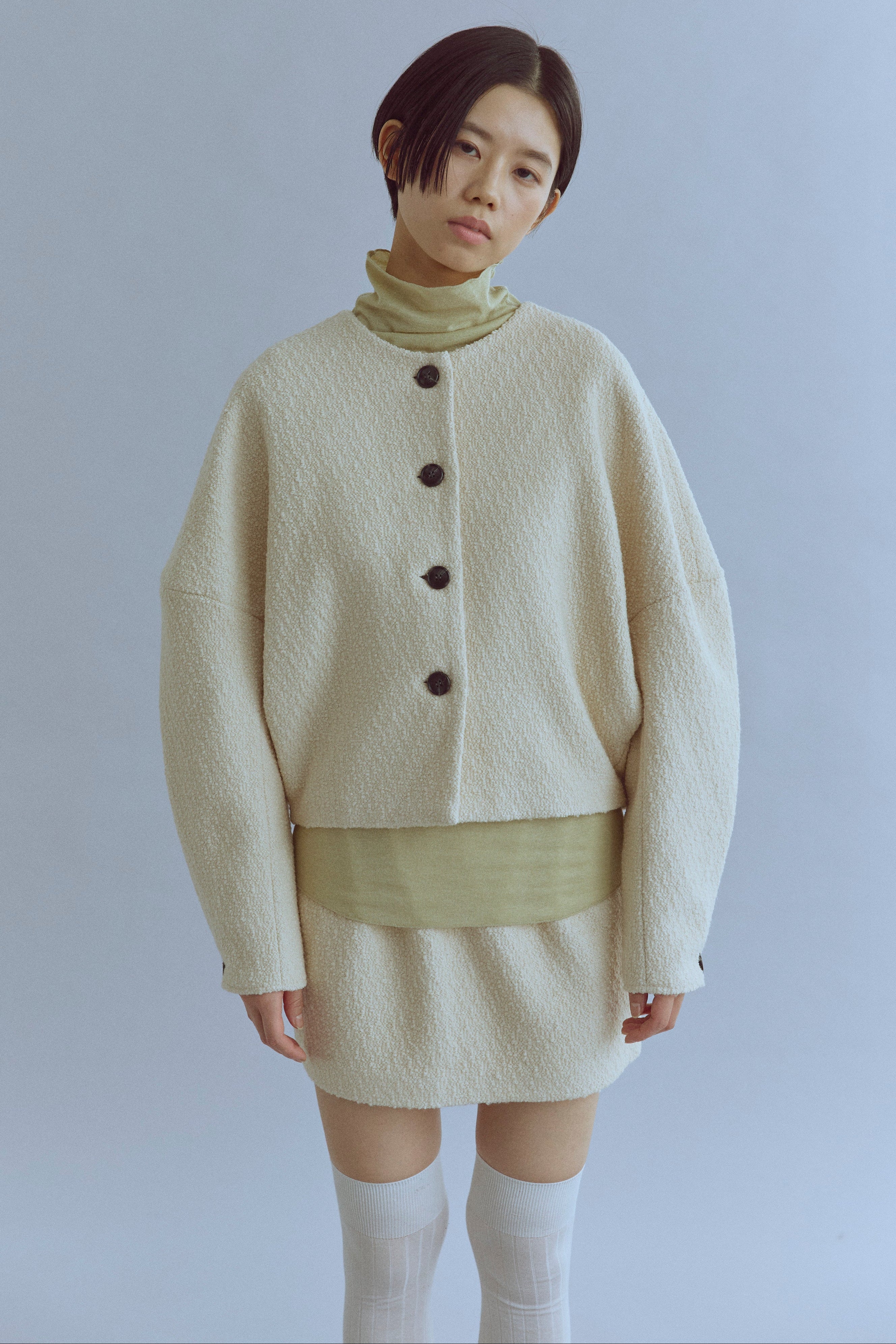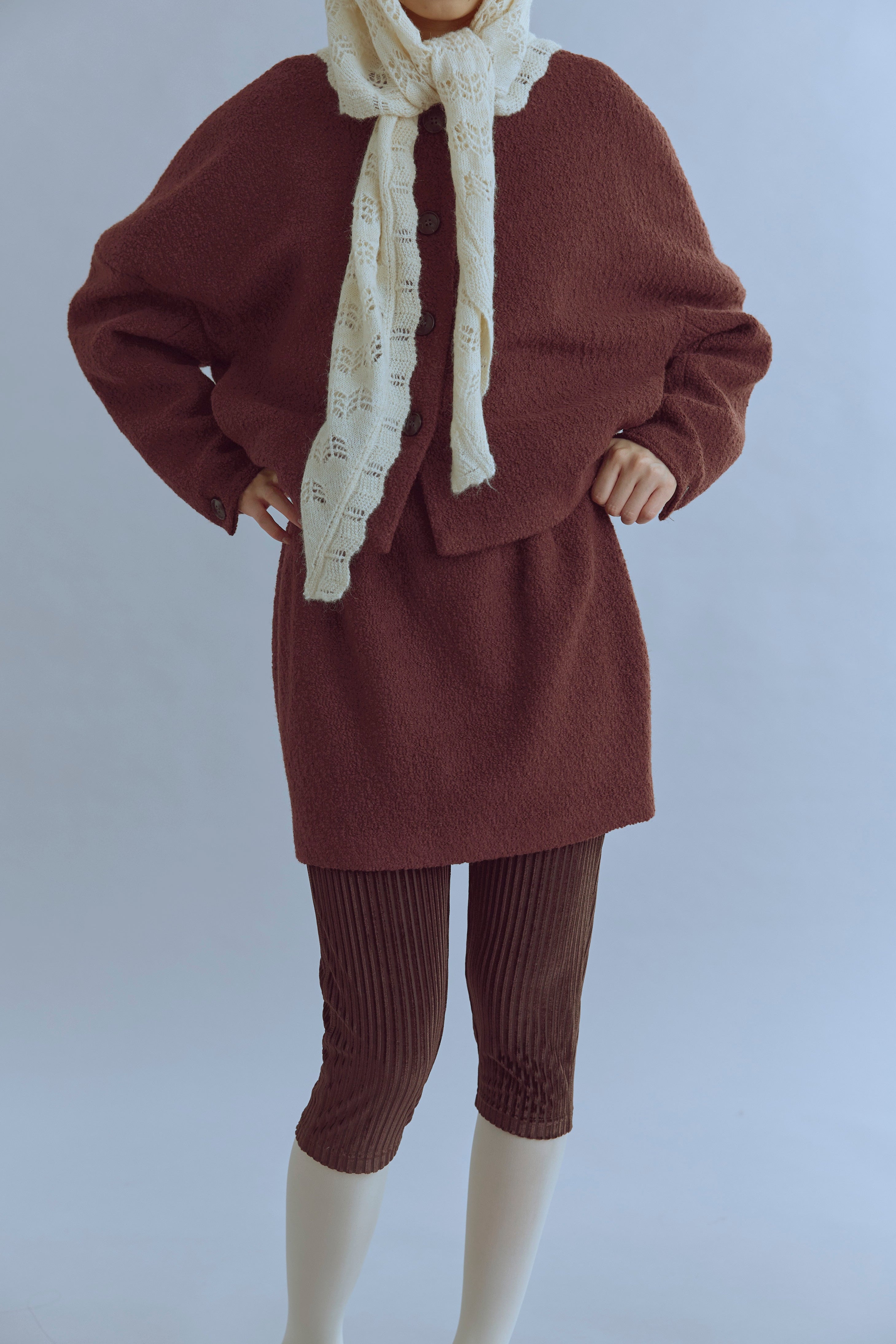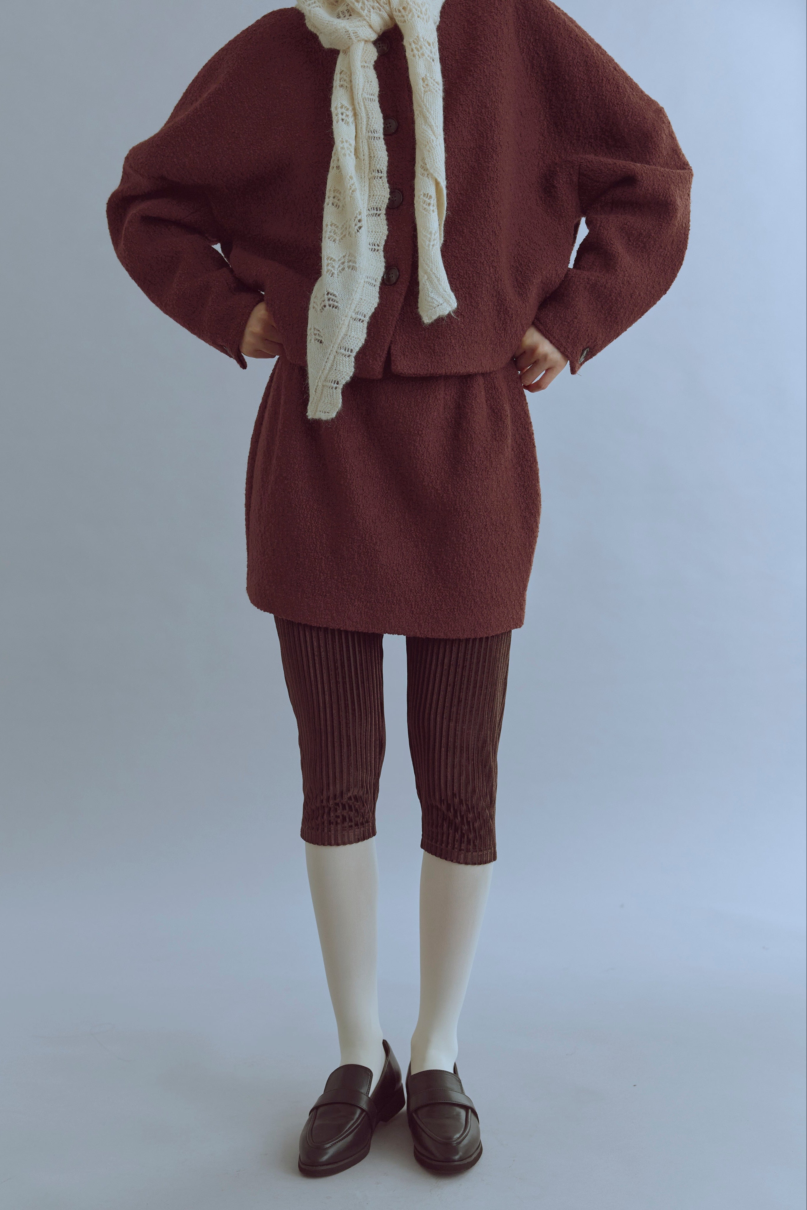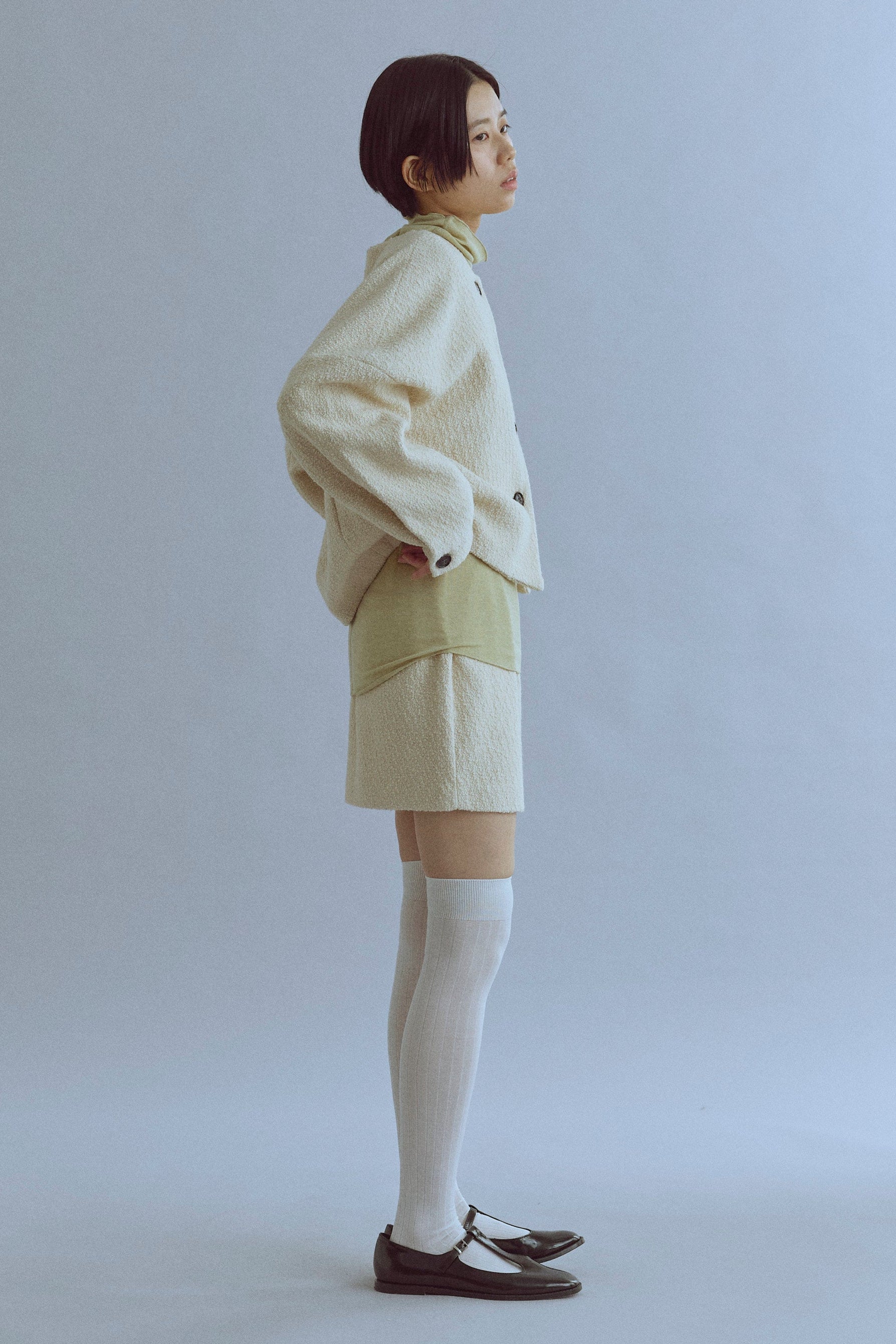 ブークレ素材で季節感をプラス。大人のコクーンスカート 【Material】 表面に立体感のあるブークレウール素材を使用。 軽やかで着心地が良く、日常使いはもちろんちょっとしたお出かけにも活躍するアイテムです。 【Design】 腰周りはゆとりがあり、裾に向かって自然に丸みを帯びるコクーンシルエット。丈感も絶妙で、デイリーに取り入れやすいデザインです。 内側にはパンツ仕様の裏地を備えているため、安心して着用していただけます。見た目の可愛さだけでなく、動きやすさや実用性も兼ね備えたアイテムです。 【Styling point】 セットアップで着用していただきたいアイテム◎ タイツやソックス合わせがおすすめ。ニットやカーディガンと組み合わせれば、春先や秋口の肌寒い時にもぴったりです。 ◇同素材で下記ご用意しております。 Boucle Cocoon Wool Jacket(品番:90032)