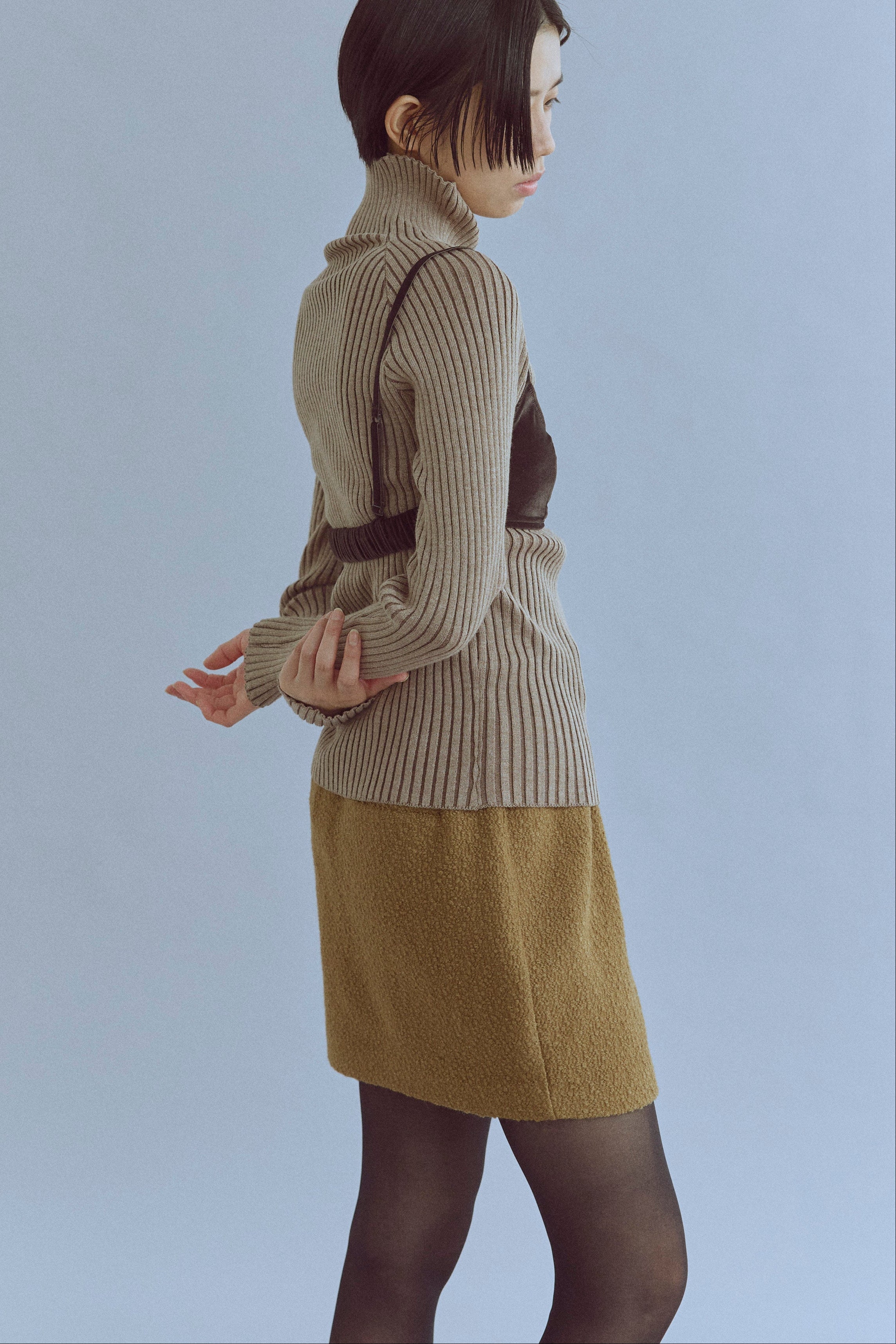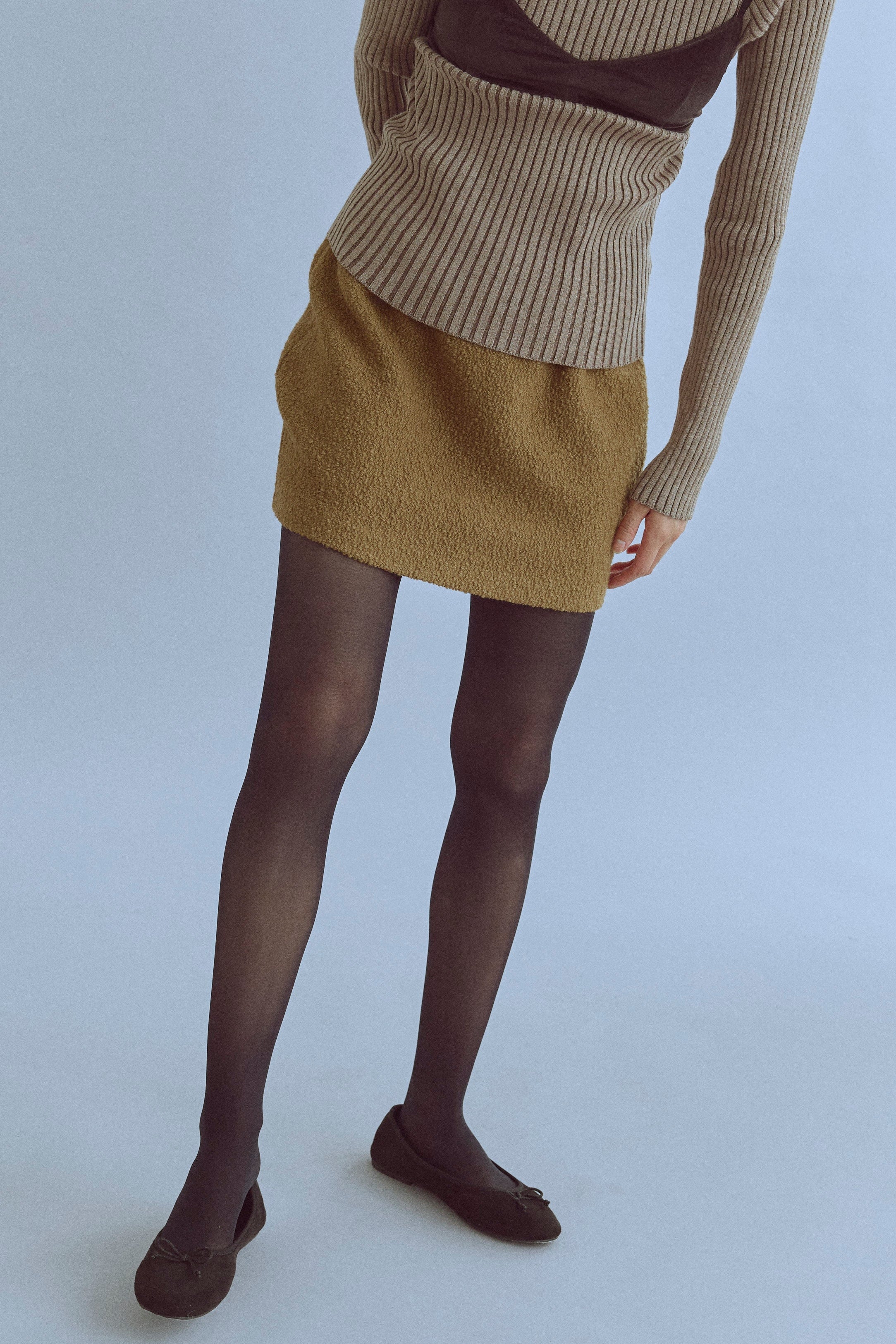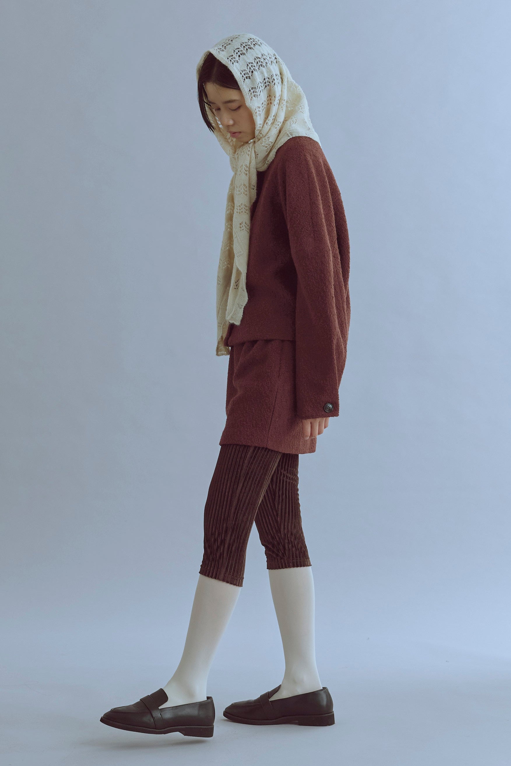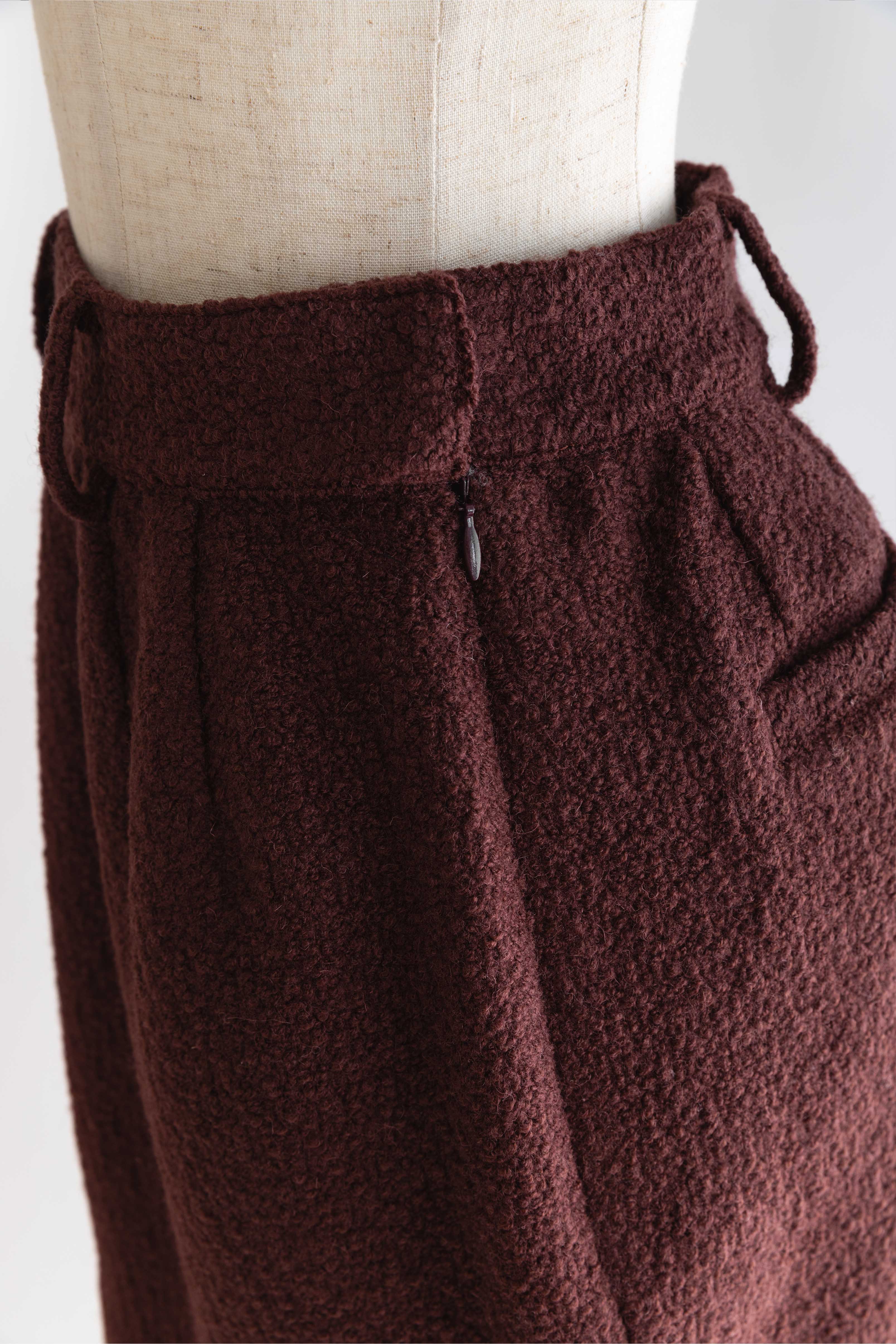 ブークレ素材で季節感をプラス。大人のコクーンスカート 【Material】 表面に立体感のあるブークレウール素材を使用。 軽やかで着心地が良く、日常使いはもちろんちょっとしたお出かけにも活躍するアイテムです。 【Design】 腰周りはゆとりがあり、裾に向かって自然に丸みを帯びるコクーンシルエット。丈感も絶妙で、デイリーに取り入れやすいデザインです。 内側にはパンツ仕様の裏地を備えているため、安心して着用していただけます。見た目の可愛さだけでなく、動きやすさや実用性も兼ね備えたアイテムです。 【Styling point】 セットアップで着用していただきたいアイテム◎ タイツやソックス合わせがおすすめ。ニットやカーディガンと組み合わせれば、春先や秋口の肌寒い時にもぴったりです。 ◇同素材で下記ご用意しております。 Boucle Cocoon Wool Jacket(品番:90032)