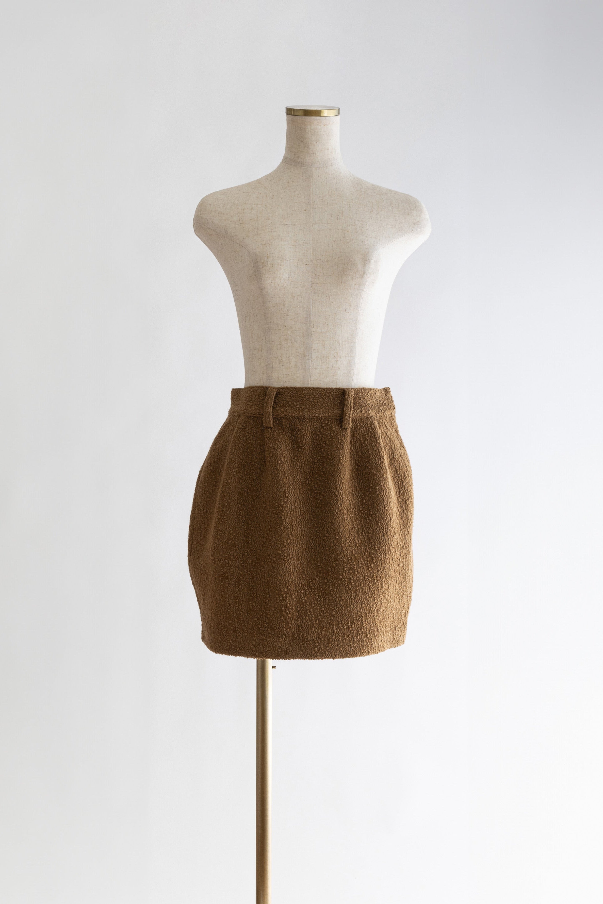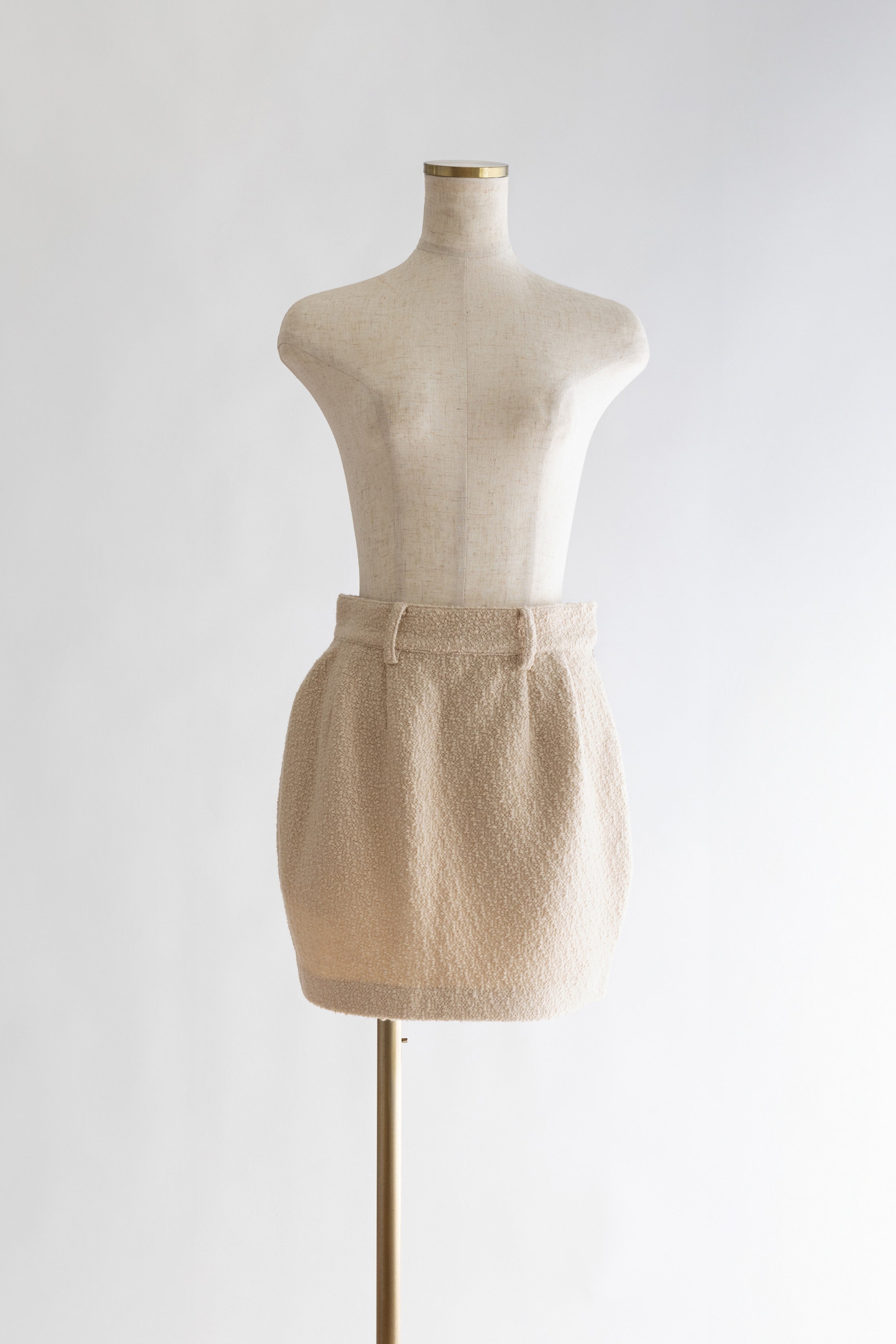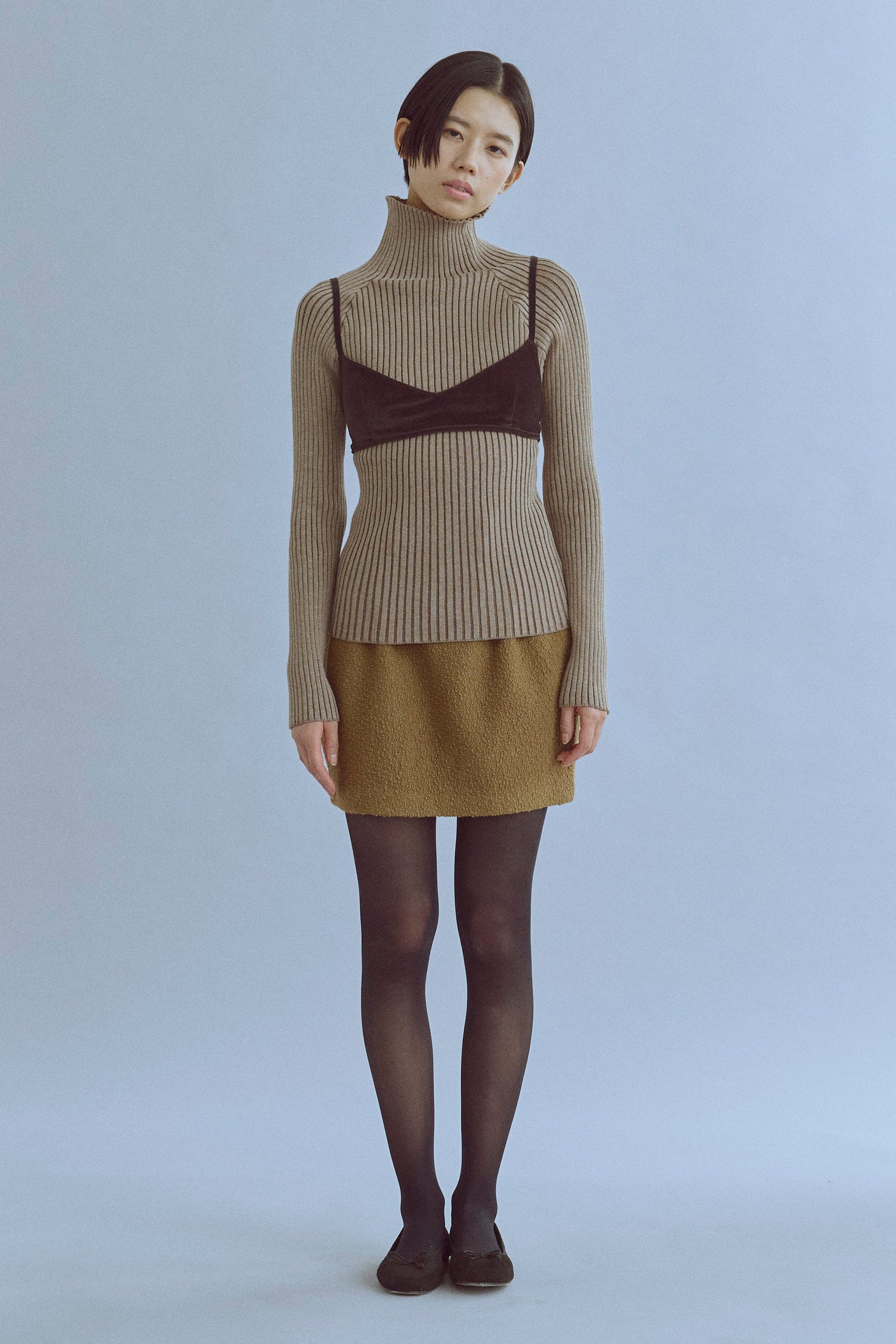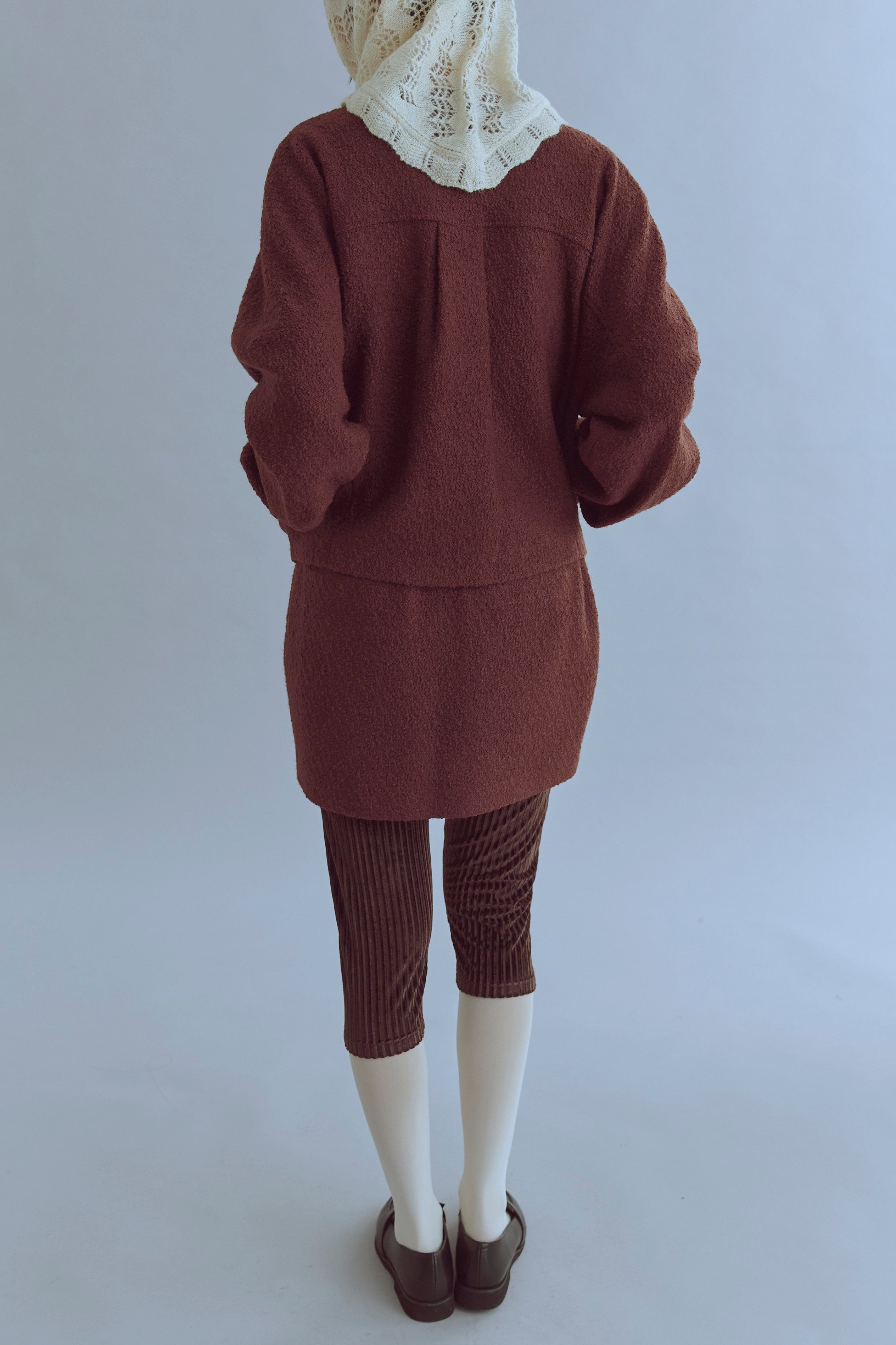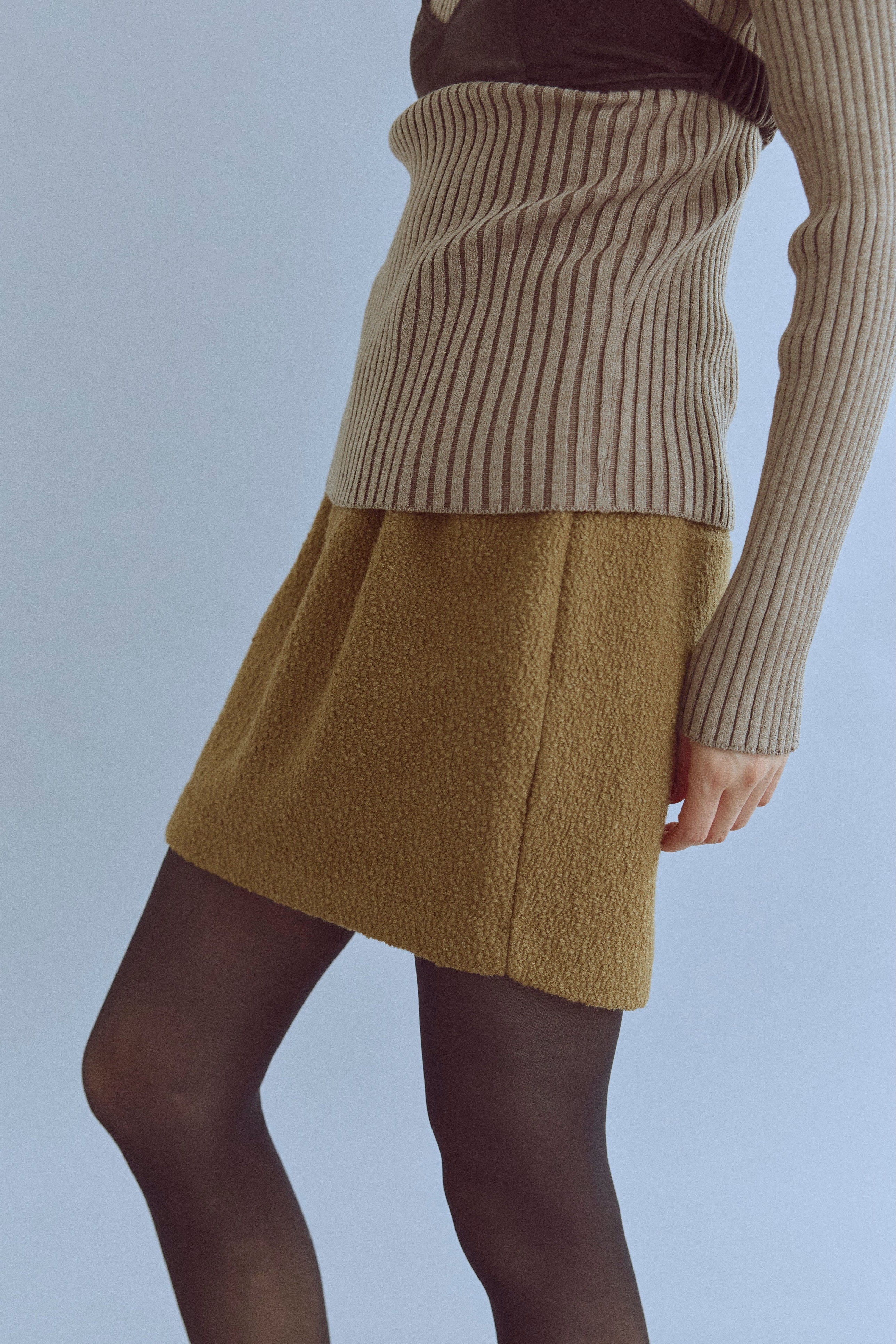 ブークレ素材で季節感をプラス。大人のコクーンスカート 【Material】 表面に立体感のあるブークレウール素材を使用。 軽やかで着心地が良く、日常使いはもちろんちょっとしたお出かけにも活躍するアイテムです。 【Design】 腰周りはゆとりがあり、裾に向かって自然に丸みを帯びるコクーンシルエット。丈感も絶妙で、デイリーに取り入れやすいデザインです。 内側にはパンツ仕様の裏地を備えているため、安心して着用していただけます。見た目の可愛さだけでなく、動きやすさや実用性も兼ね備えたアイテムです。 【Styling point】 セットアップで着用していただきたいアイテム◎ タイツやソックス合わせがおすすめ。ニットやカーディガンと組み合わせれば、春先や秋口の肌寒い時にもぴったりです。 ◇同素材で下記ご用意しております。 Boucle Cocoon Wool Jacket(品番:90032)