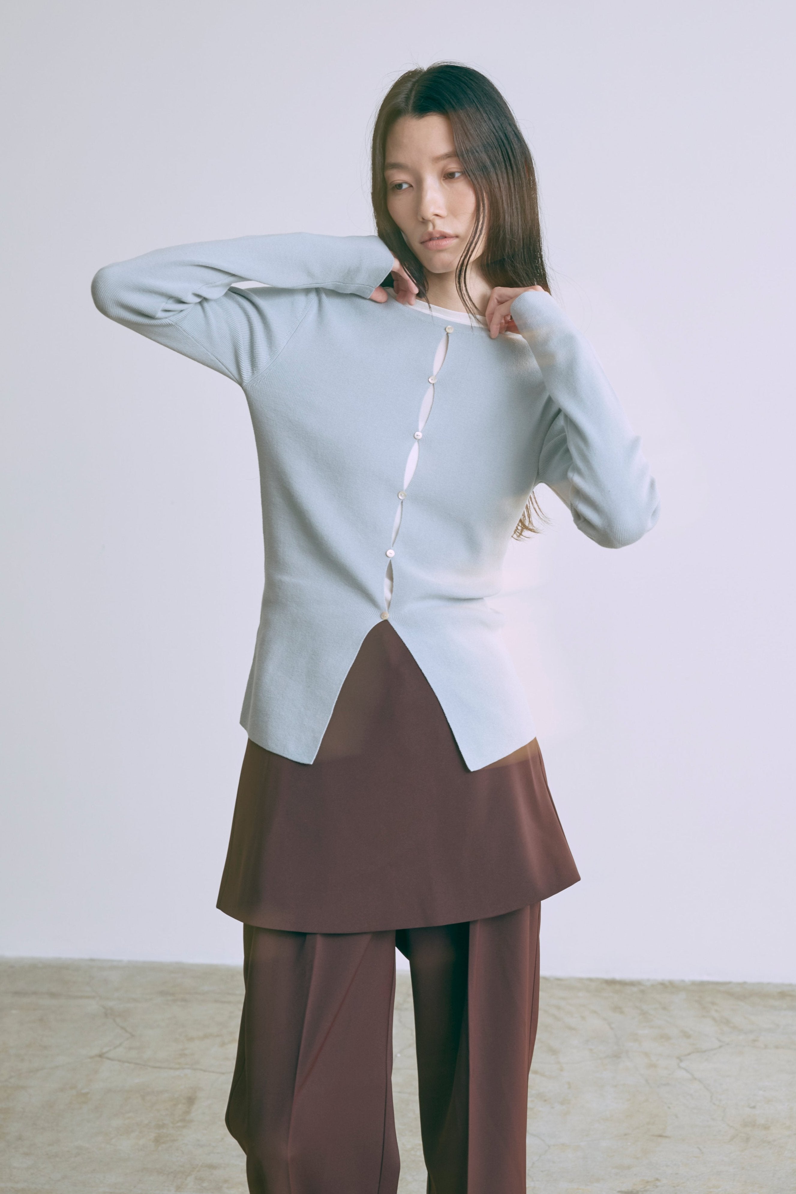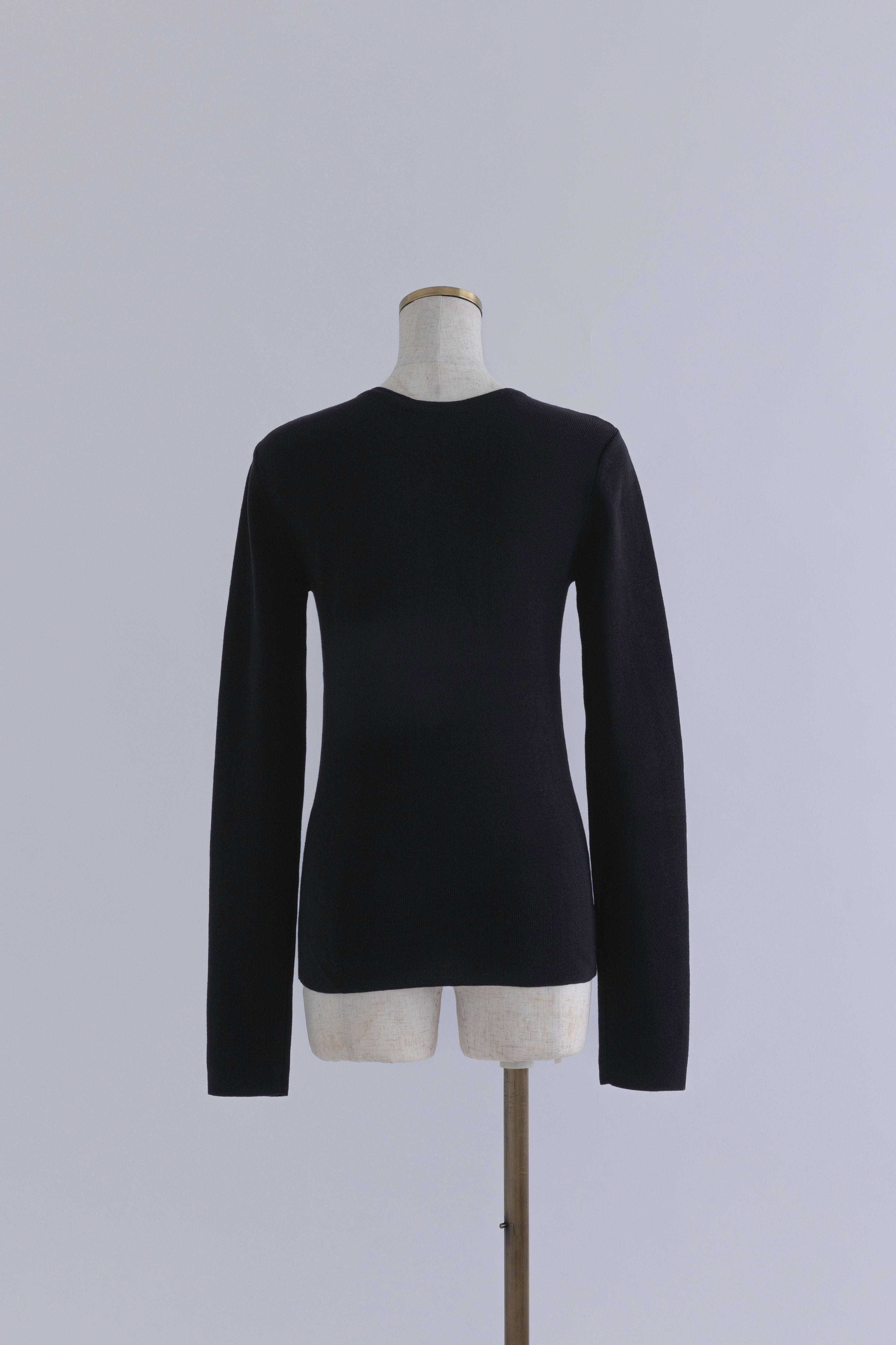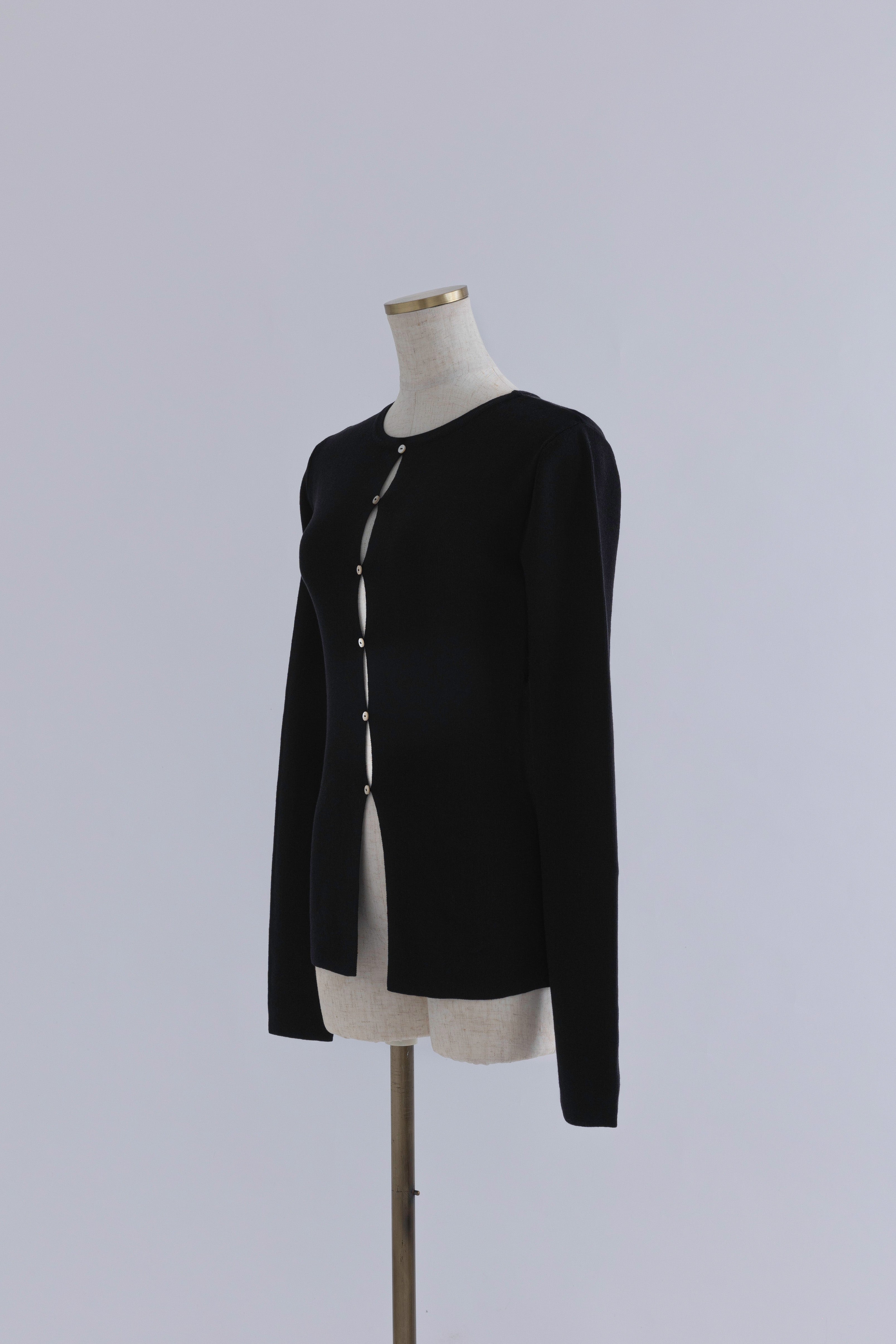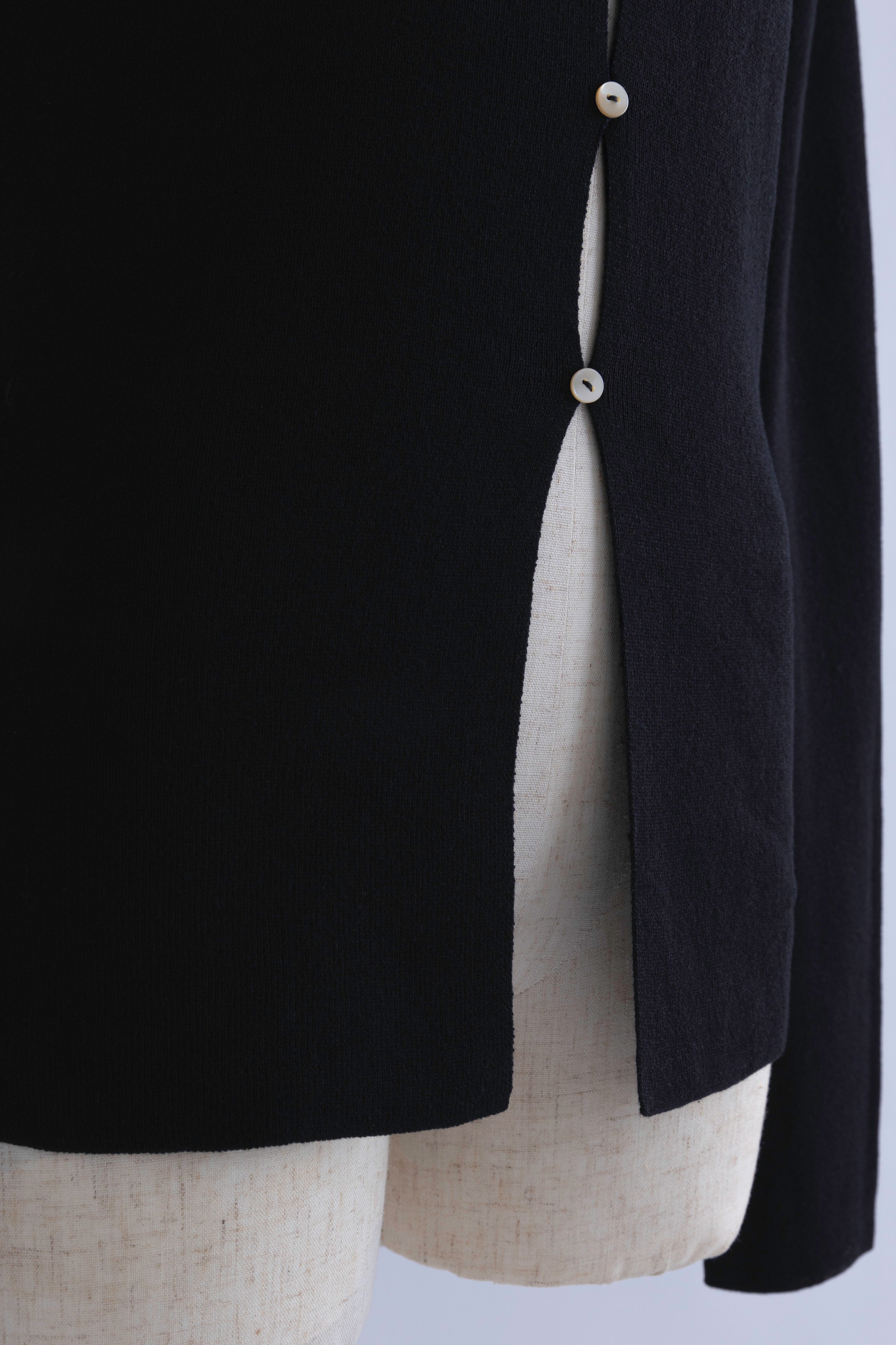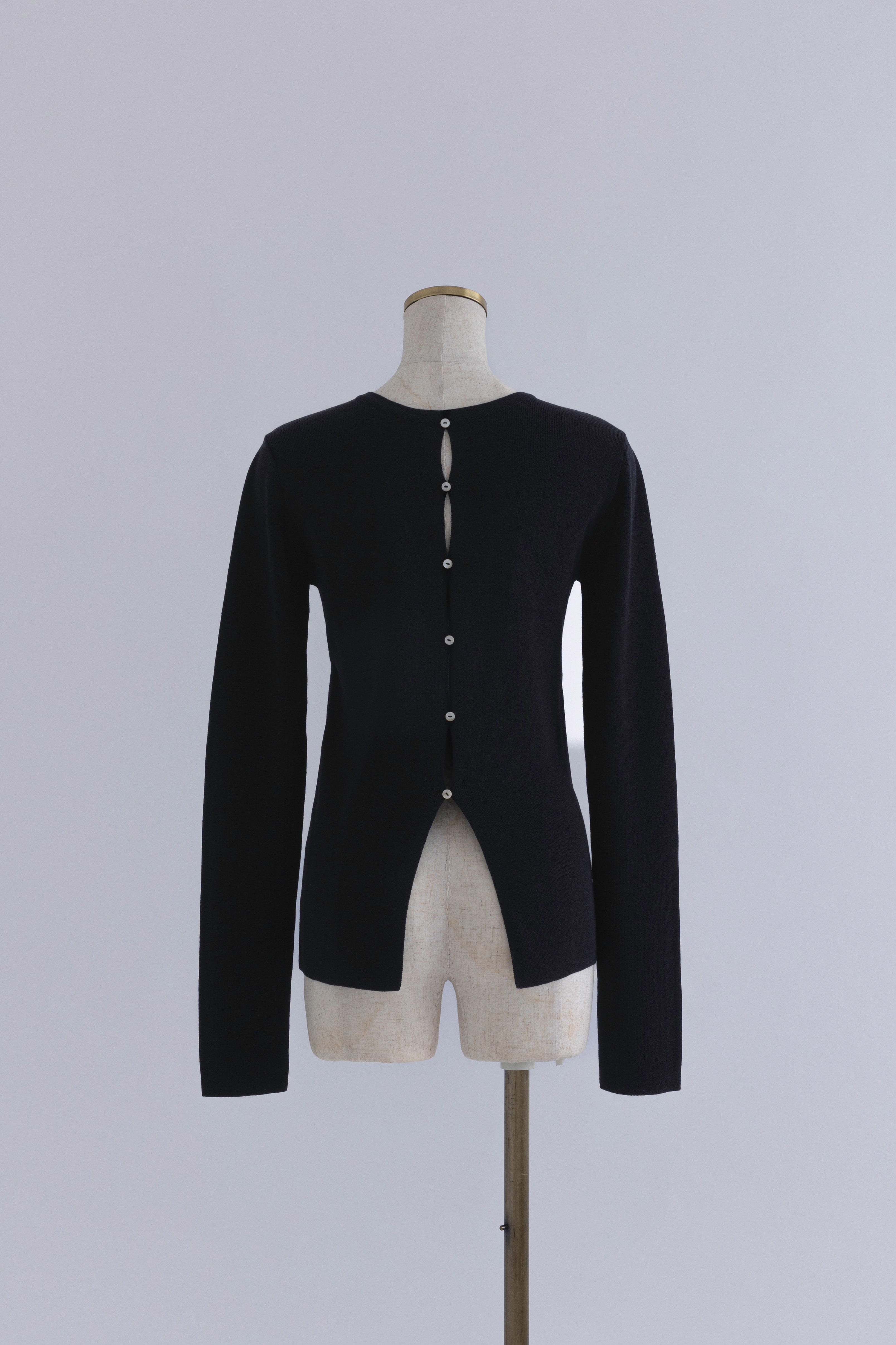 2WAYで楽しめる縦長ホールデザインのニットプルオーバー 【Material】 コットン混素材を使用したさらっとした着心地が魅力のニット。季節を問わずロングシーズンで活躍します。 【Design】 フロント中央に縦長のホールが入ったデザインがポイント。ホール部分を背中側にしてシンプルに着こなすこともできる2WAY仕様です。飾りボタンがアクセントになっており、今年らしい抜け感を演出。一枚で華やかさが際立つアイテムです。 【Styling point】 すっきりとしたシルエットで、ワイドパンツやボリュームのあるボトムスとも相性抜群。ジャケットのインナーとしても合わせやすく、さまざまなコーディネートに取り入れやすいデザインです。