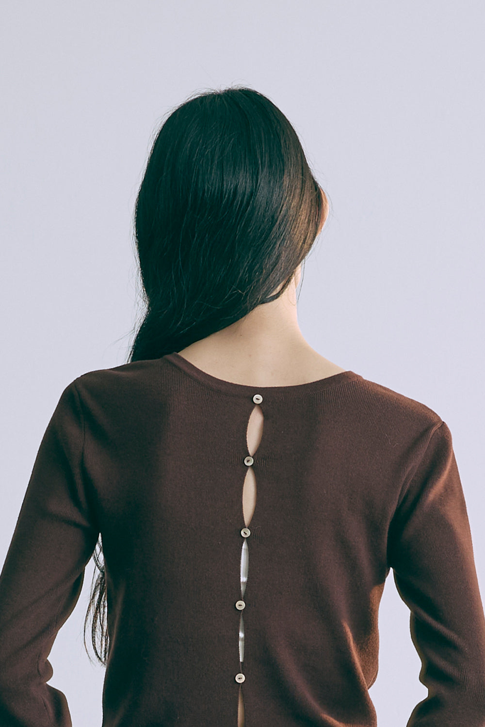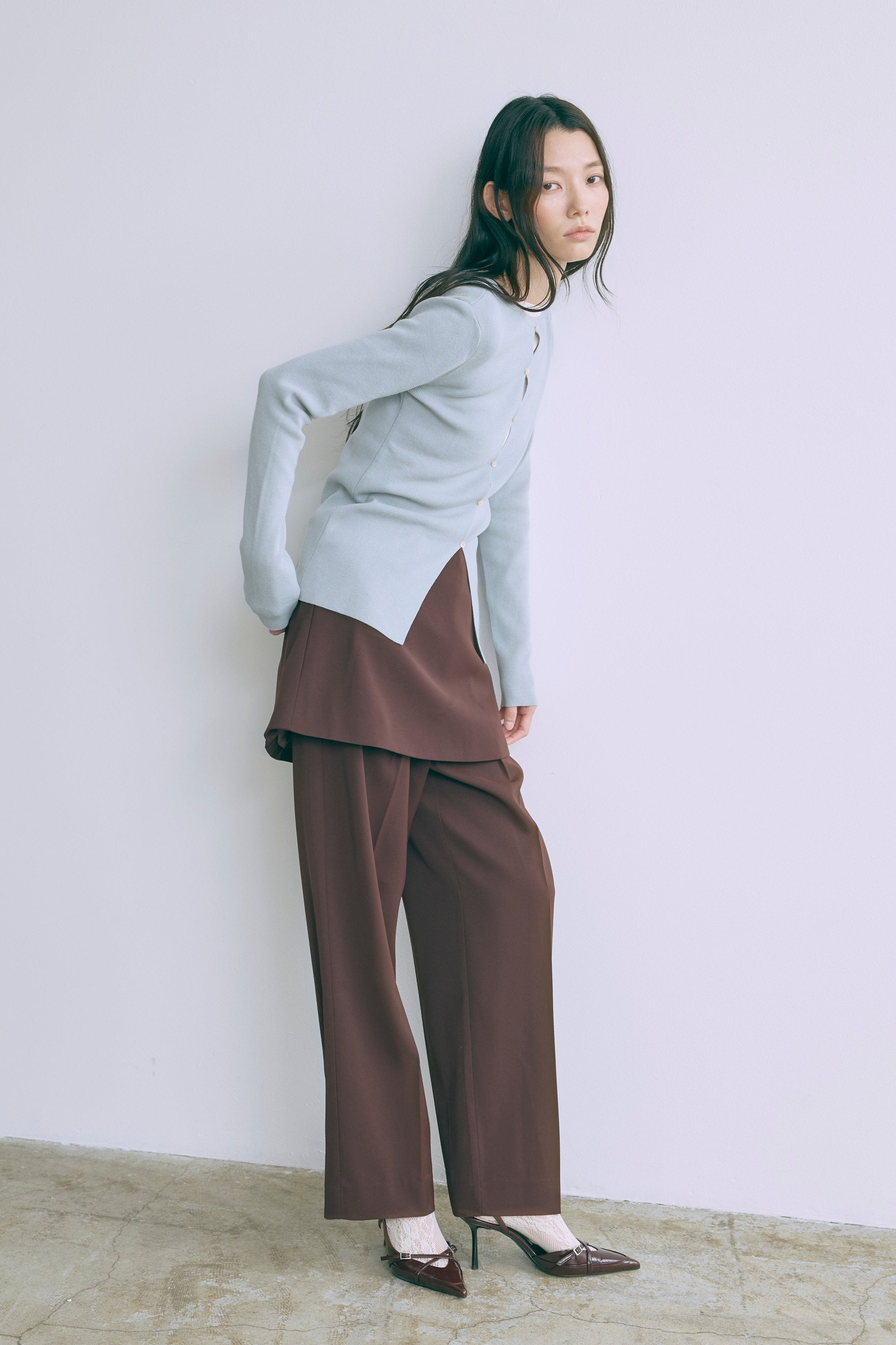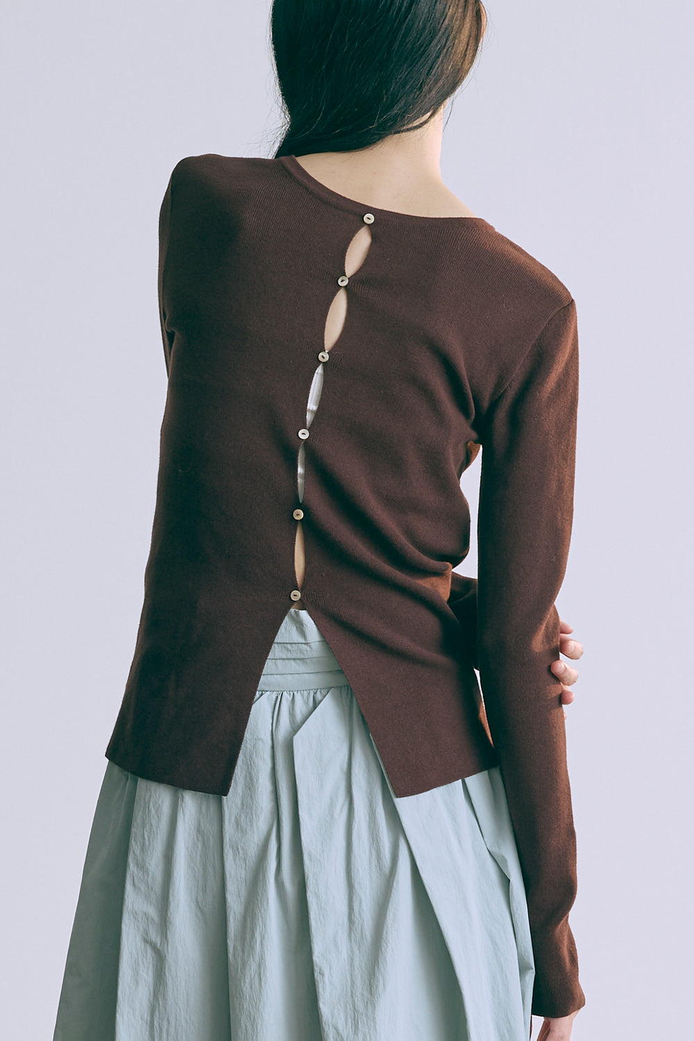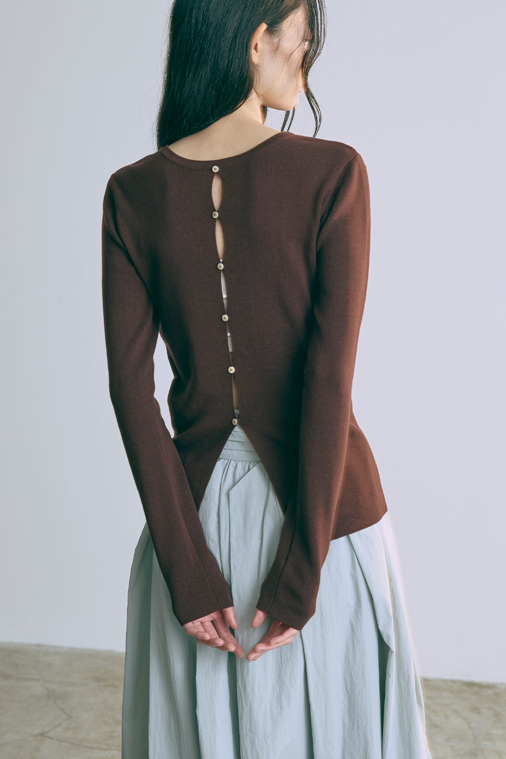 2WAYで楽しめる縦長ホールデザインのニットプルオーバー 【Material】 コットン混素材を使用したさらっとした着心地が魅力のニット。季節を問わずロングシーズンで活躍します。 【Design】 フロント中央に縦長のホールが入ったデザインがポイント。ホール部分を背中側にしてシンプルに着こなすこともできる2WAY仕様です。飾りボタンがアクセントになっており、今年らしい抜け感を演出。一枚で華やかさが際立つアイテムです。 【Styling point】 すっきりとしたシルエットで、ワイドパンツやボリュームのあるボトムスとも相性抜群。ジャケットのインナーとしても合わせやすく、さまざまなコーディネートに取り入れやすいデザインです。