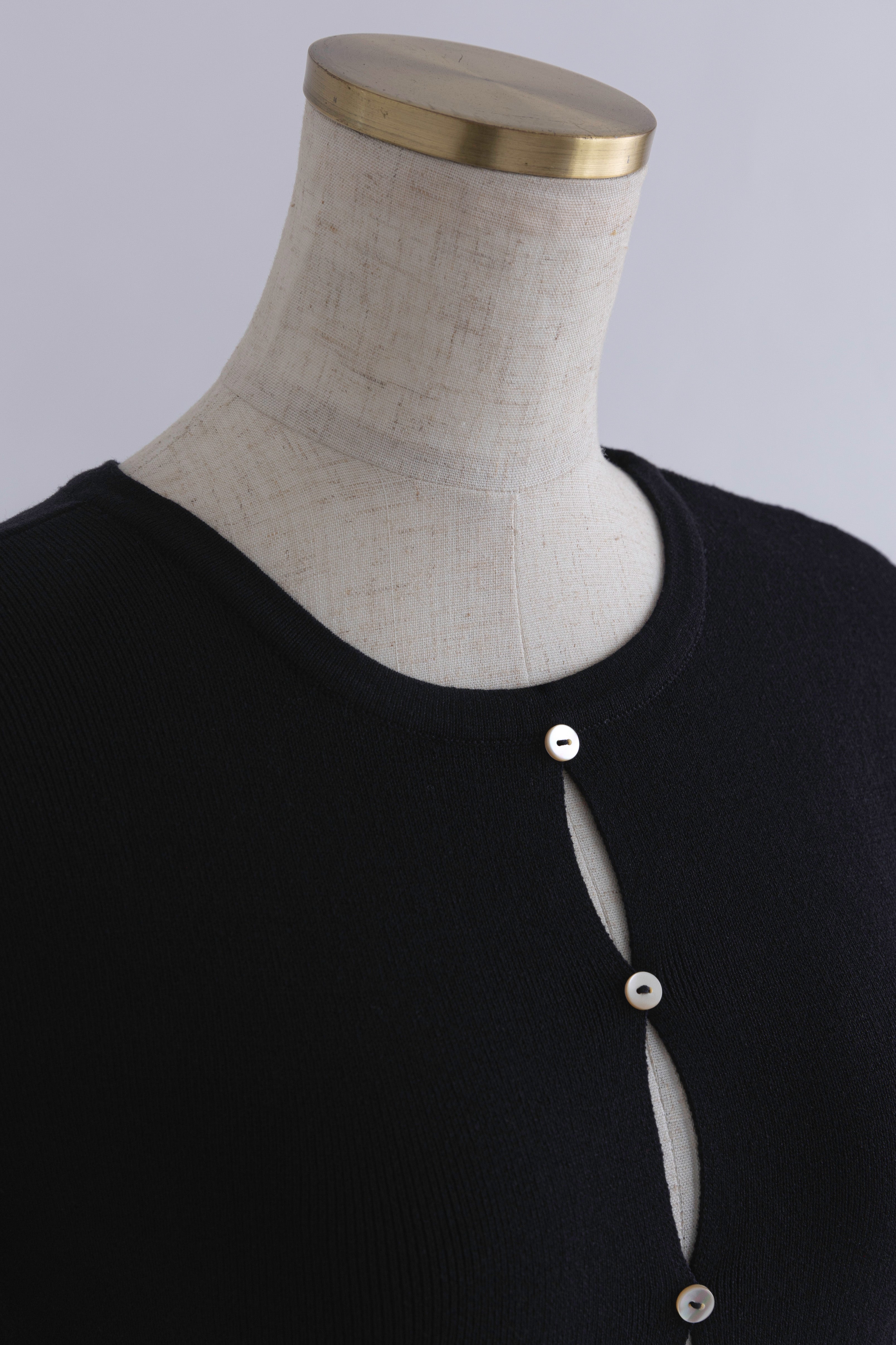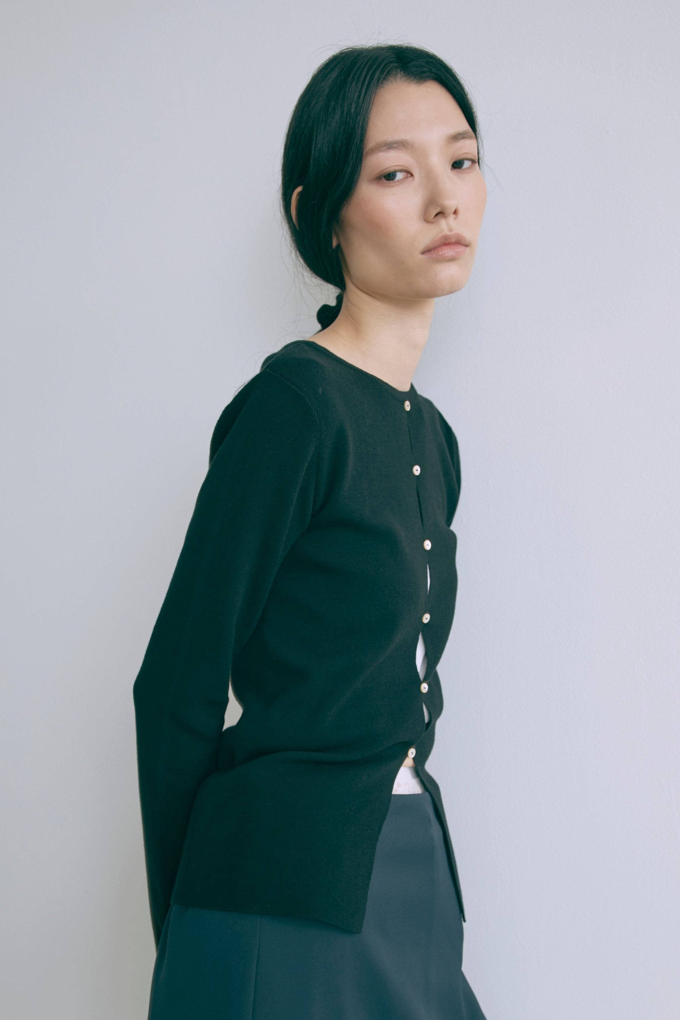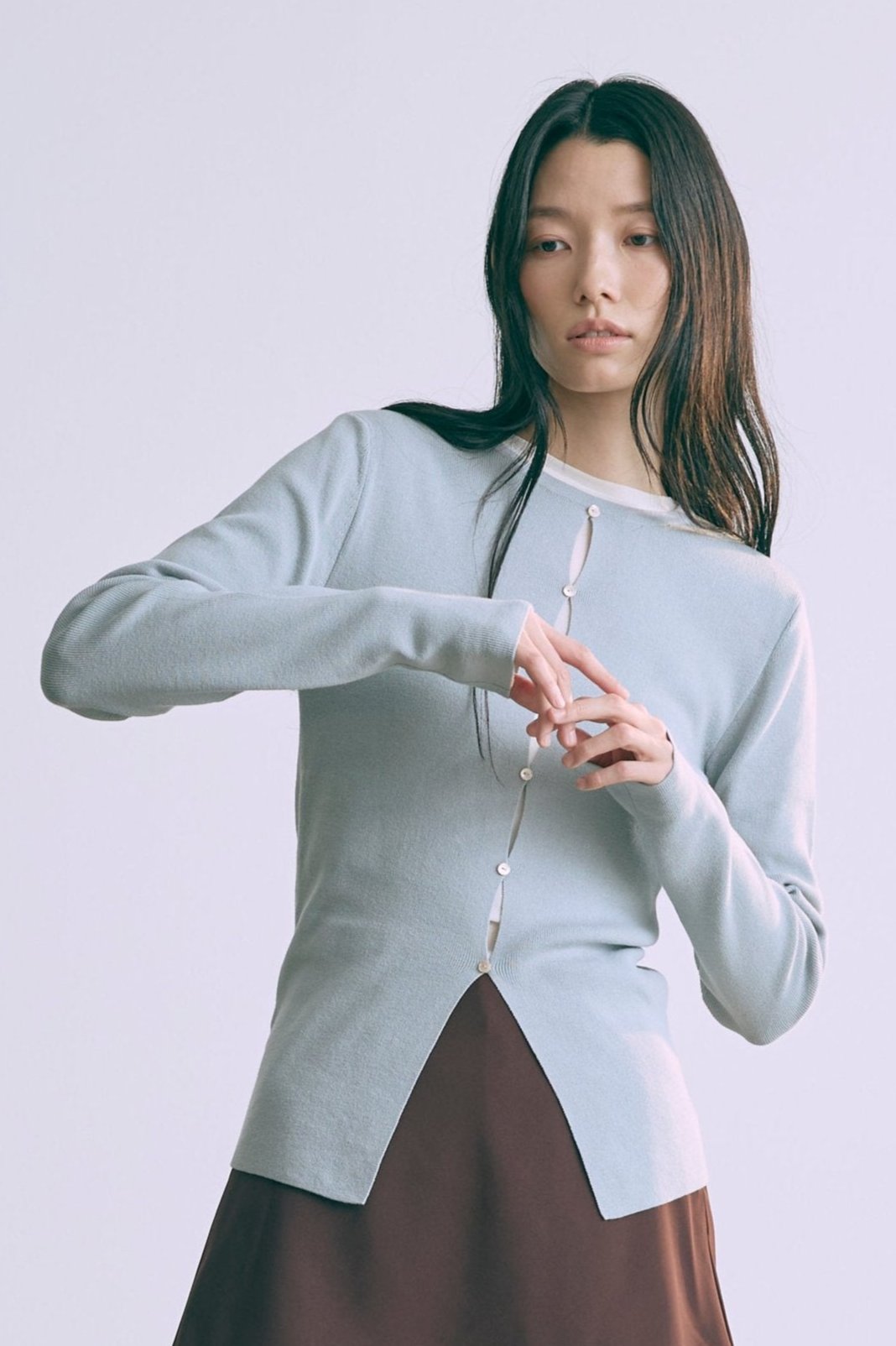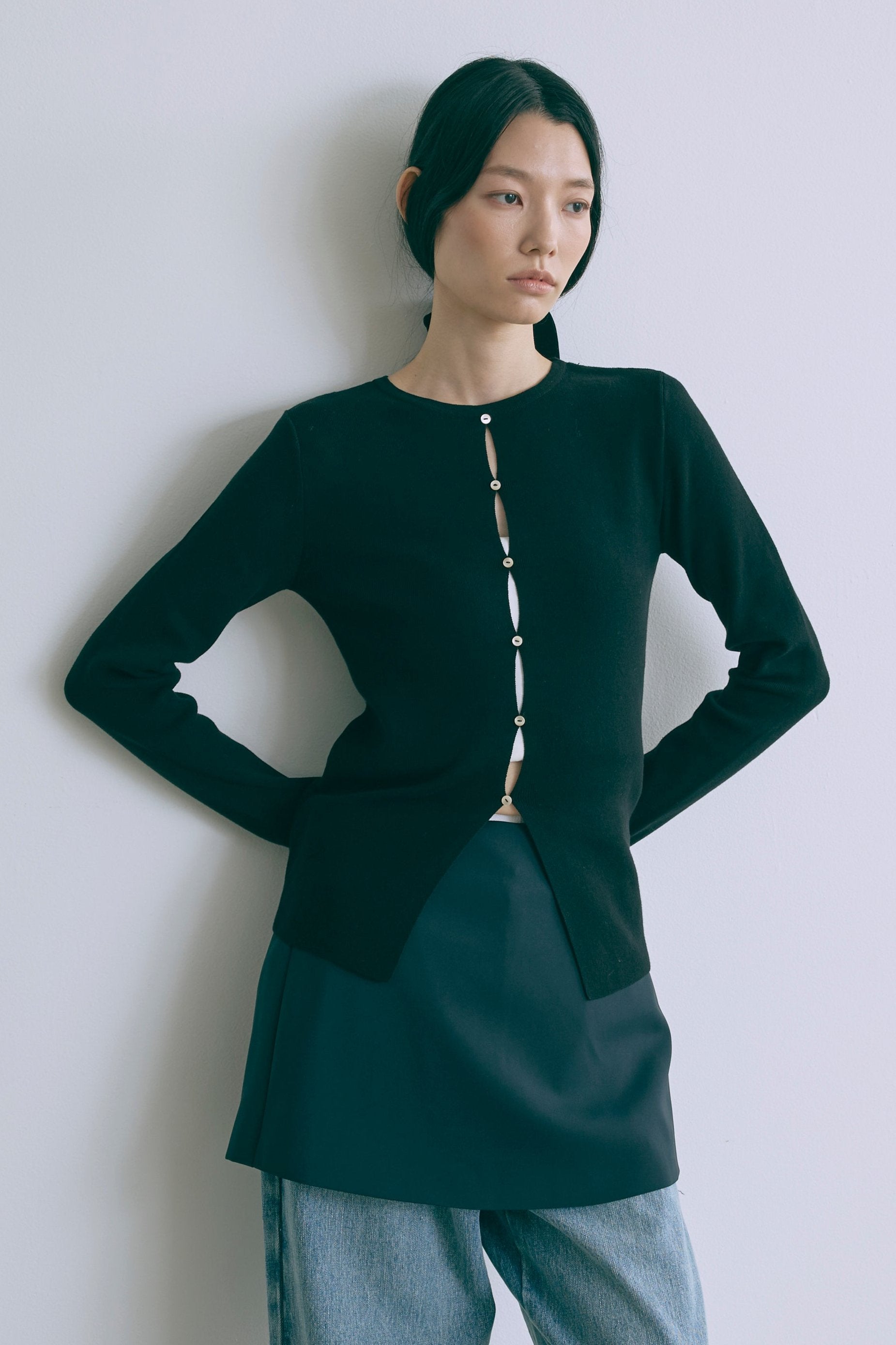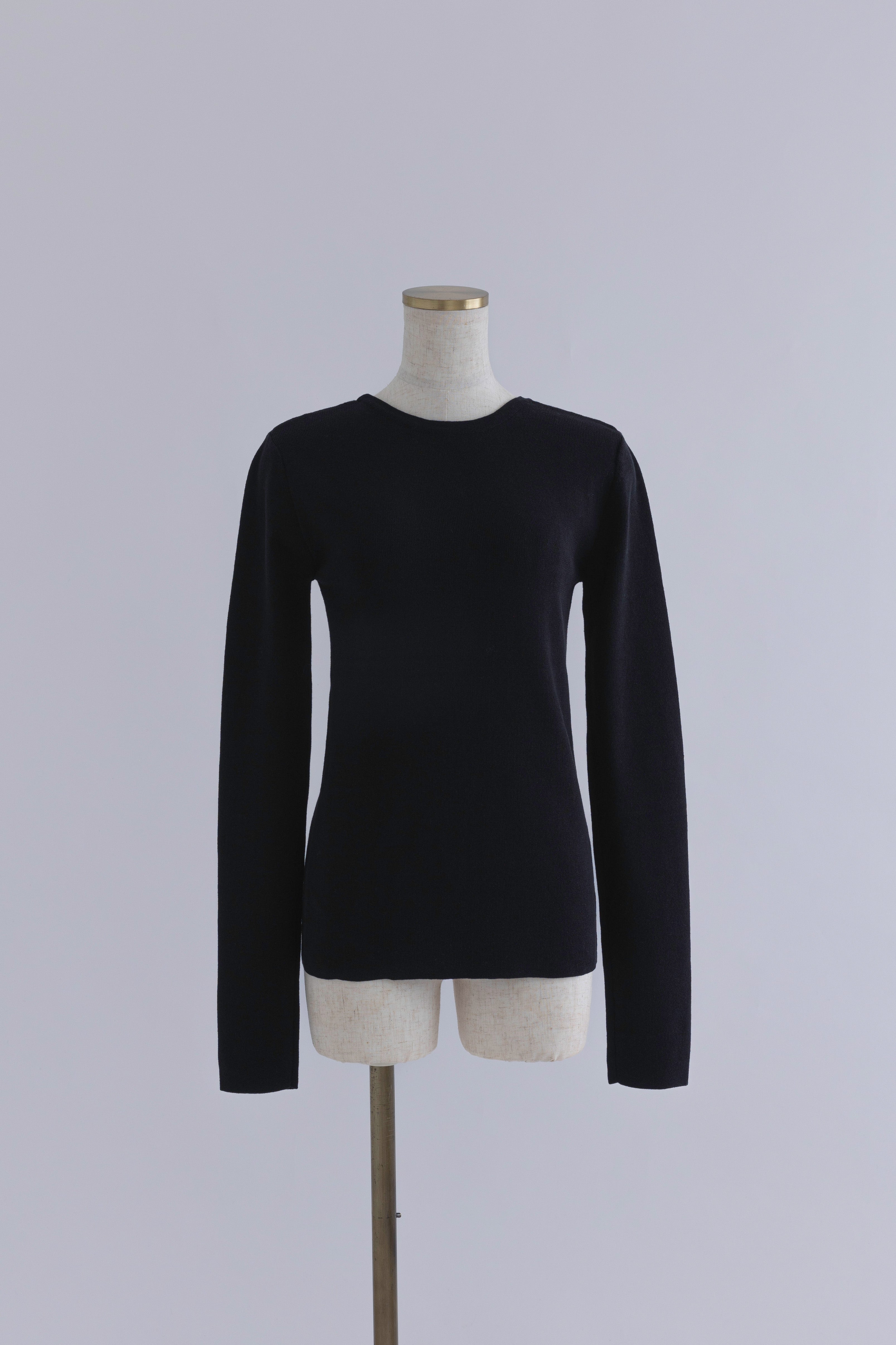 2WAYで楽しめる縦長ホールデザインのニットプルオーバー 【Material】 コットン混素材を使用したさらっとした着心地が魅力のニット。季節を問わずロングシーズンで活躍します。 【Design】 フロント中央に縦長のホールが入ったデザインがポイント。ホール部分を背中側にしてシンプルに着こなすこともできる2WAY仕様です。飾りボタンがアクセントになっており、今年らしい抜け感を演出。一枚で華やかさが際立つアイテムです。 【Styling point】 すっきりとしたシルエットで、ワイドパンツやボリュームのあるボトムスとも相性抜群。ジャケットのインナーとしても合わせやすく、さまざまなコーディネートに取り入れやすいデザインです。